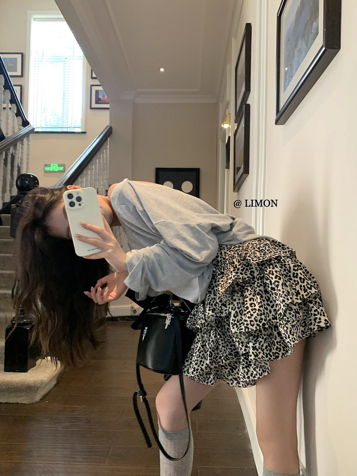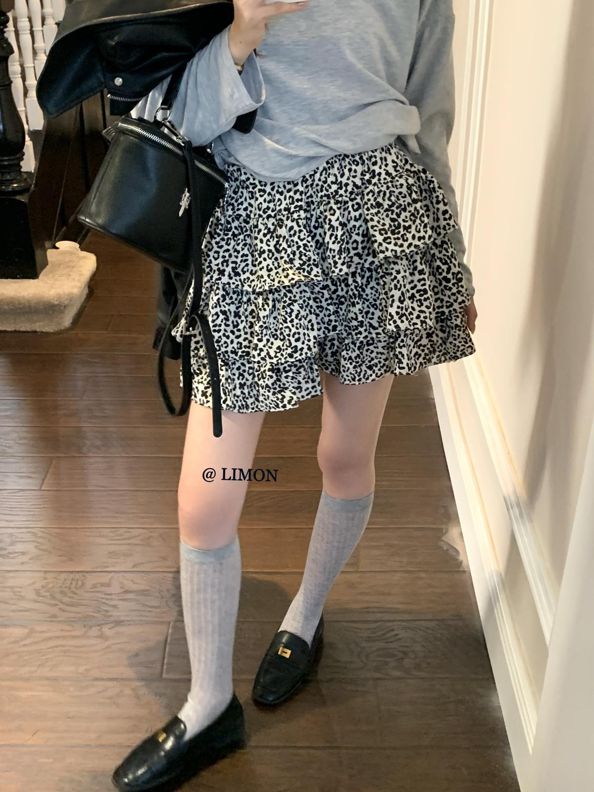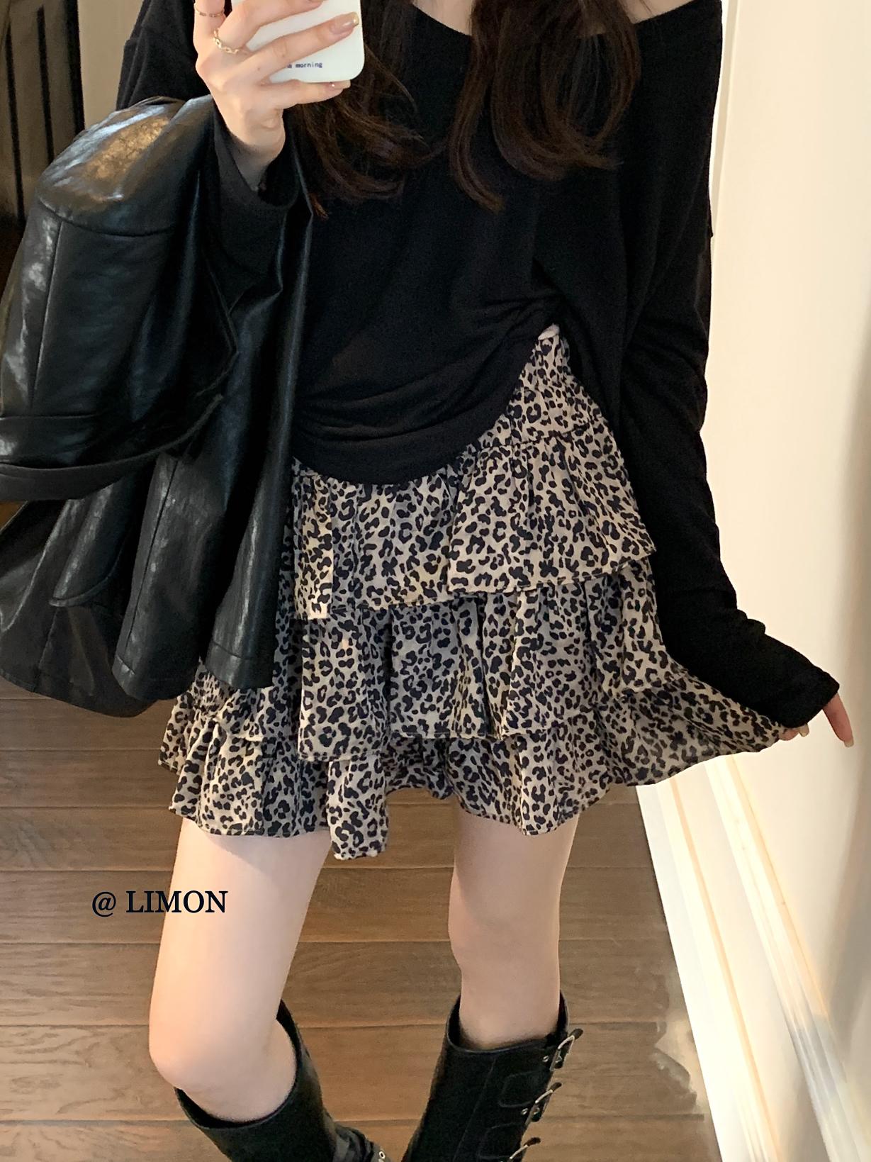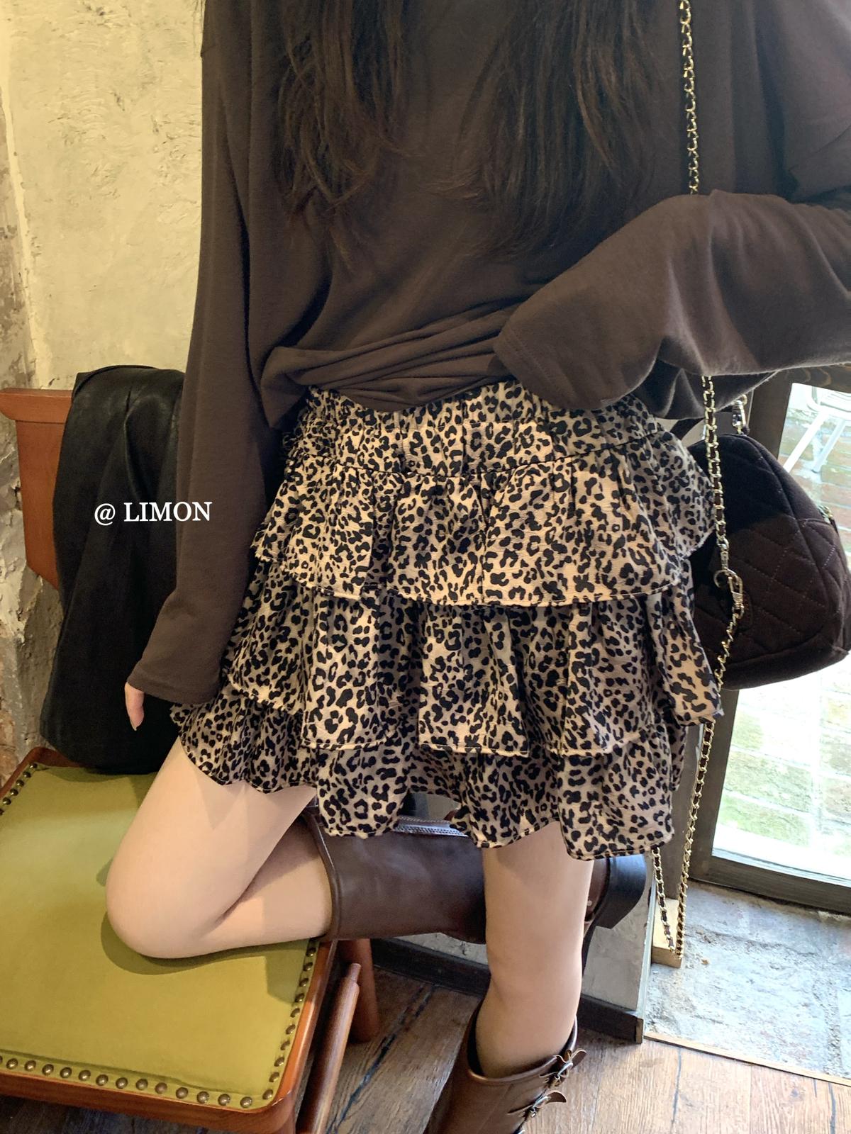 【C6673】復古設計感高腰豹紋蛋糕裙短裙半身裙