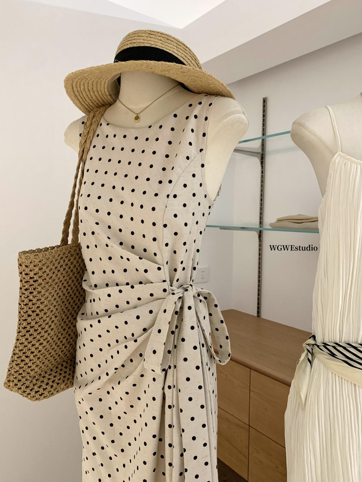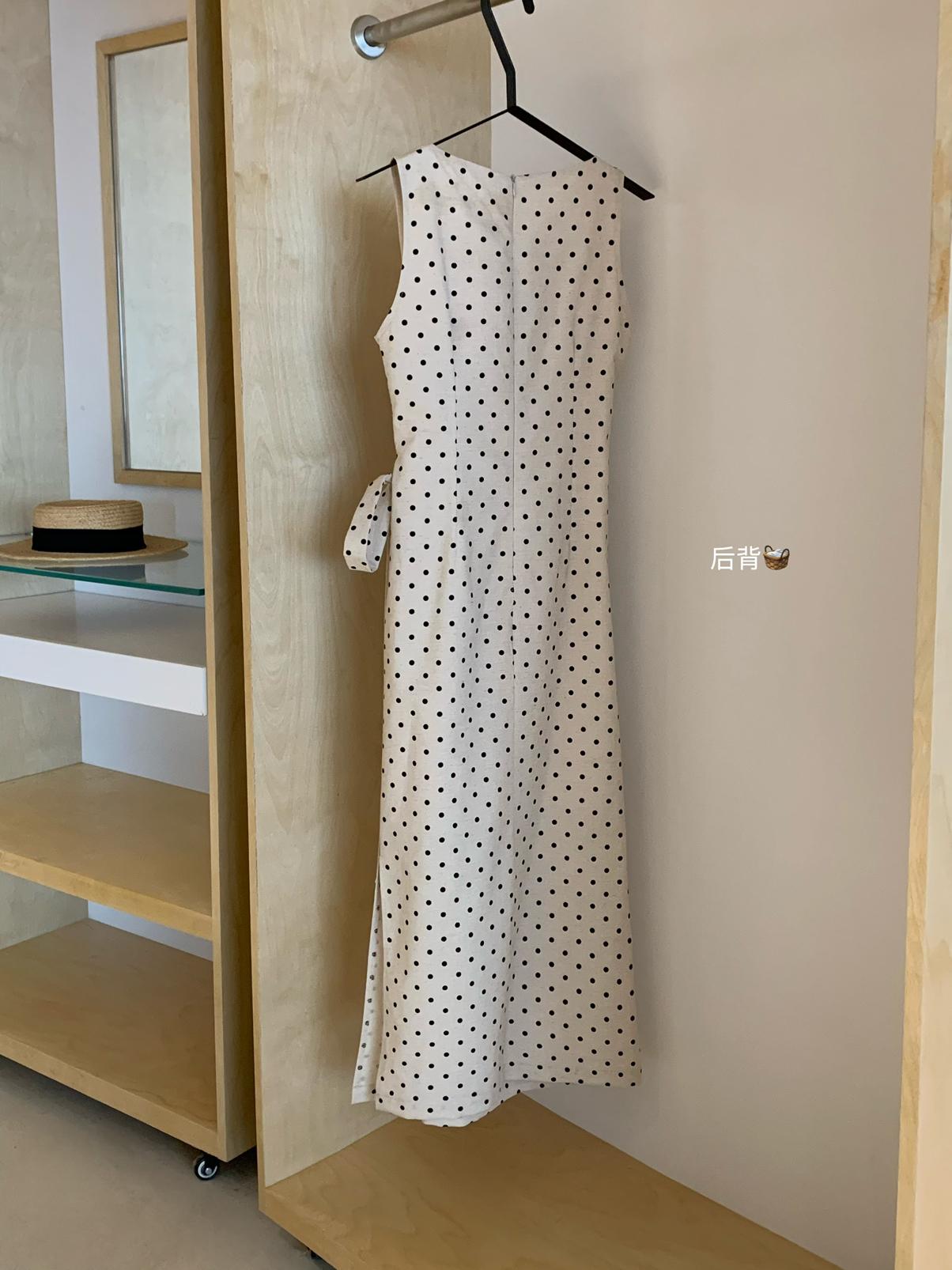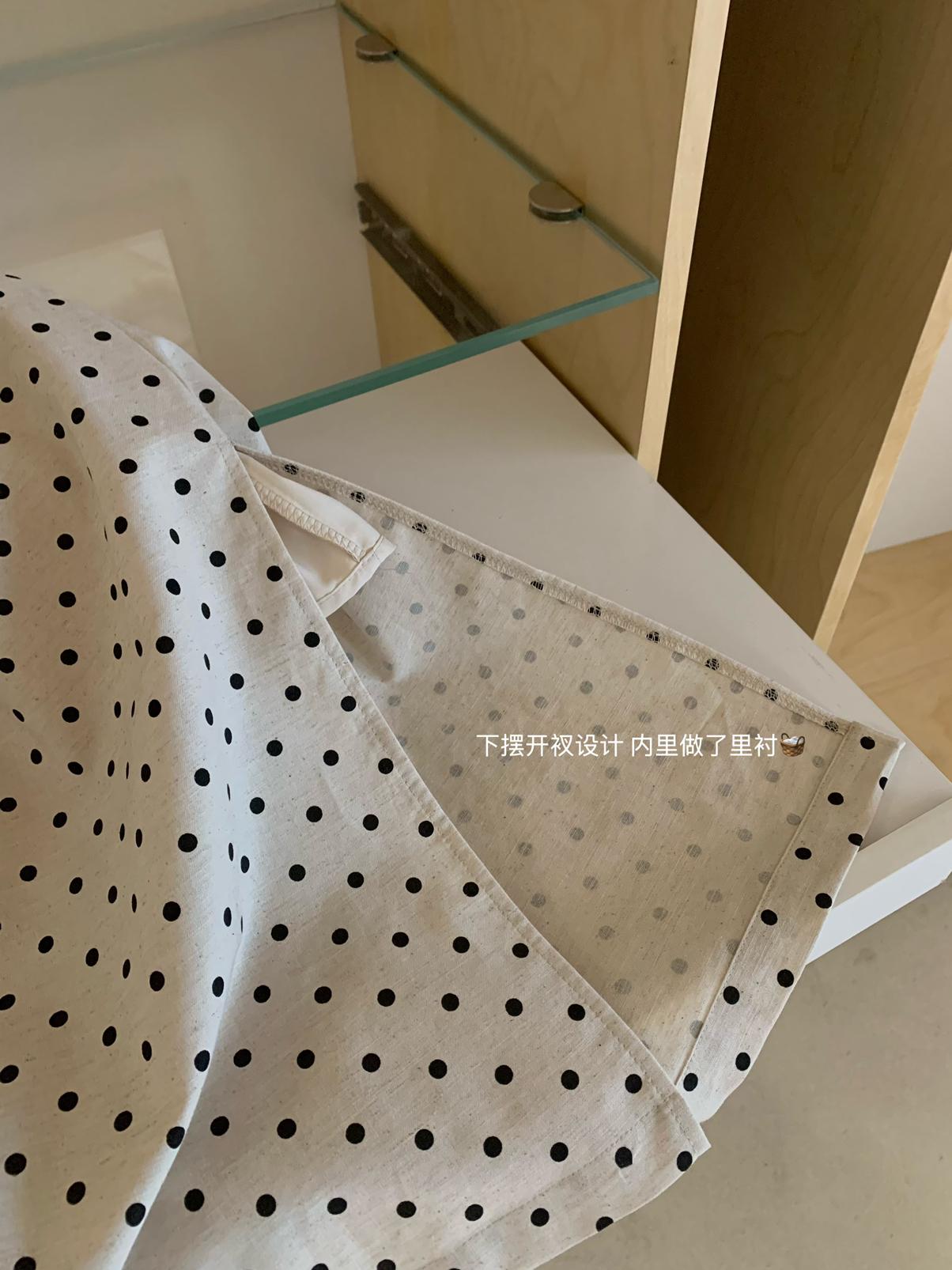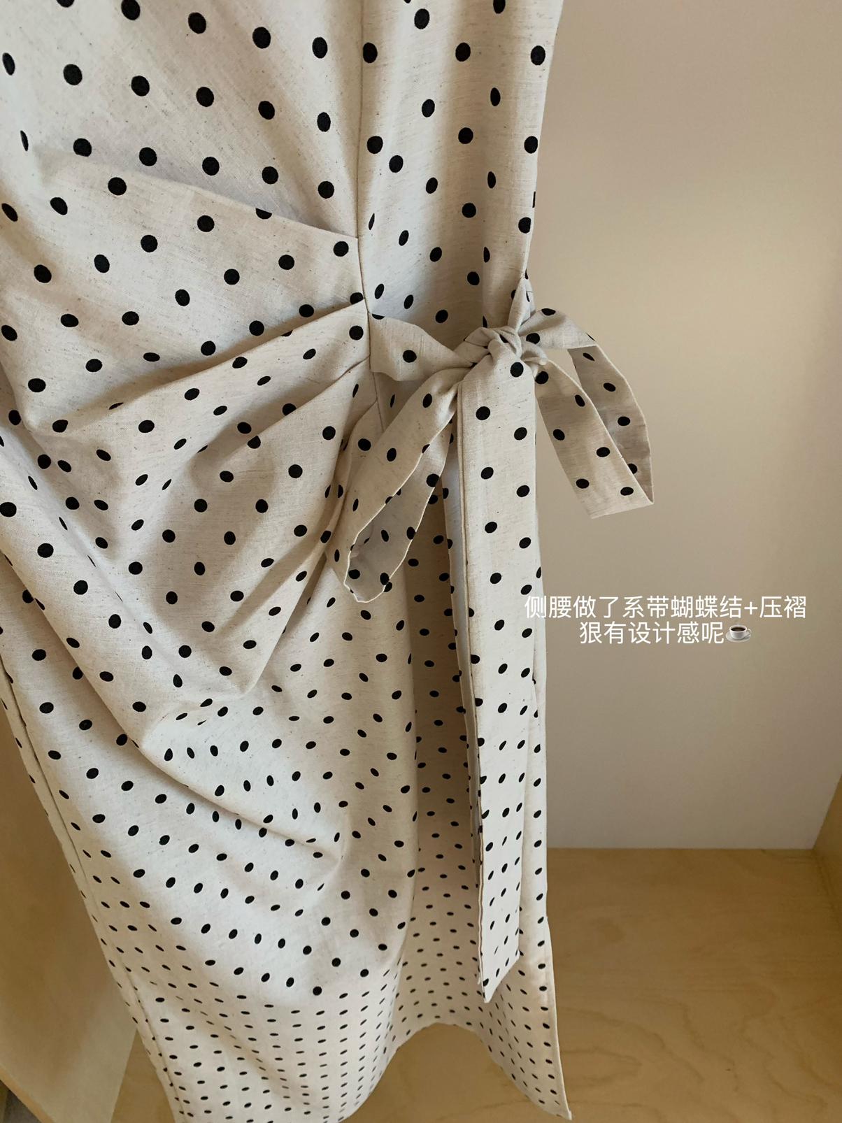 【C6679】高級感氣質波點裙女側收腰亞麻棉法式長裙連衣裙