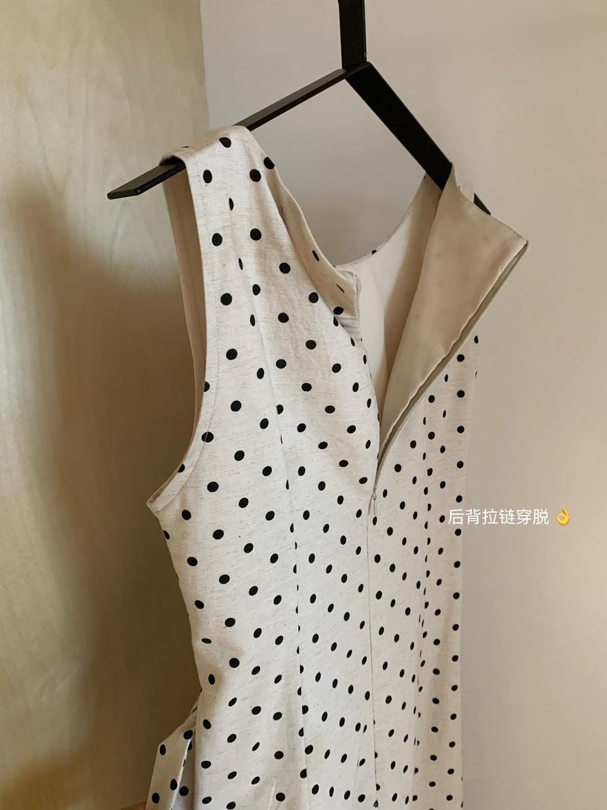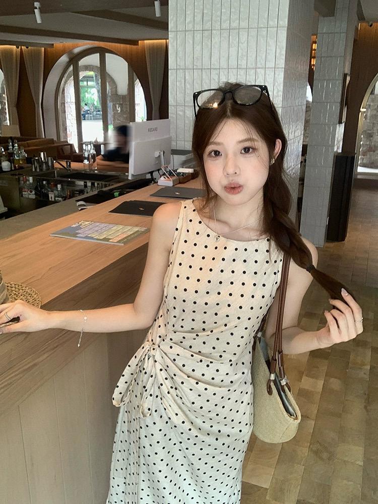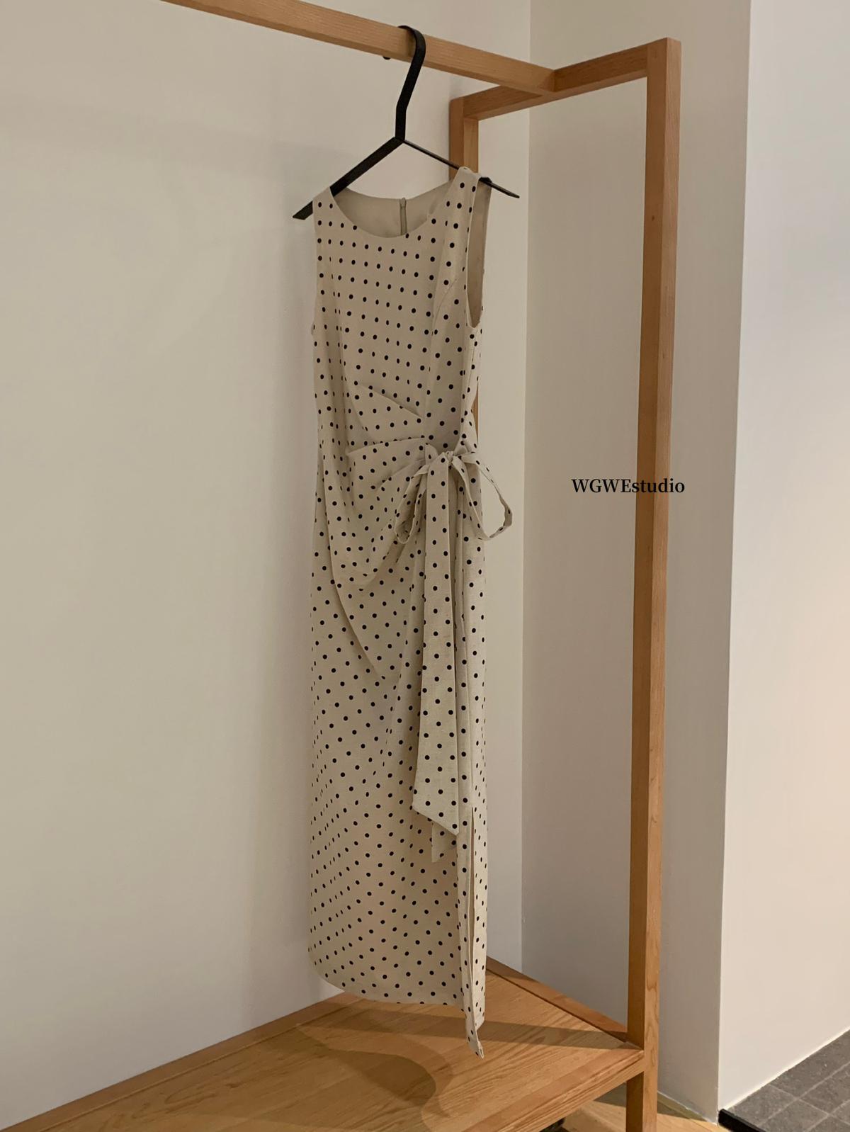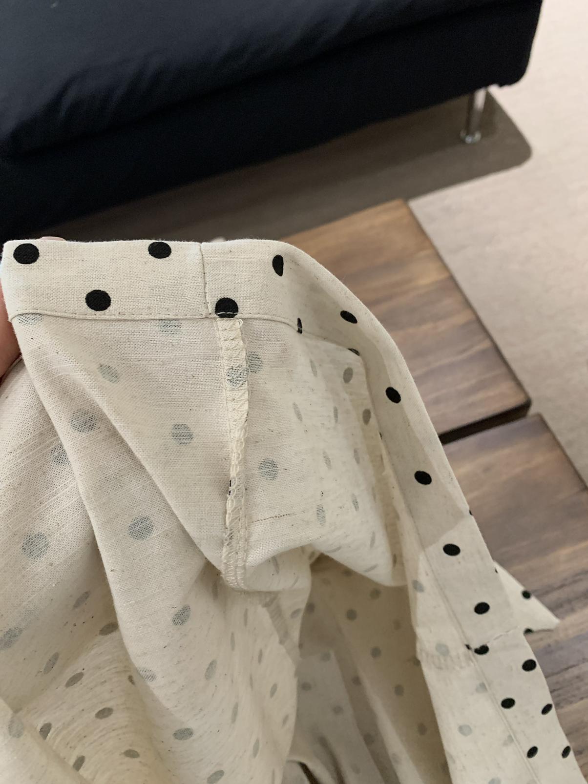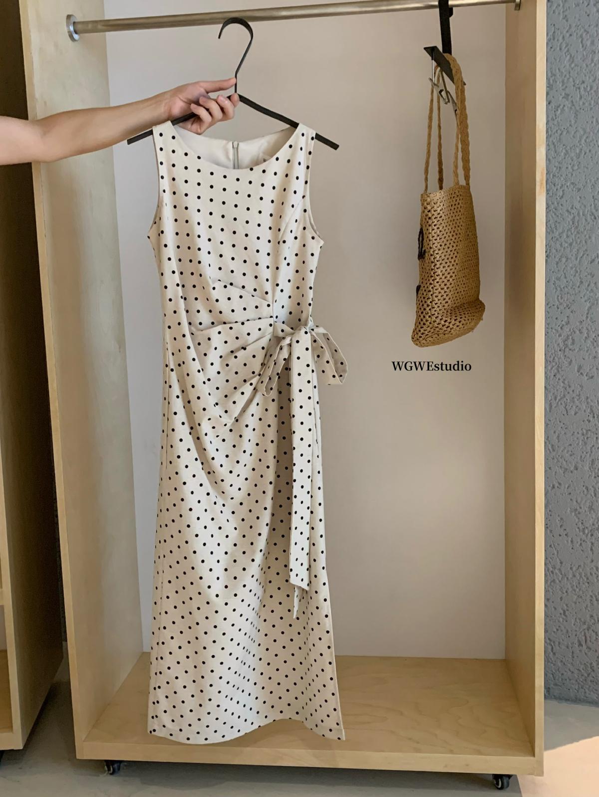 【C6679】高級感氣質波點裙女側收腰亞麻棉法式長裙連衣裙