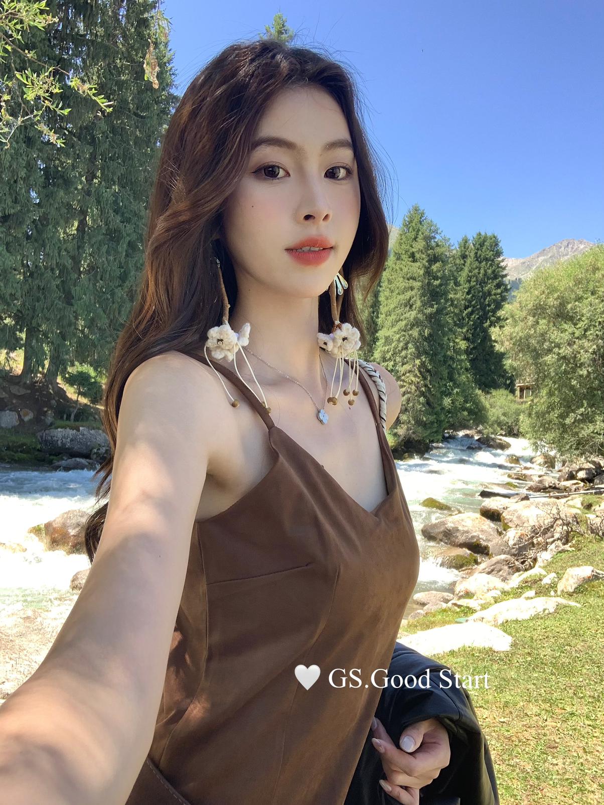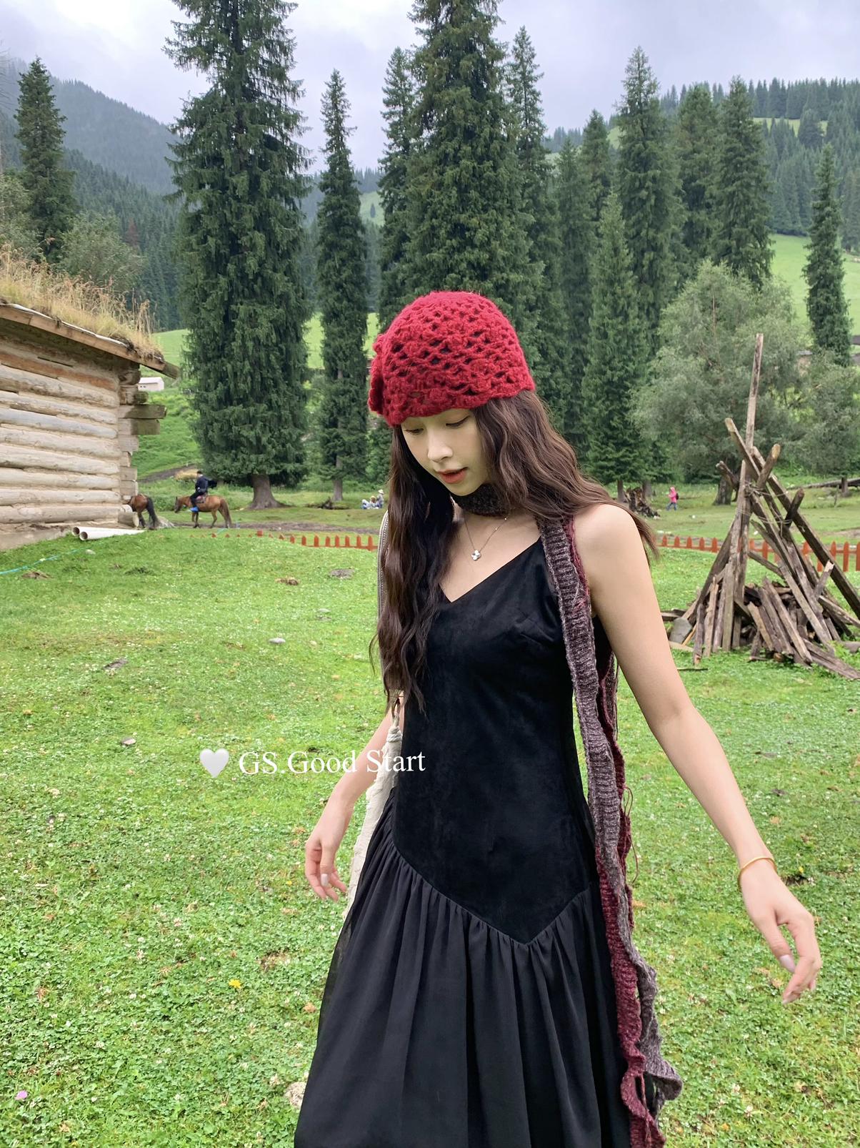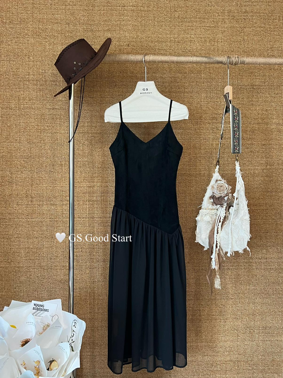 【C6737】尖叫安利!自帶氛圍感!秋冬波嬉風·網紗拼接麂皮絨疊穿吊帶連衣裙