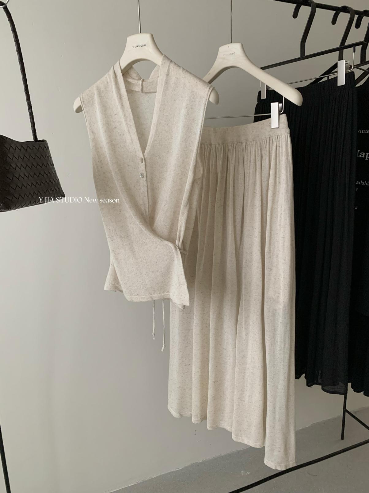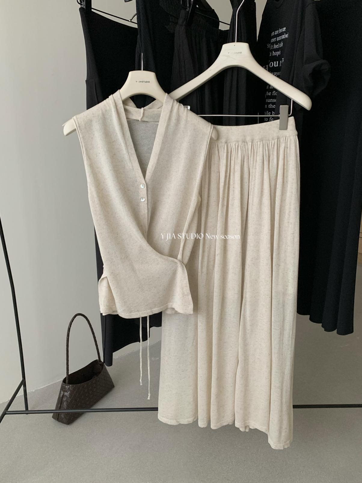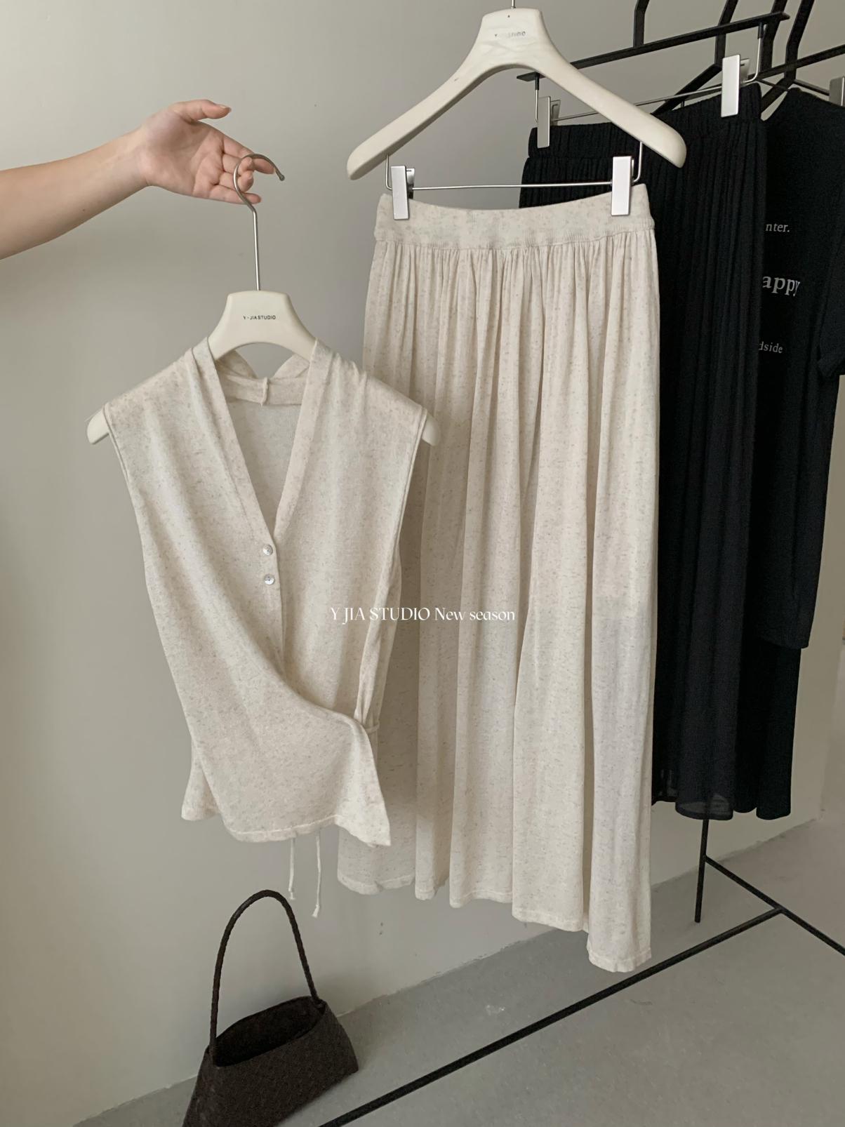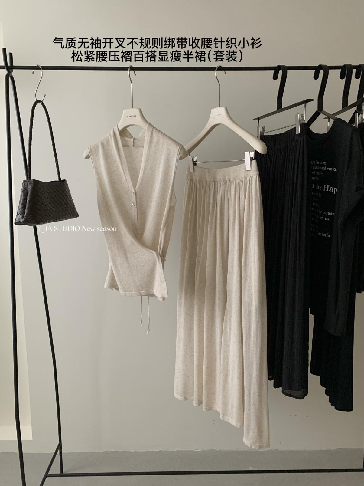 3. 【C6751】氣質無袖開叉不規則綁帶收腰針織背心+鬆緊腰壓褶百搭顯瘦半身裙套裝