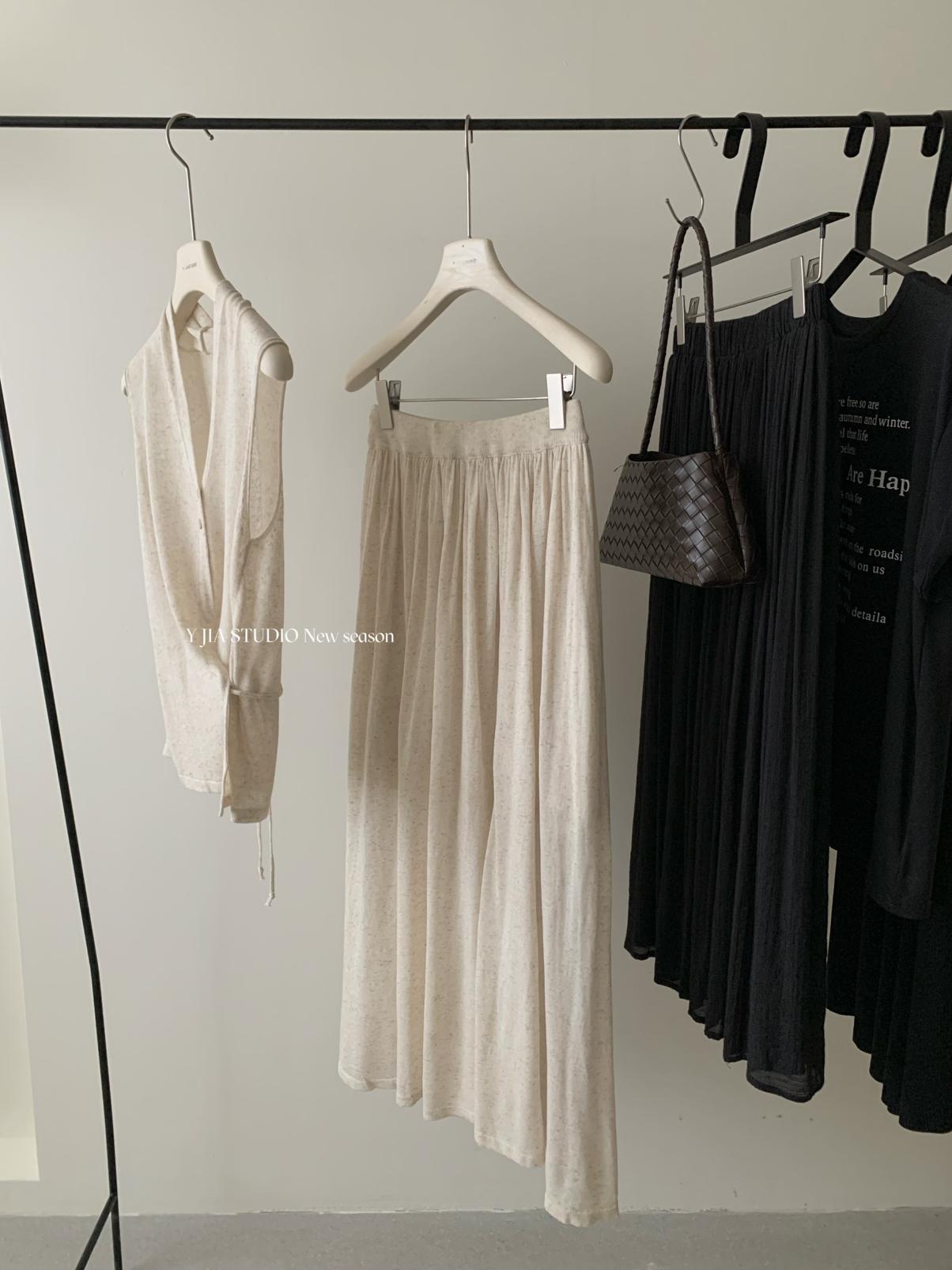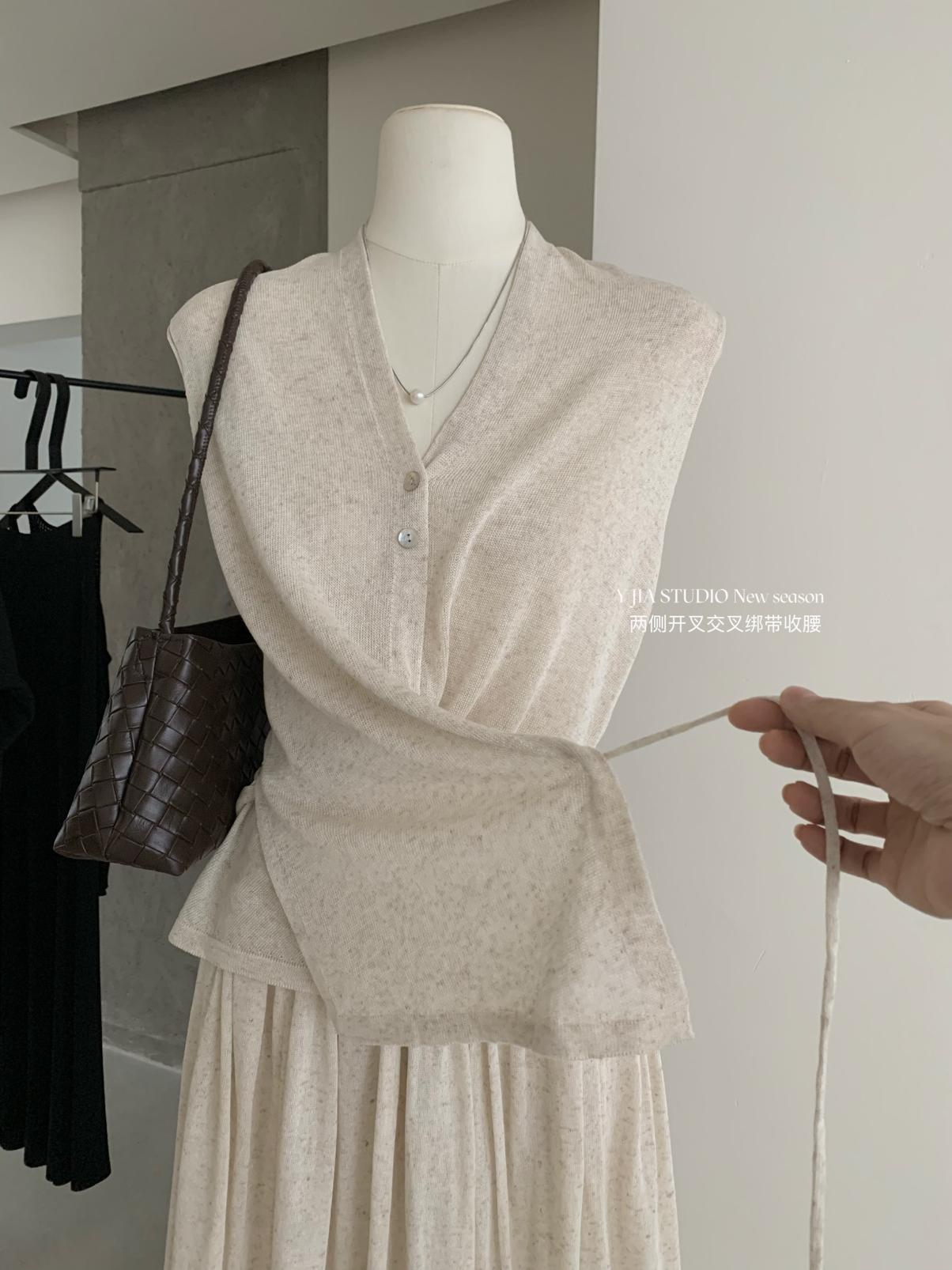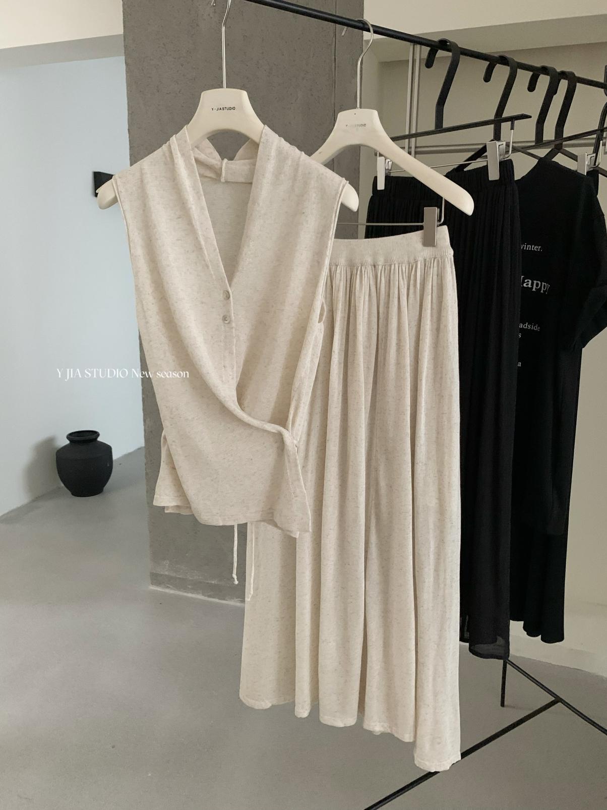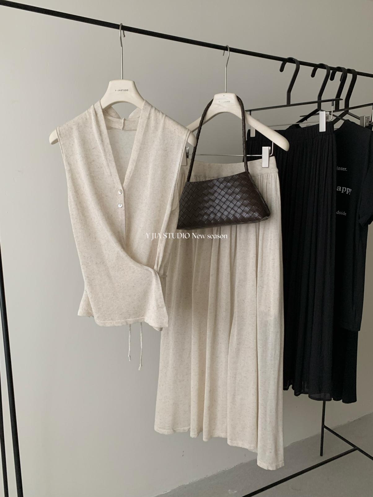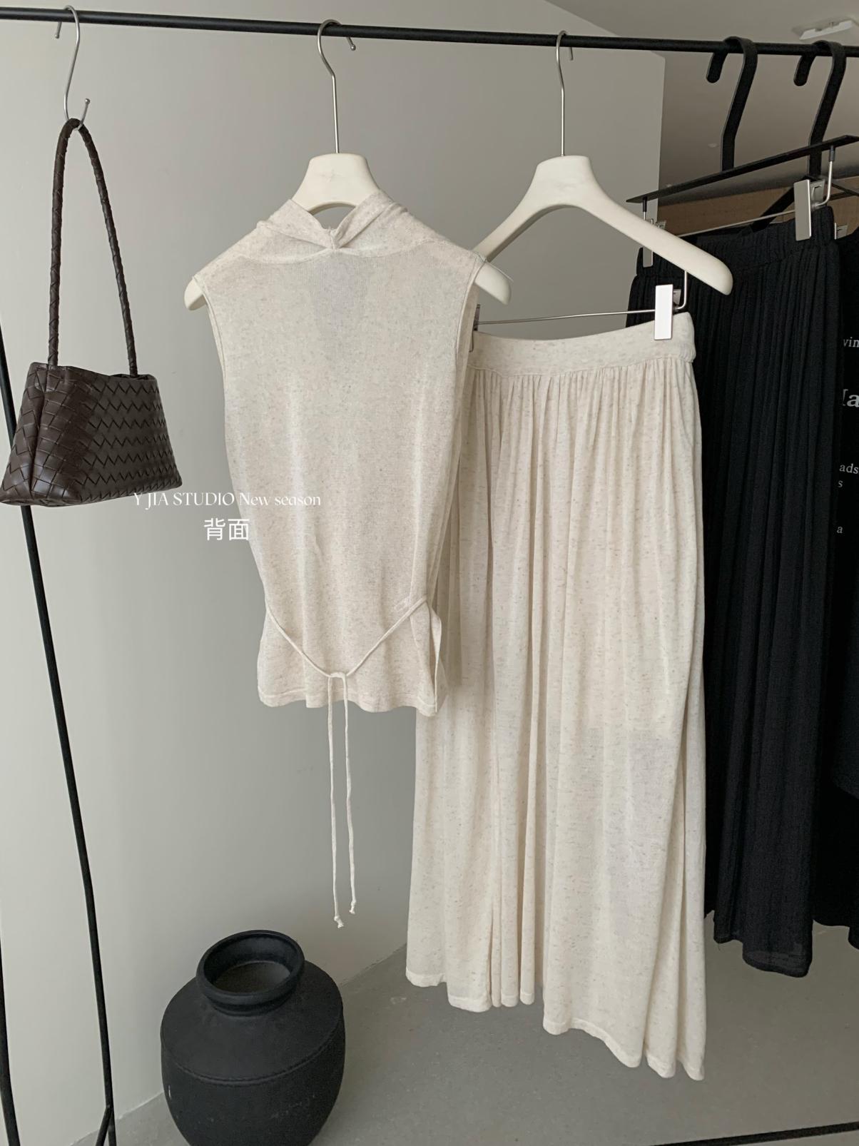 3. 【C6751】氣質無袖開叉不規則綁帶收腰針織背心+鬆緊腰壓褶百搭顯瘦半身裙套裝