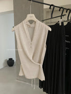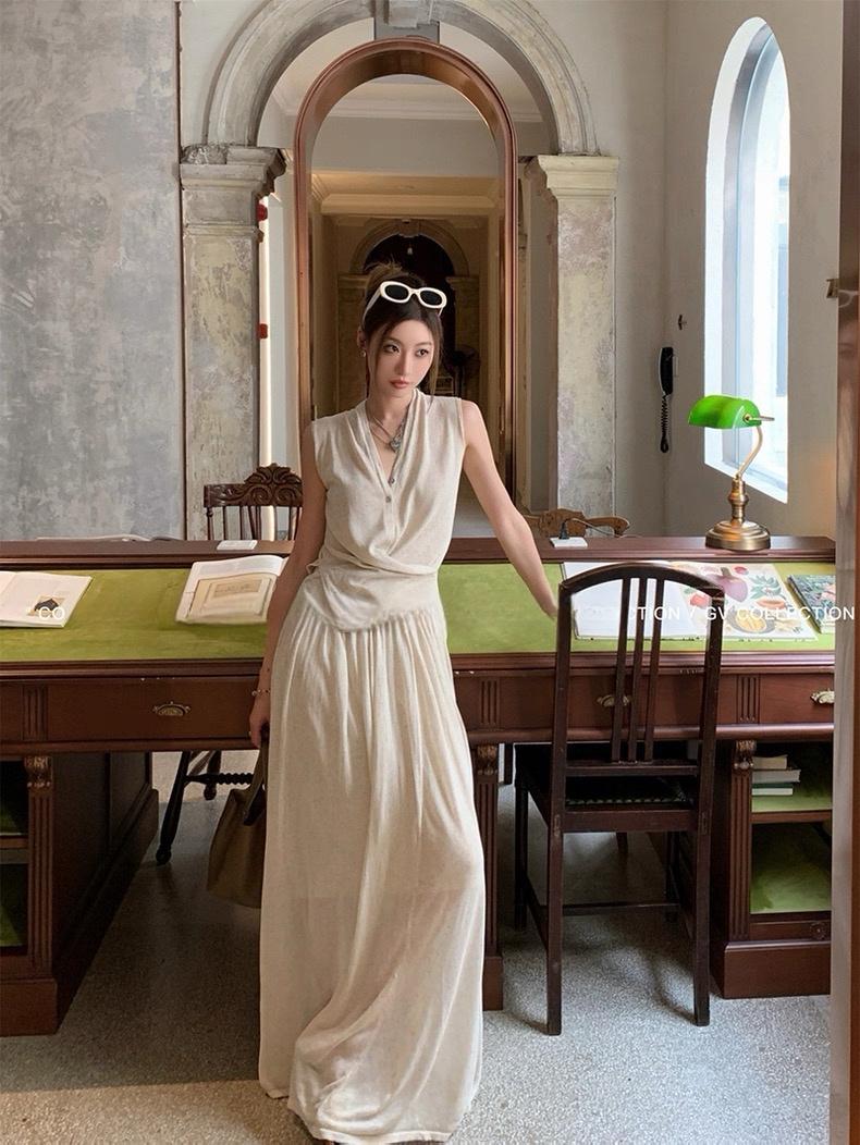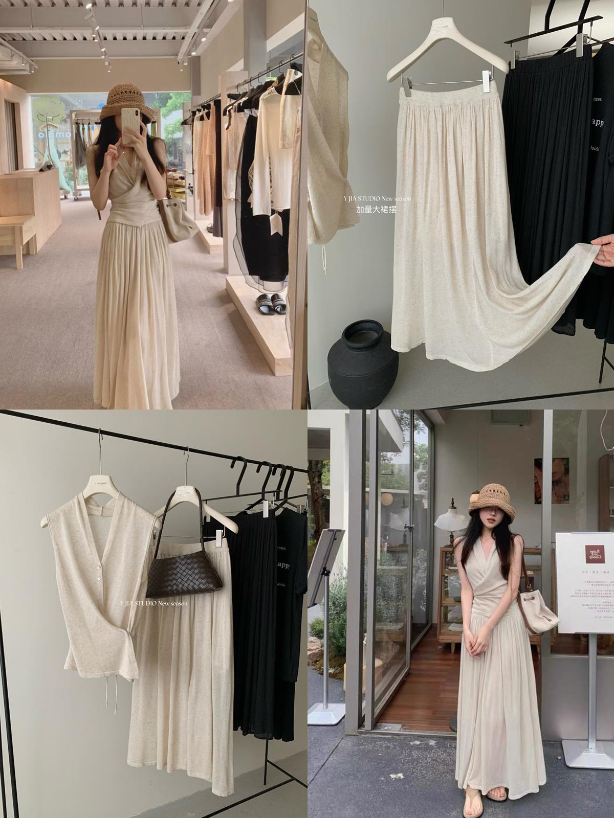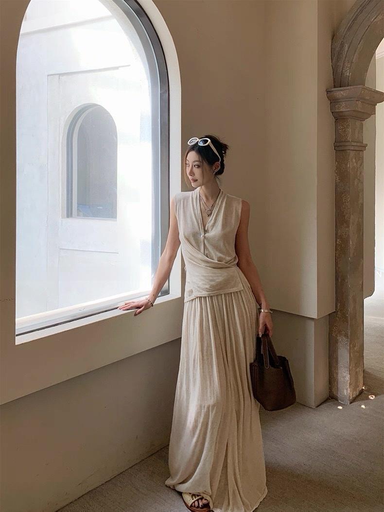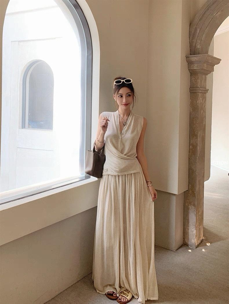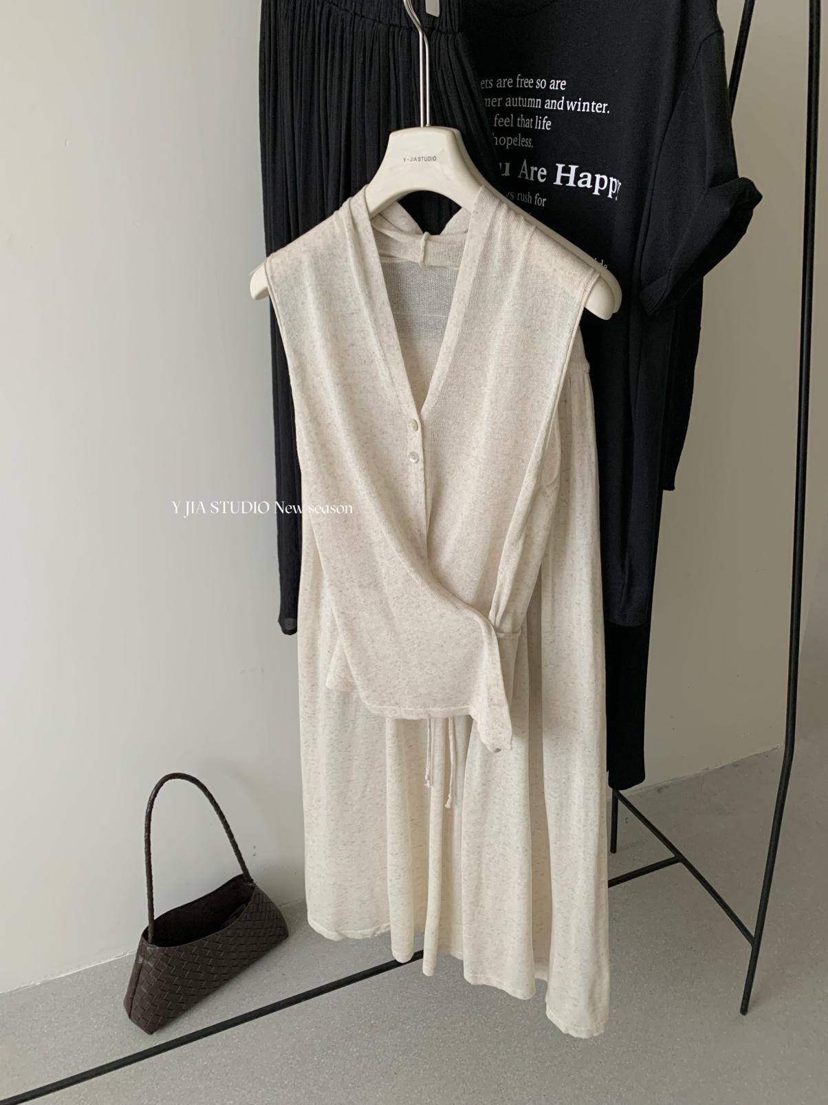 3. 【C6751】氣質無袖開叉不規則綁帶收腰針織背心+鬆緊腰壓褶百搭顯瘦半身裙套裝
