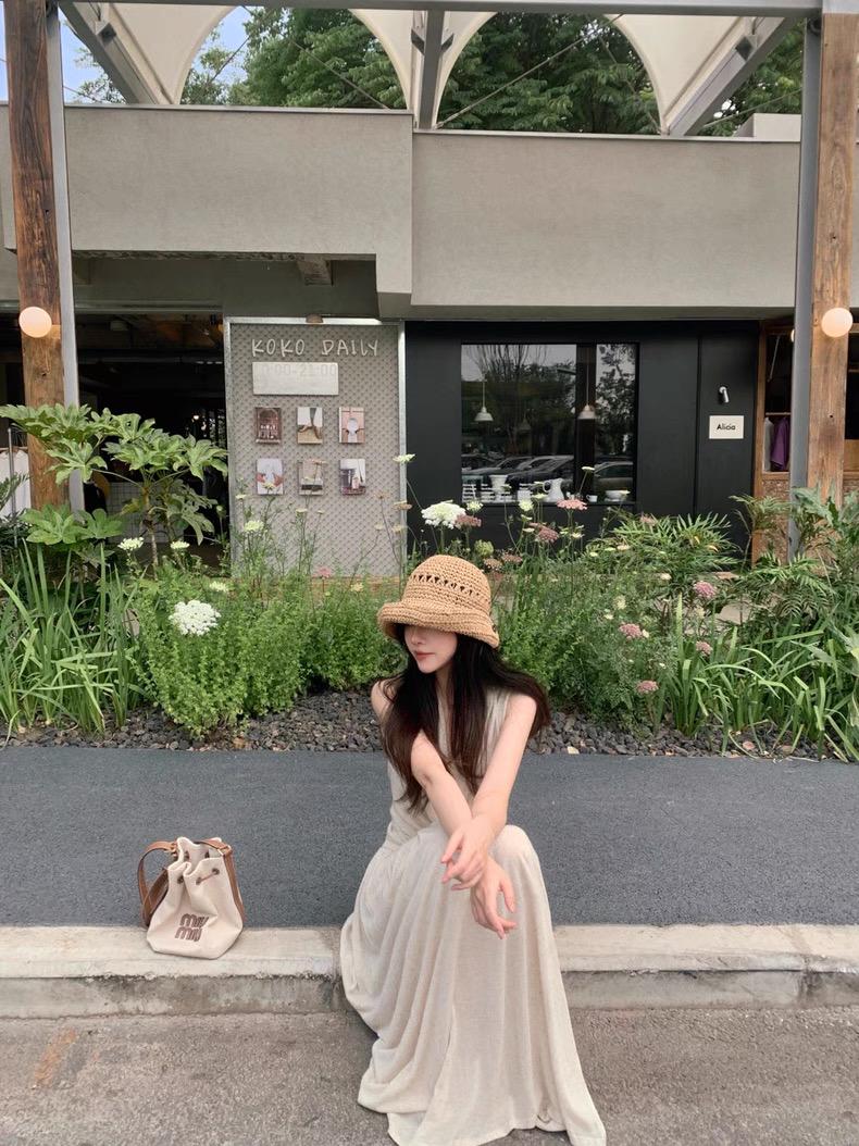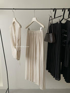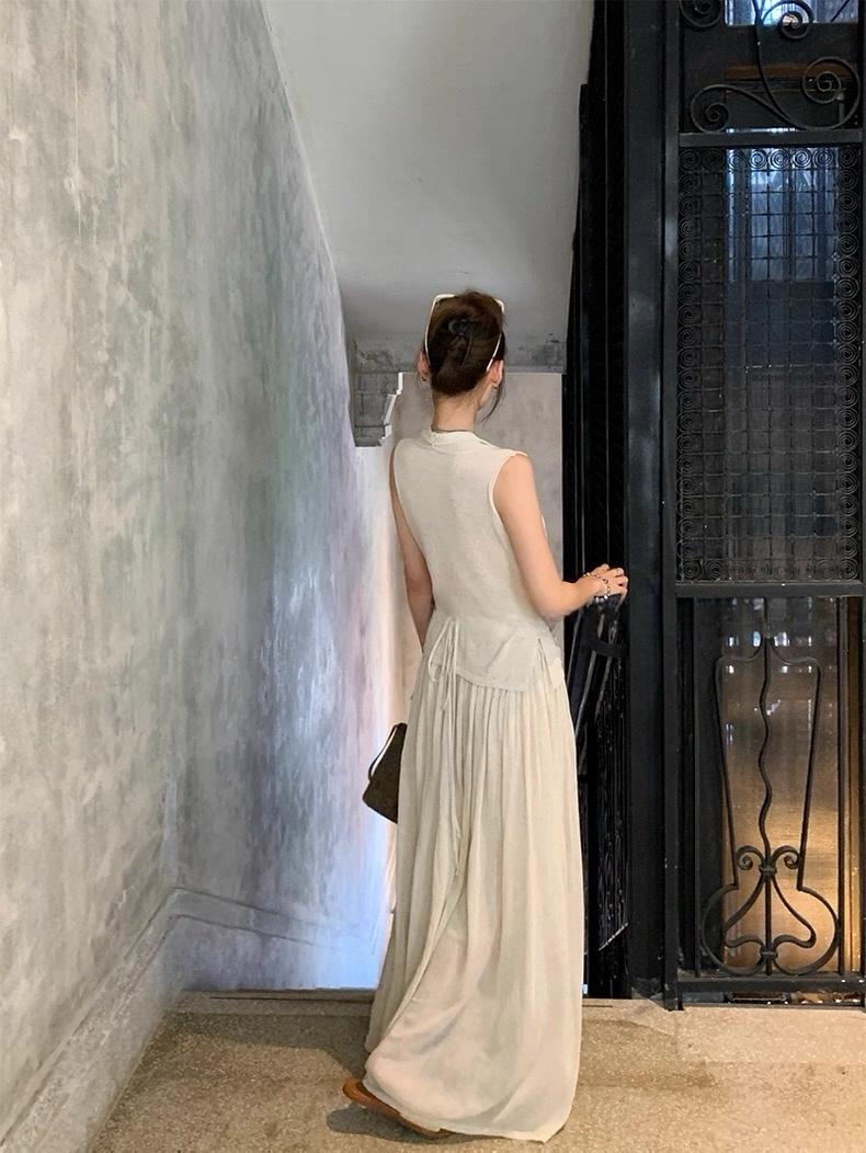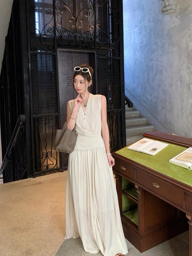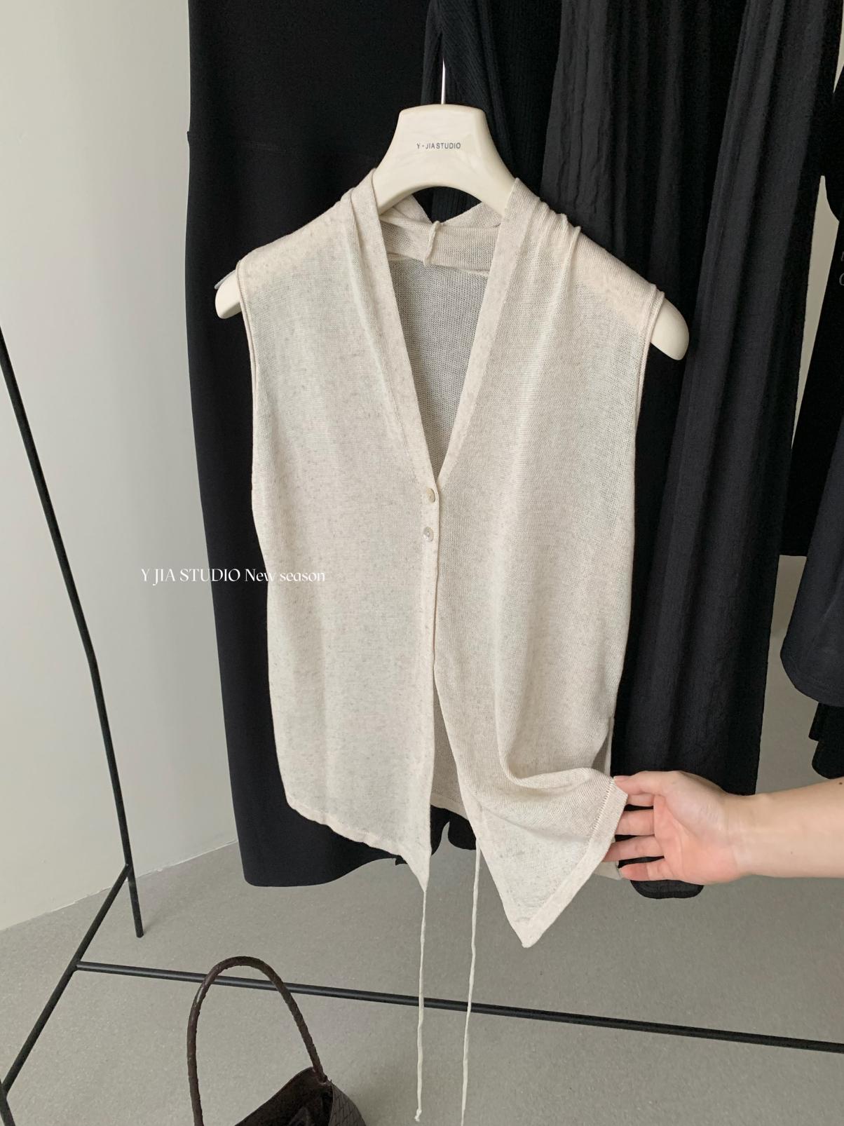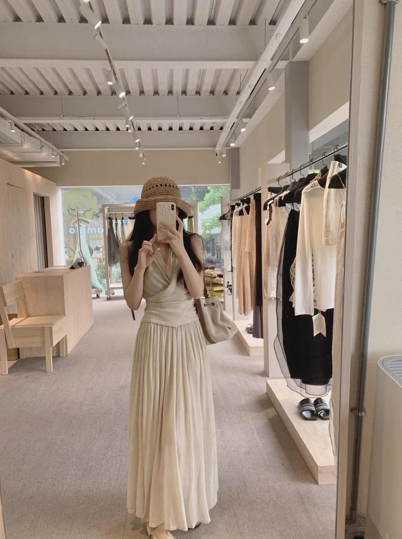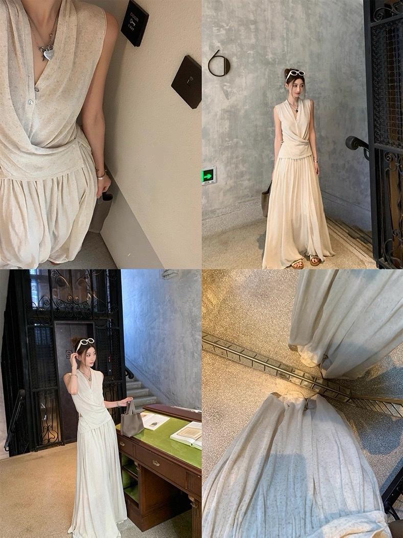 3. 【C6751】氣質無袖開叉不規則綁帶收腰針織背心+鬆緊腰壓褶百搭顯瘦半身裙套裝