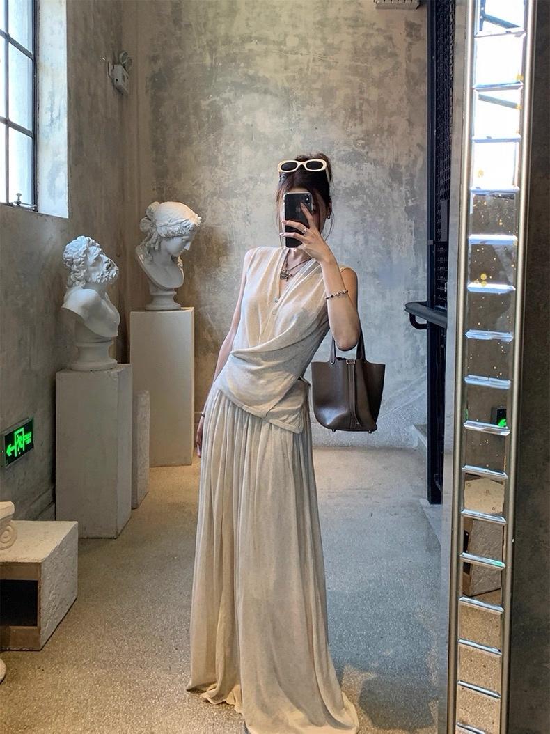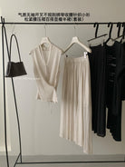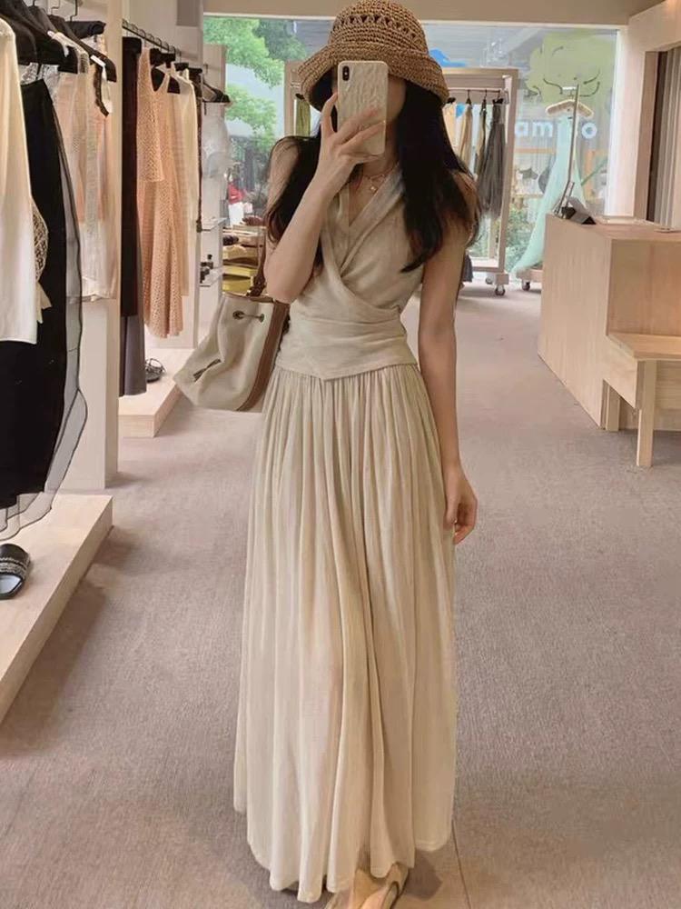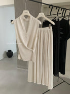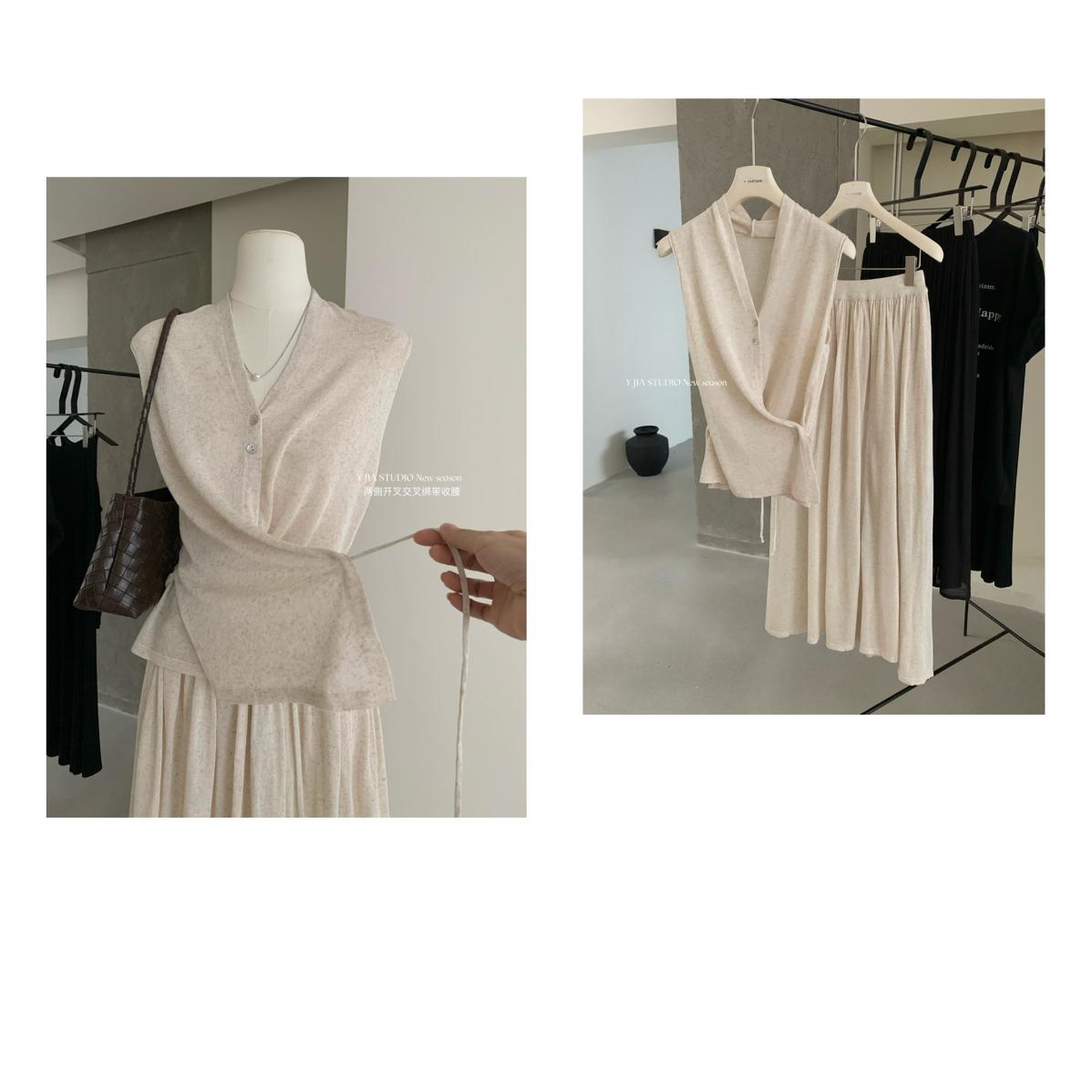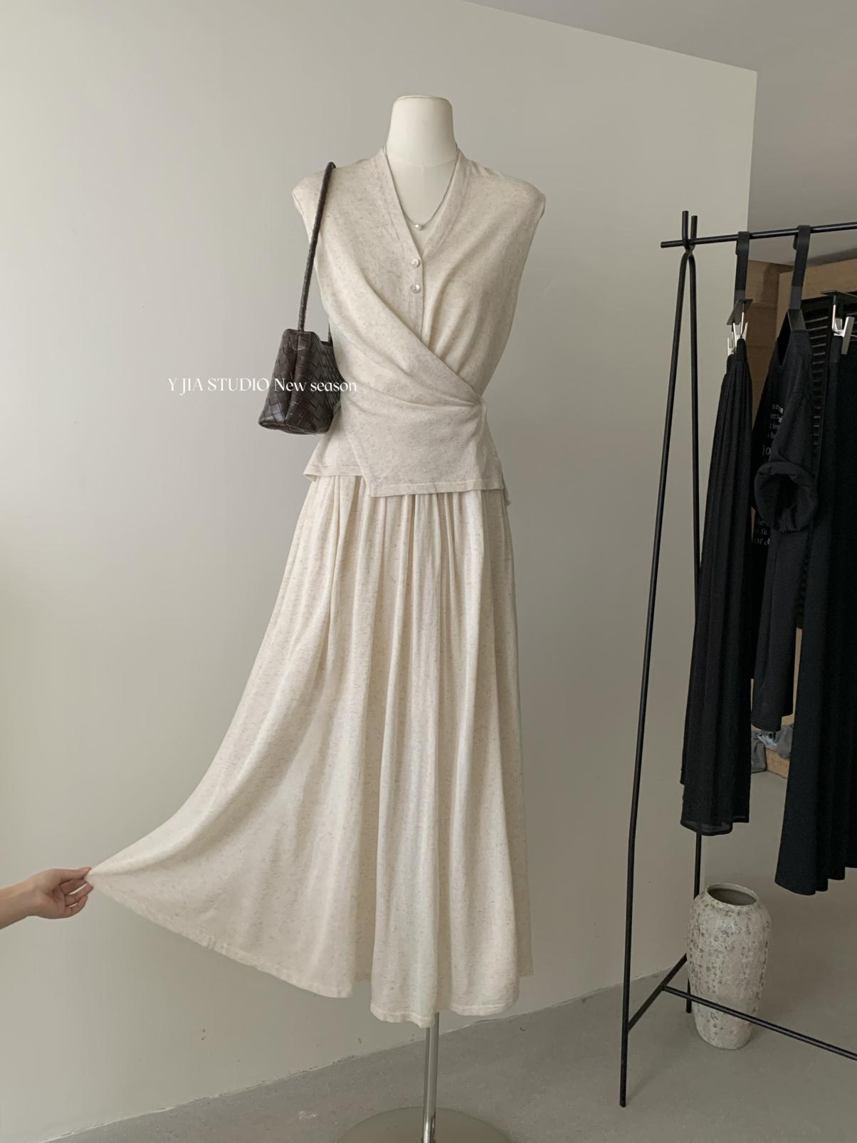 【C6751】氣質無袖開叉不規則綁帶收腰針織背心+鬆緊腰壓褶百搭顯瘦半身裙套裝