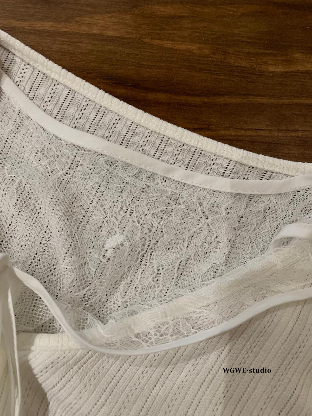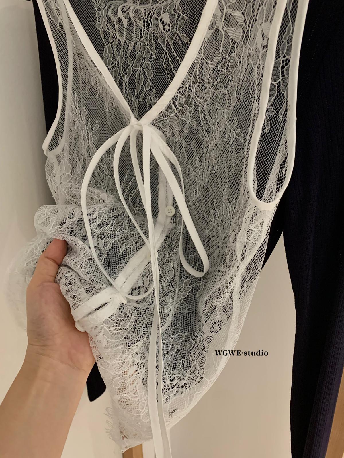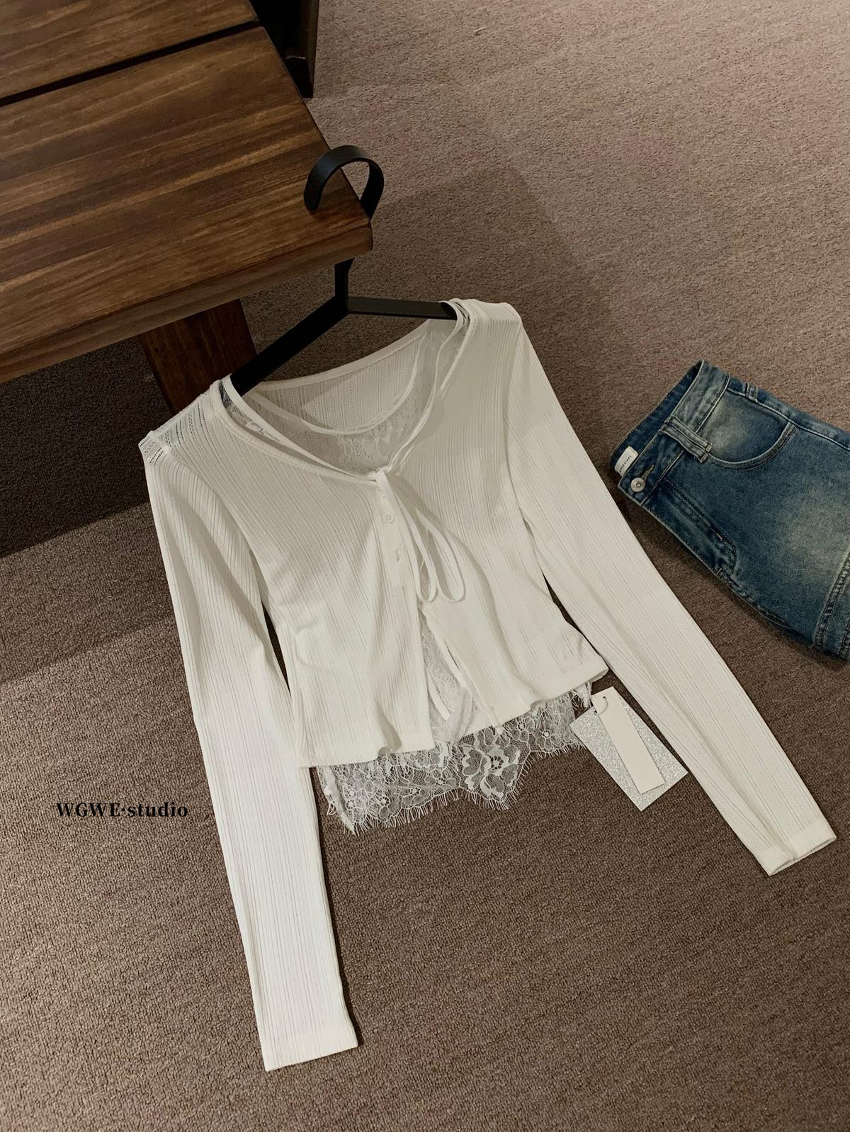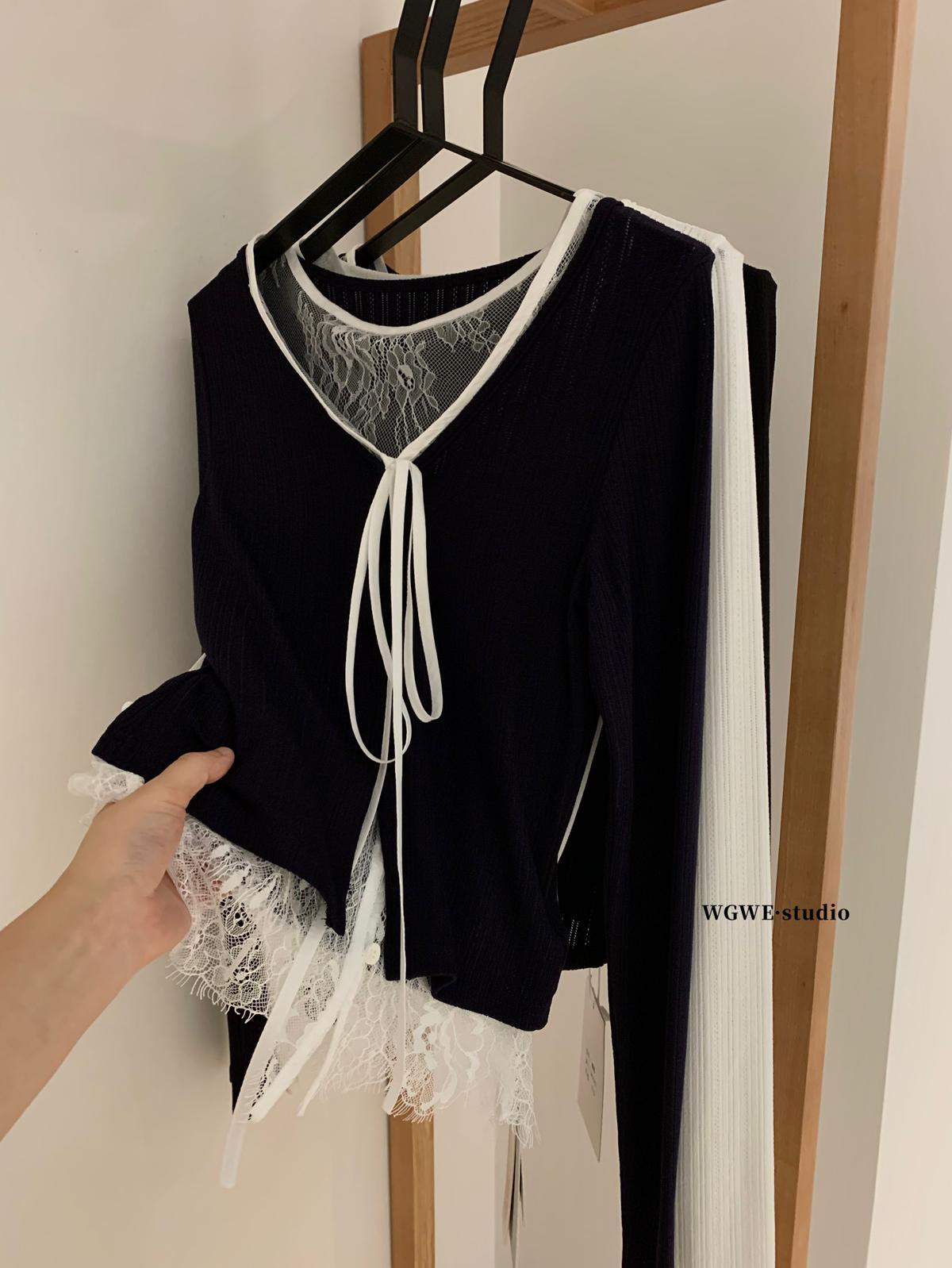 【C6885】蕾絲拼接綁帶撞色獨特漂亮掐腰針織衫+小衫套裝