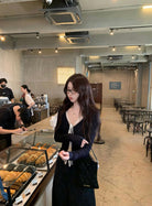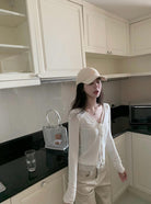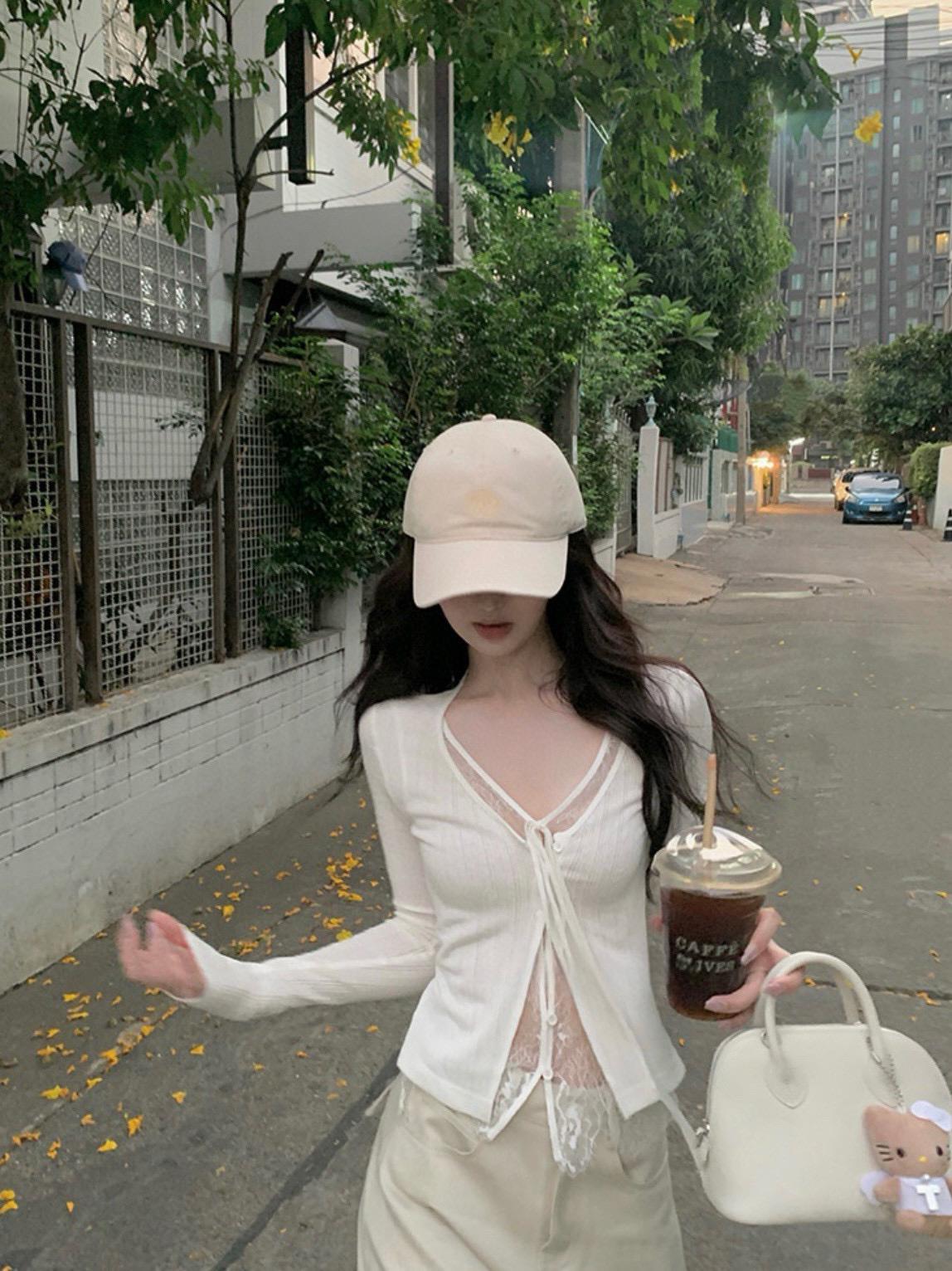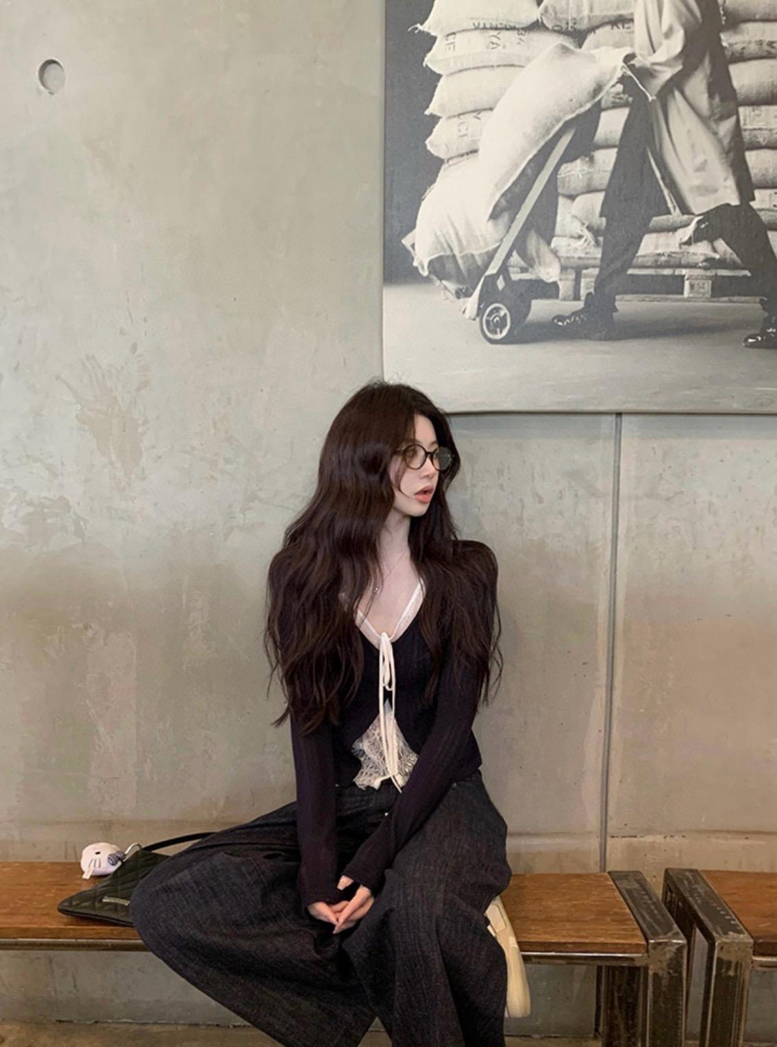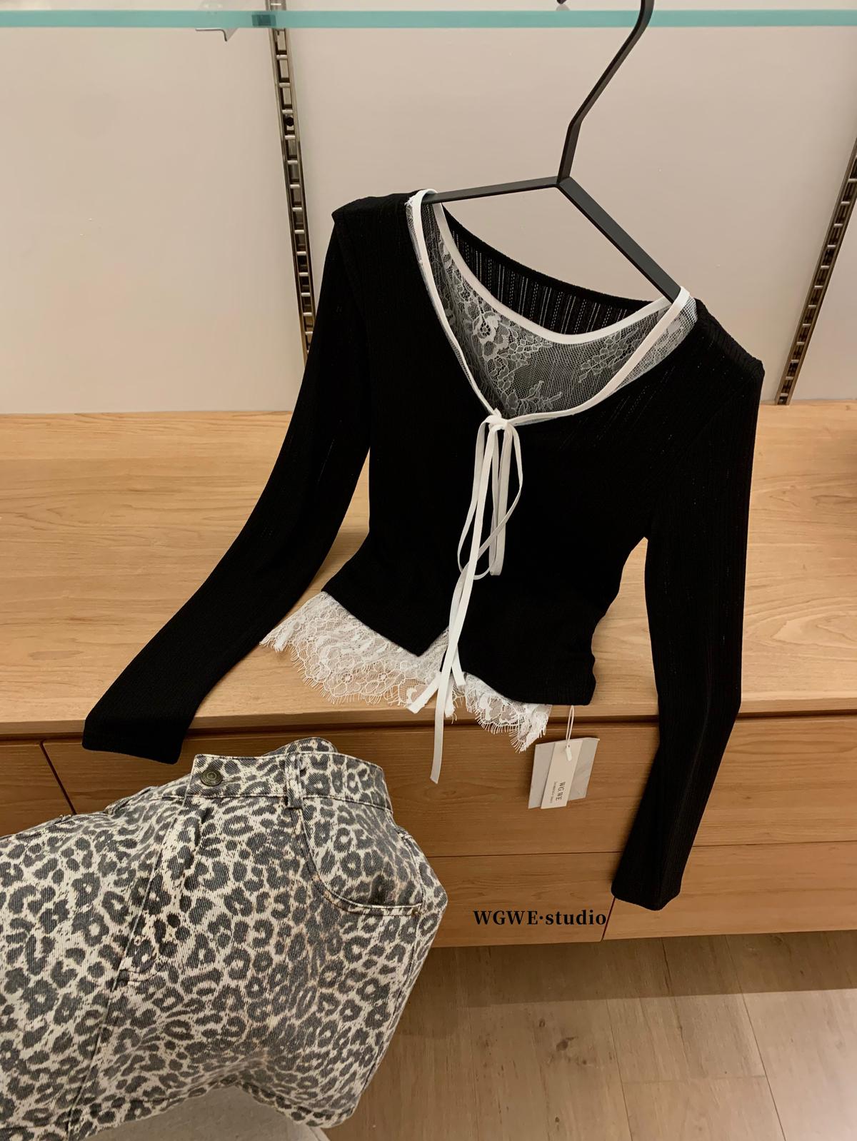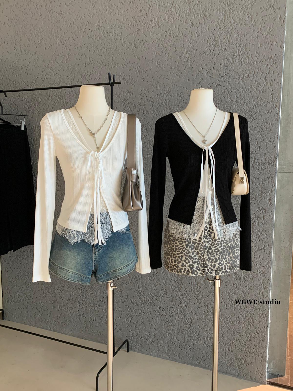 【C6885】蕾絲拼接綁帶撞色獨特漂亮掐腰針織衫+小衫套裝