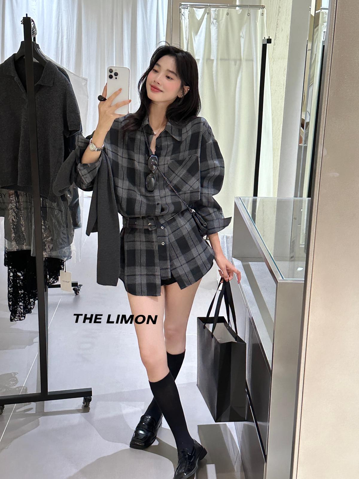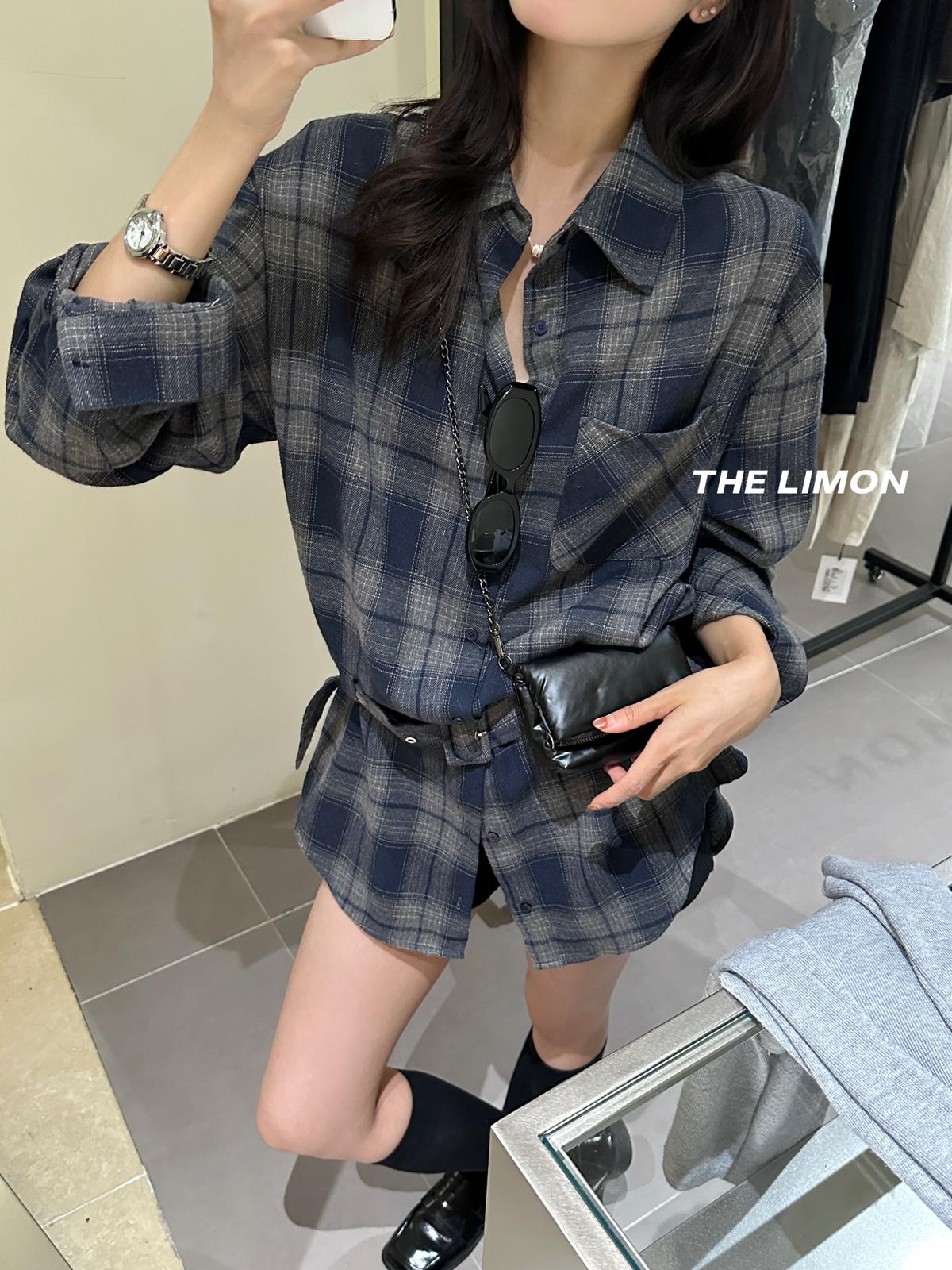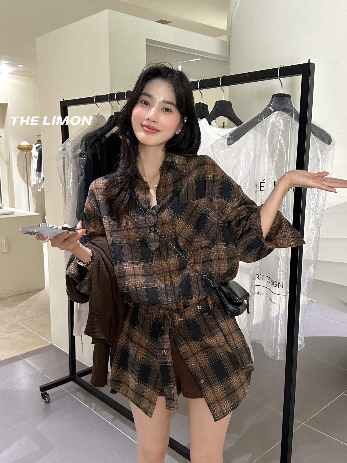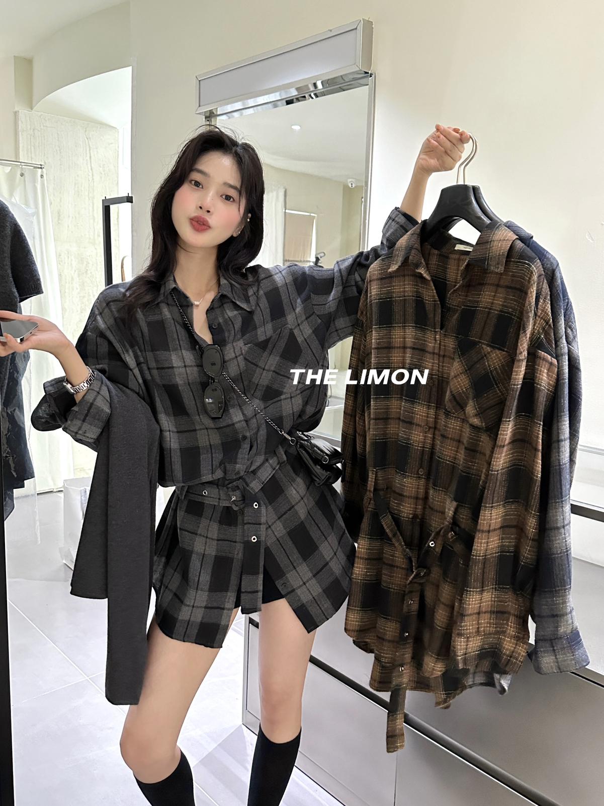【C6941】復古設計感磨毛格紋襯衫(配腰帶)
