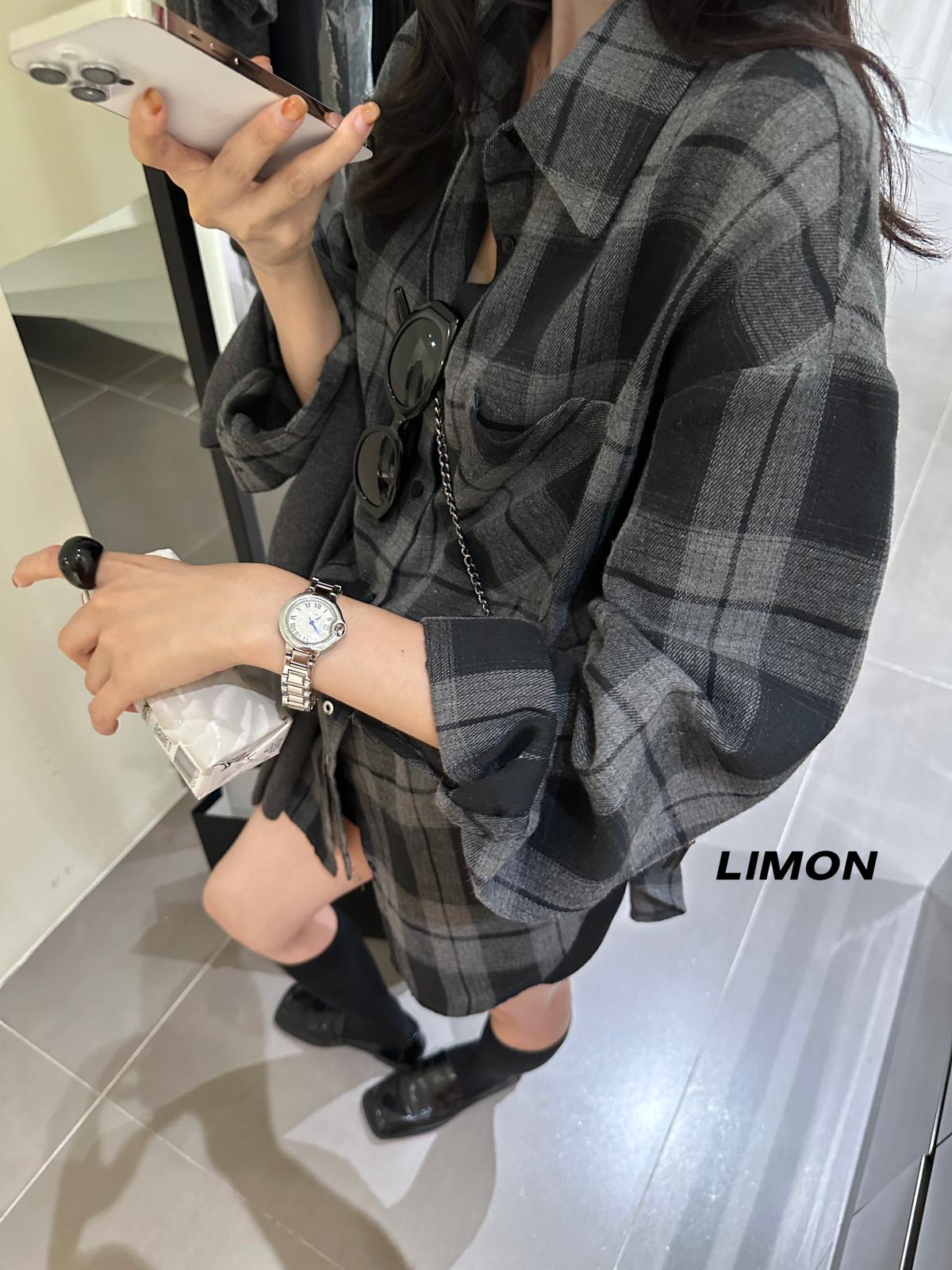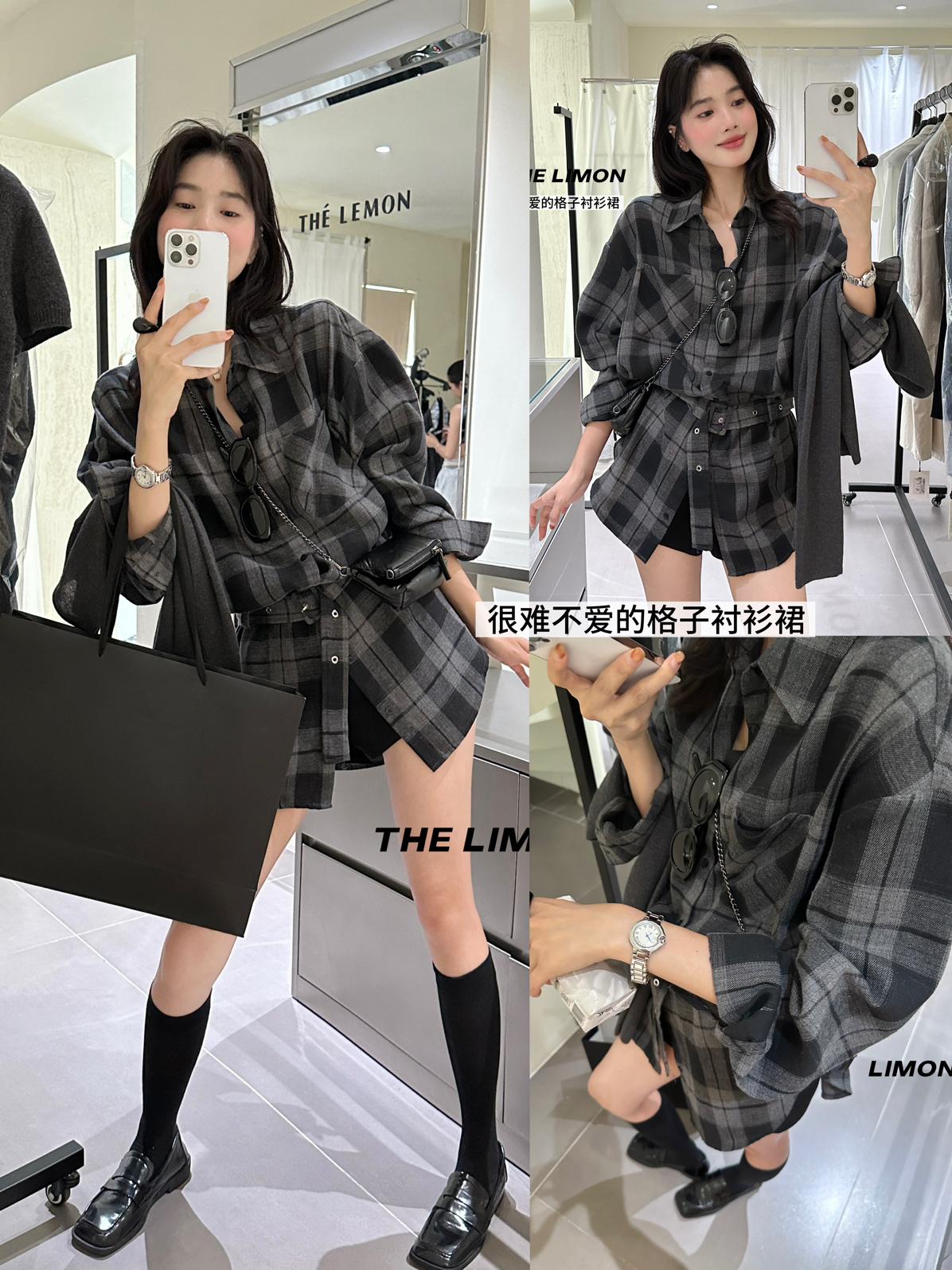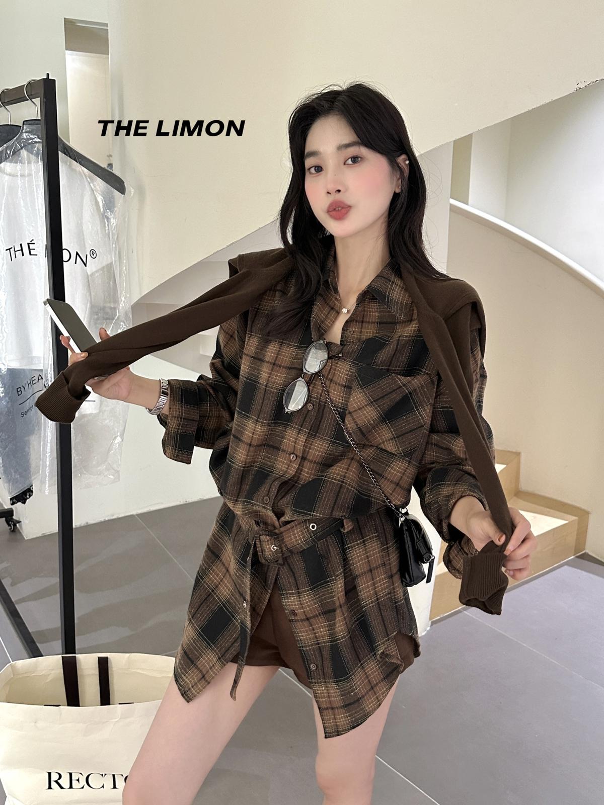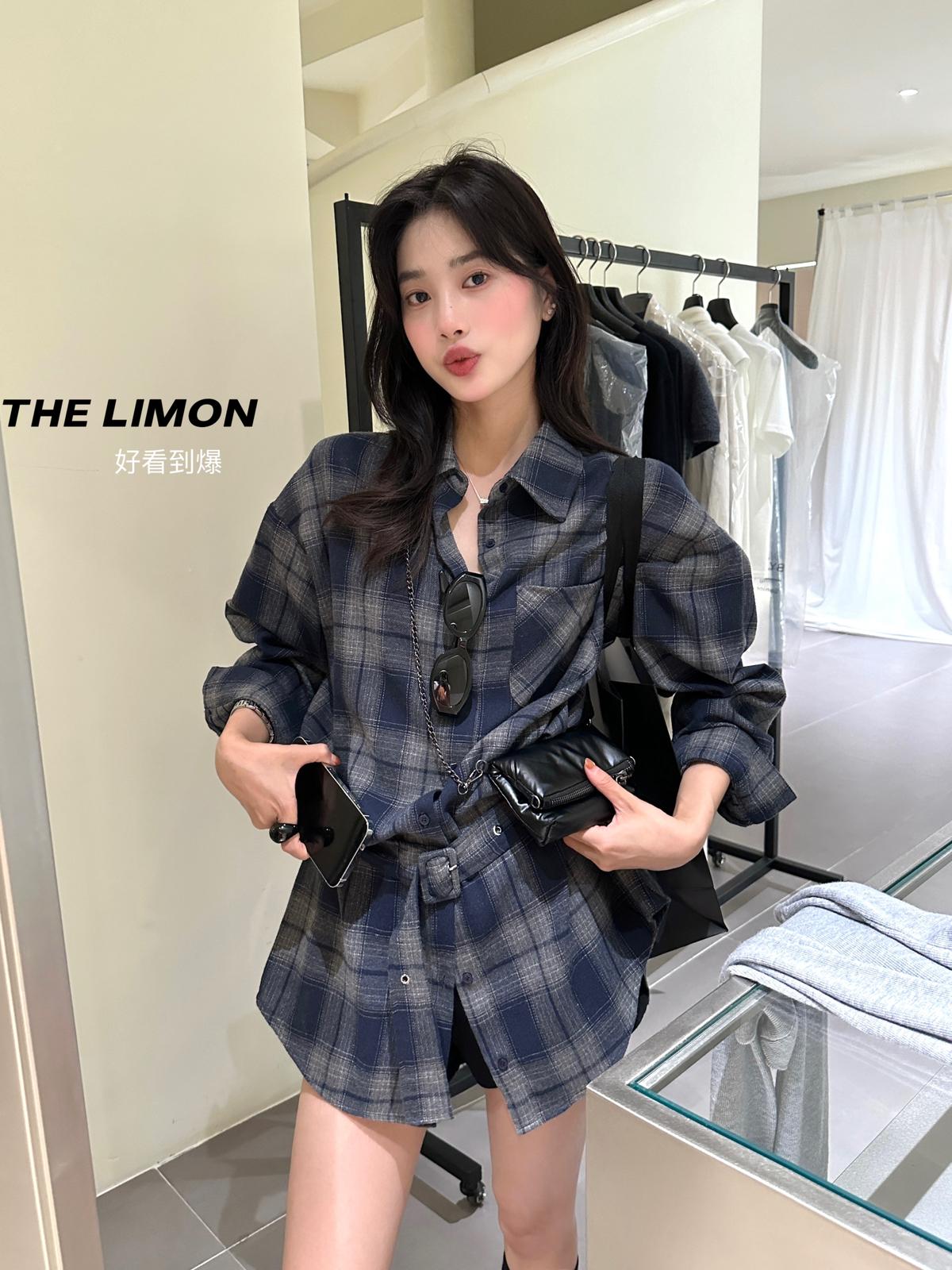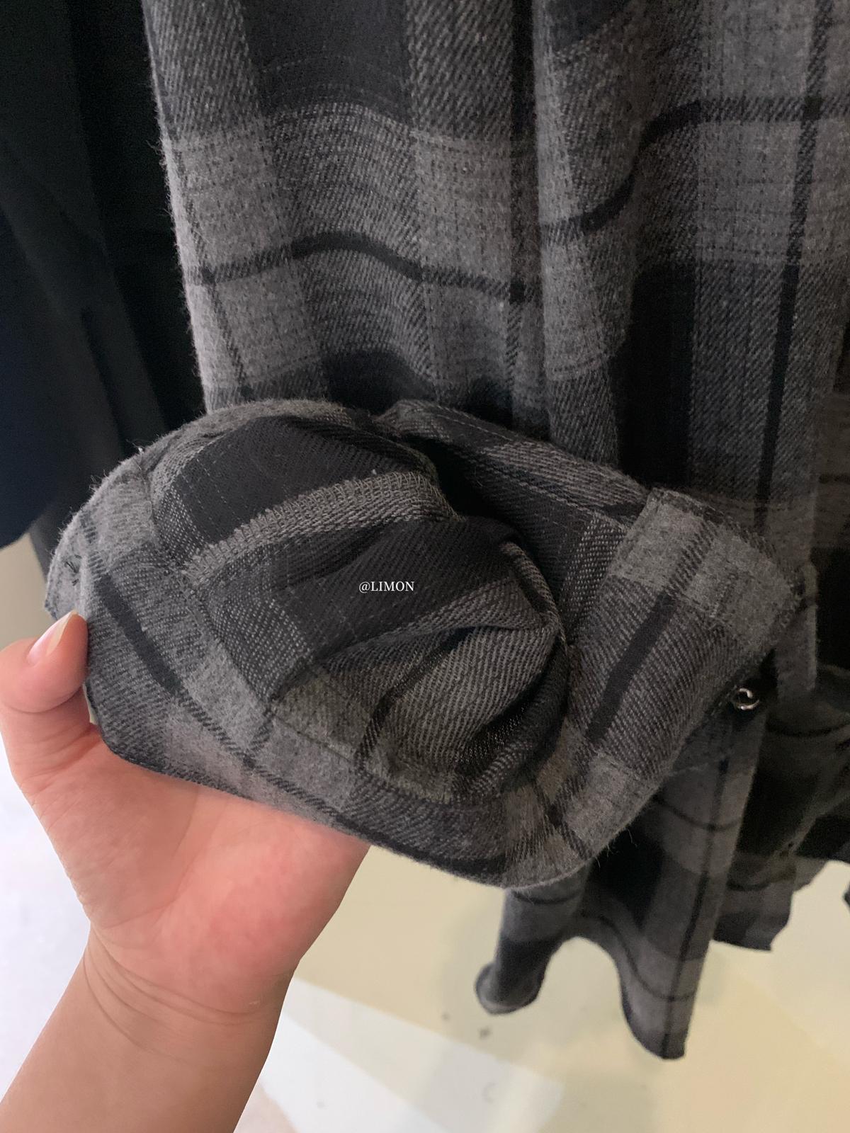 【C6941】復古設計感磨毛格紋襯衫(配腰帶)