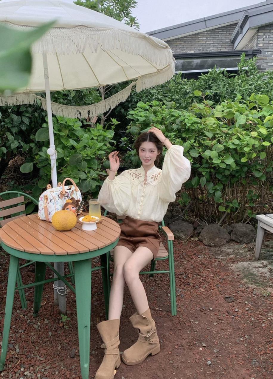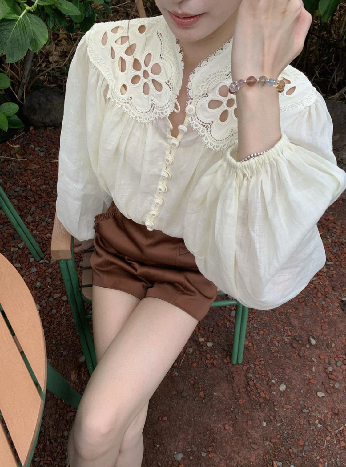 【C7033】法式復古百搭高級感高腰花邊拼接設計寬鬆闊腿休閒短褲