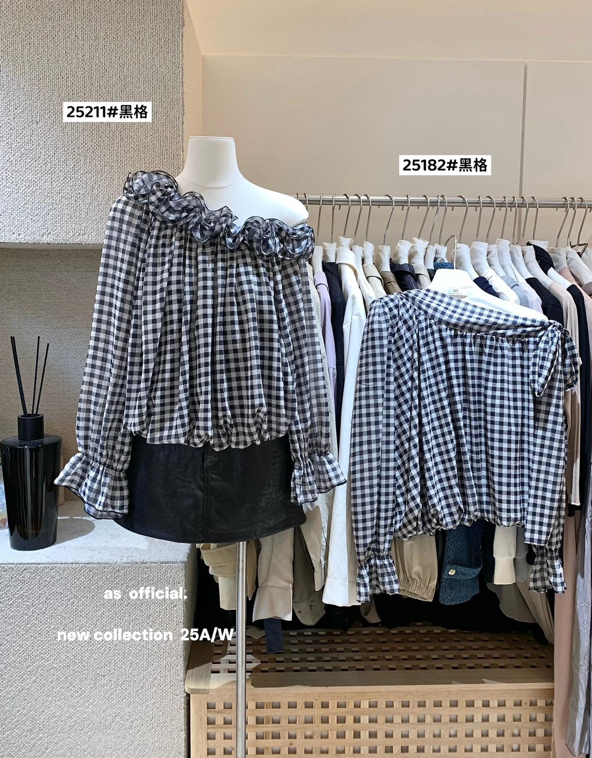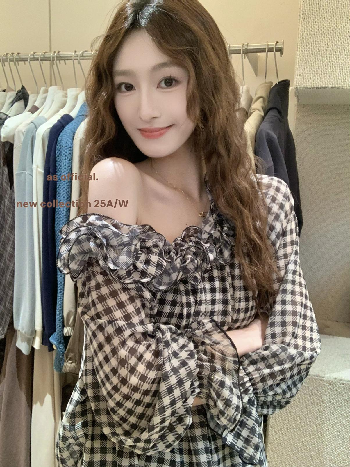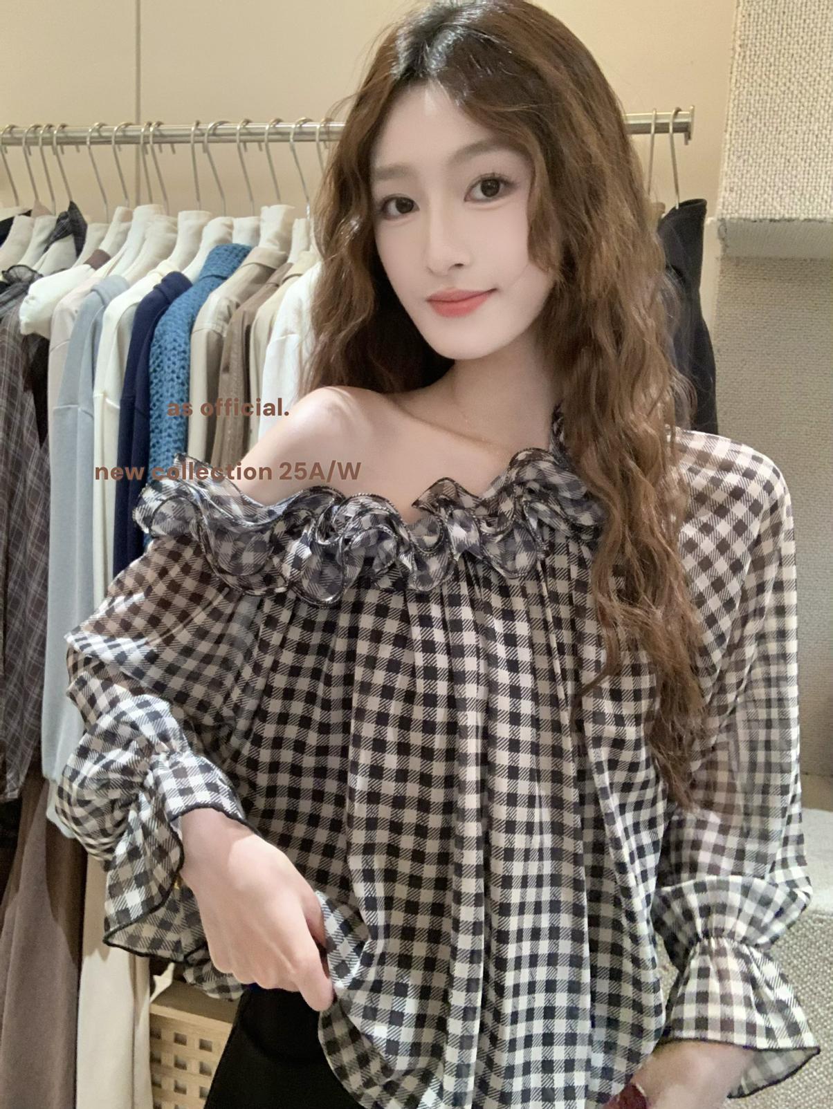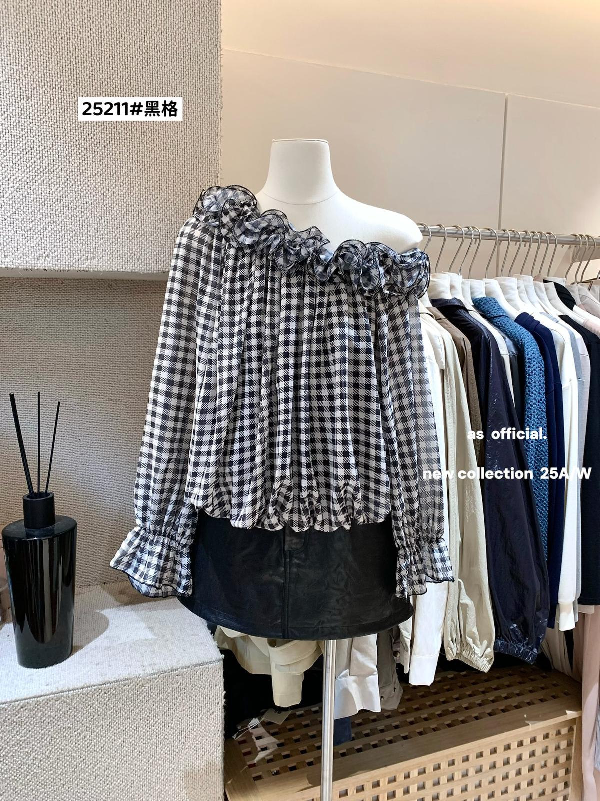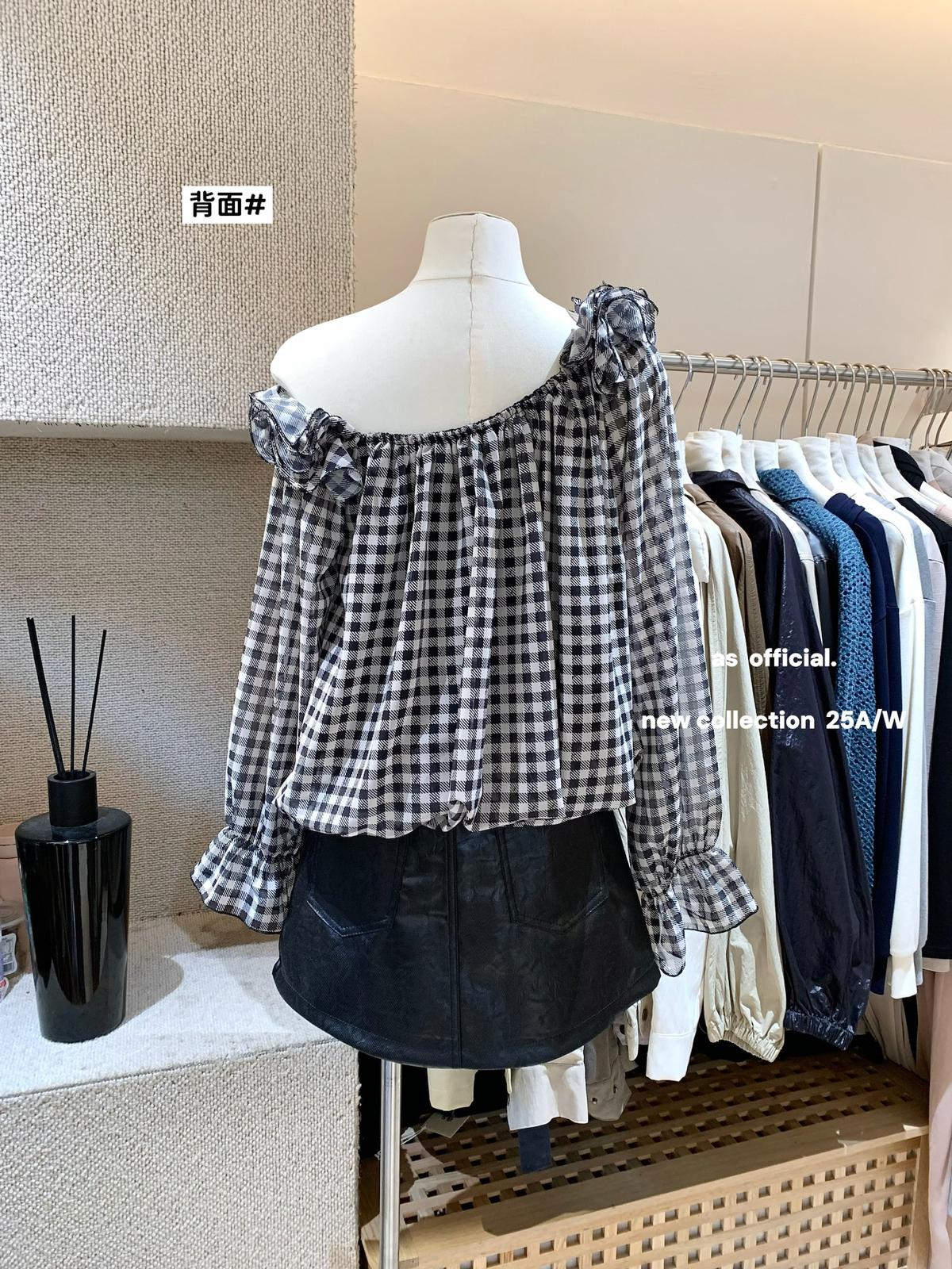 【C7065】銷冠系列款!美麗無上限·復古格紋 斜肩雪紡衫小衫
