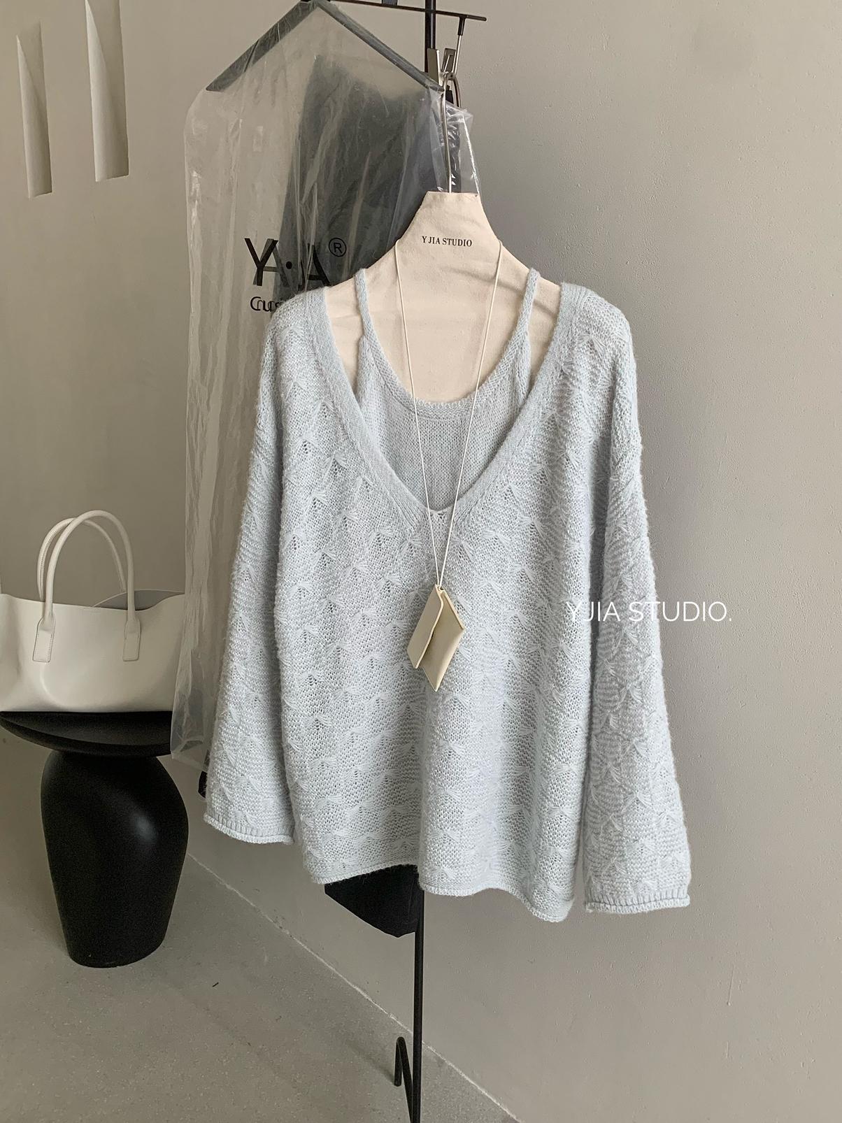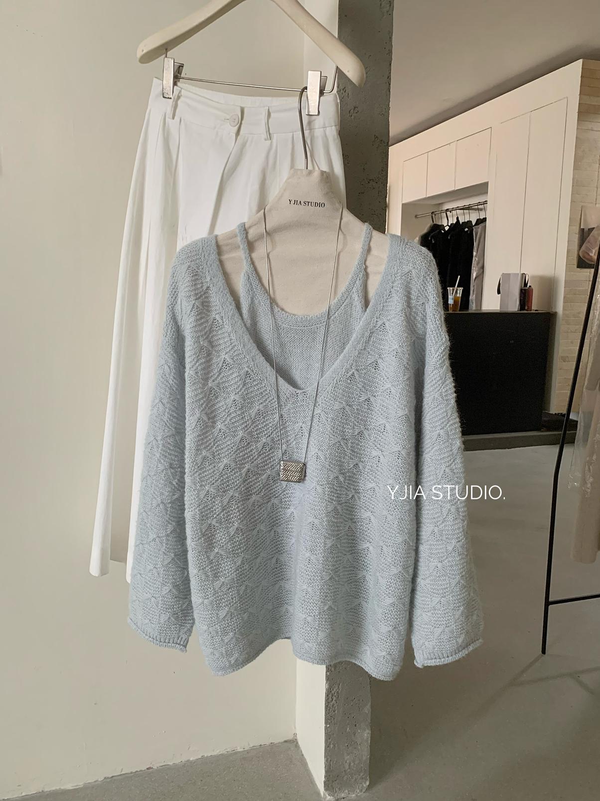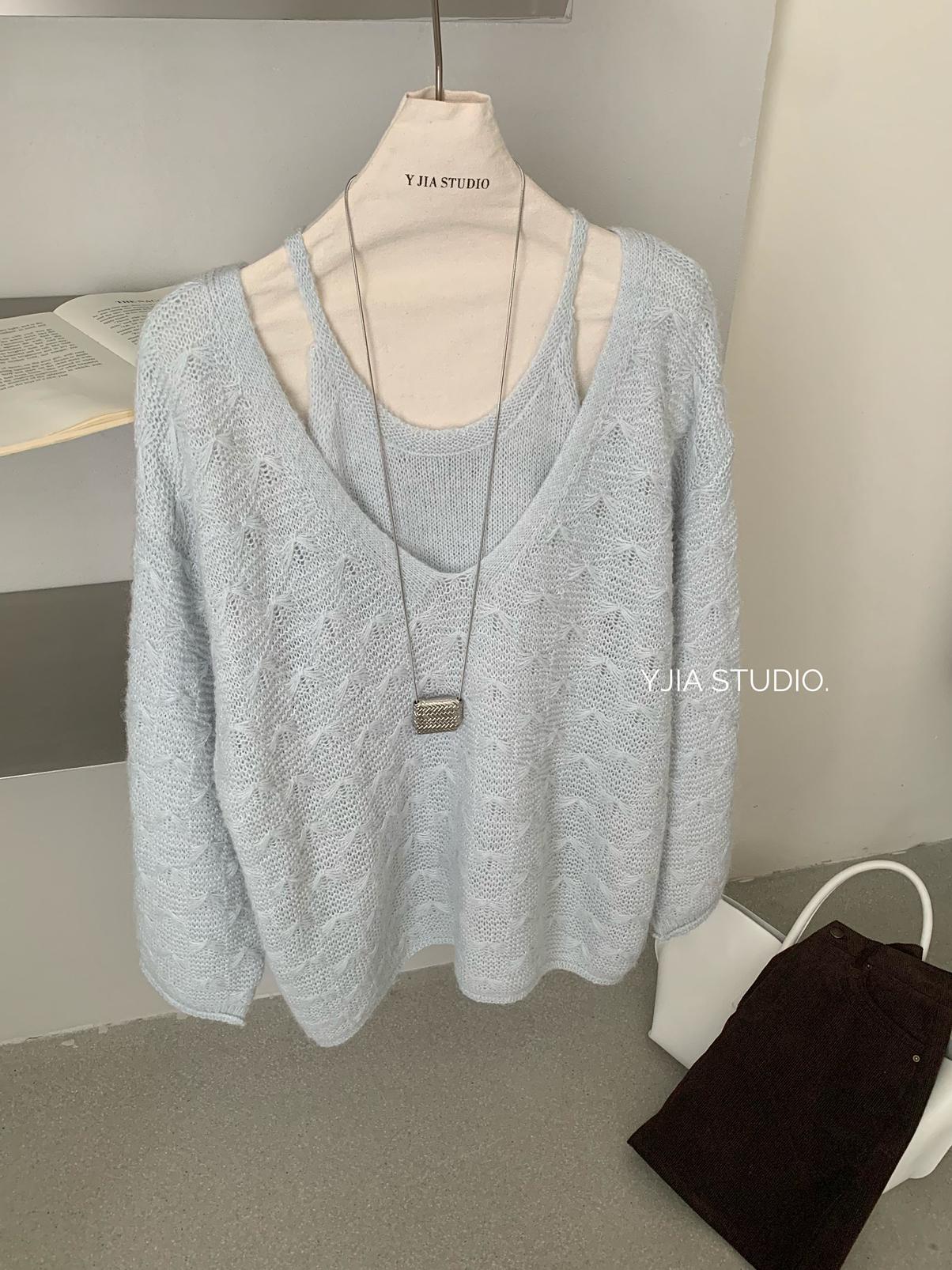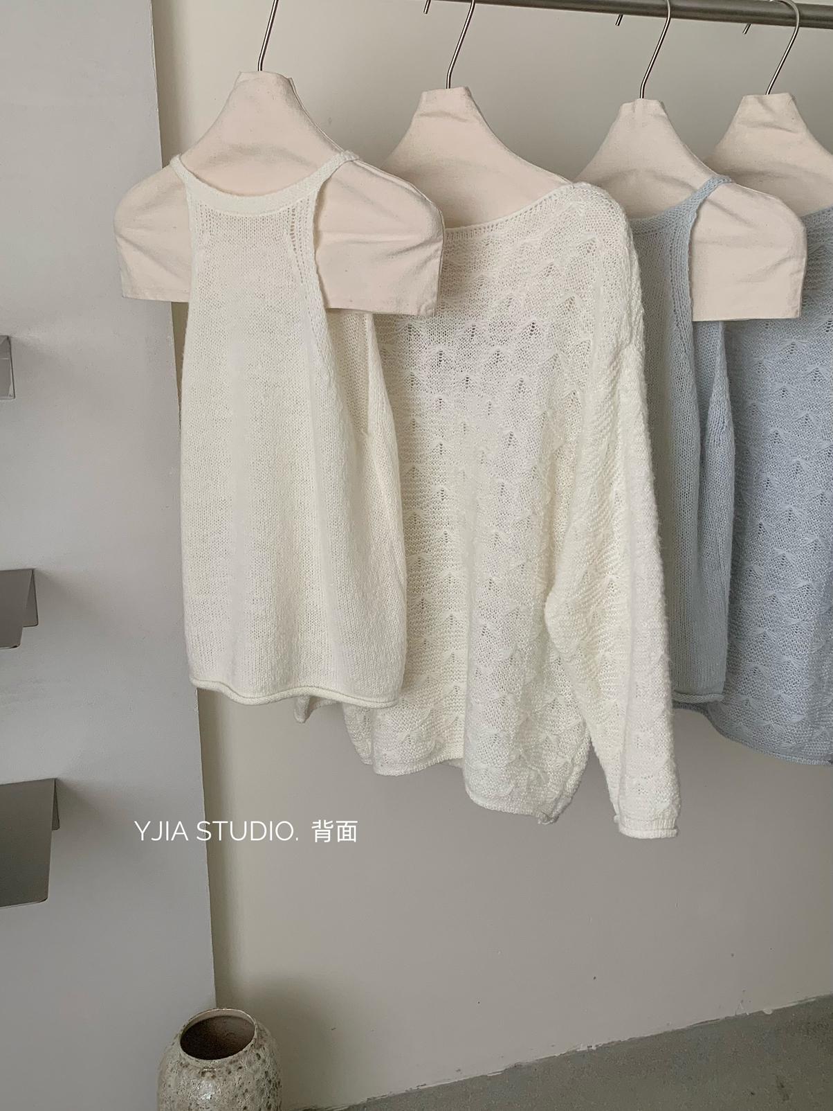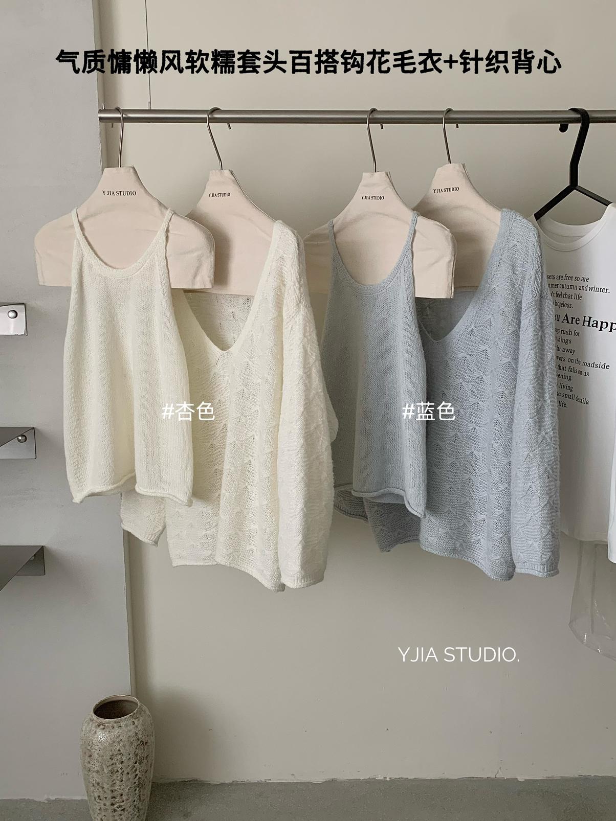 3. 【C7075】氣質慵懶風軟糯套頭百搭鉤花毛衣+針織背心兩件套裝