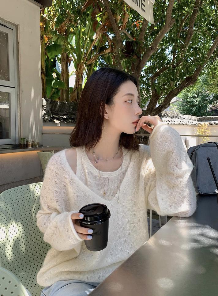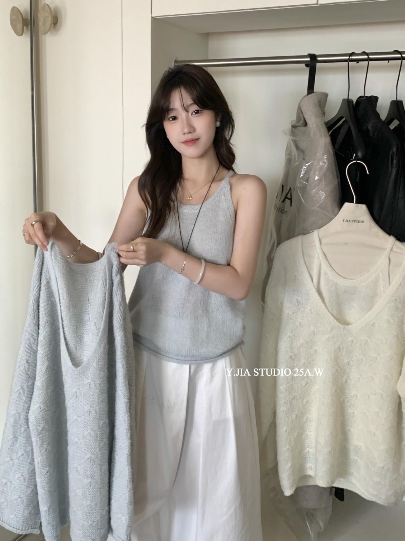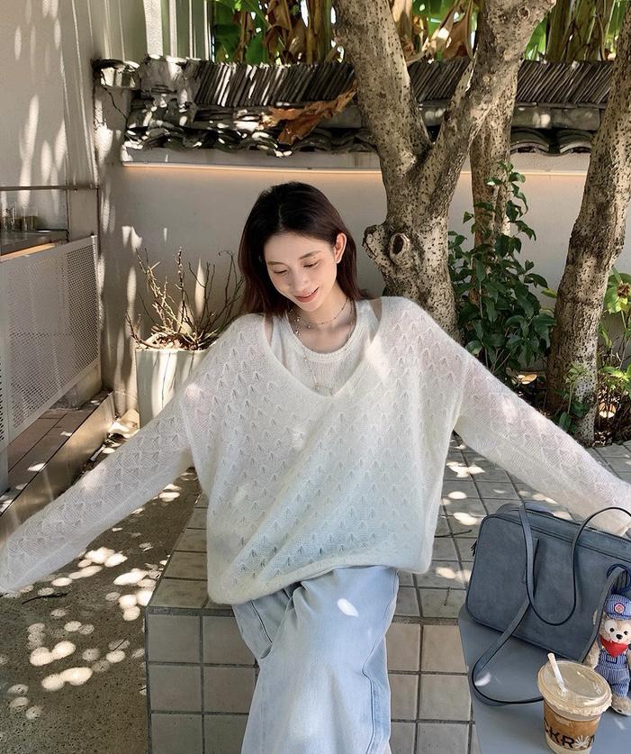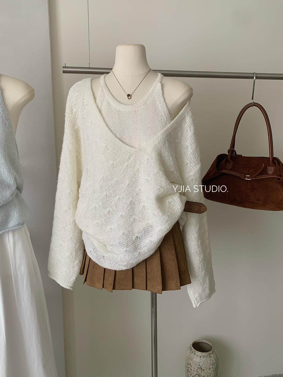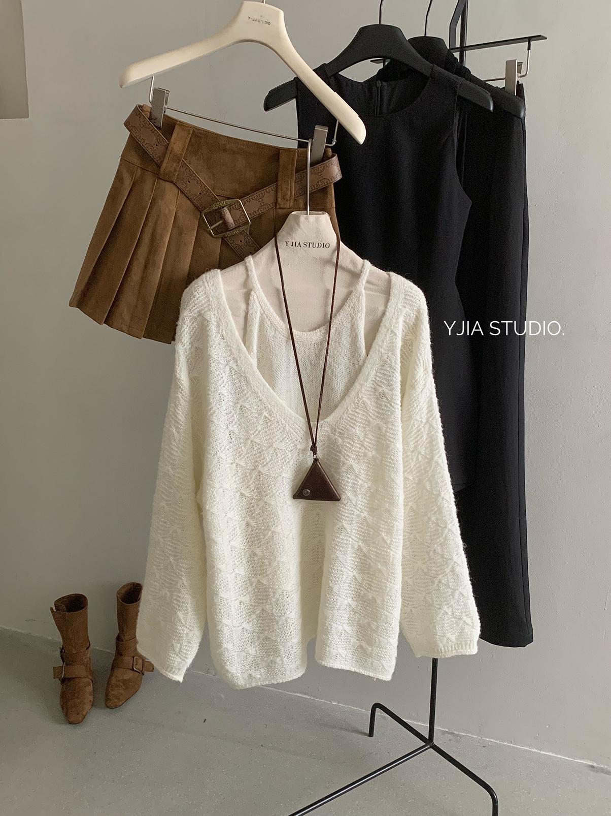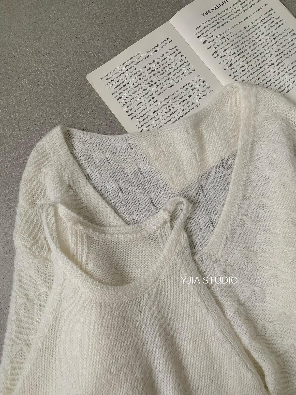 3. 【C7075】氣質慵懶風軟糯套頭百搭鉤花毛衣+針織背心兩件套裝