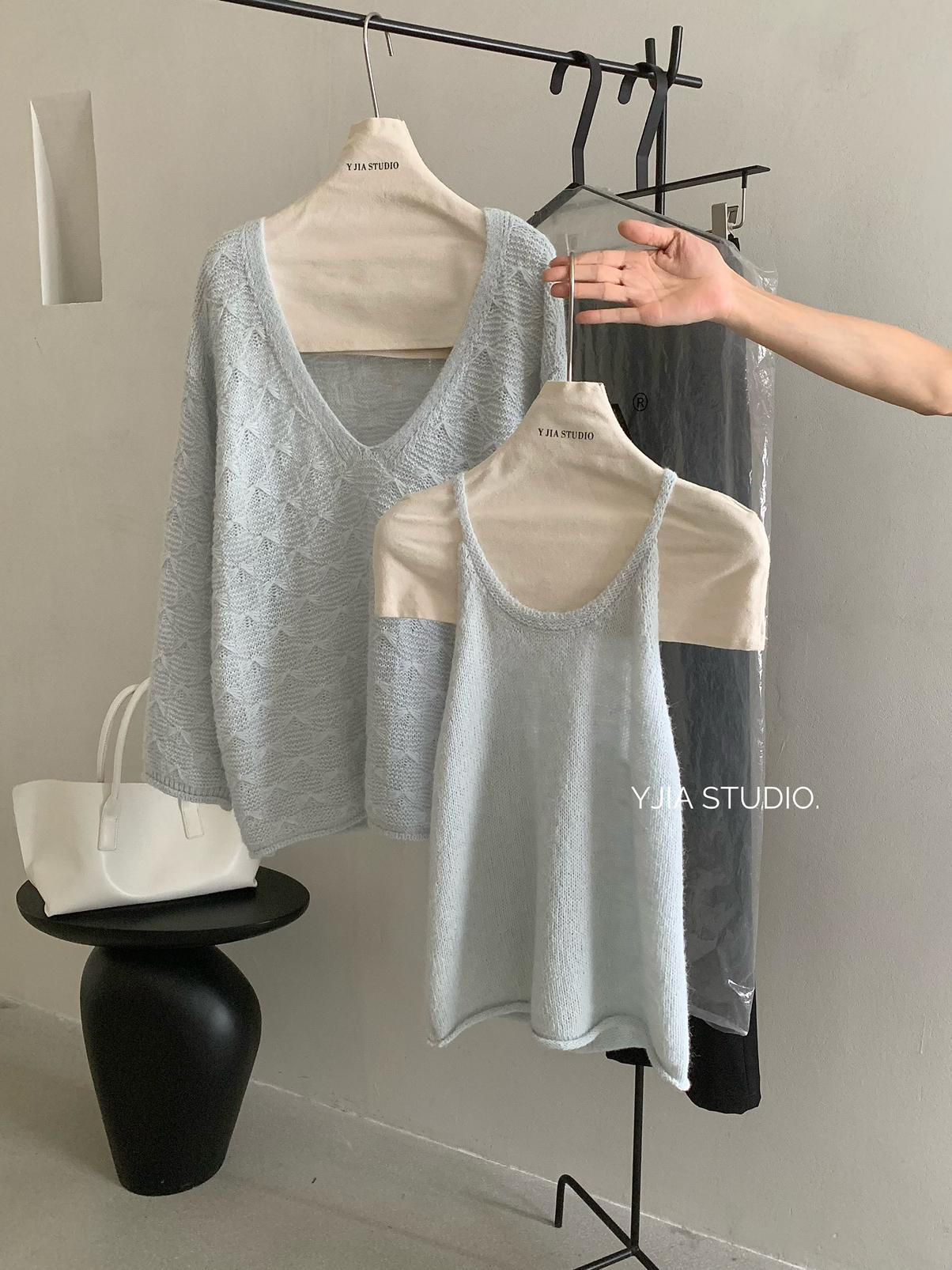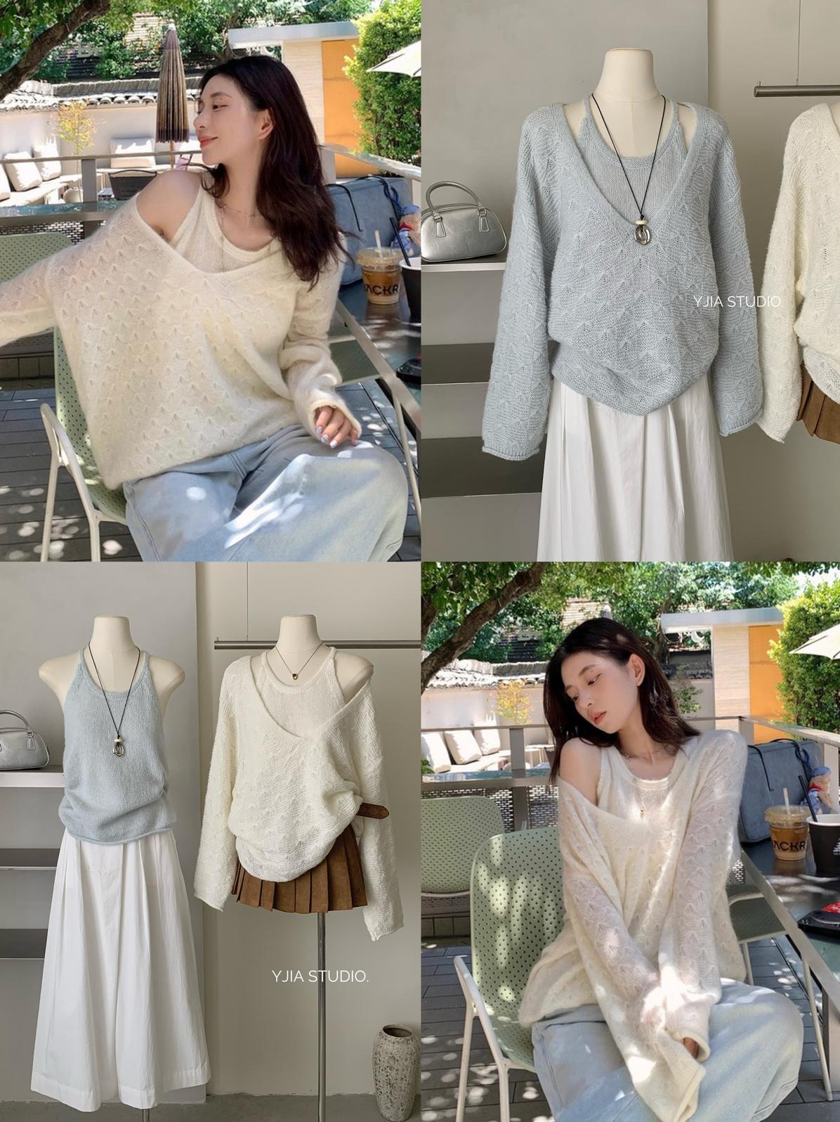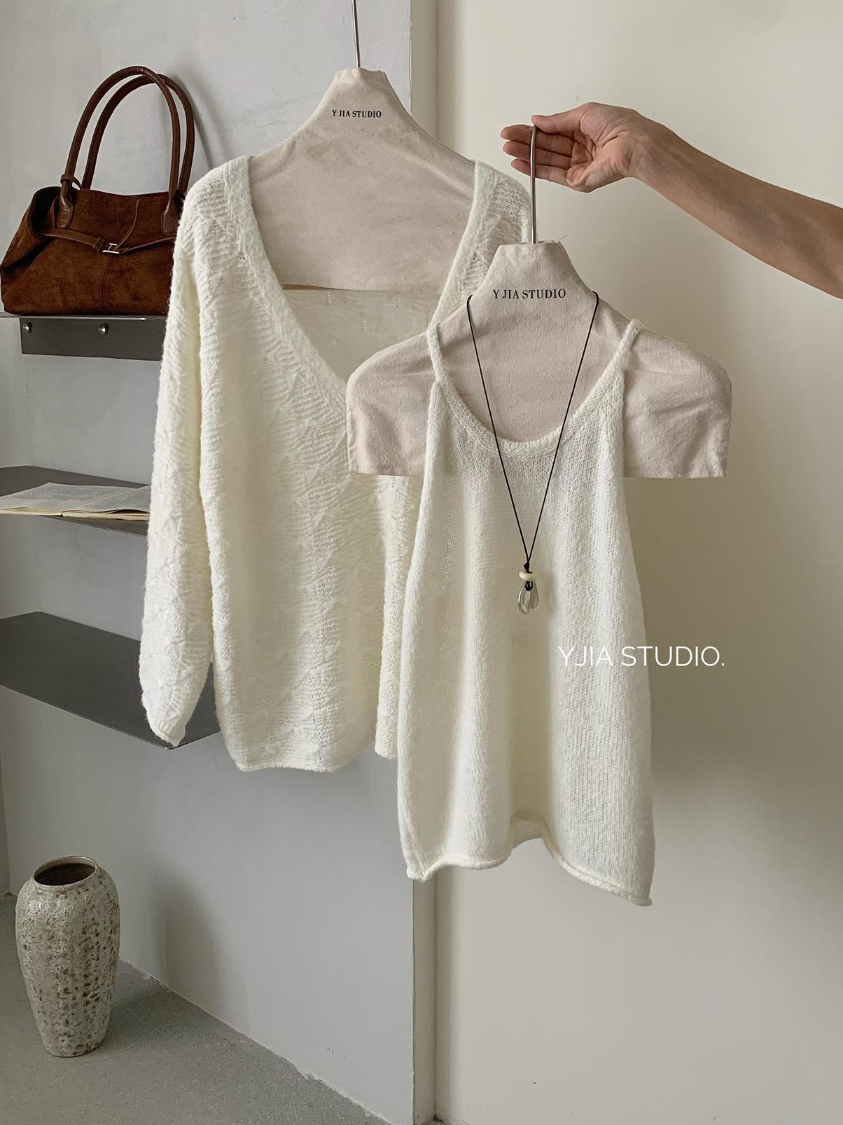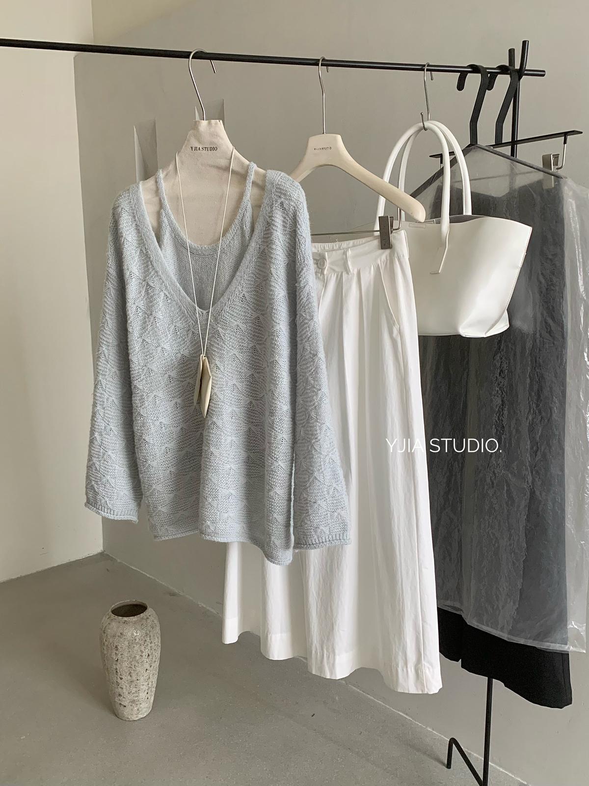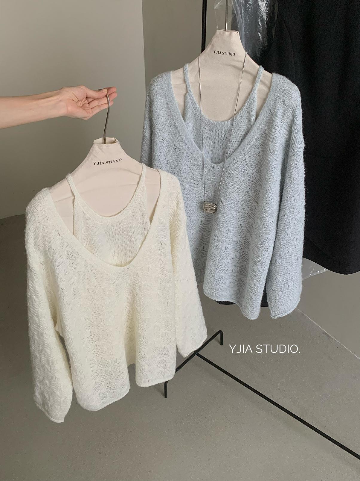 3. 【C7075】氣質慵懶風軟糯套頭百搭鉤花毛衣+針織背心兩件套裝