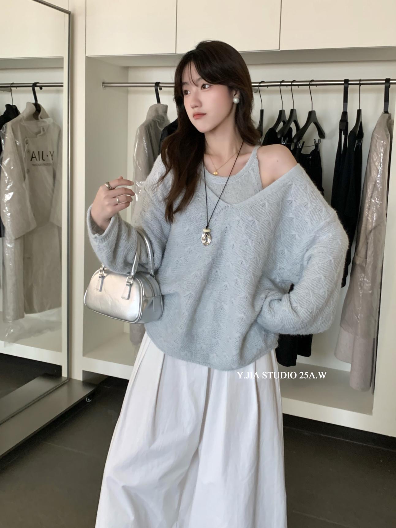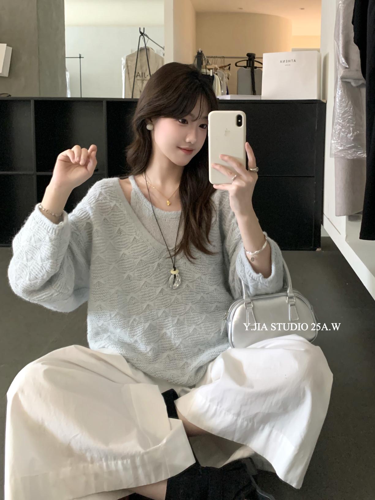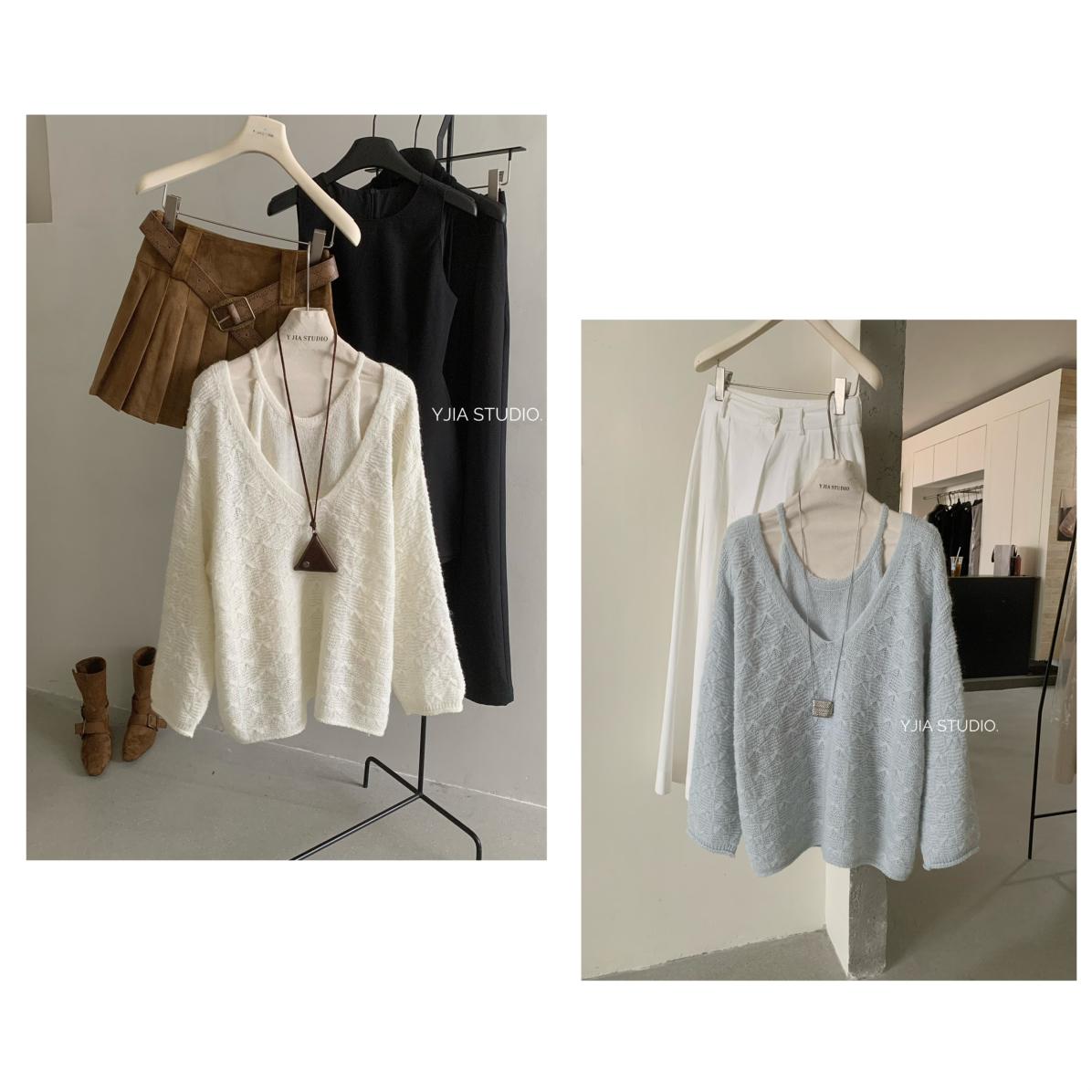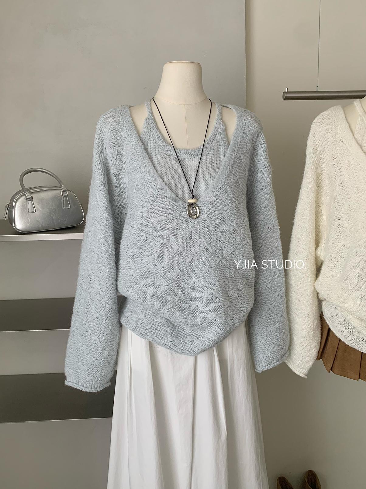 【C7075】氣質慵懶風軟糯套頭百搭鉤花毛衣+針織背心兩件套裝