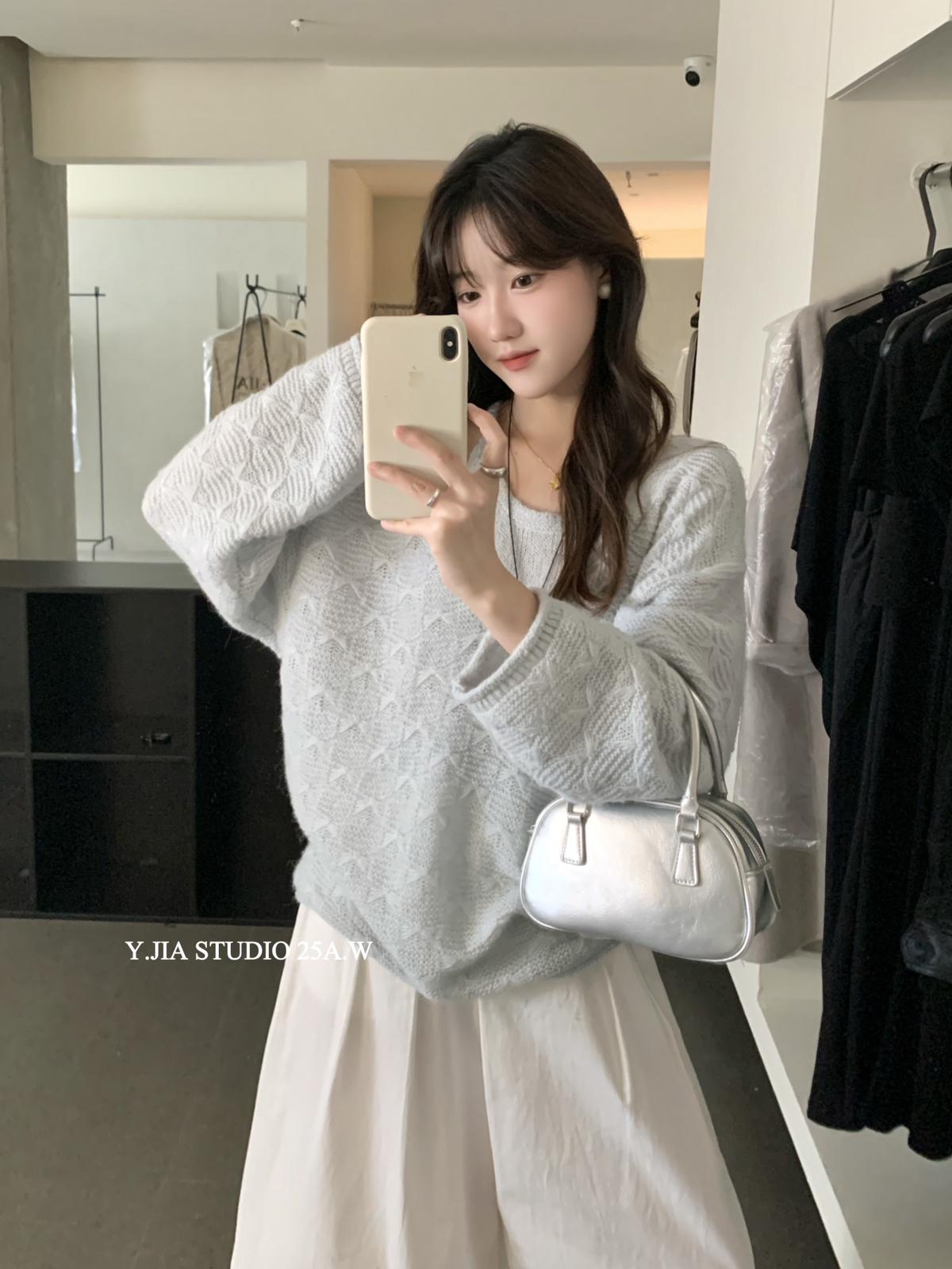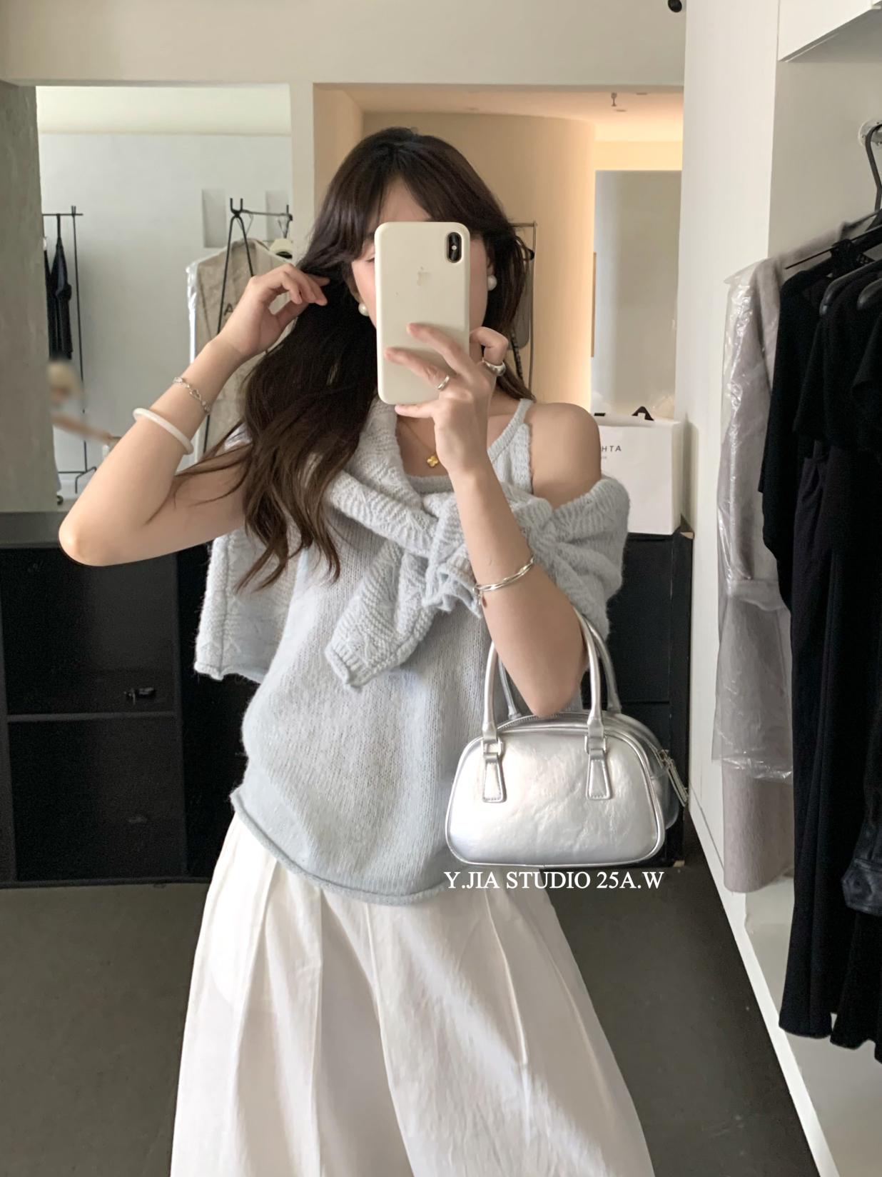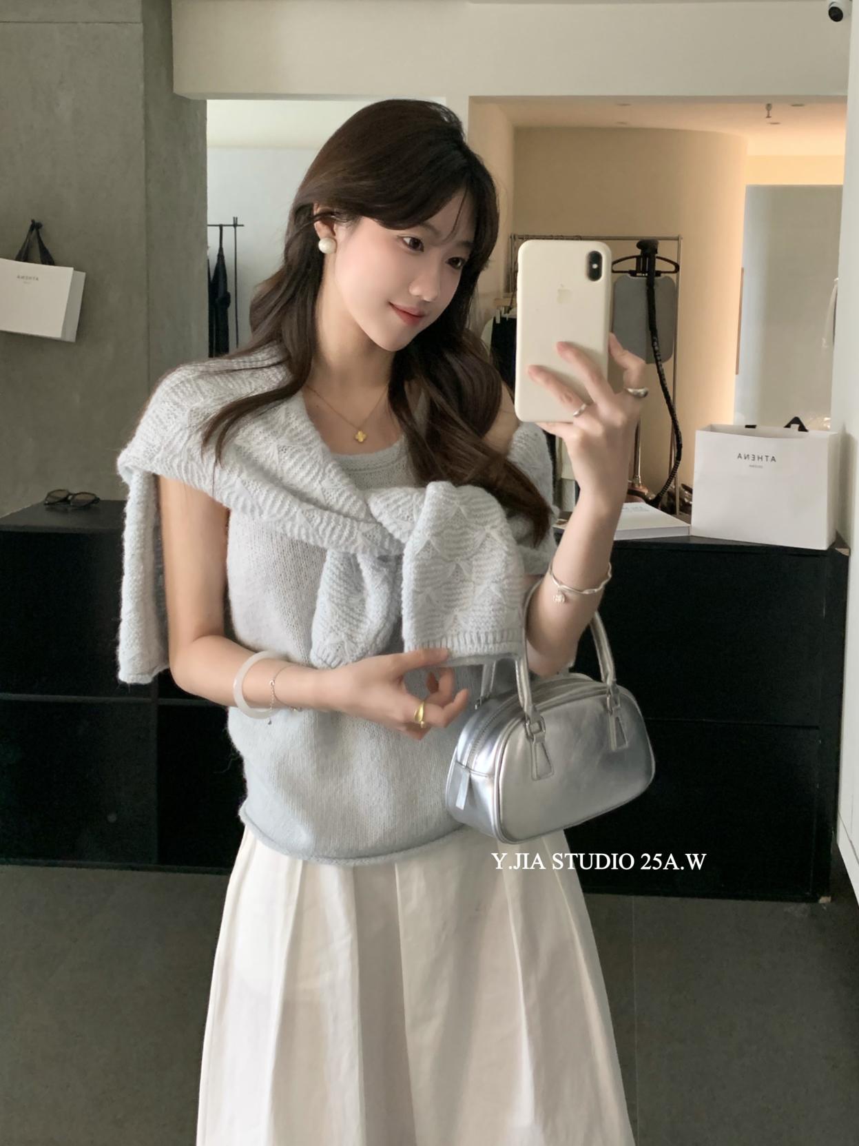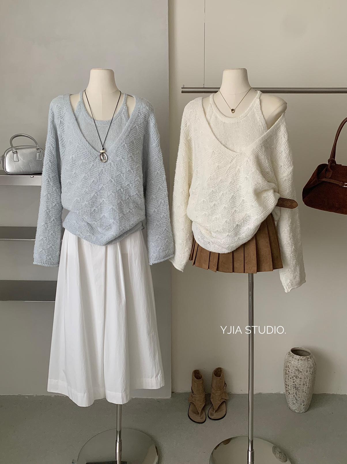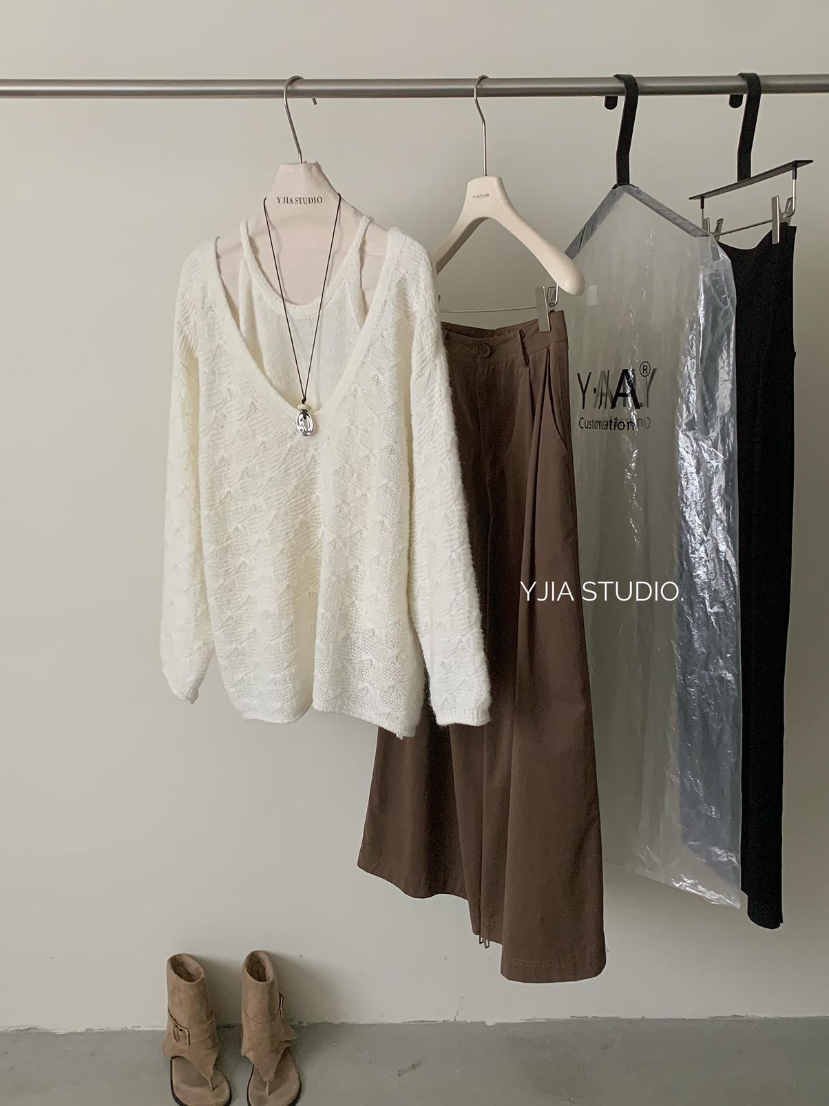 【C7075】氣質慵懶風軟糯套頭百搭鉤花毛衣+針織背心兩件套裝