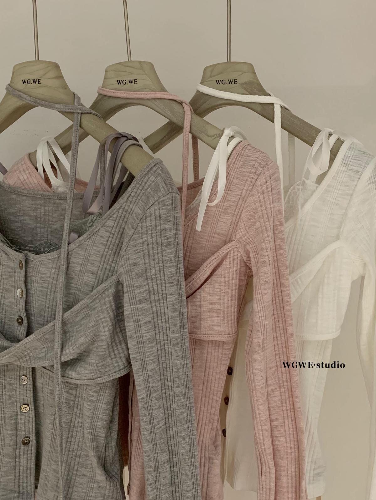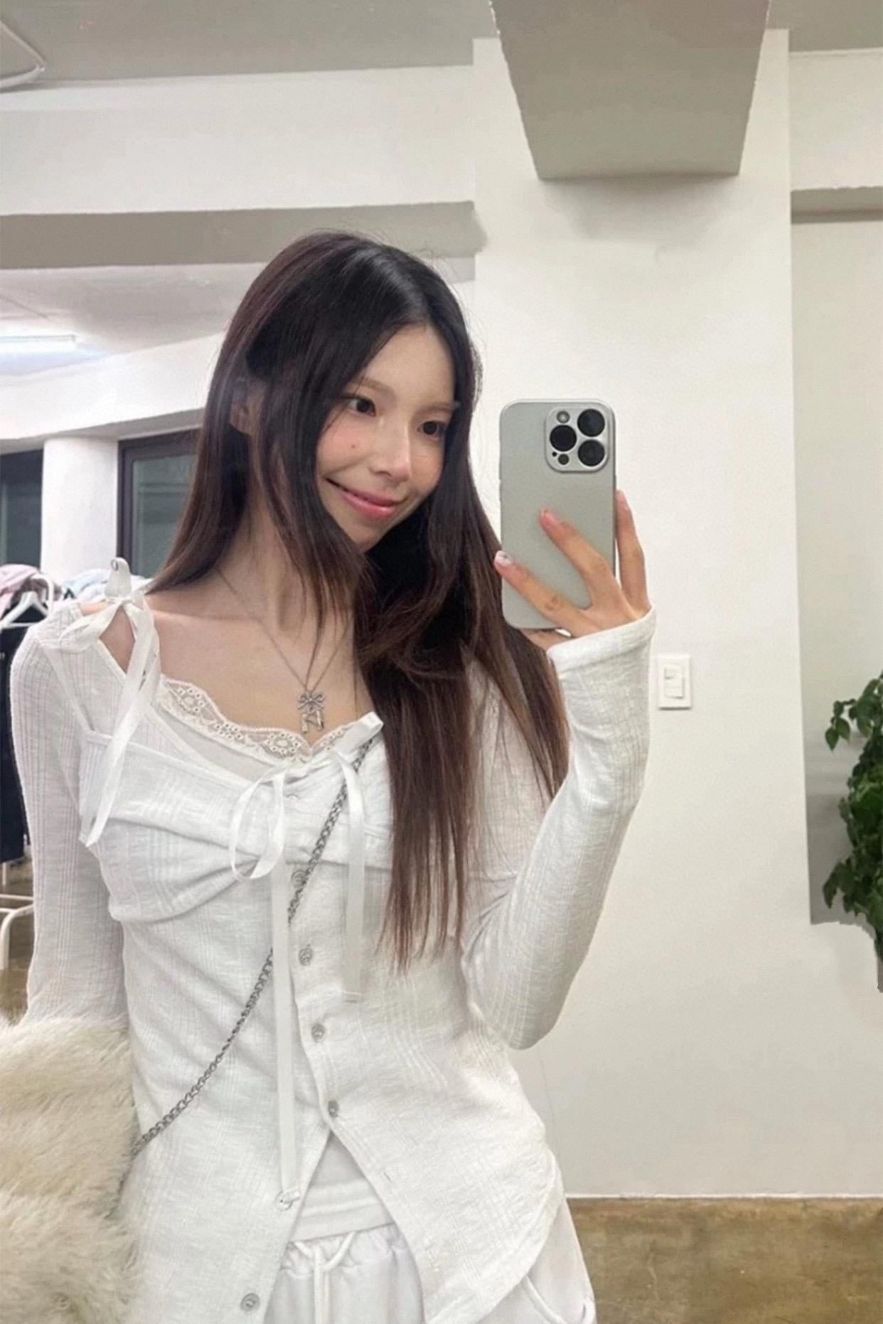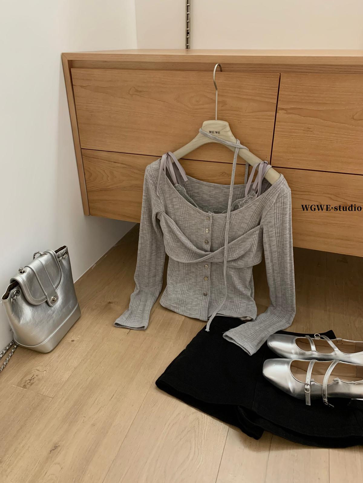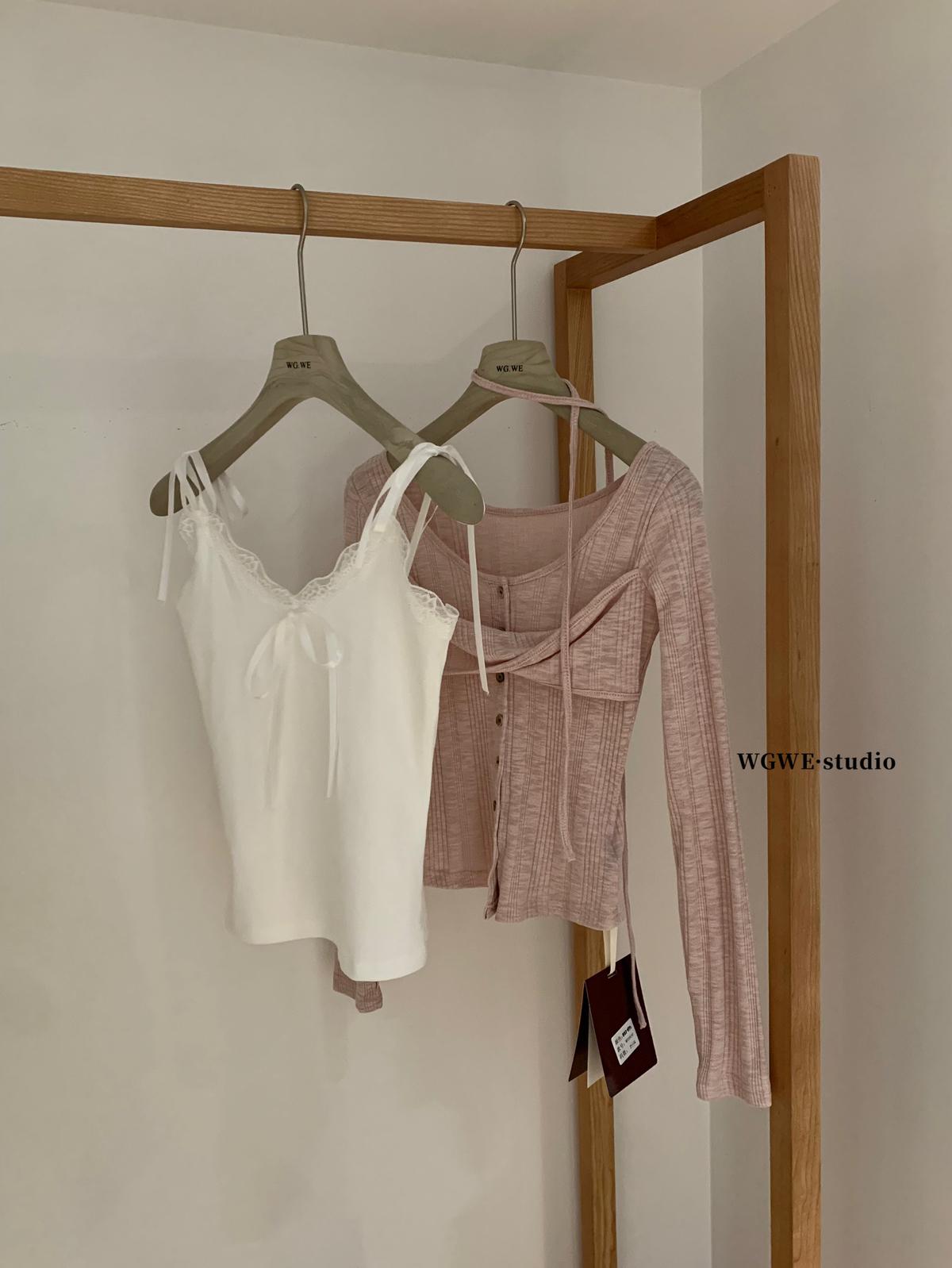 【C7086】疊穿純欲花邊吊帶背心+長袖T恤韓系兩件套裝(配飄繩)