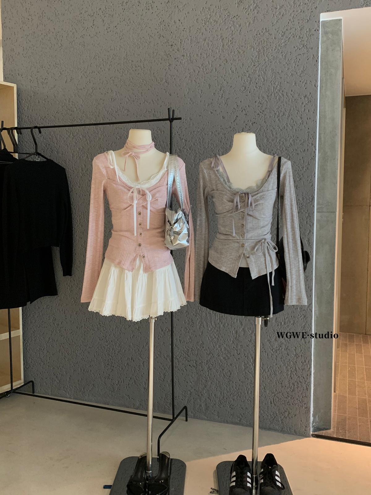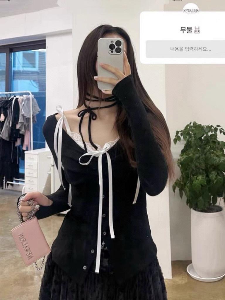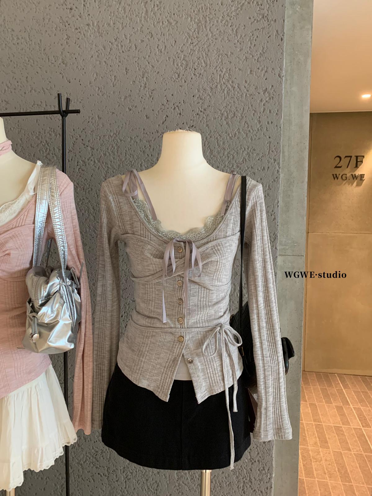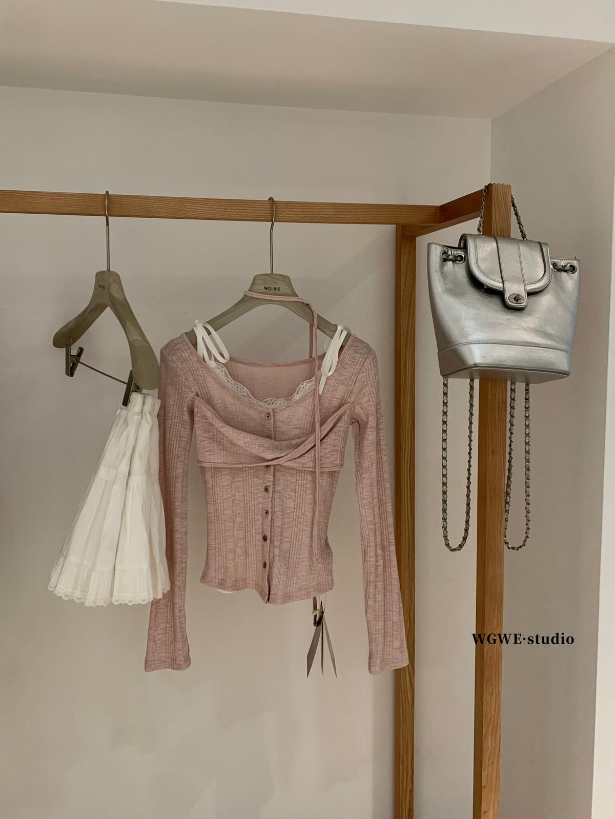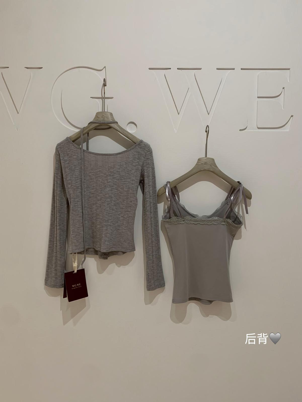 【C7086】疊穿純欲花邊吊帶背心+長袖T恤韓系兩件套裝(配飄繩)