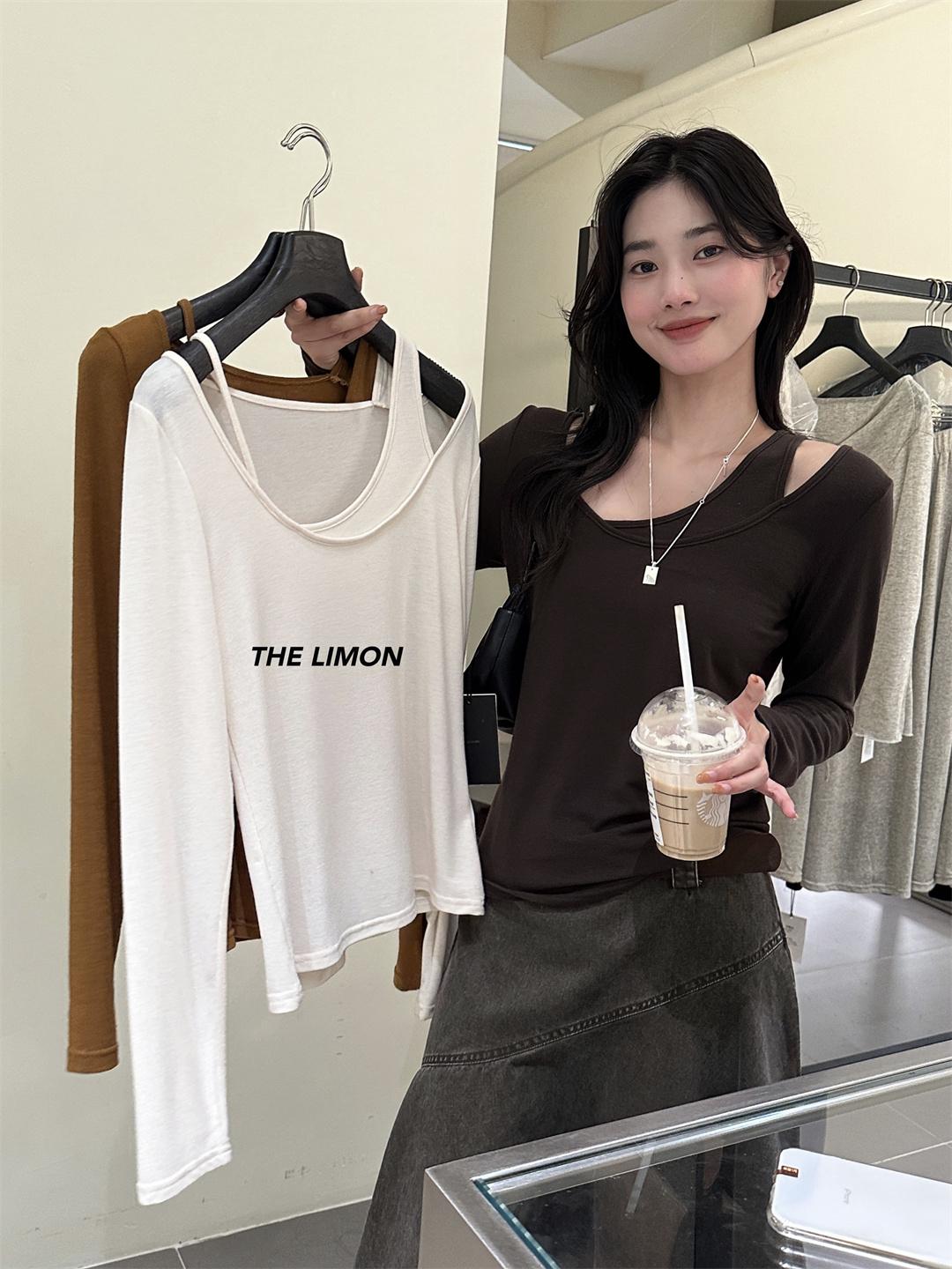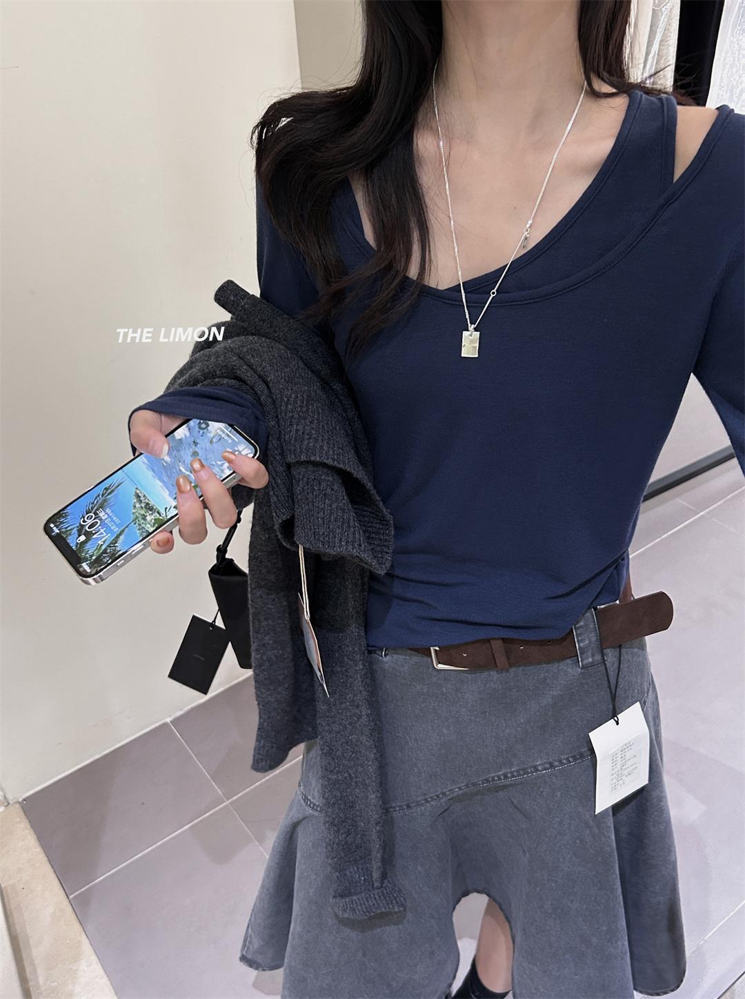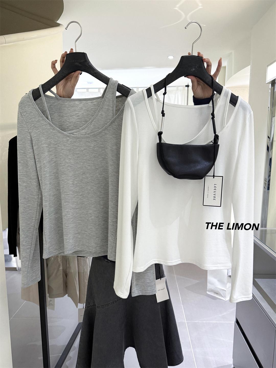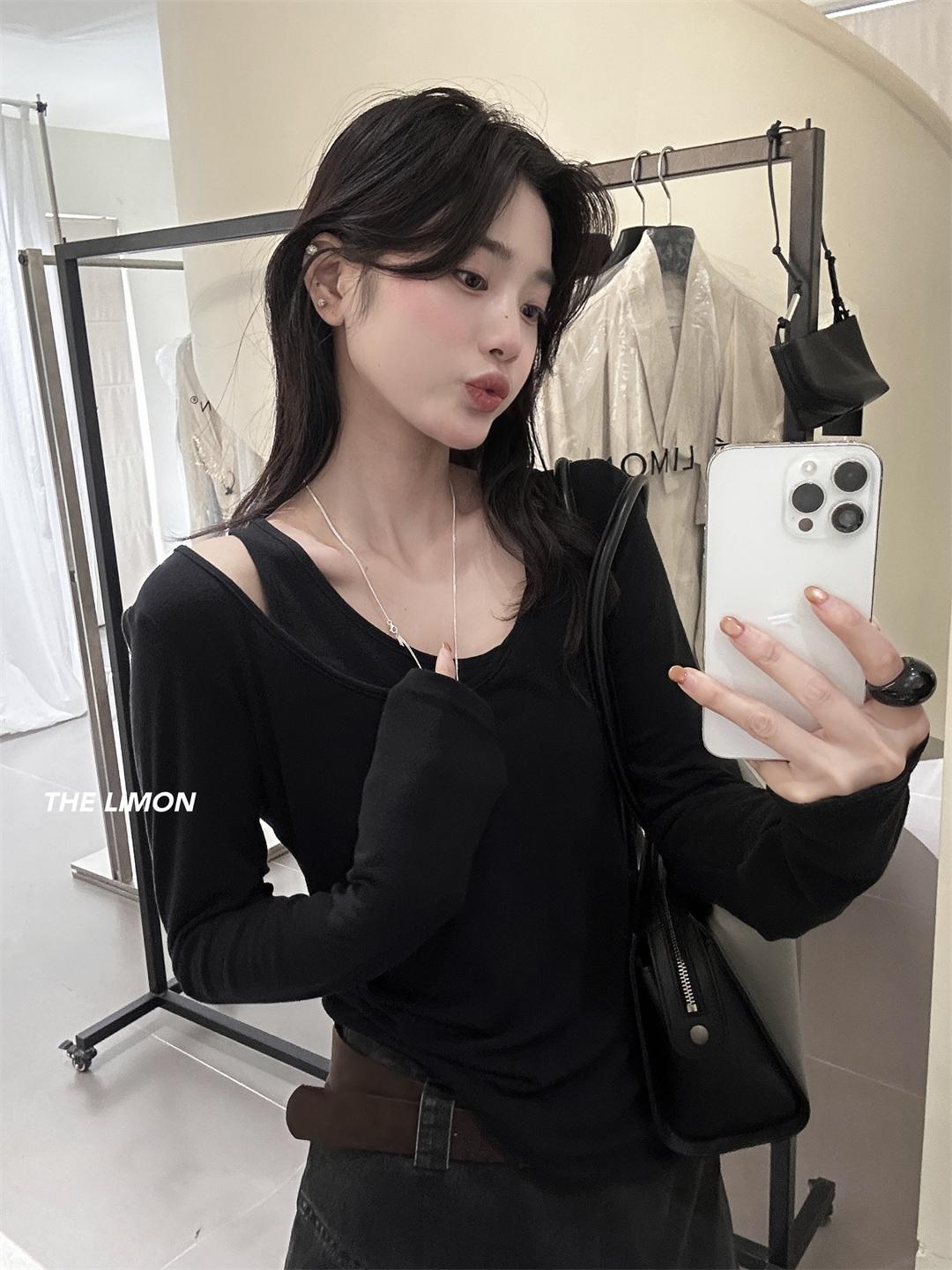 【C7094】巨好賣!設計感不規則假兩件長袖T恤