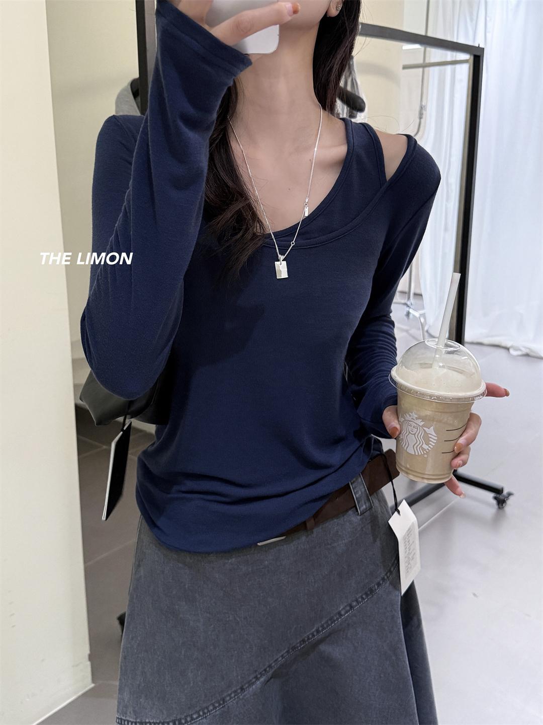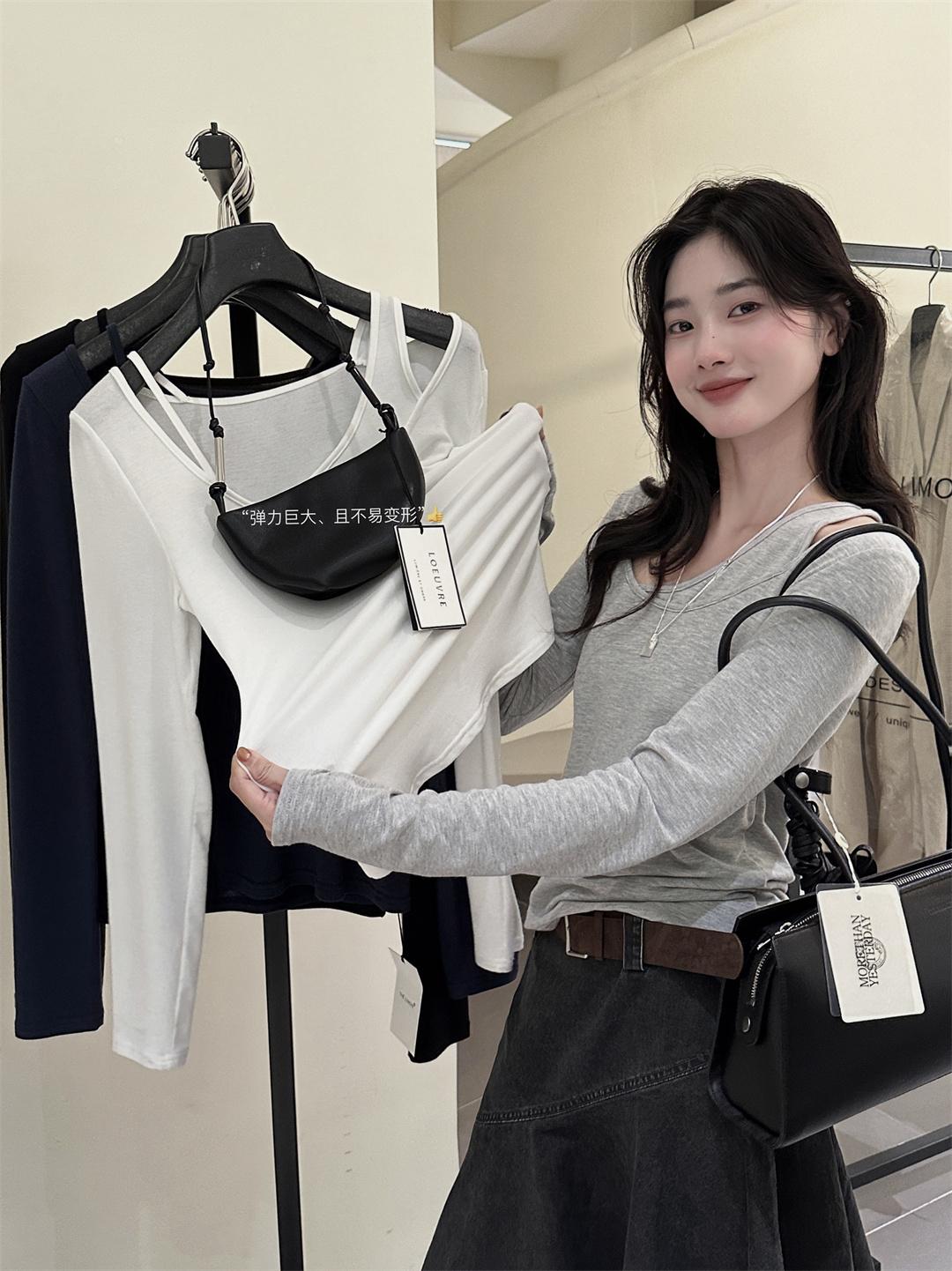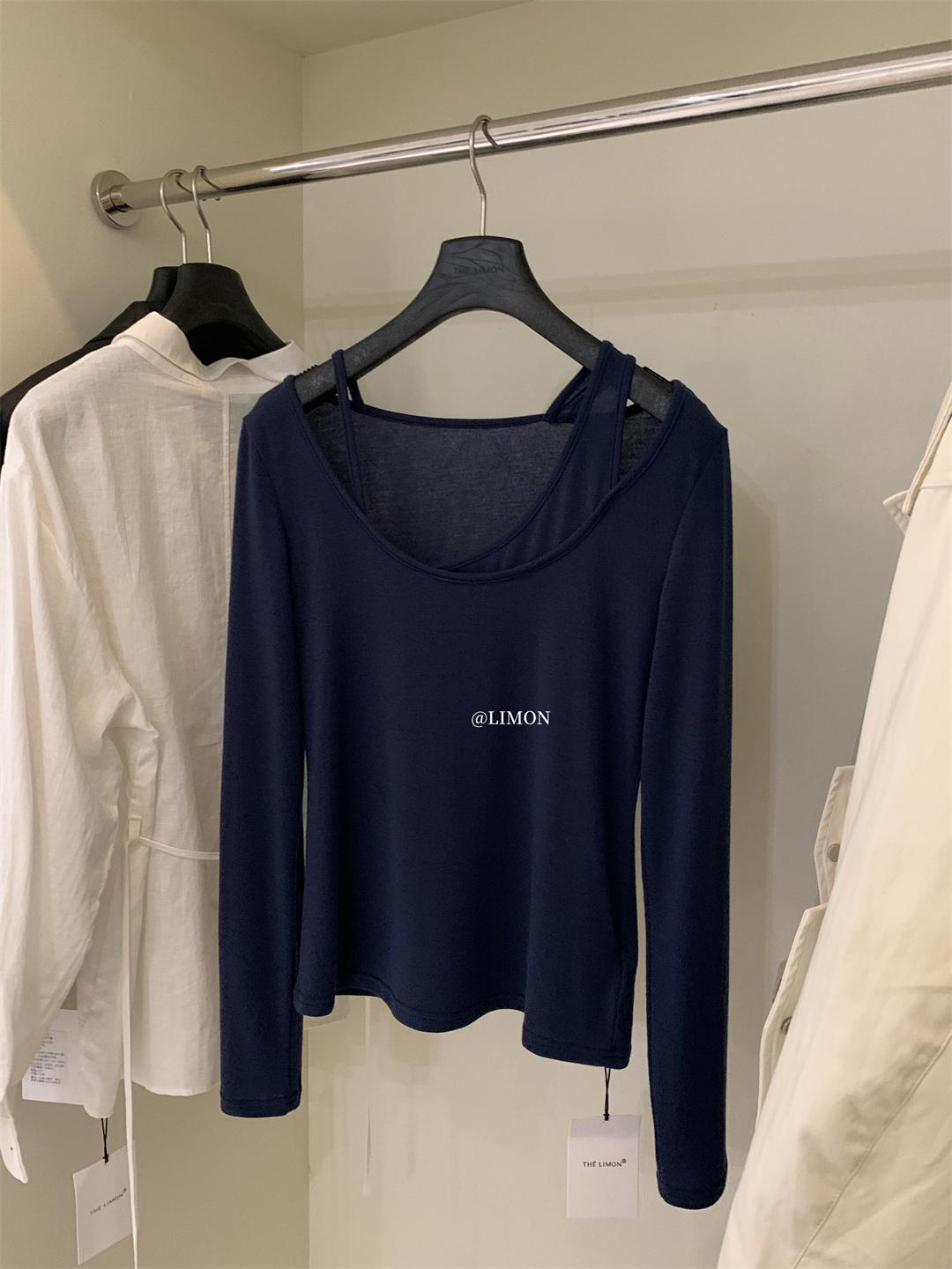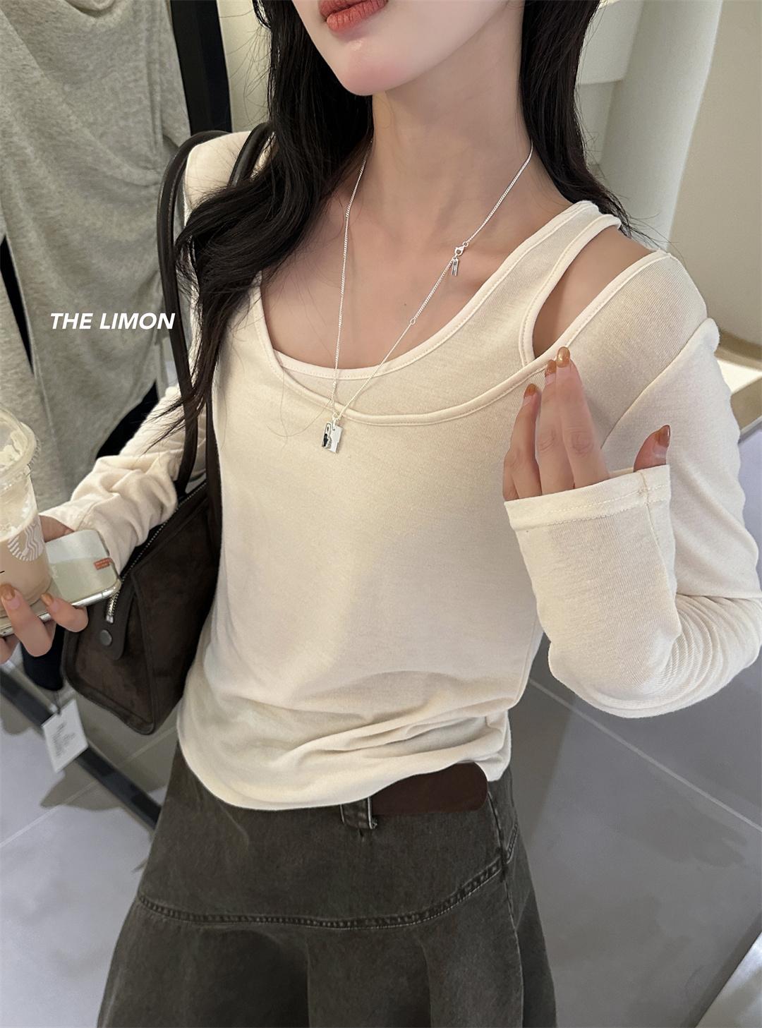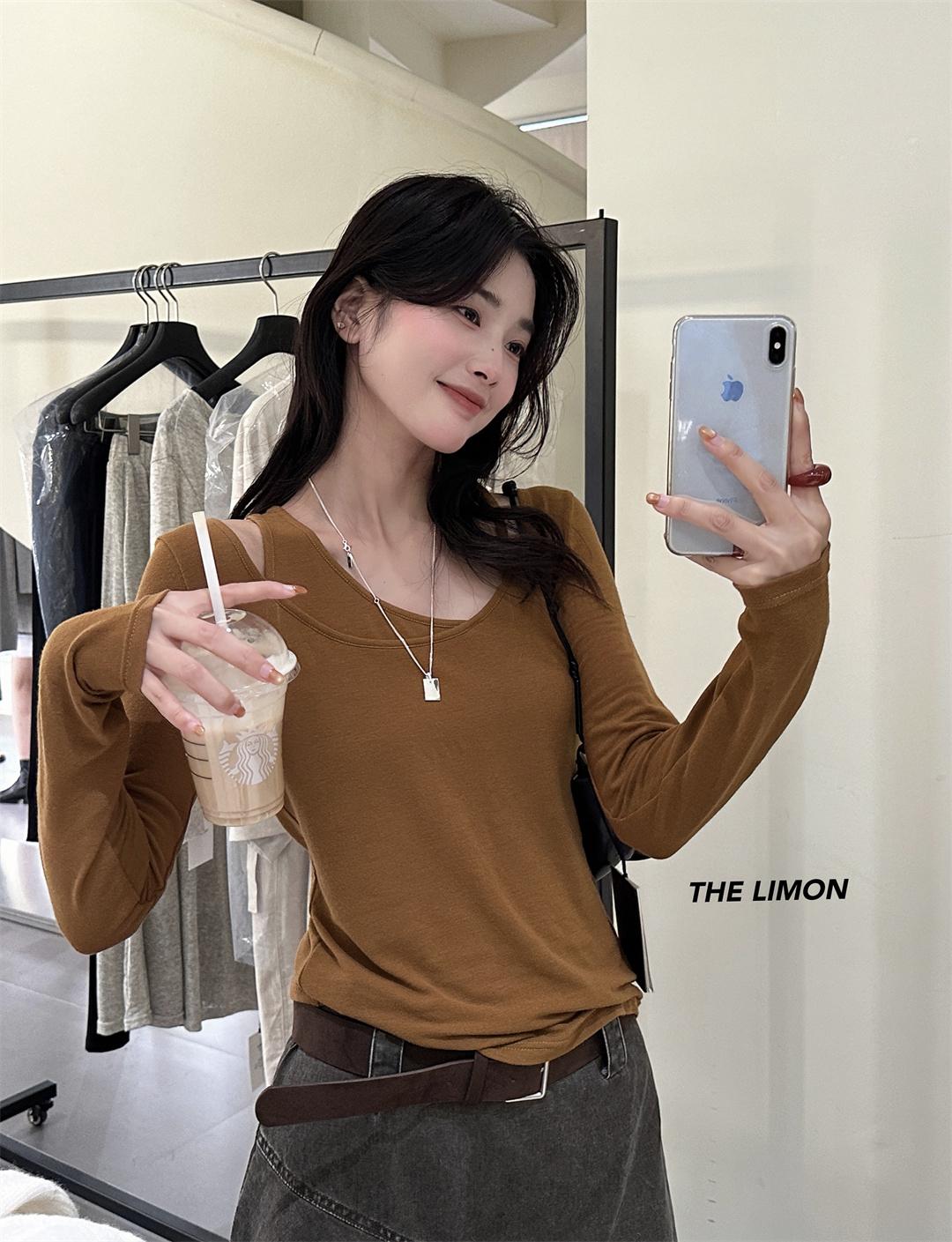 【C7094】巨好賣!設計感不規則假兩件長袖T恤