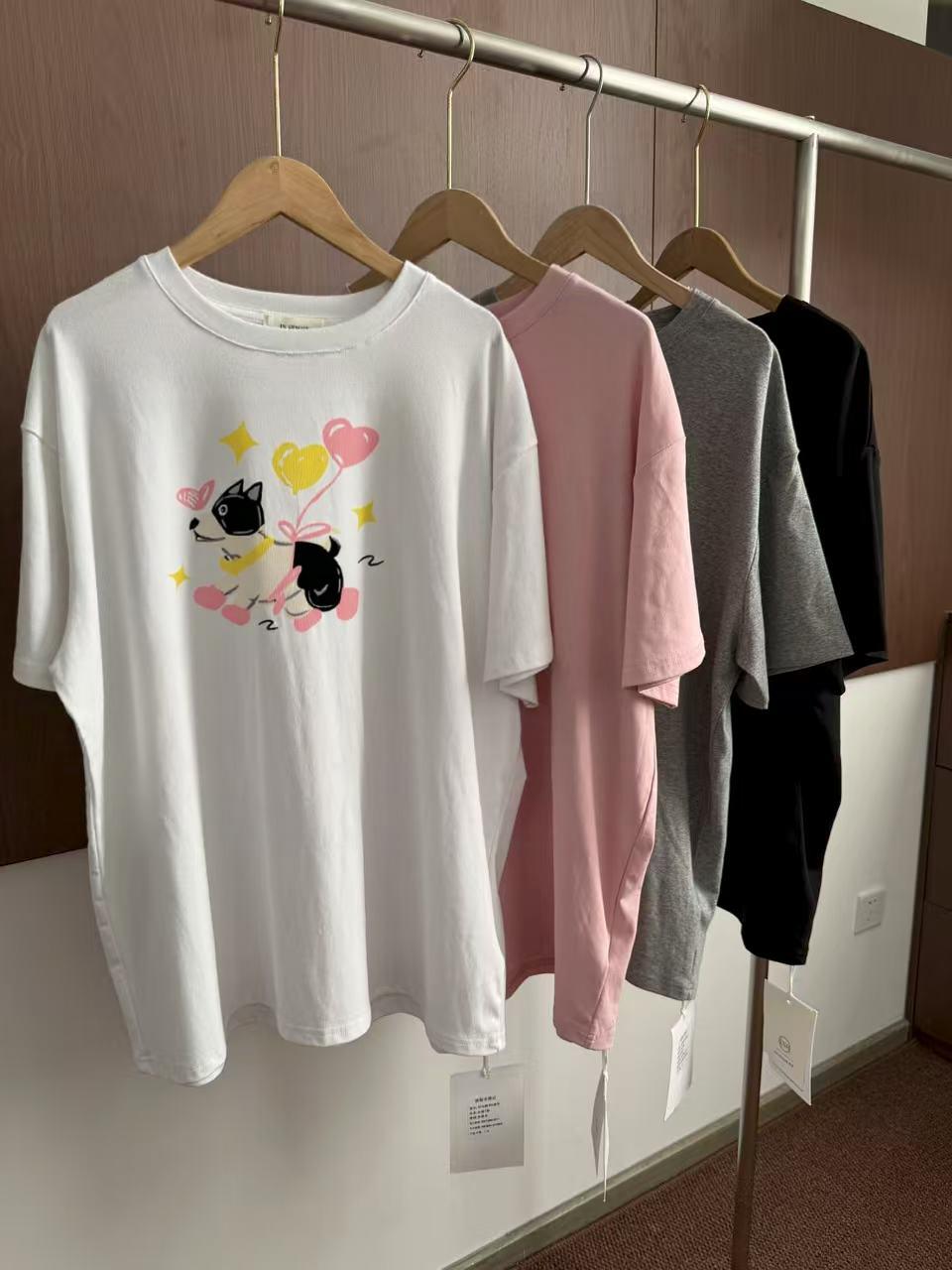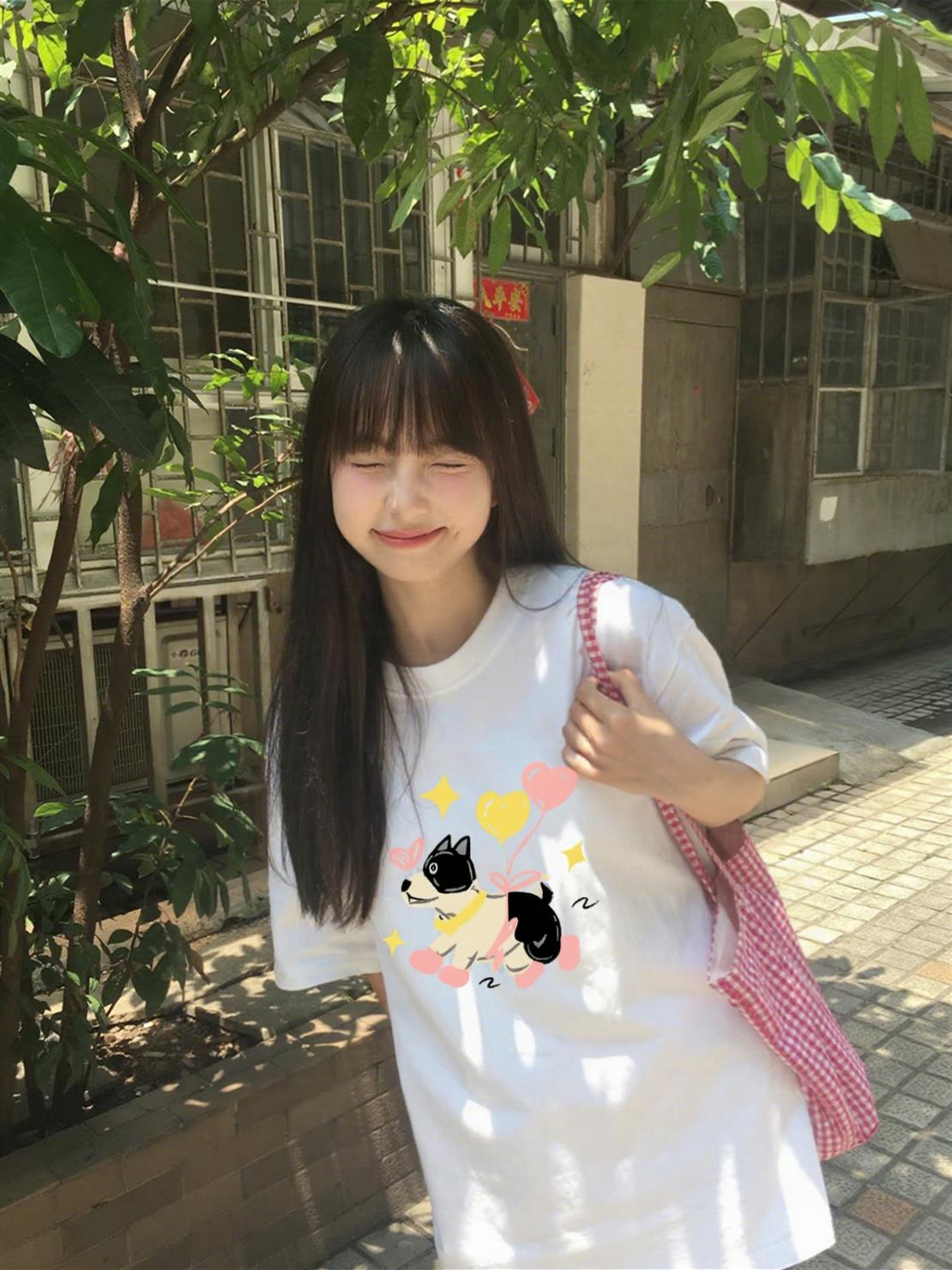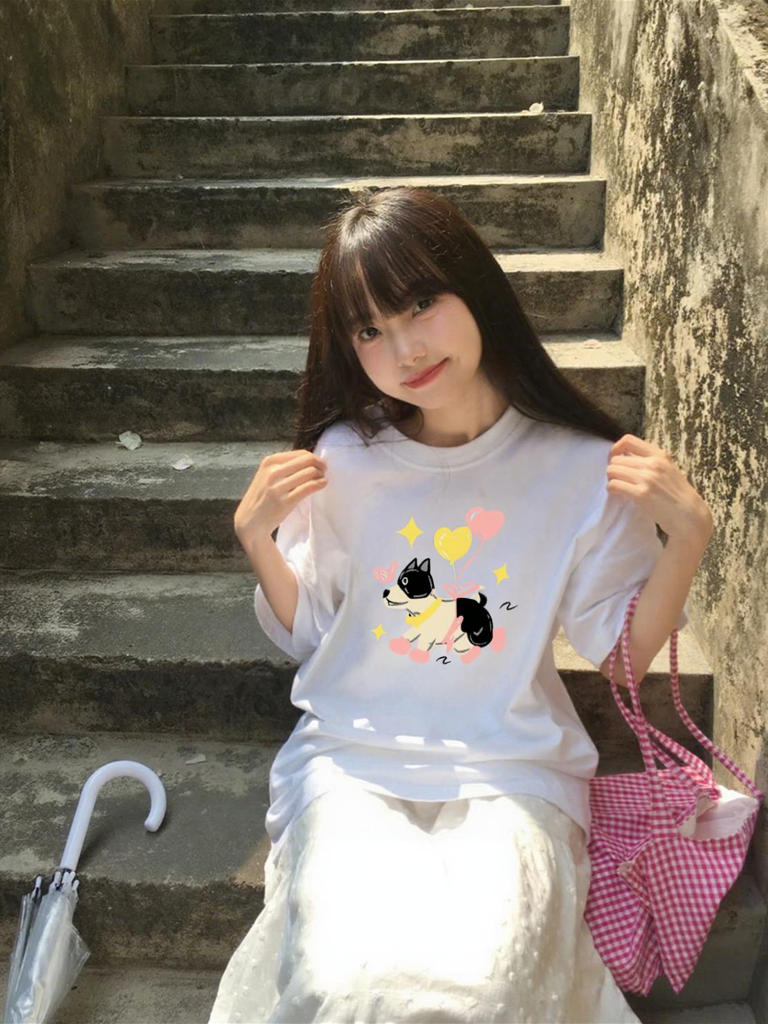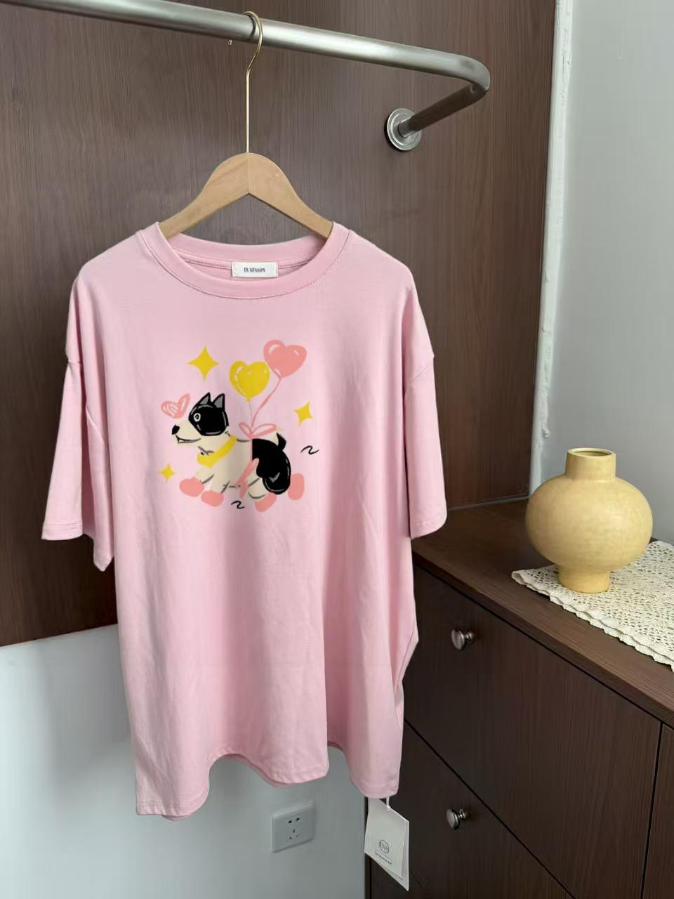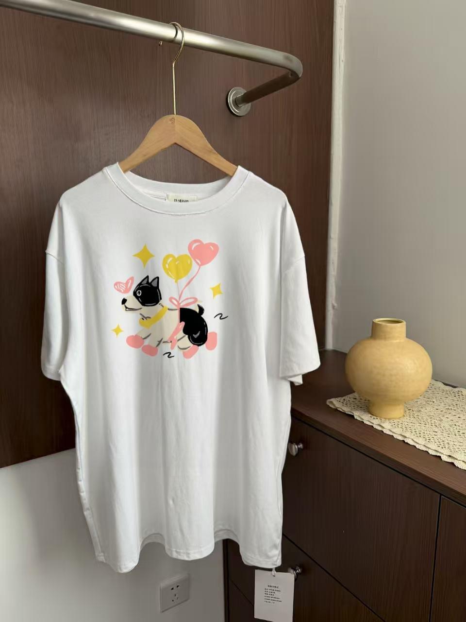 【C7127】清新減齡小狗氣球印花寬鬆圓領多色系可選百搭顯瘦短袖T恤