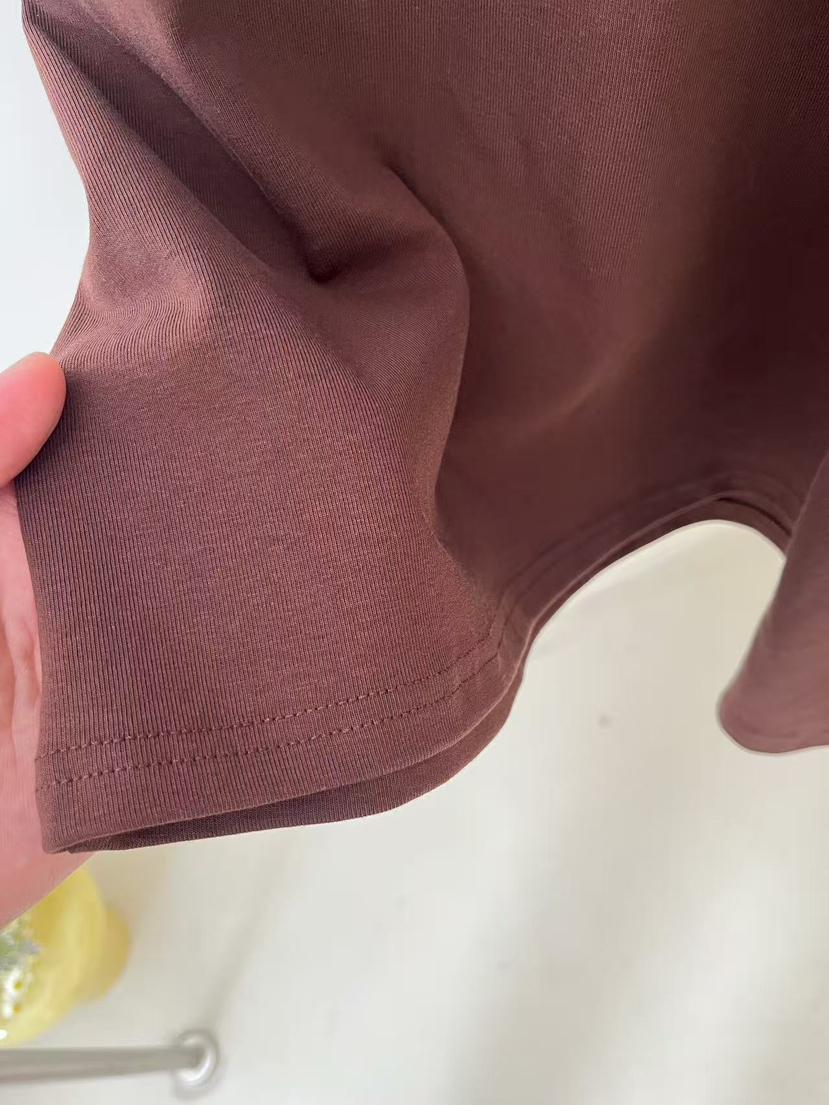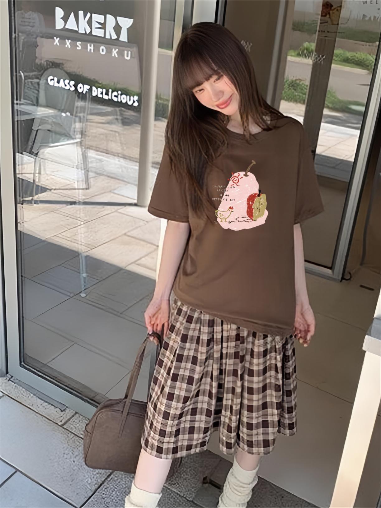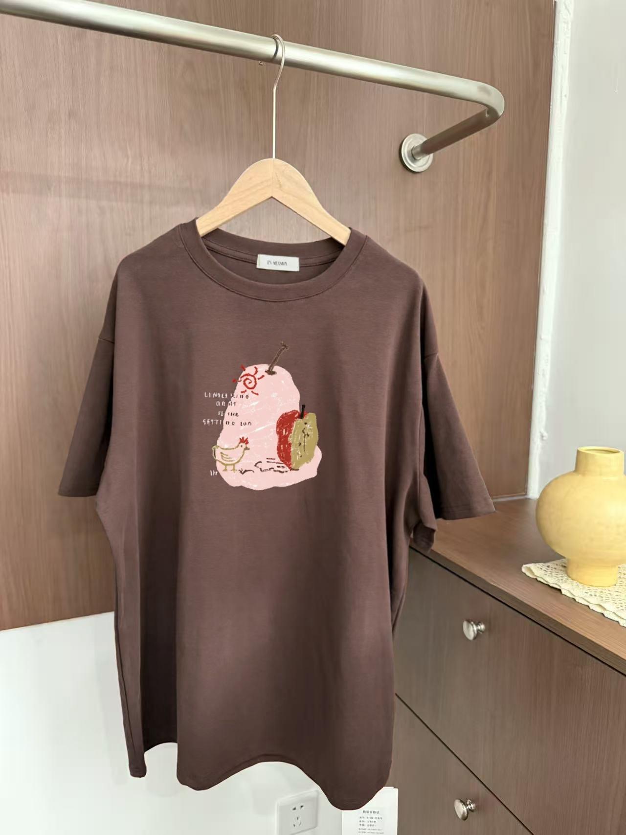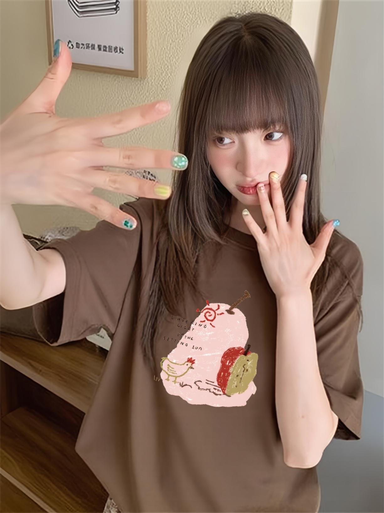 【C7128】小衆創意梨子印花圓領寬鬆舒適非常百顯瘦咖色短袖T恤