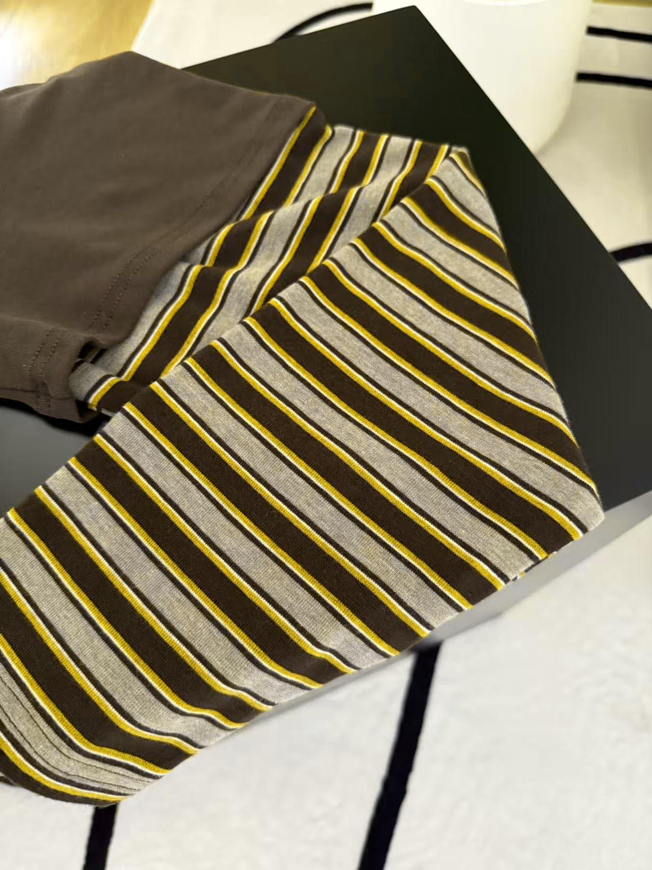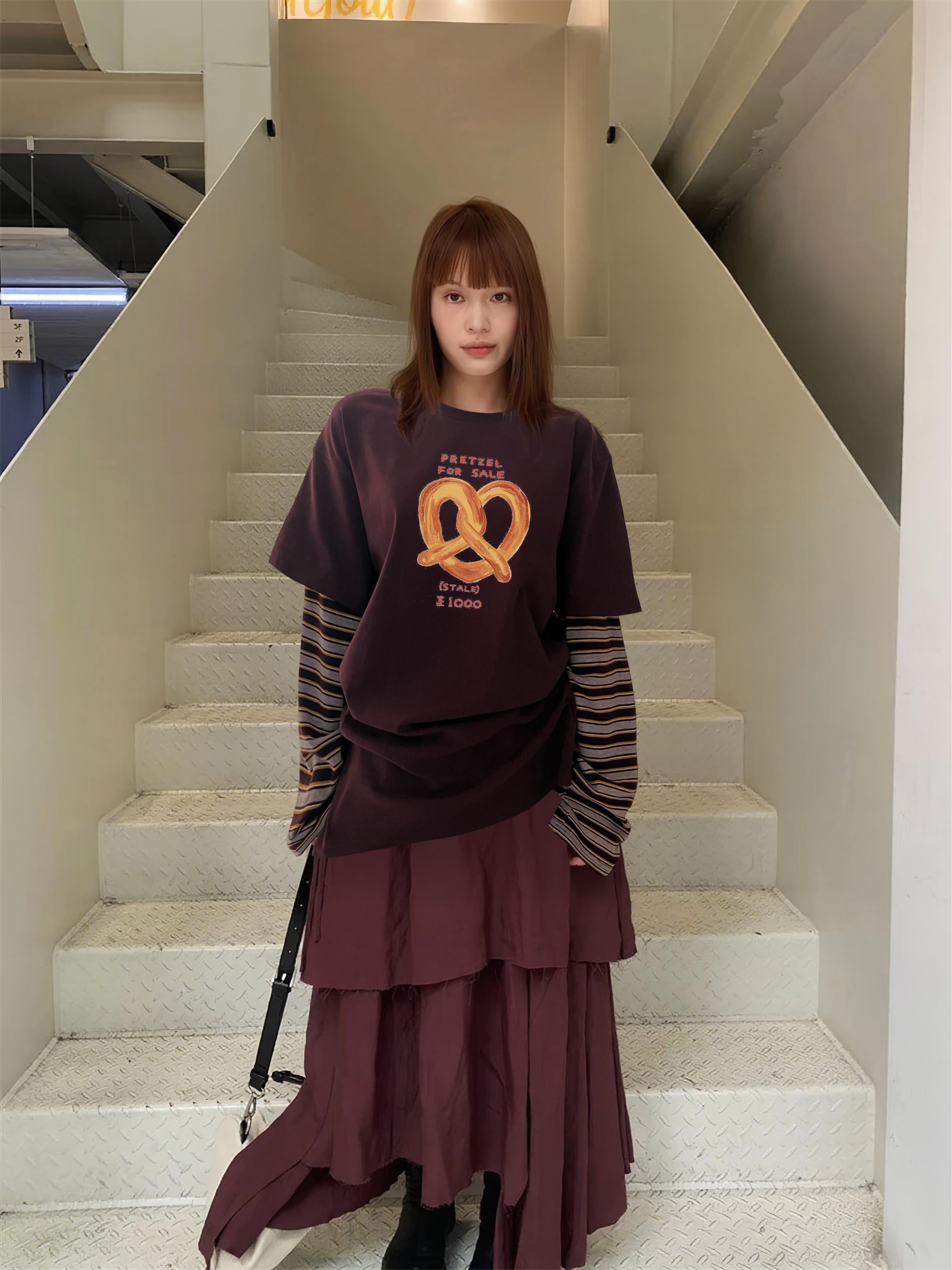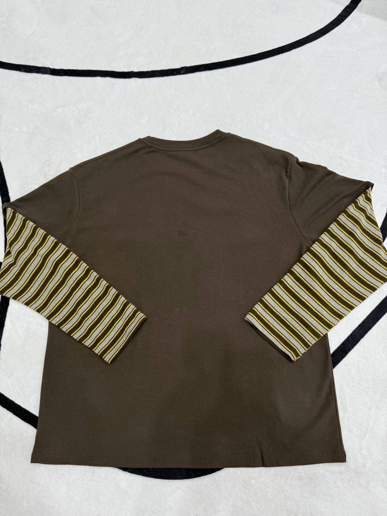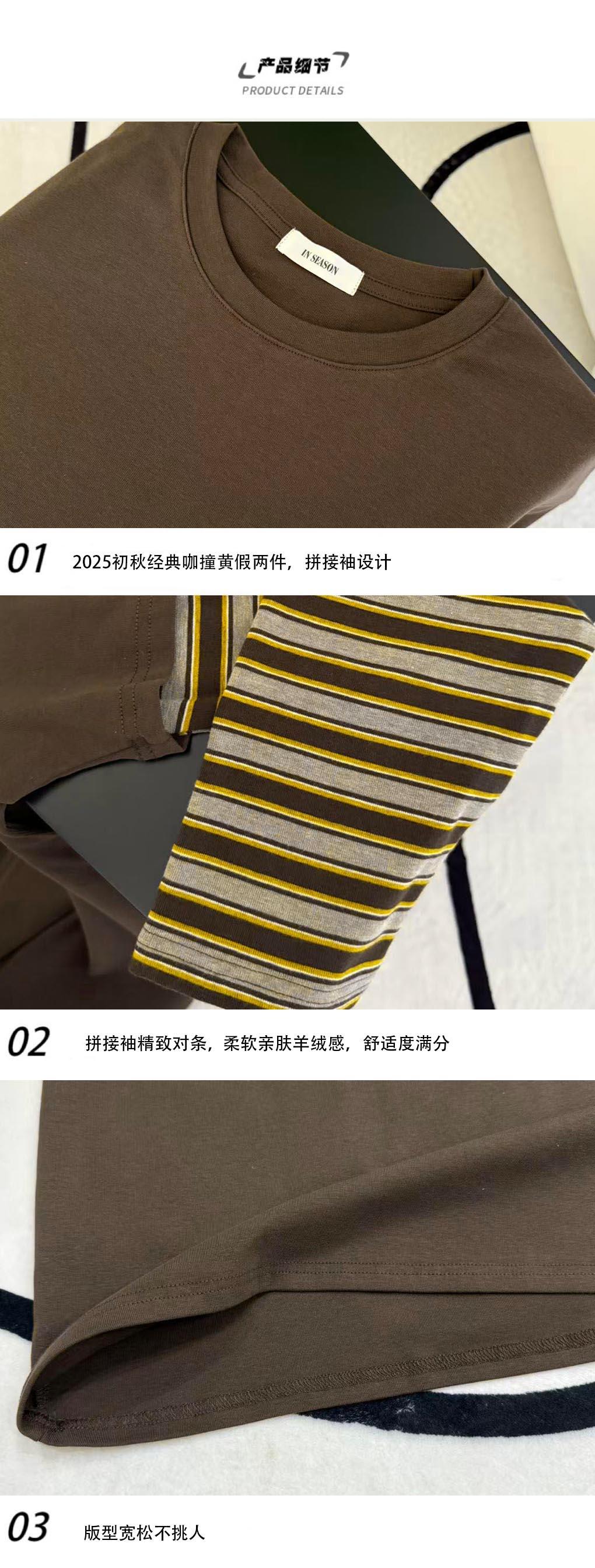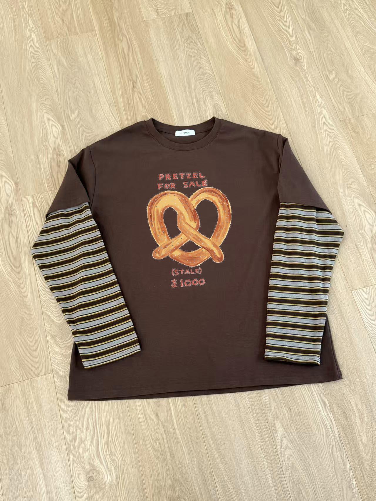 【C7129】ins風韓系鹼水結麪包印花咖條紋寬鬆百搭舒適長袖T恤