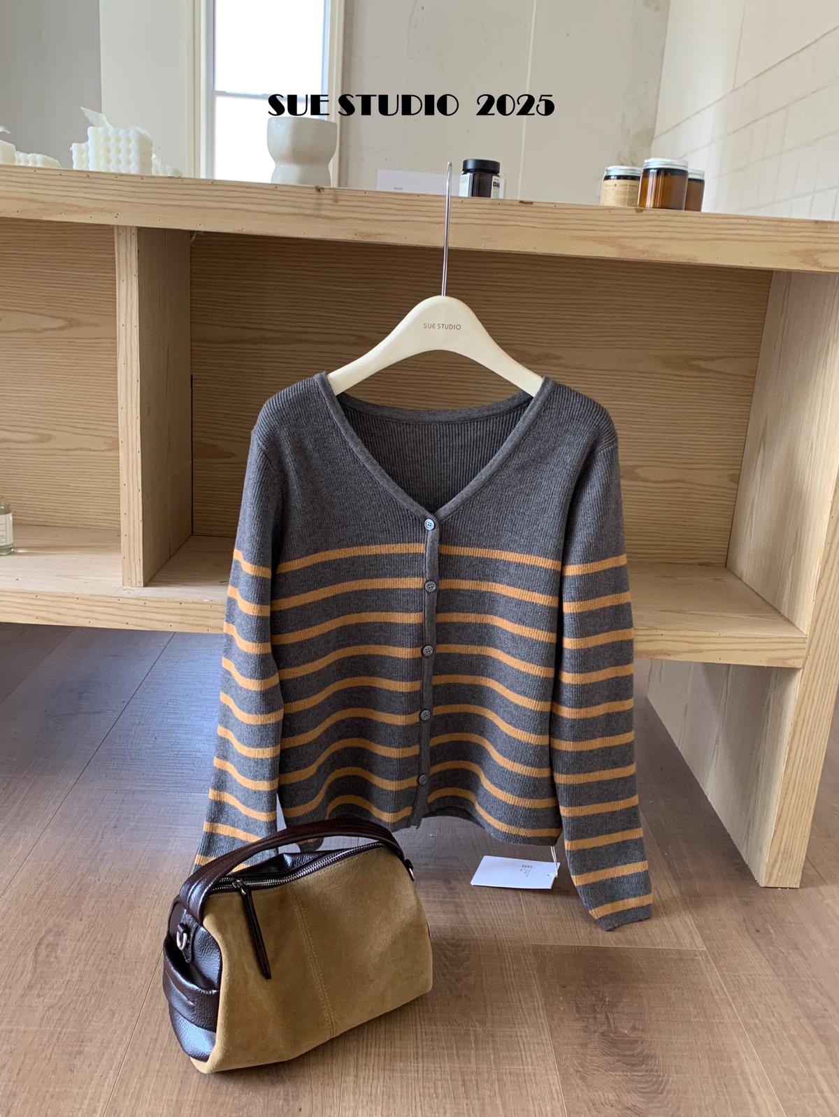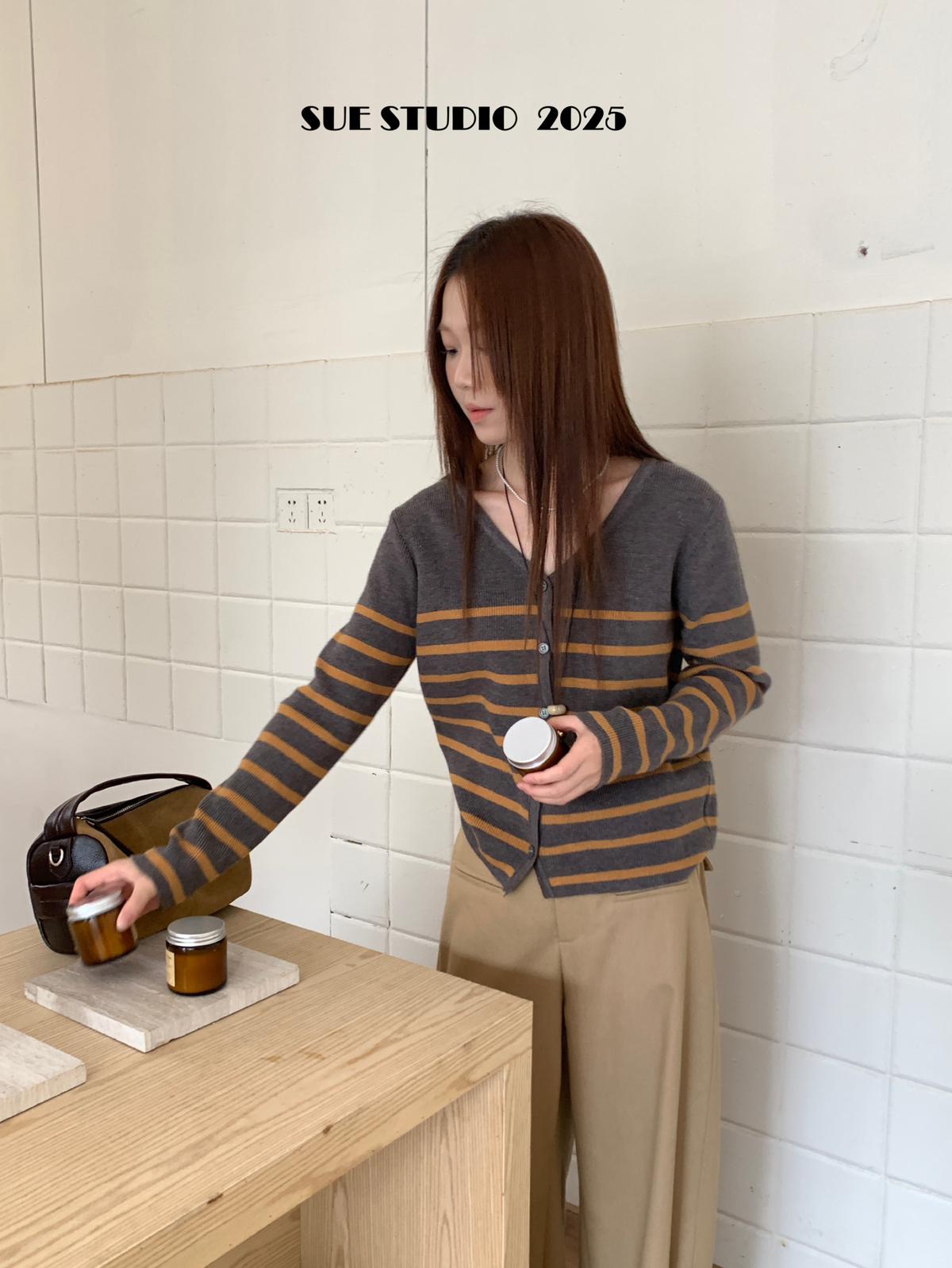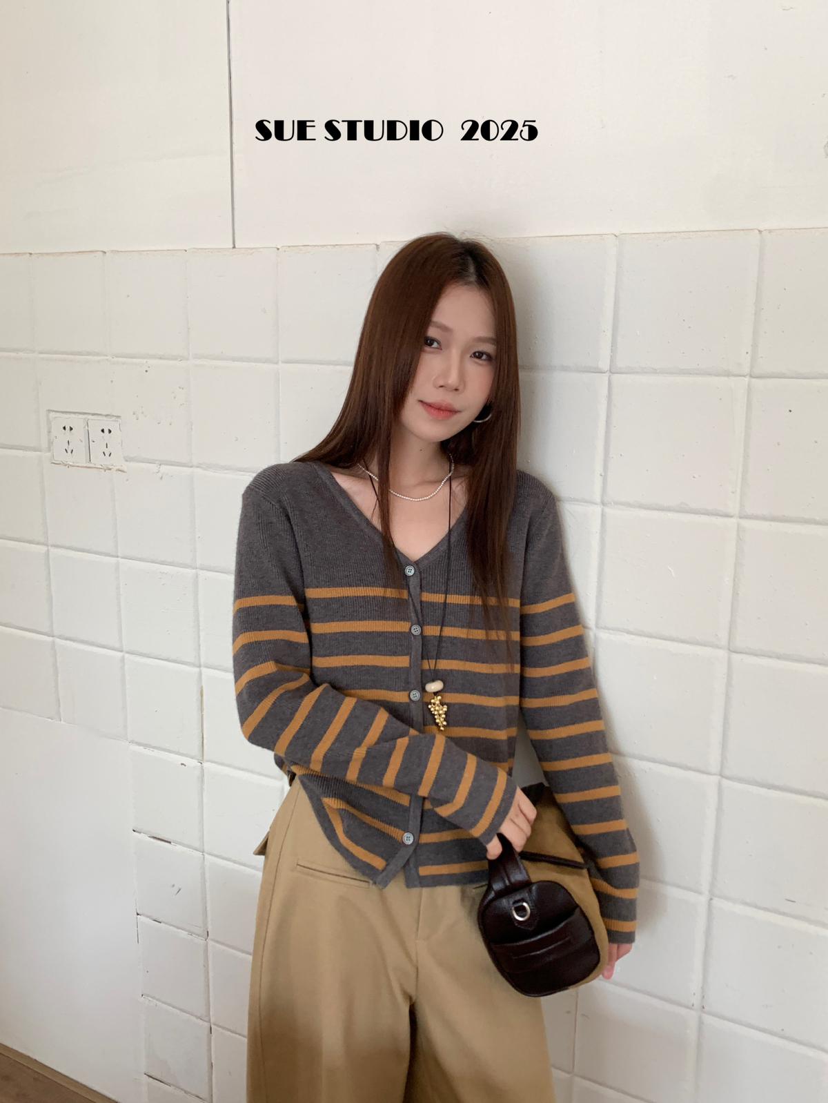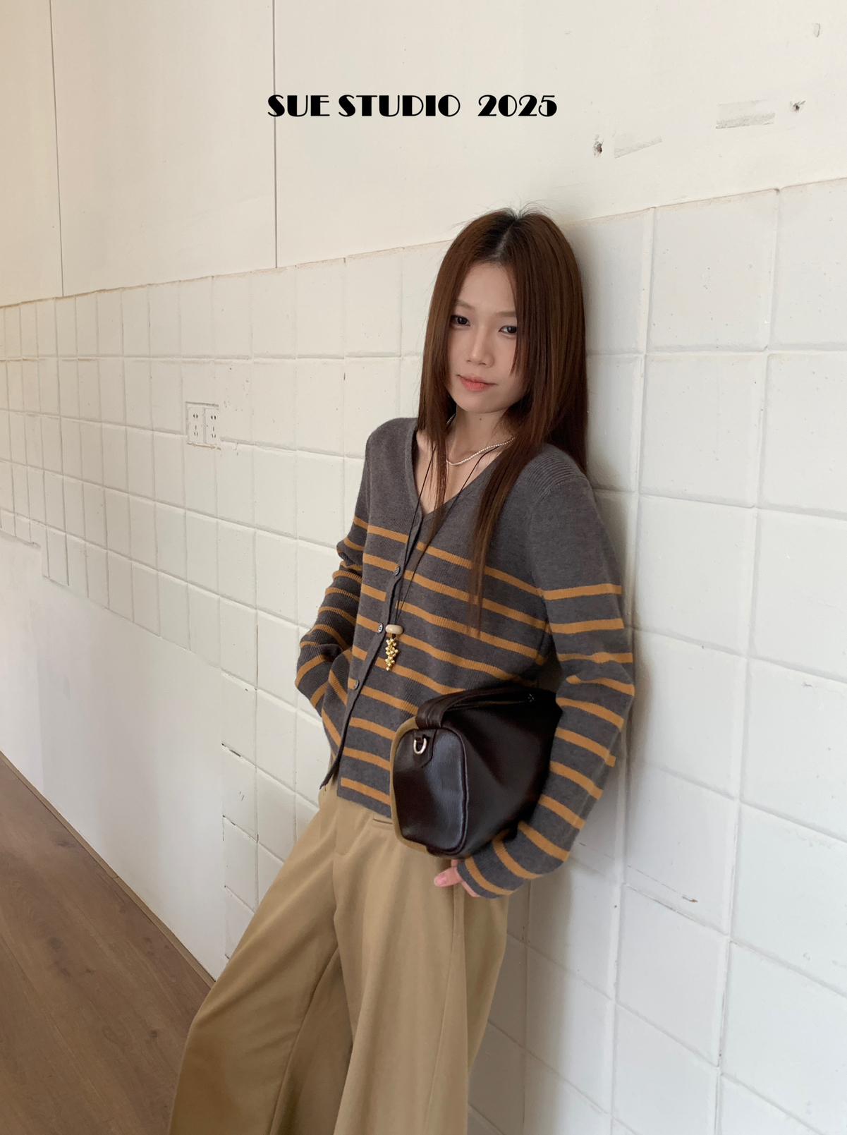 【C7113】韓系休閒百搭經典V領寬鬆條紋常規款針織衫