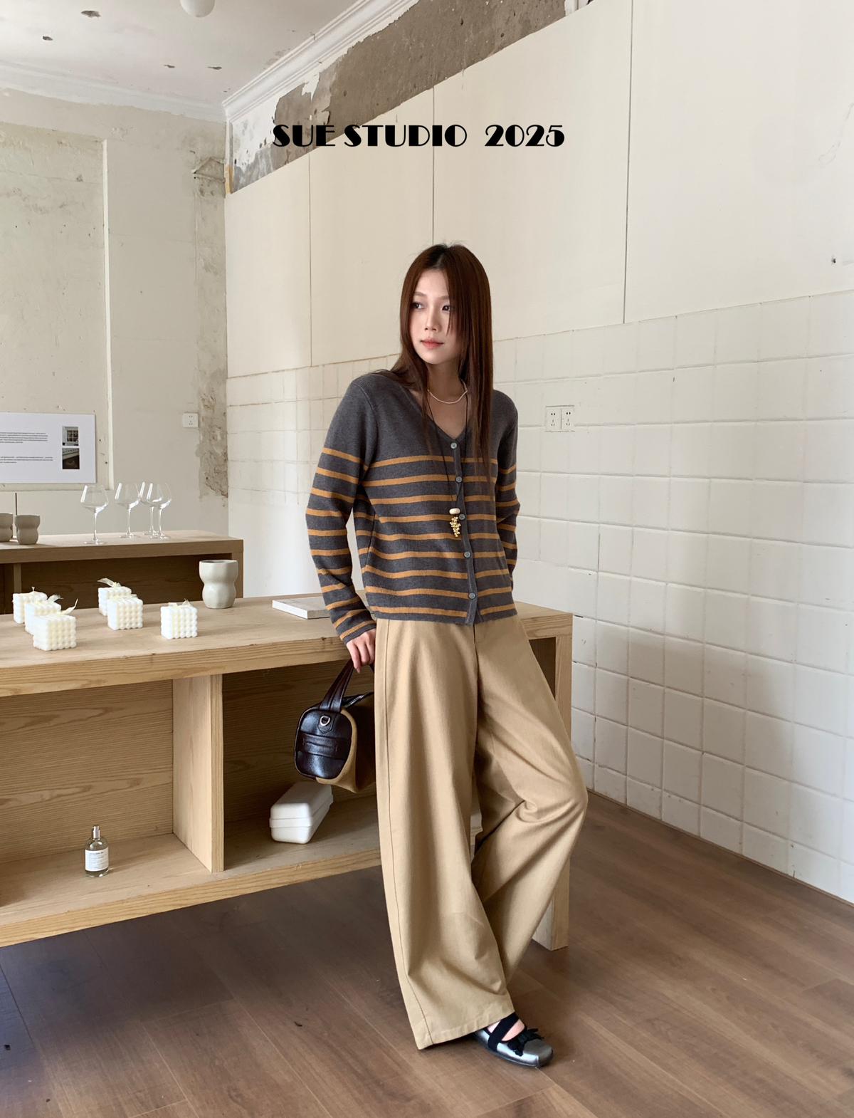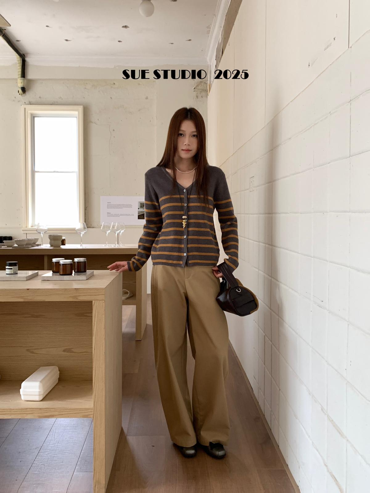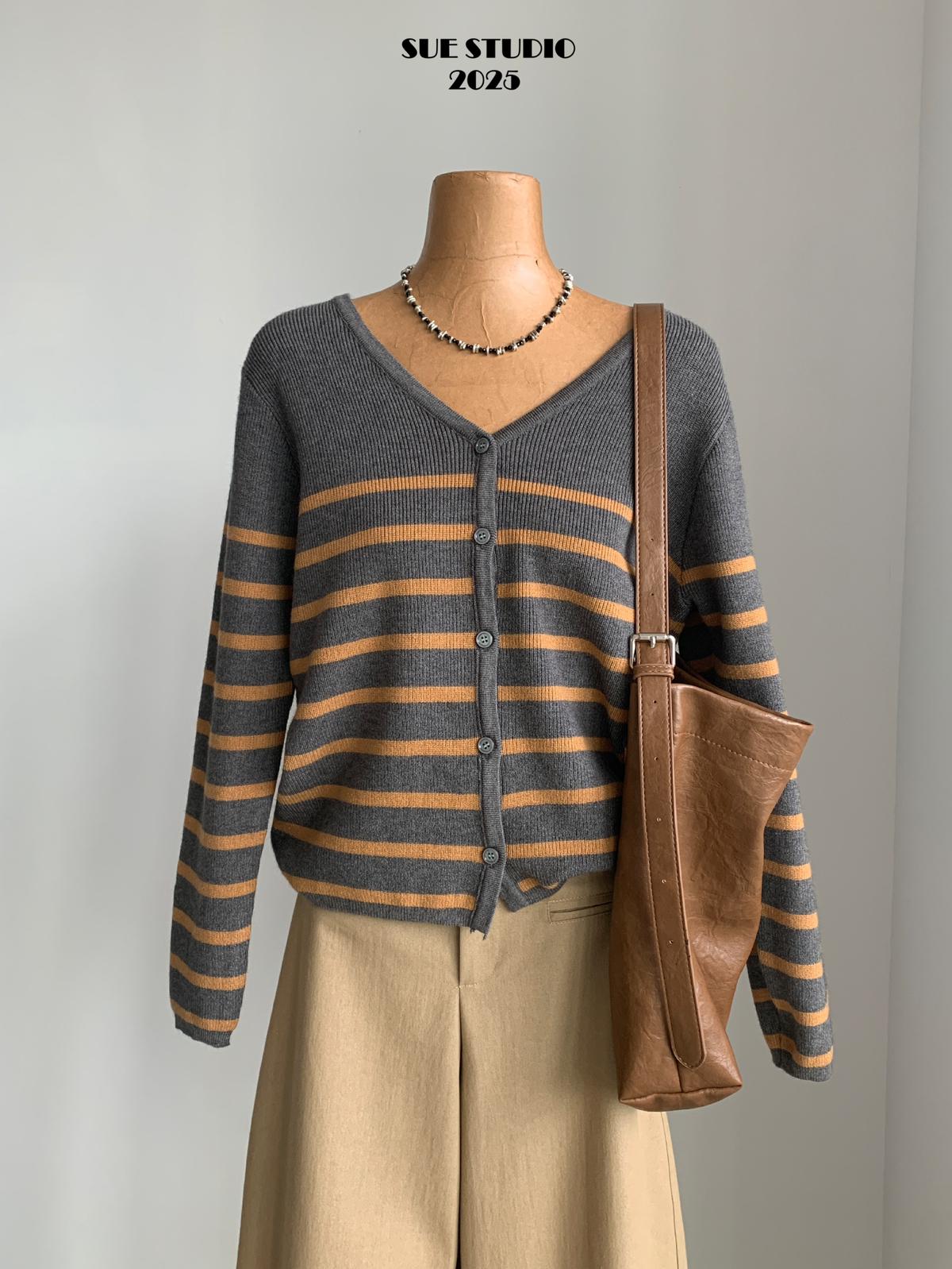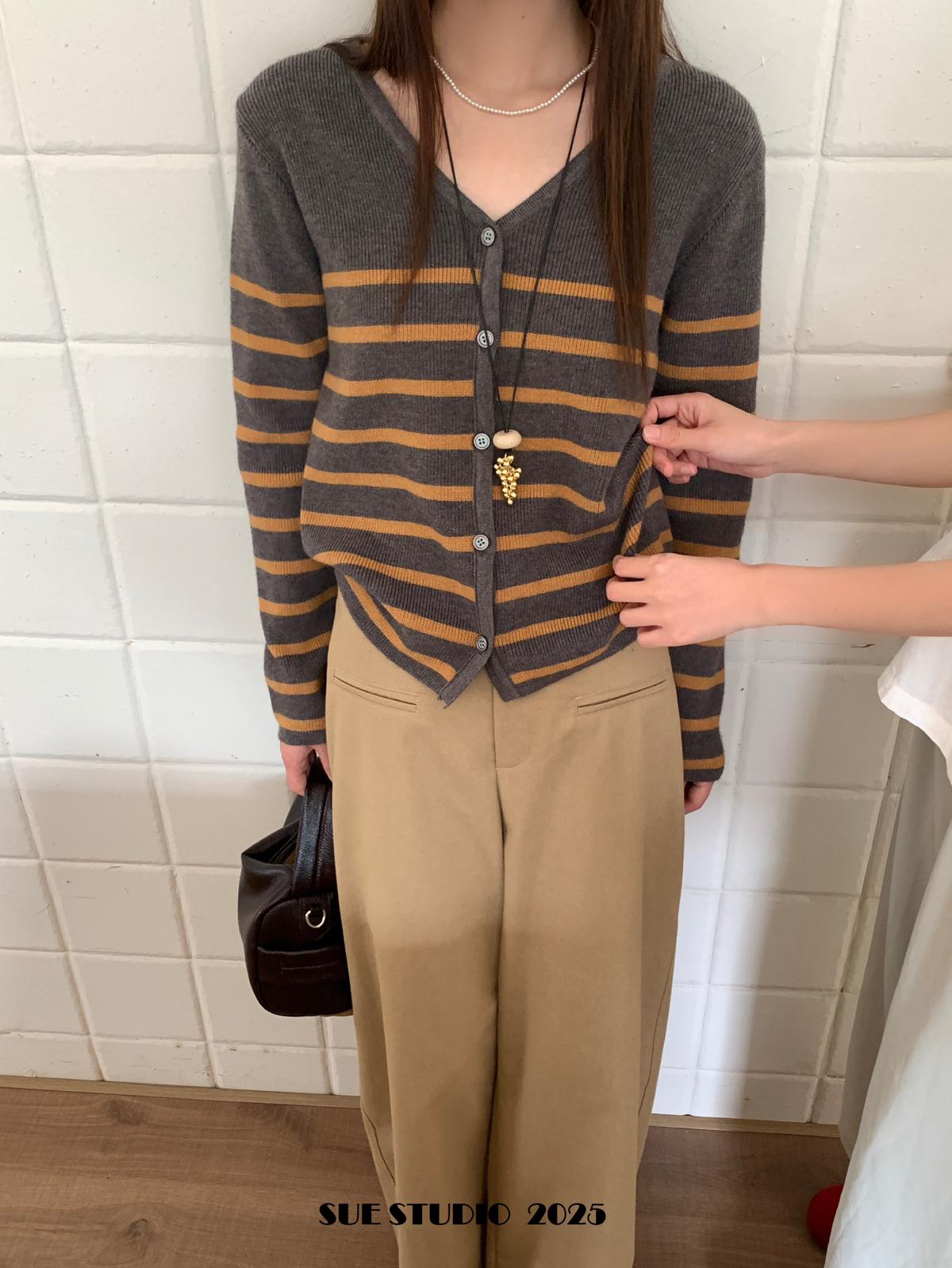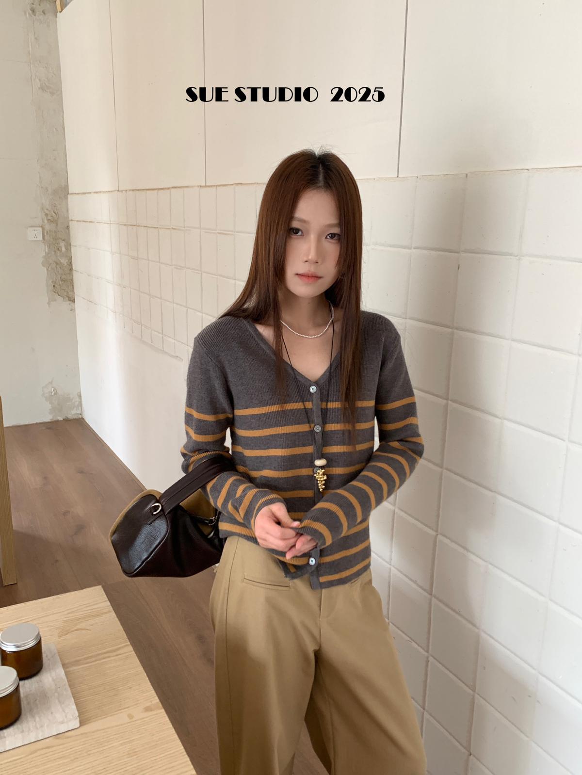 【C7113】韓系休閒百搭經典V領寬鬆條紋常規款針織衫