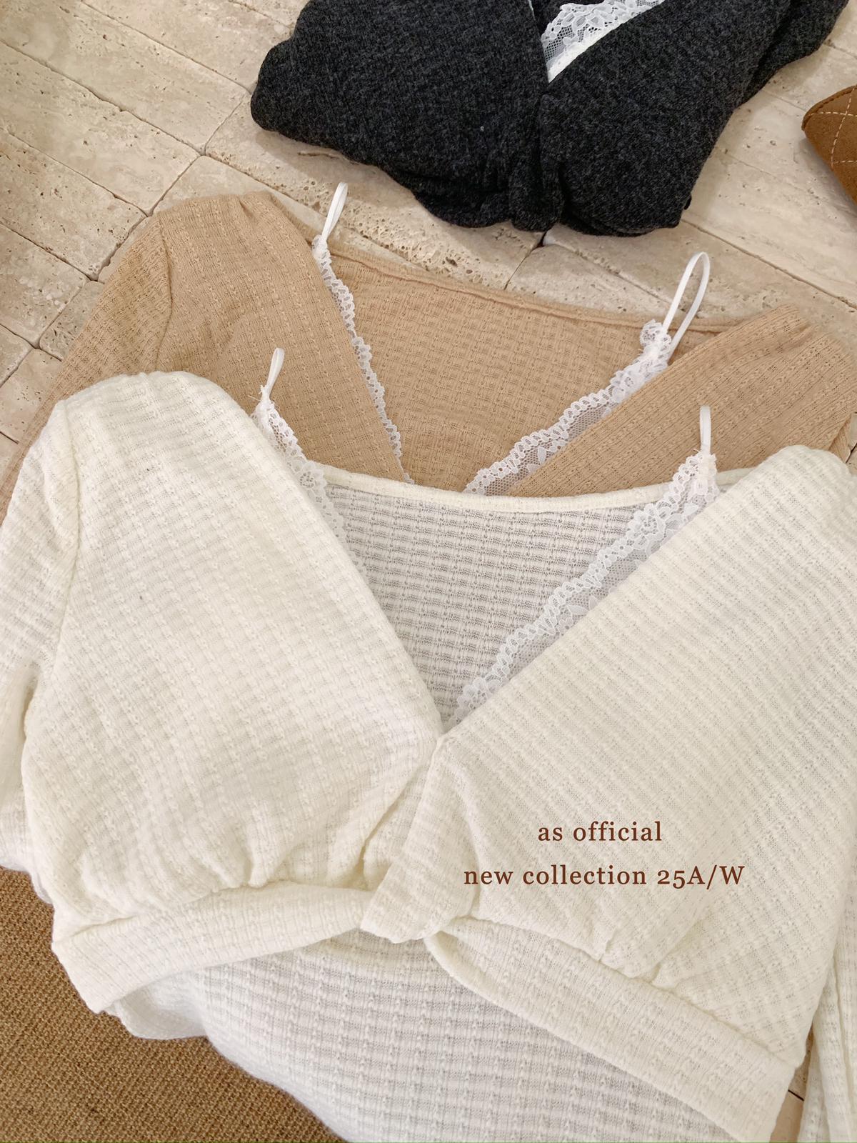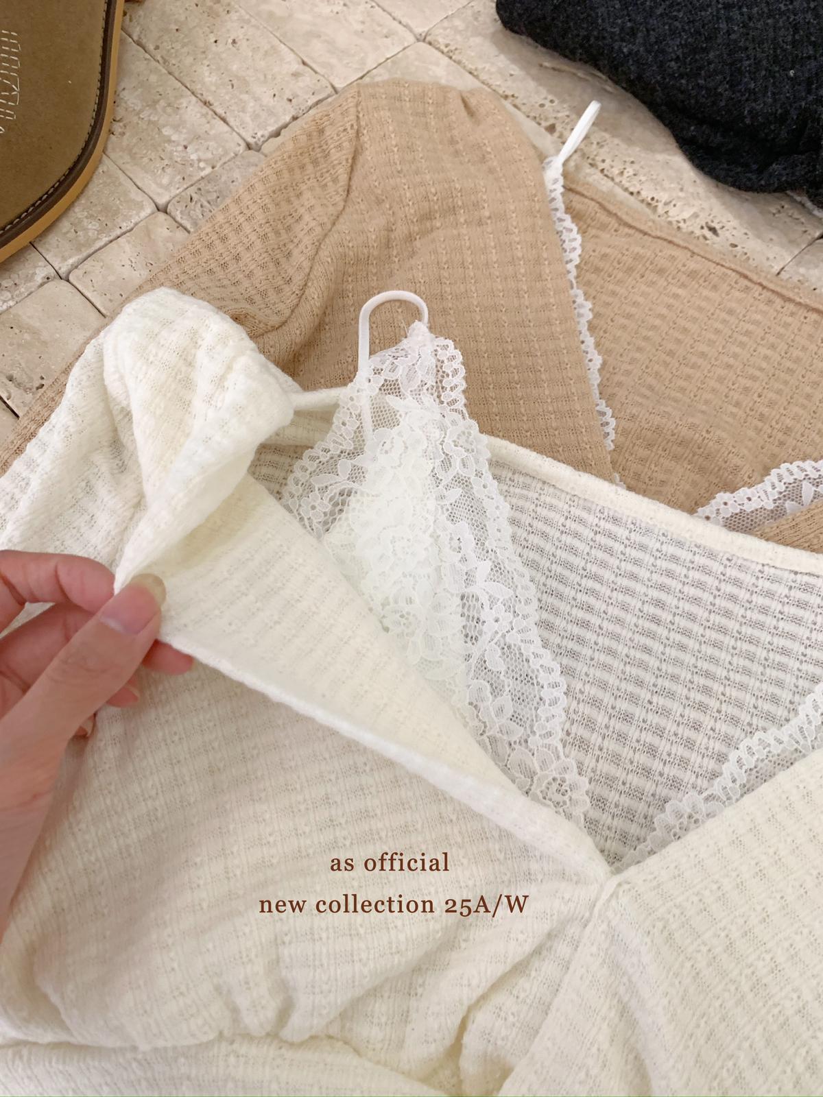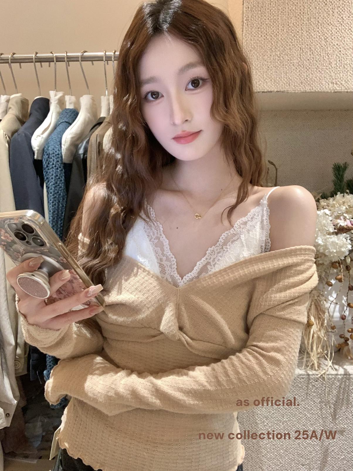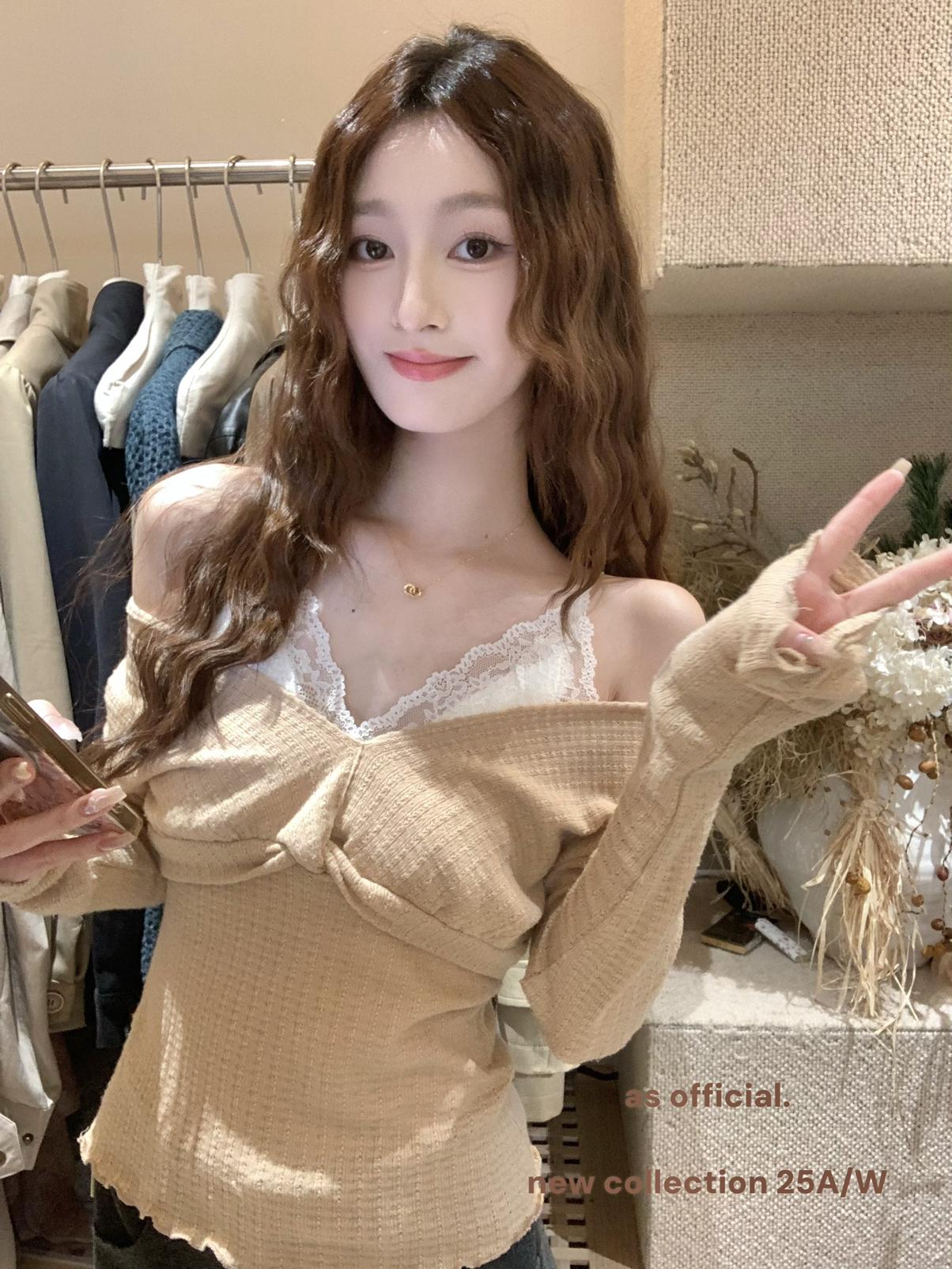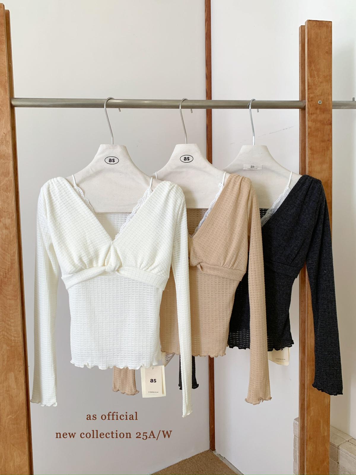 【C7165】人氣新秀_細節真嘟超愛 秒變超模身材蕾絲拼接V領小衫