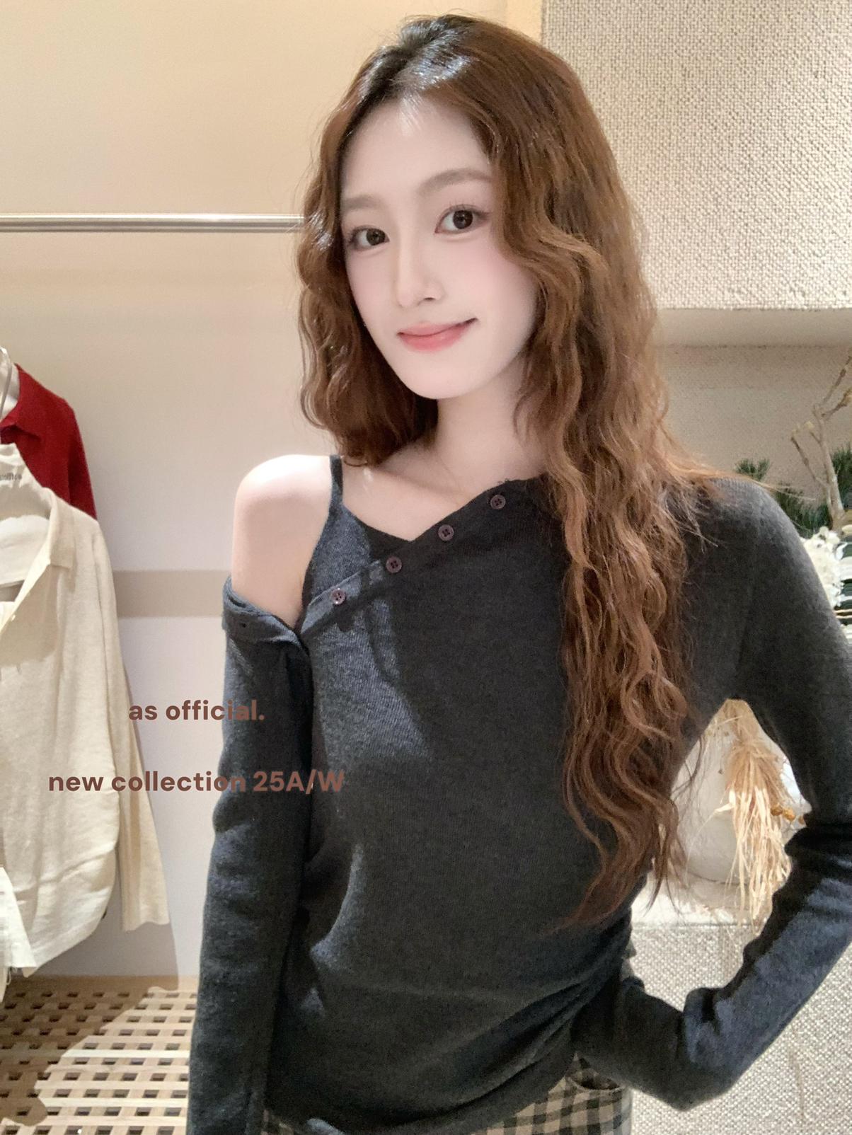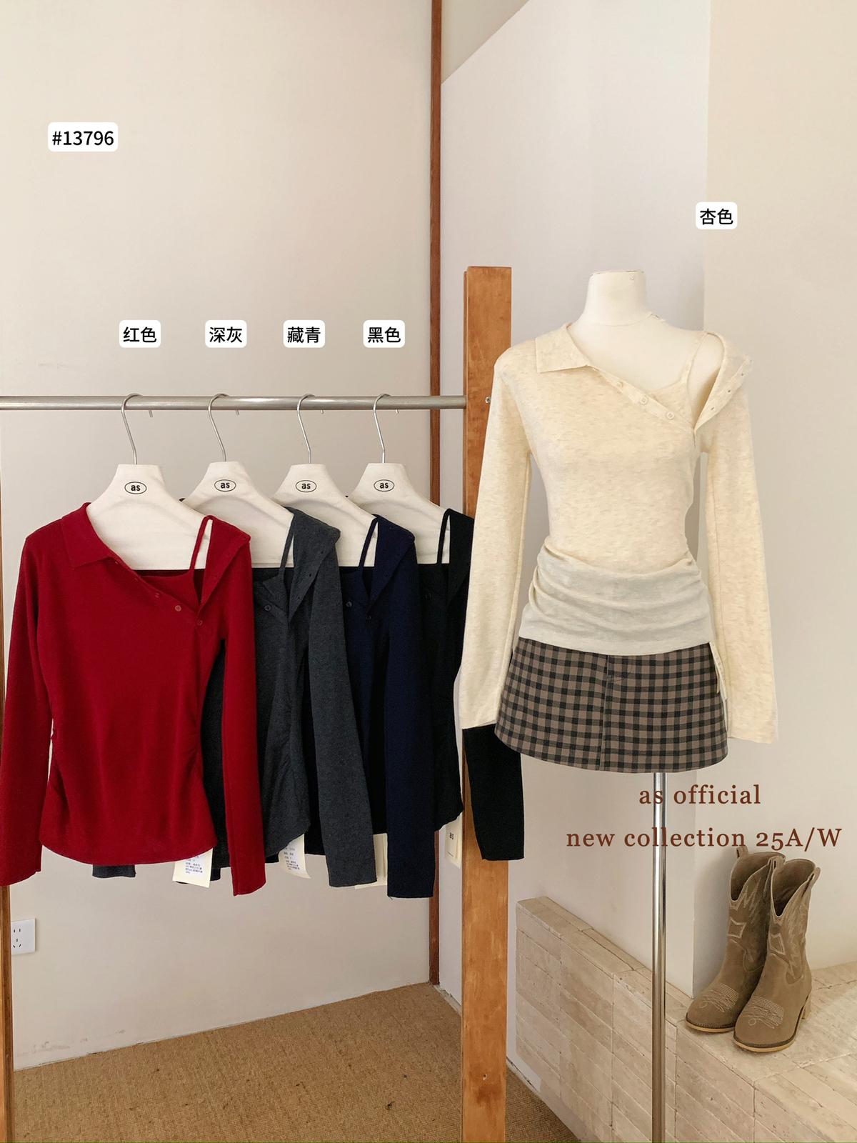 3. 【C7168】脫下外套也好看 斜肩假兩件翻領針織衫(含6%綿羊毛)