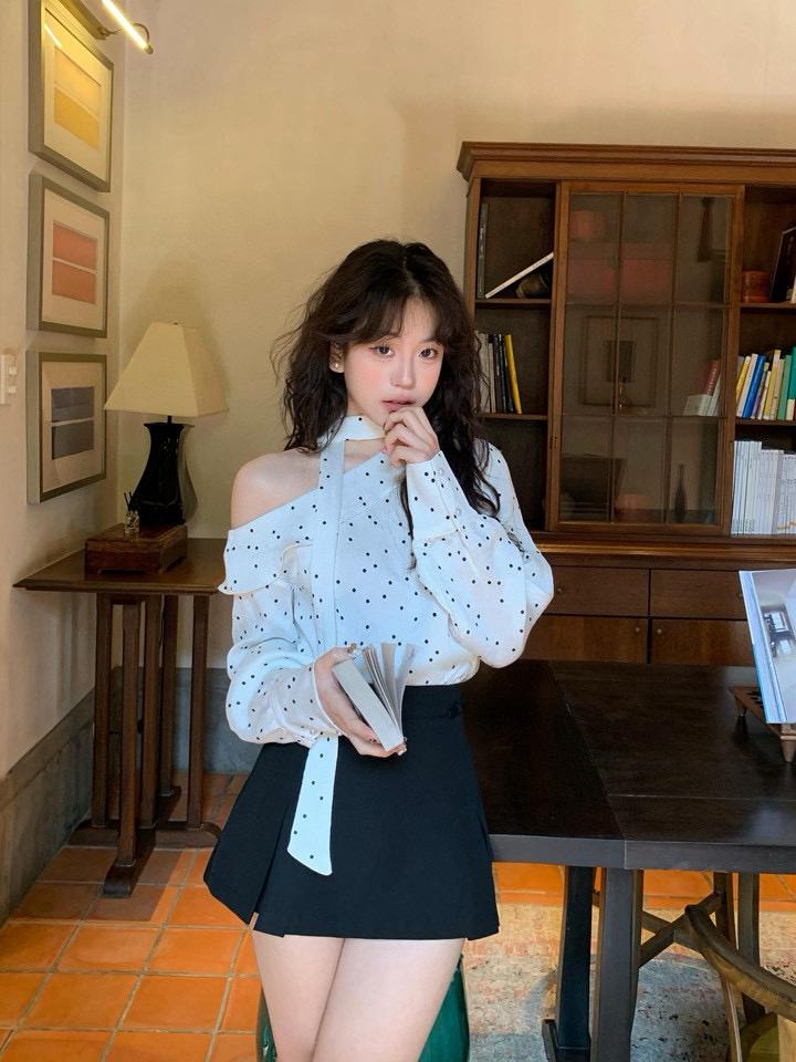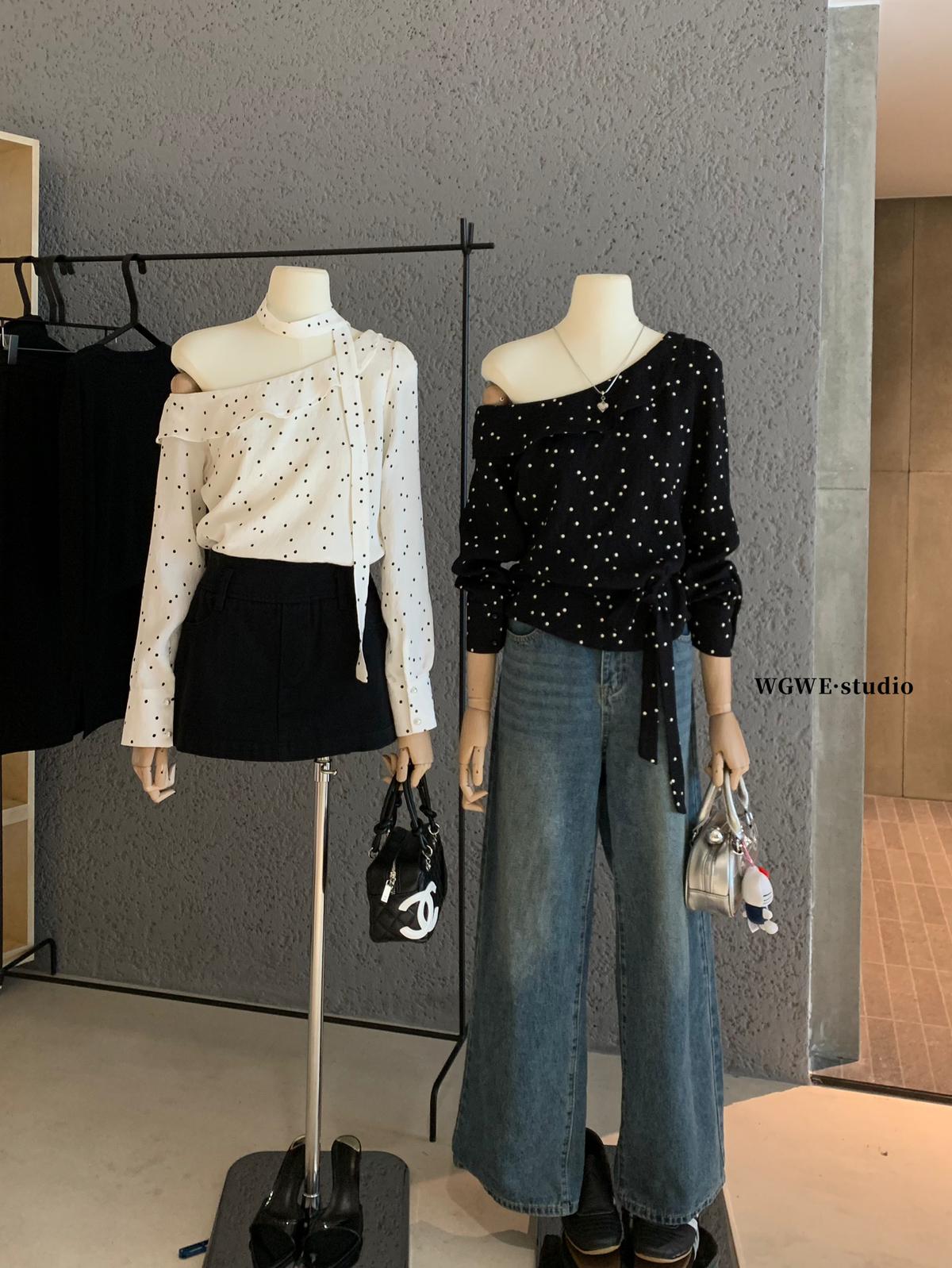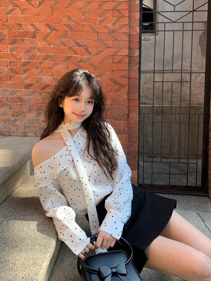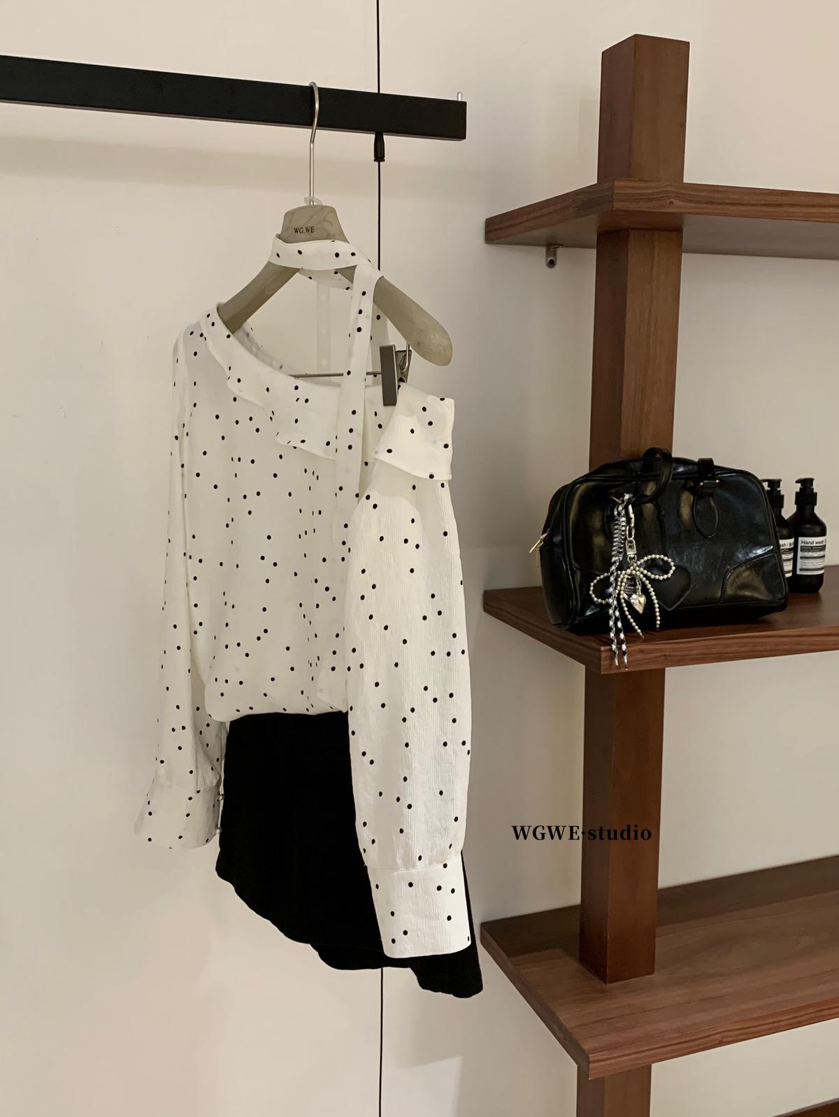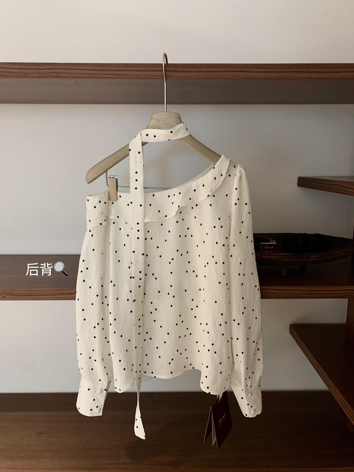 【C7194】設計感斜肩波點小衆露肩小衫(配飄帶)