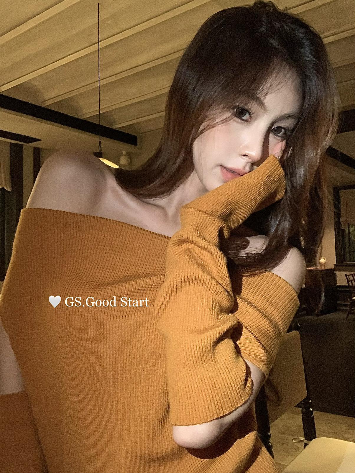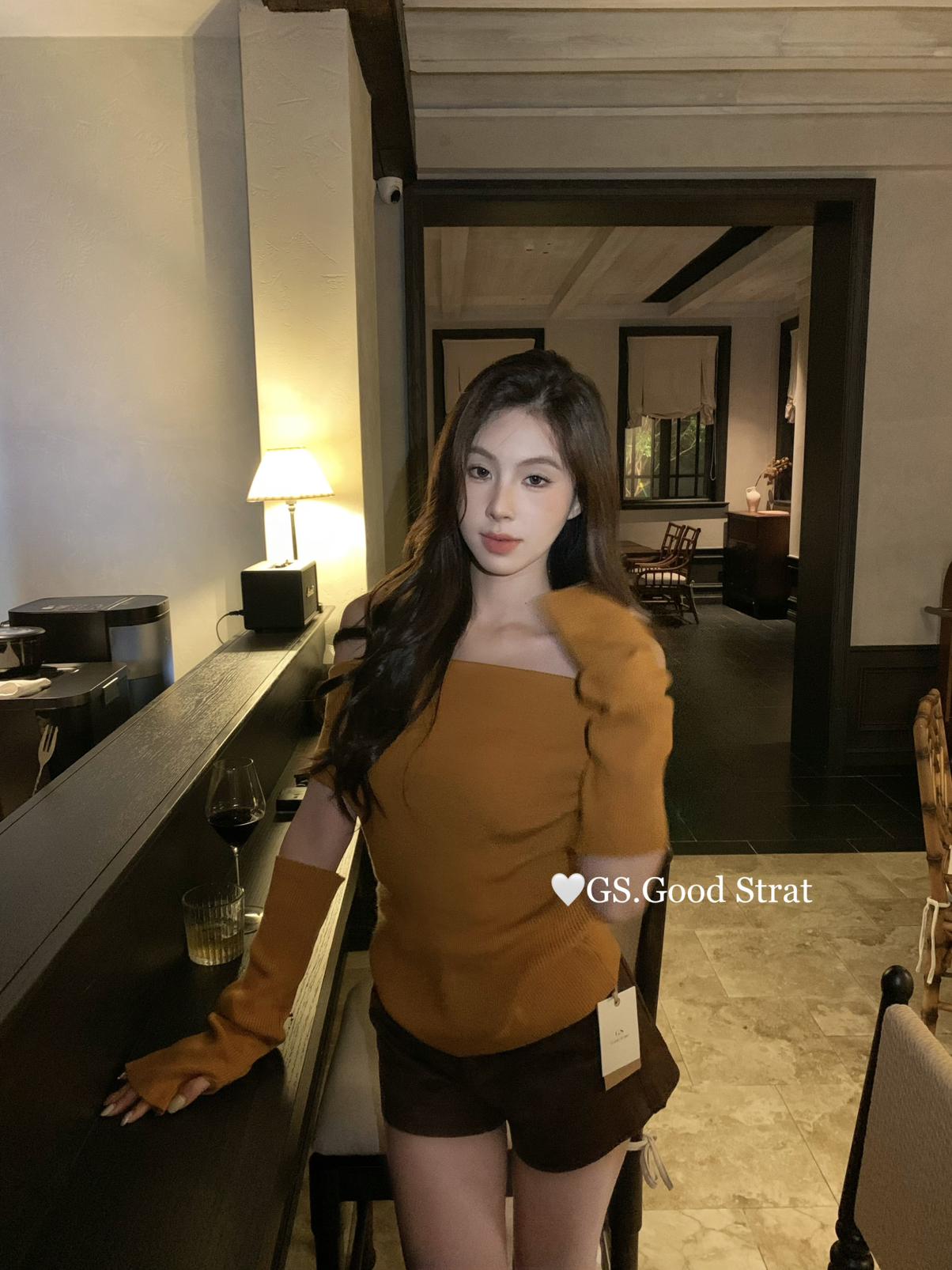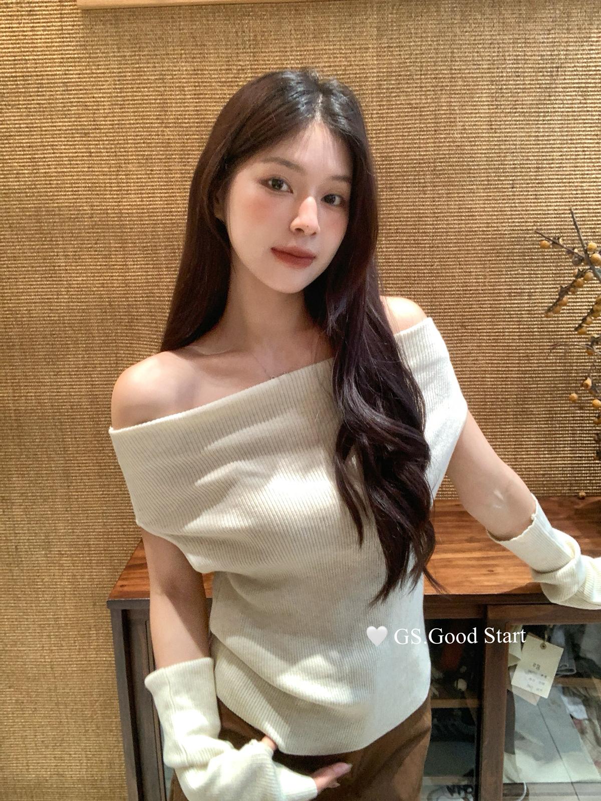 【C7197】超hot!穿上就是權威!秋季時髦辣妹風豎坑條一字肩針織小衫(配可拆卸袖套)