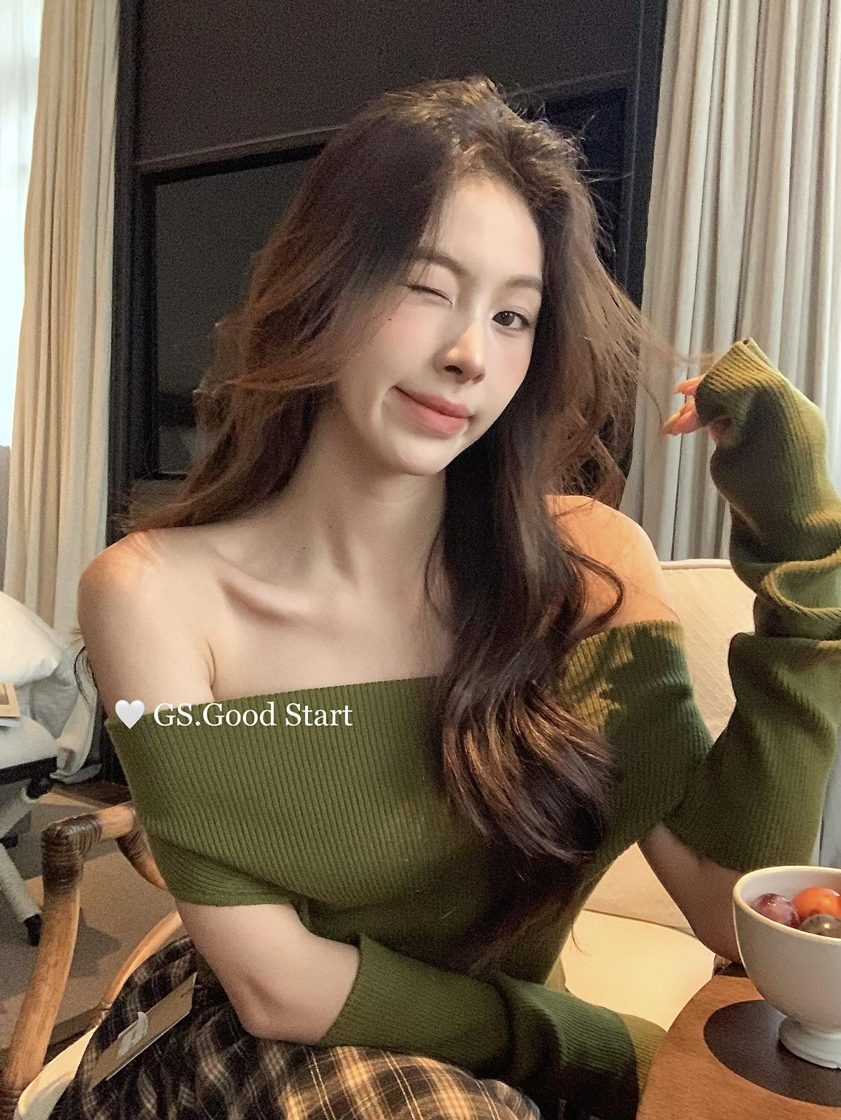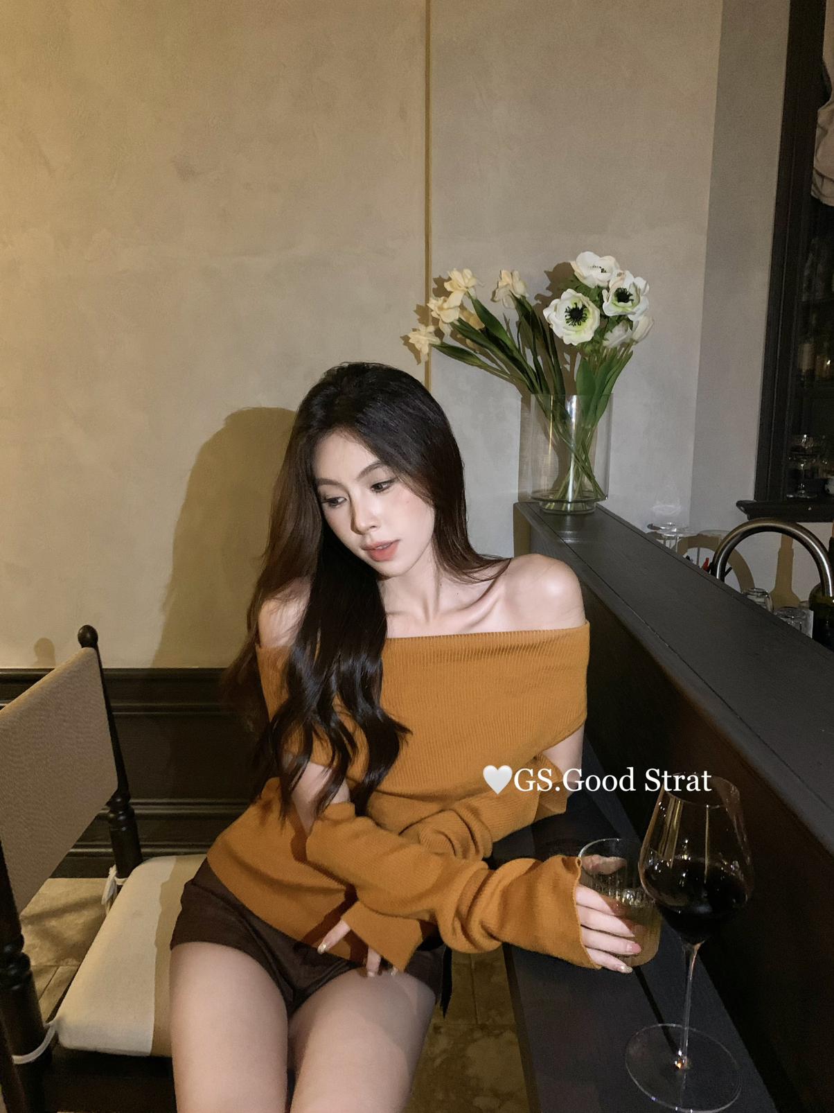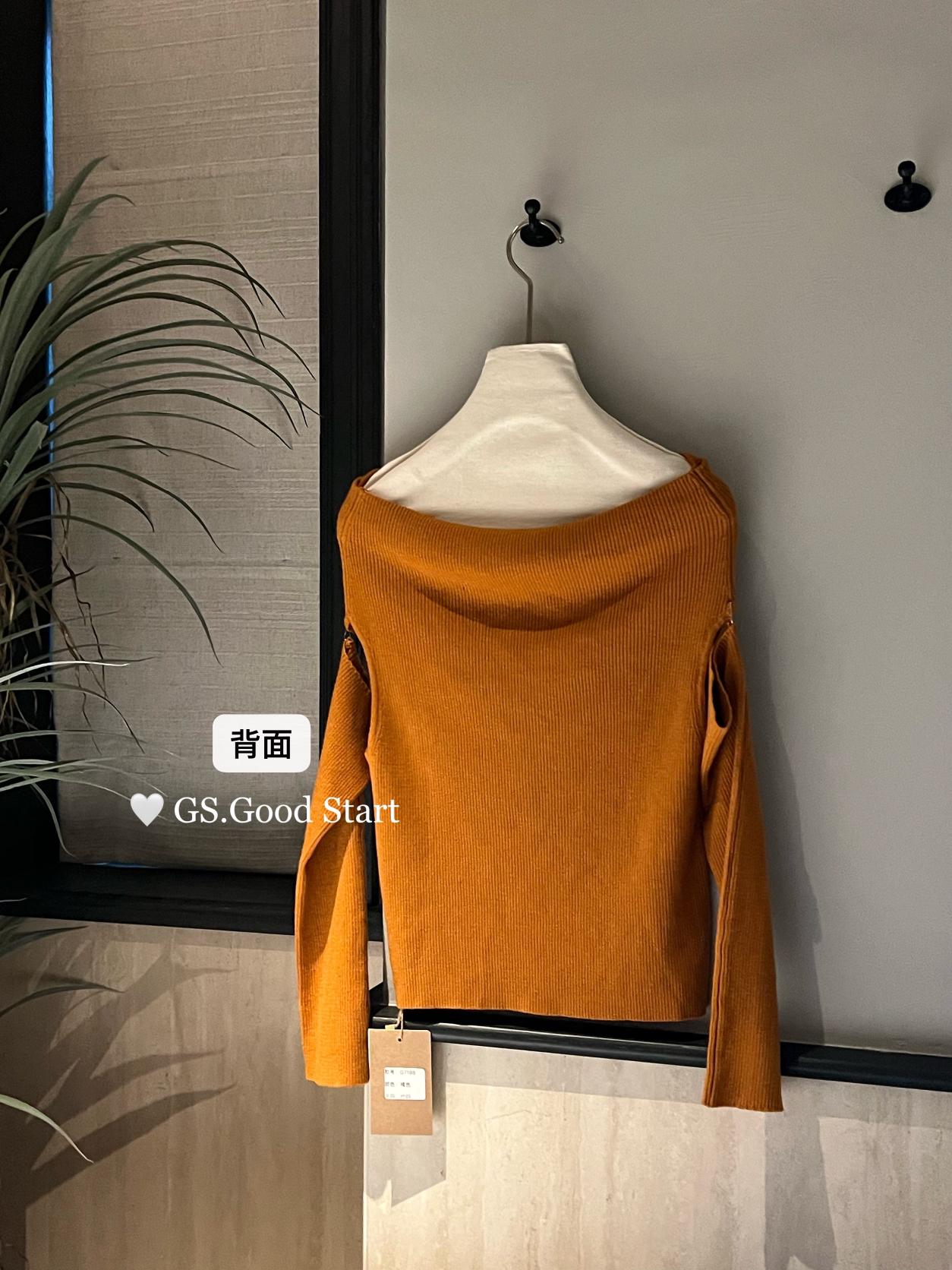 【C7197】超hot!穿上就是權威!秋季時髦辣妹風豎坑條一字肩針織小衫(配可拆卸袖套)