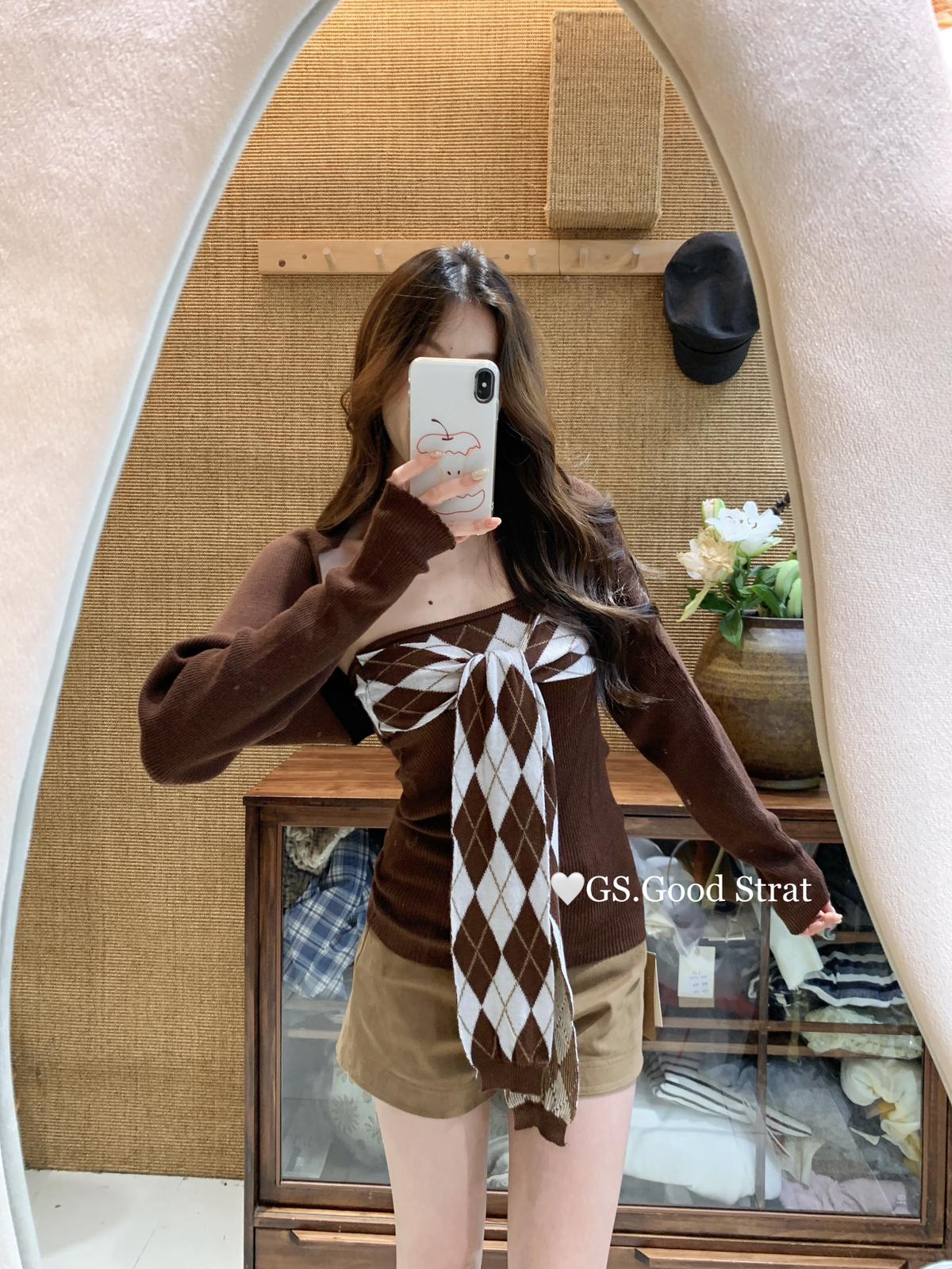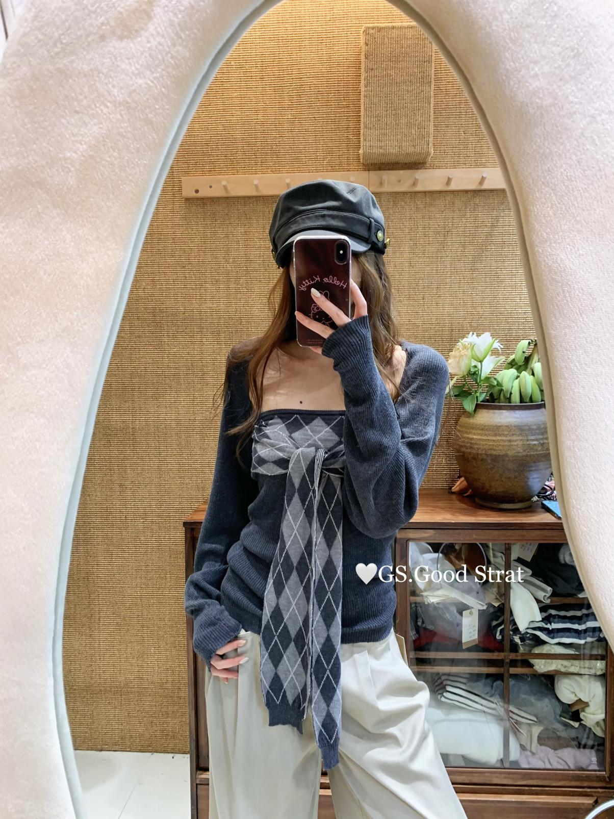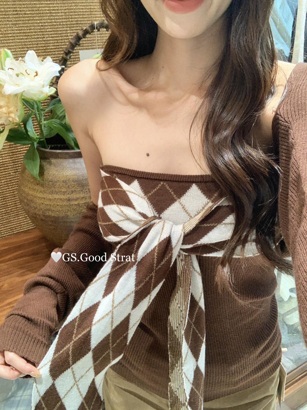 【C7198】被問爆了!必入*韓系ins時髦純欲綁帶格紋抹胸+針織開衫套裝(含4%羊毛)