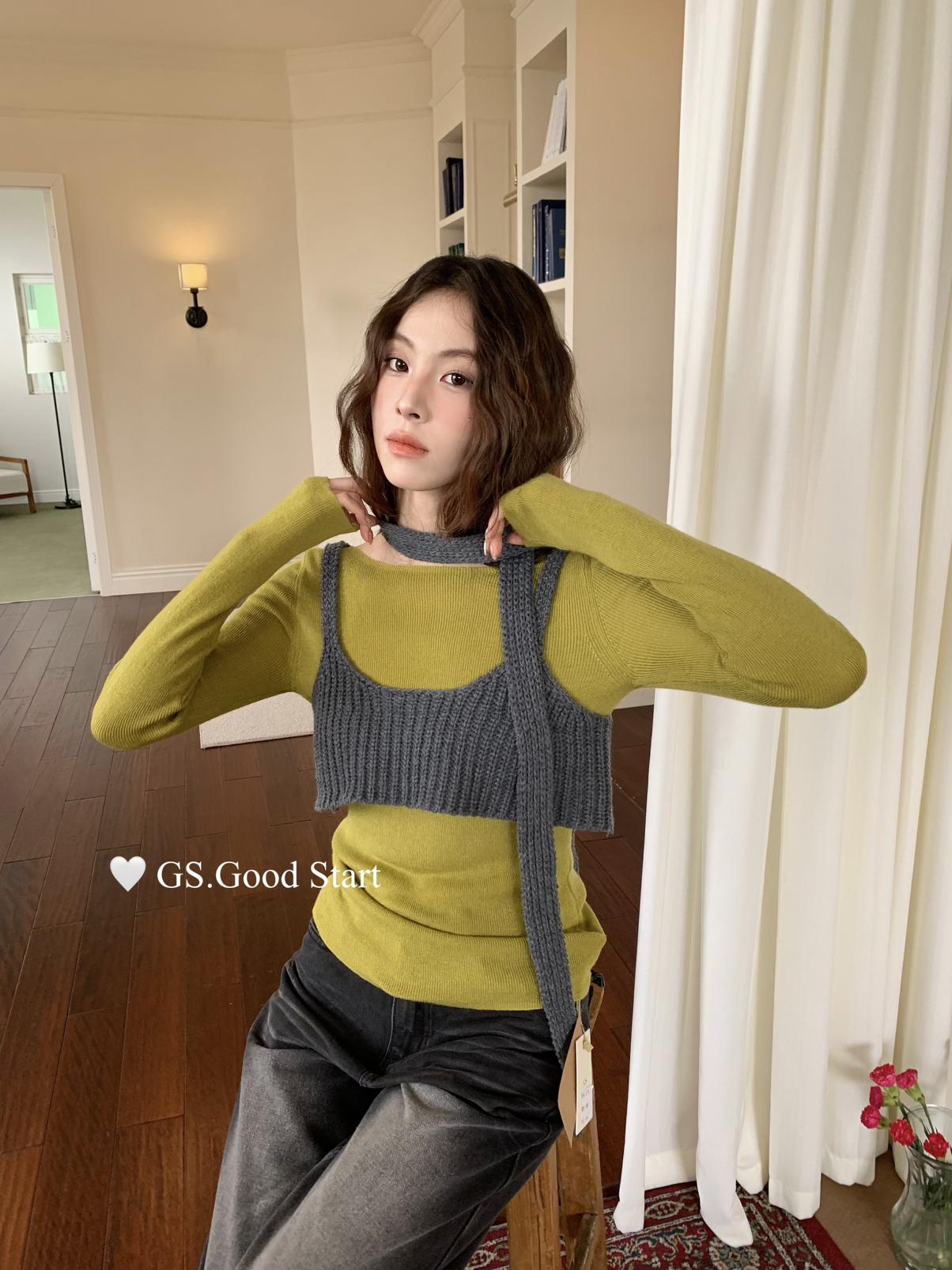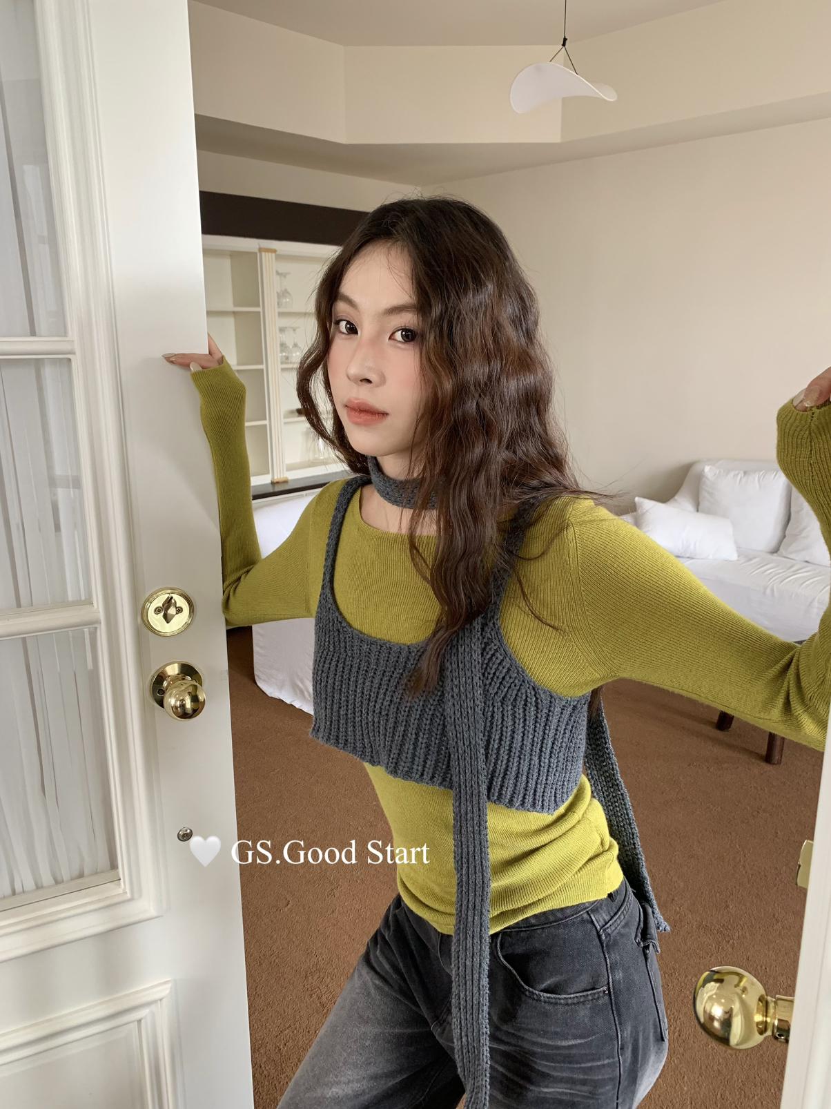 【C7200】進階韓女穿搭*流量密碼!韓系ins時髦撞色長袖針織衫+短背心套裝(配可拆卸飄帶)