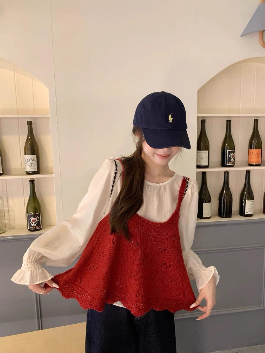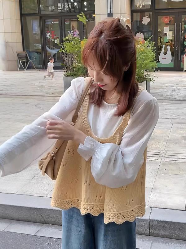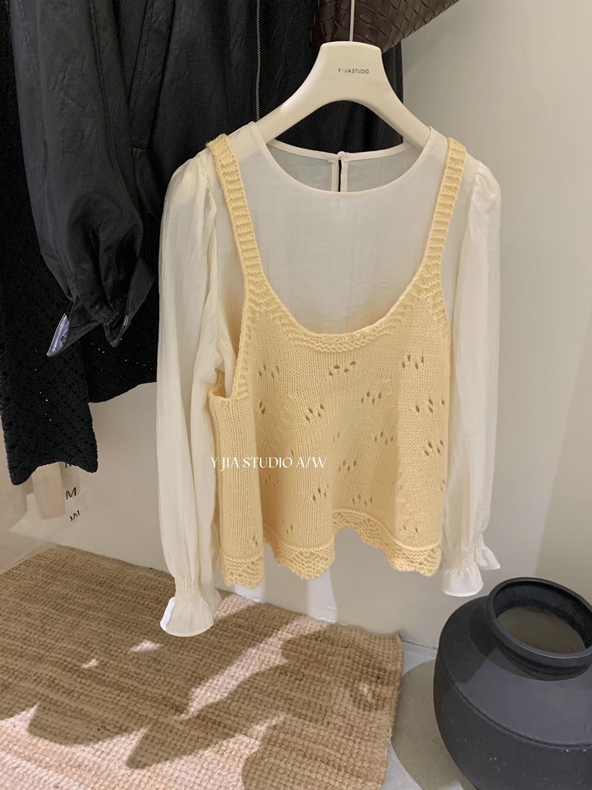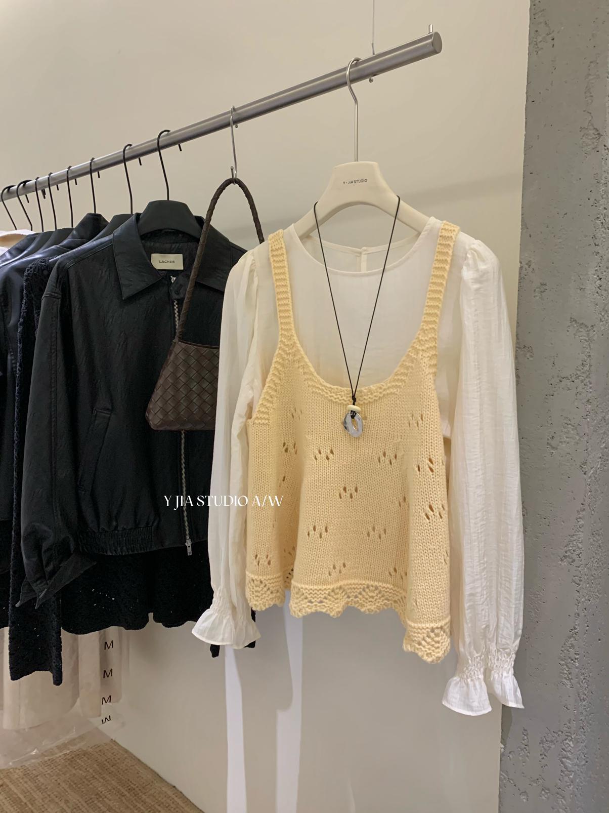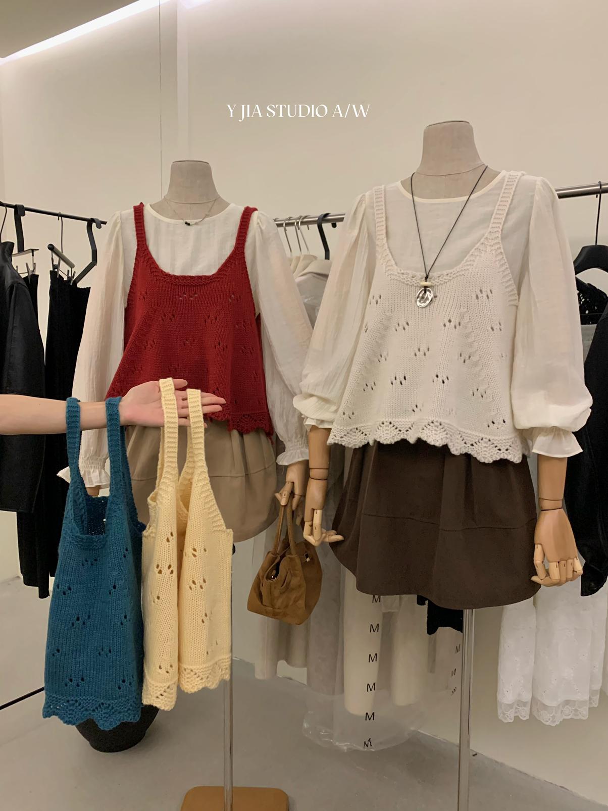 【C7228】甜美減齡娃娃小衫+鉤花針織吊帶背心套裝