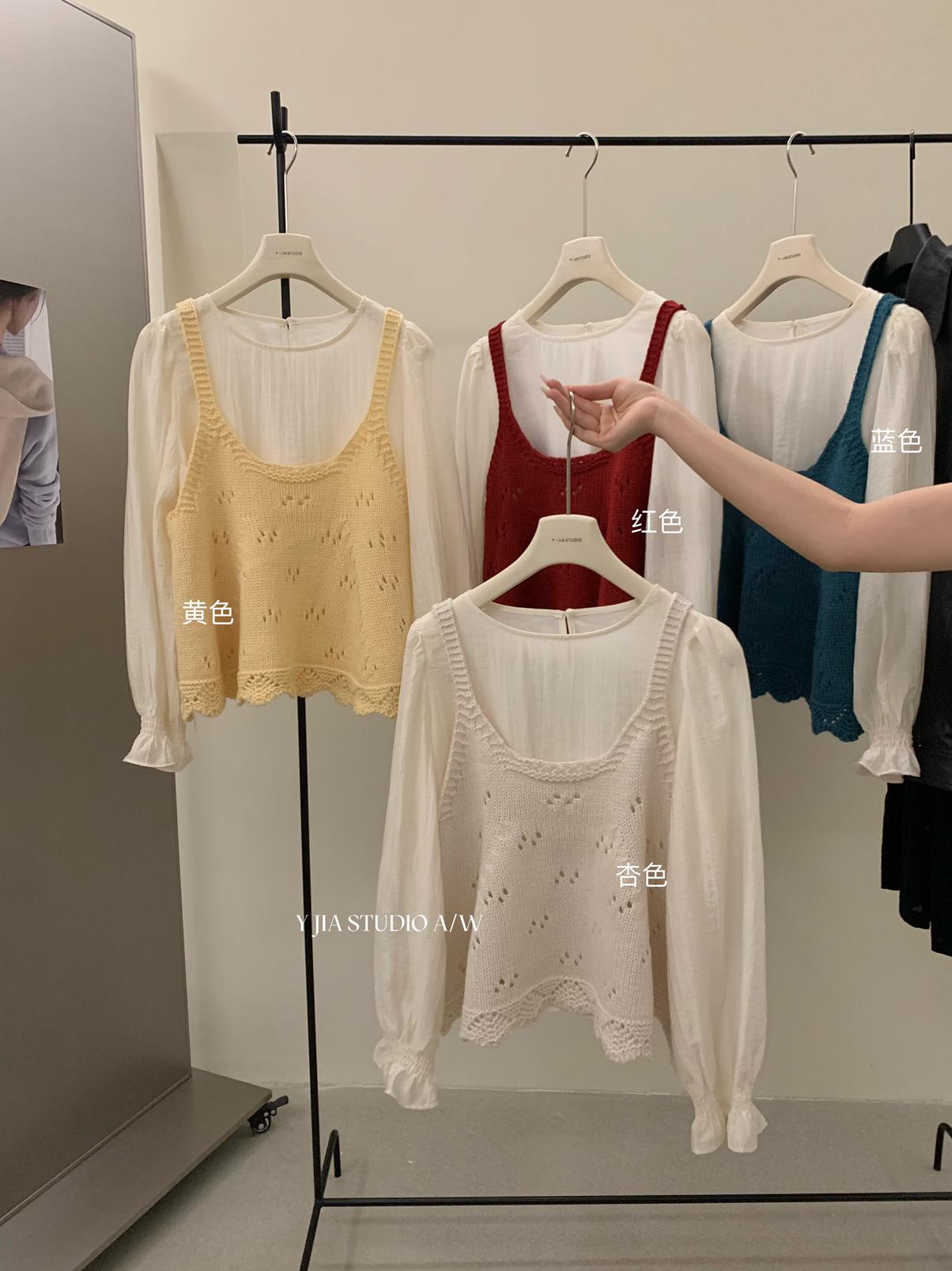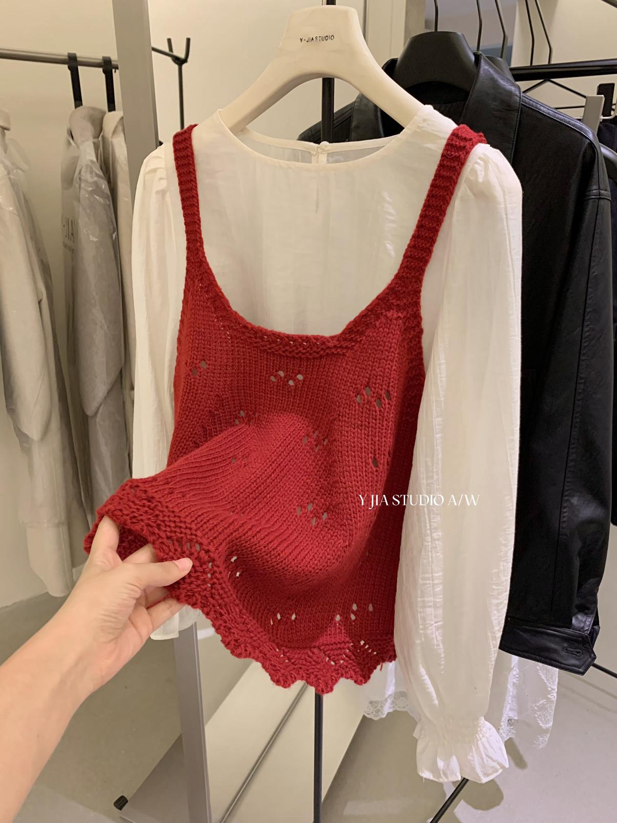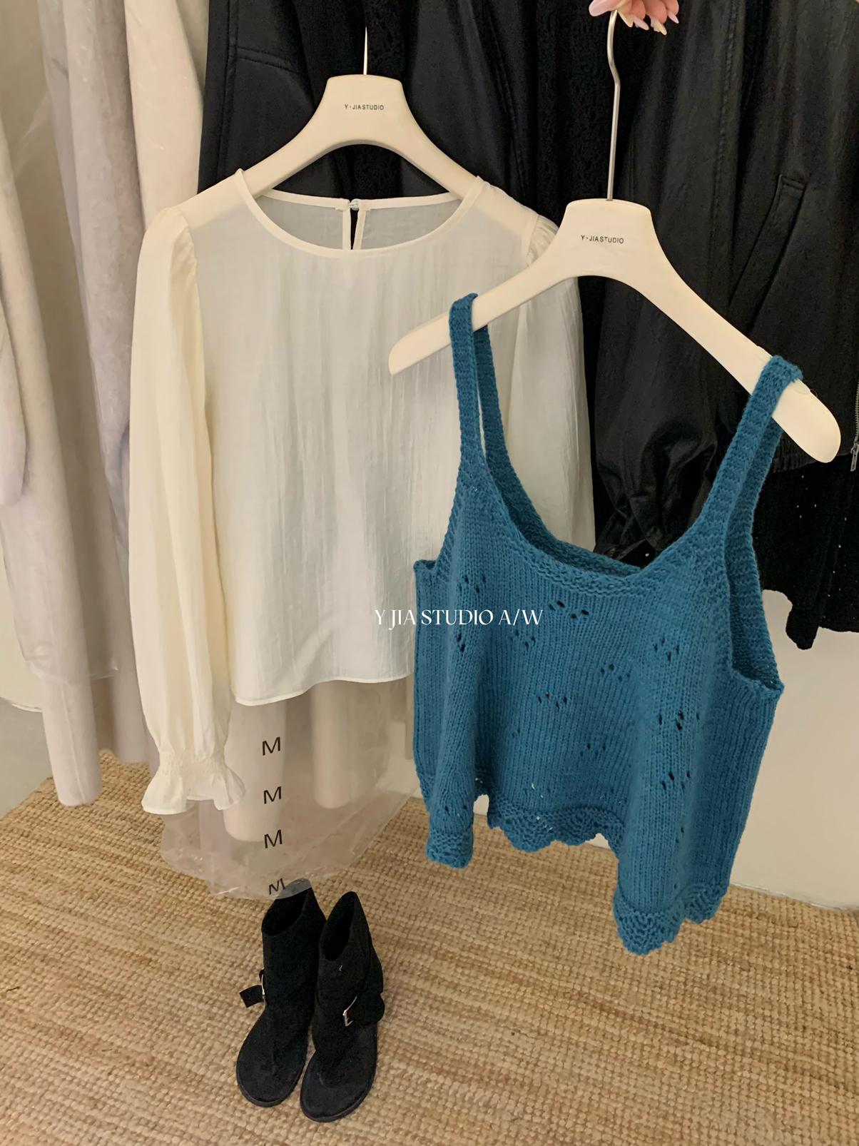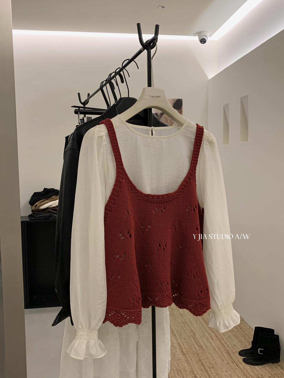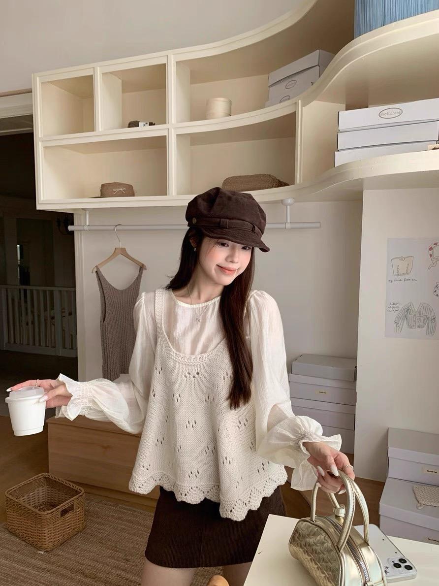 【C7228】甜美減齡娃娃小衫+鉤花針織吊帶背心套裝
