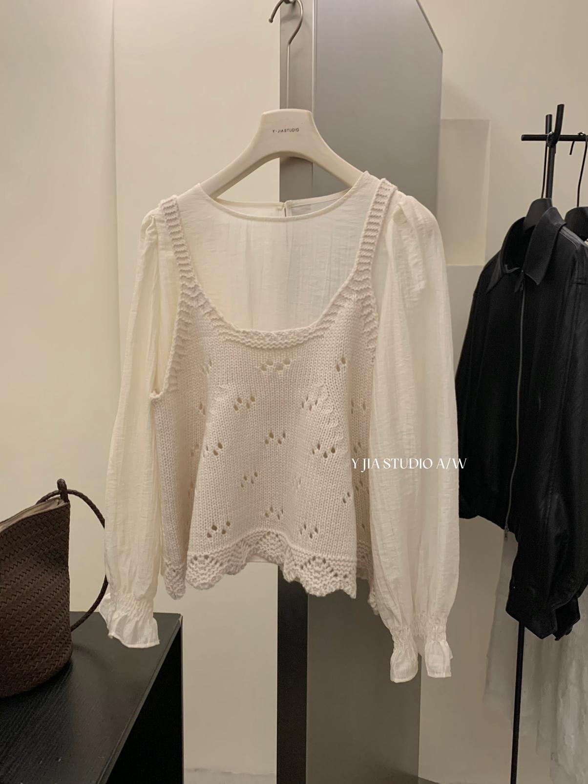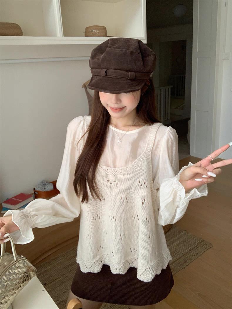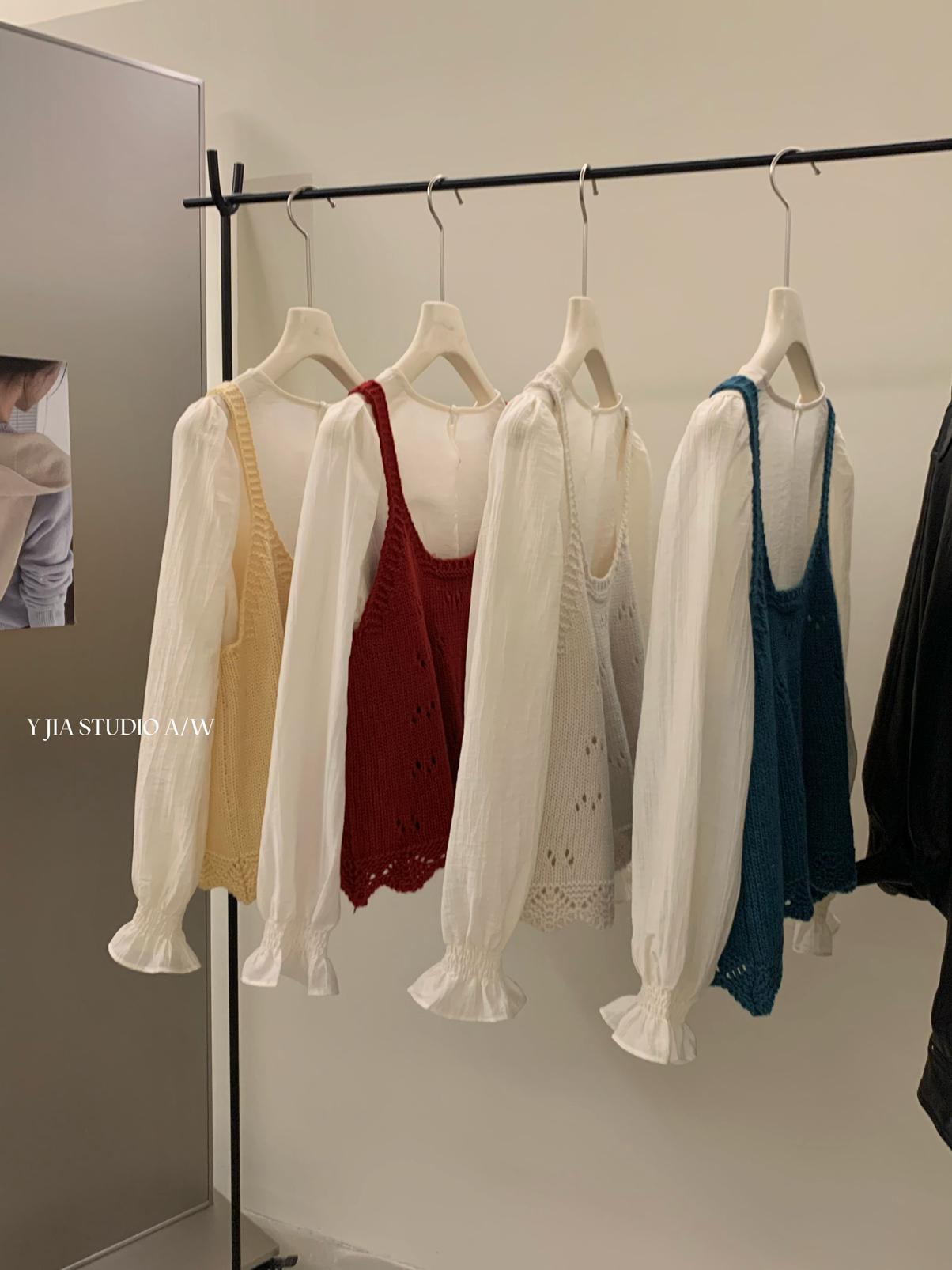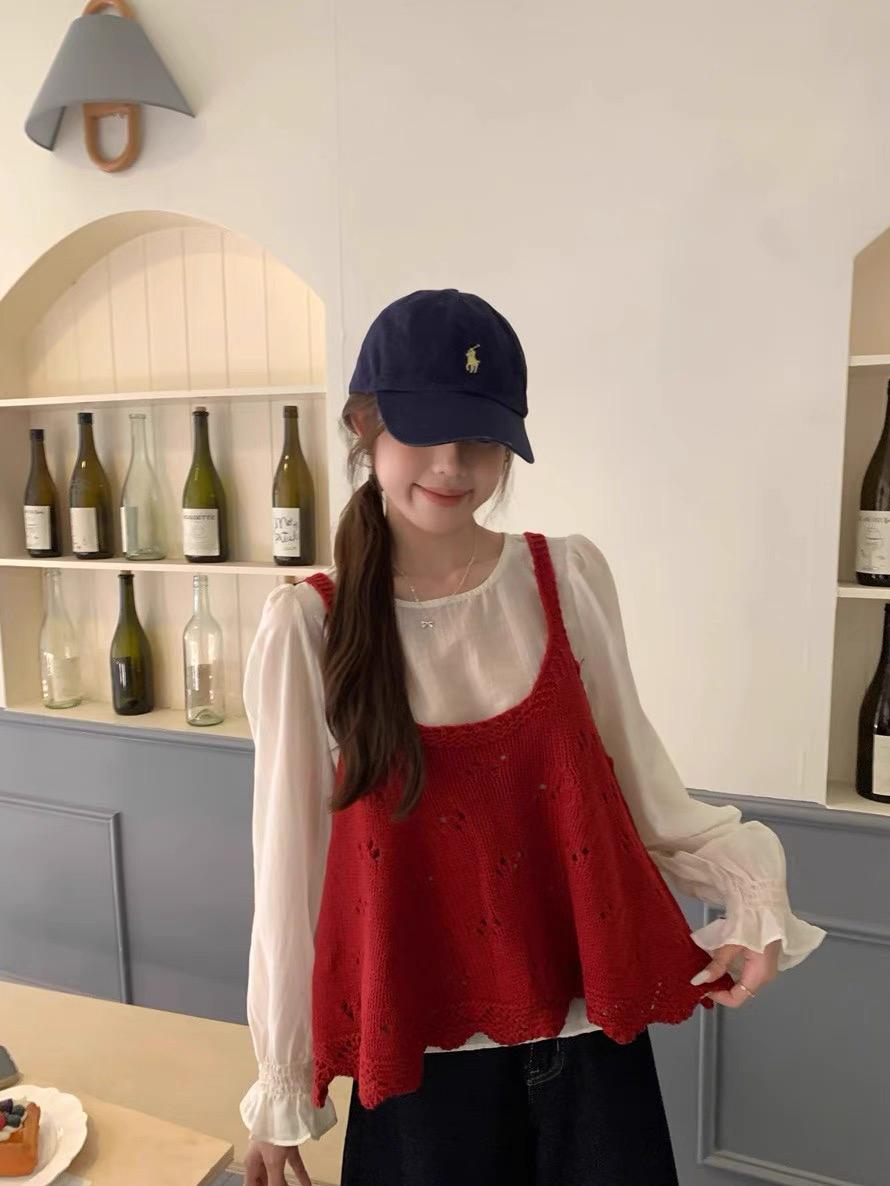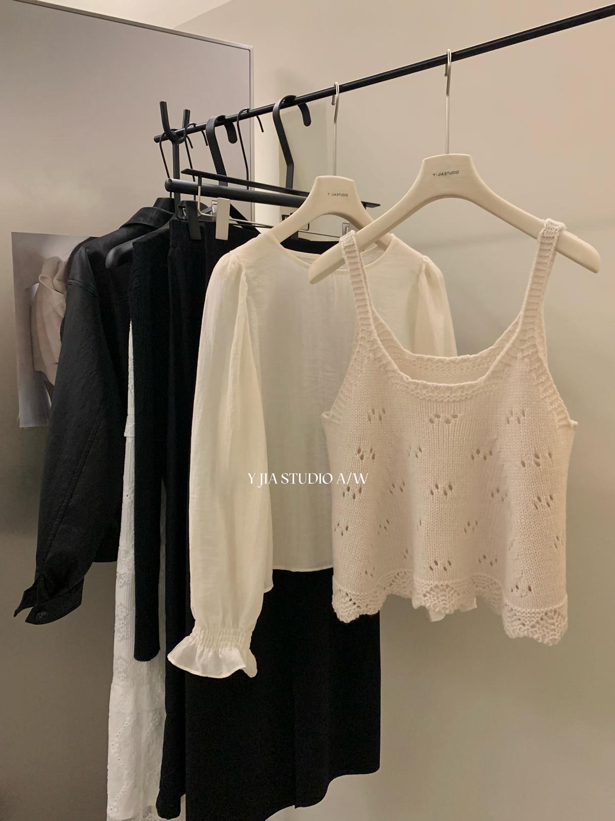 【C7228】甜美減齡娃娃小衫+鉤花針織吊帶背心套裝