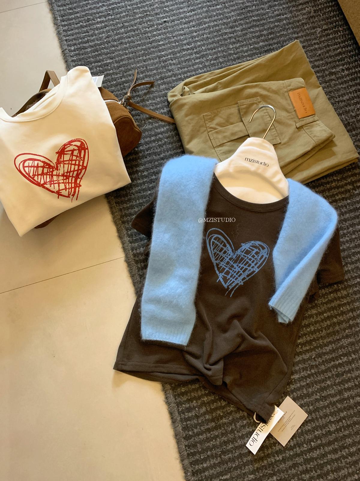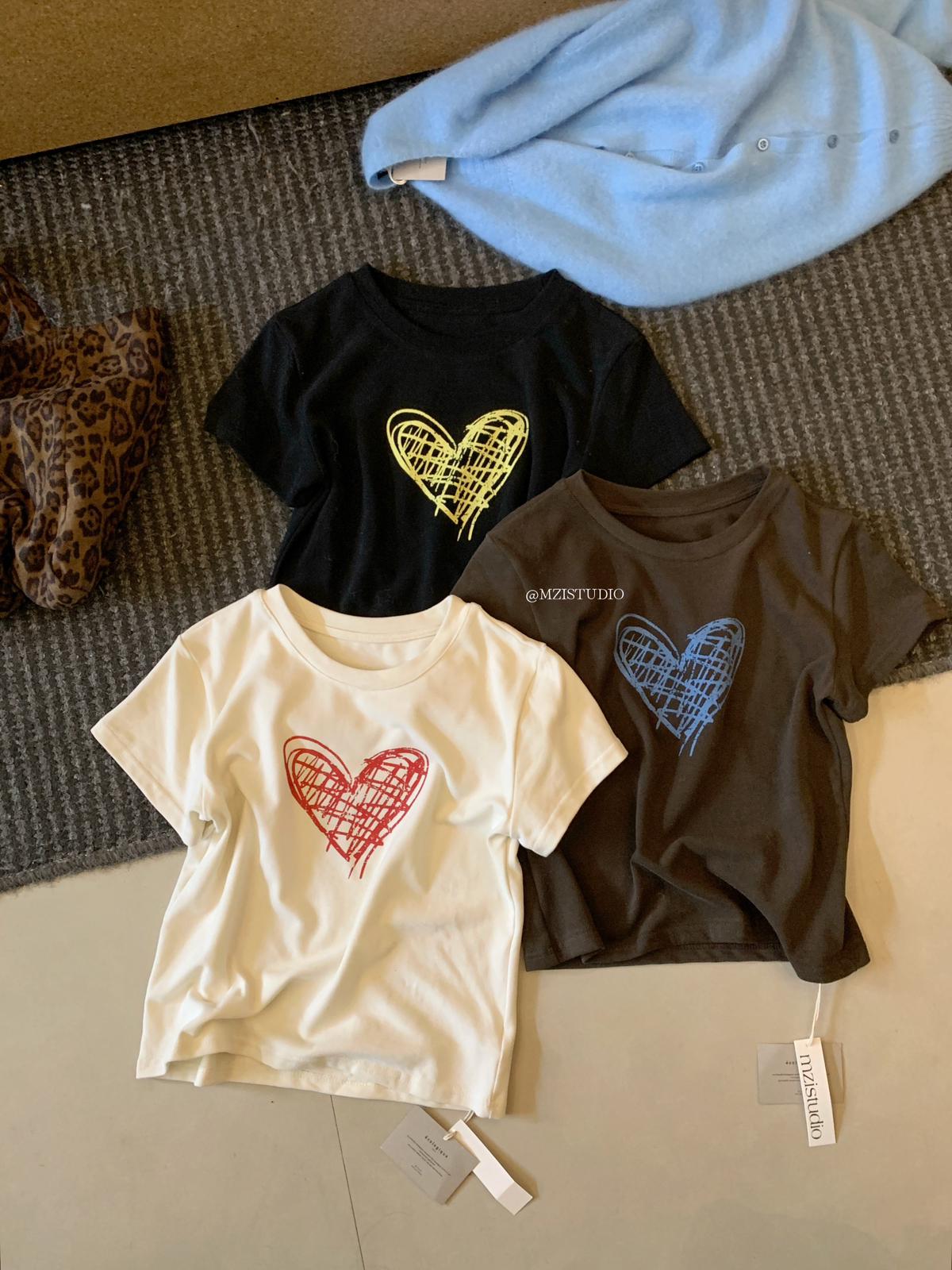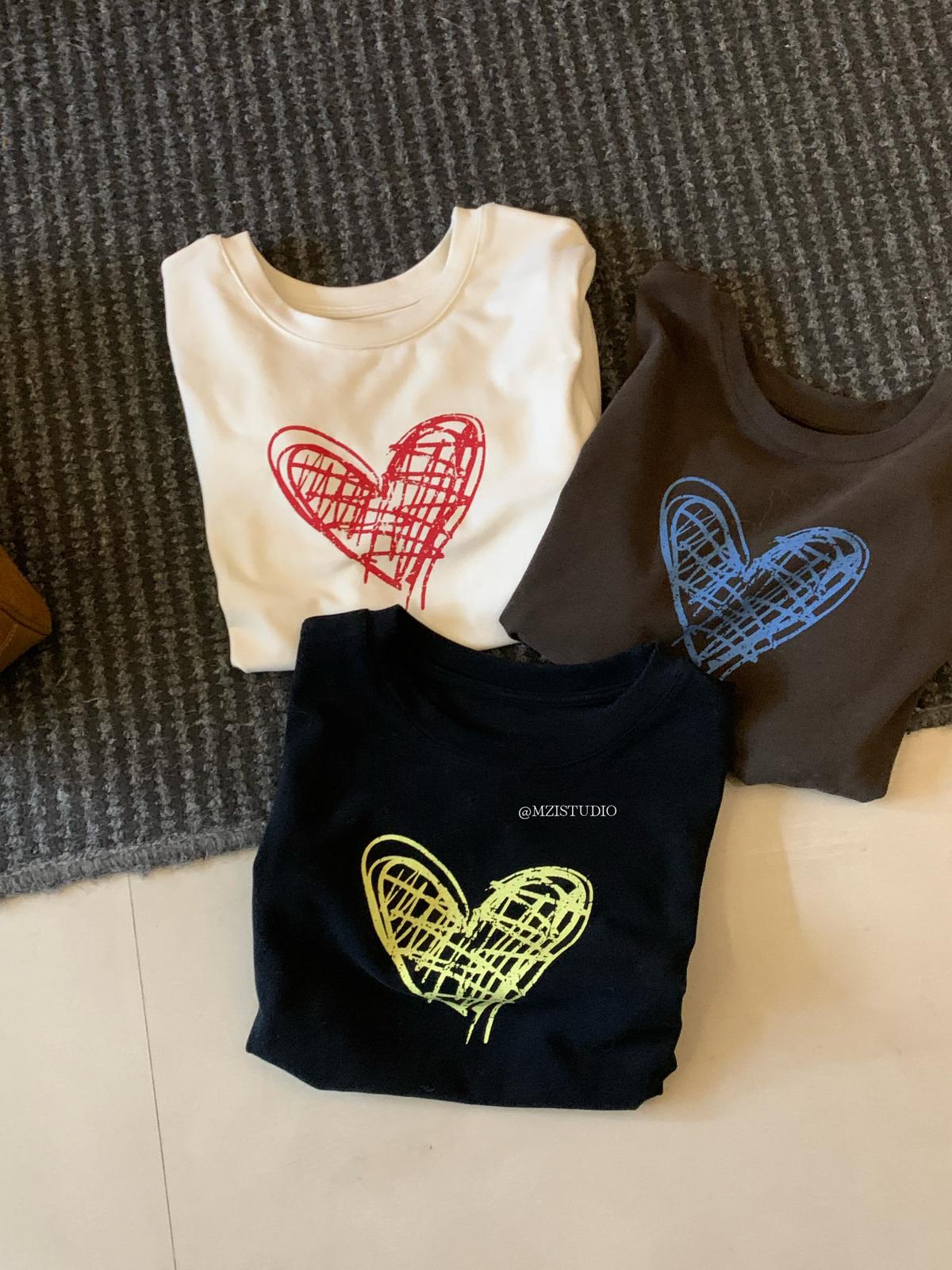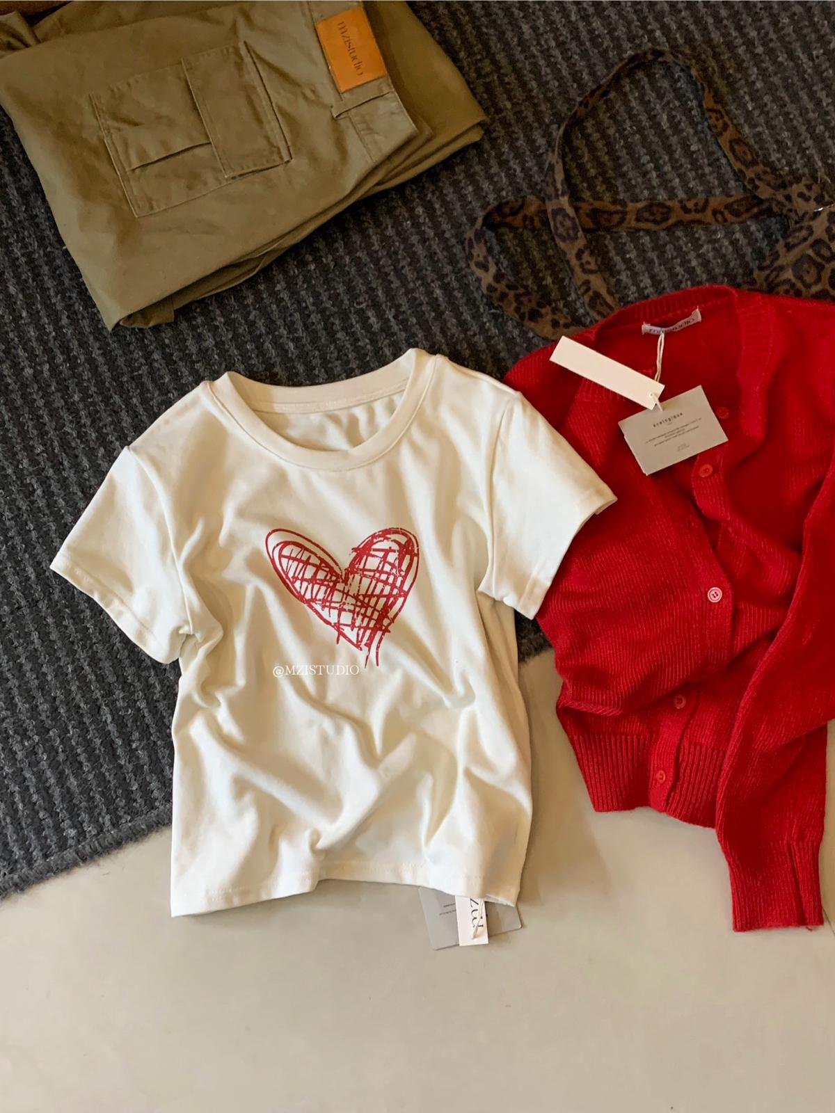 【C7216】韓感甜美愛心簡約質感線條桃心印花正肩圓領套頭短袖T恤