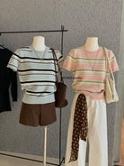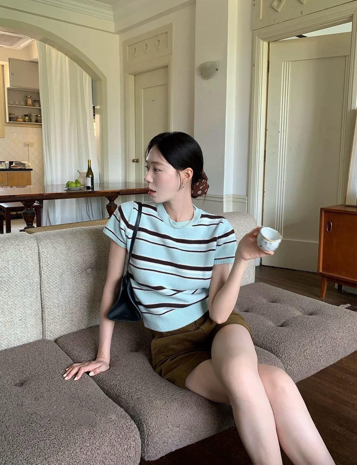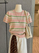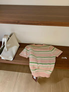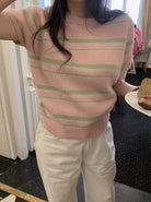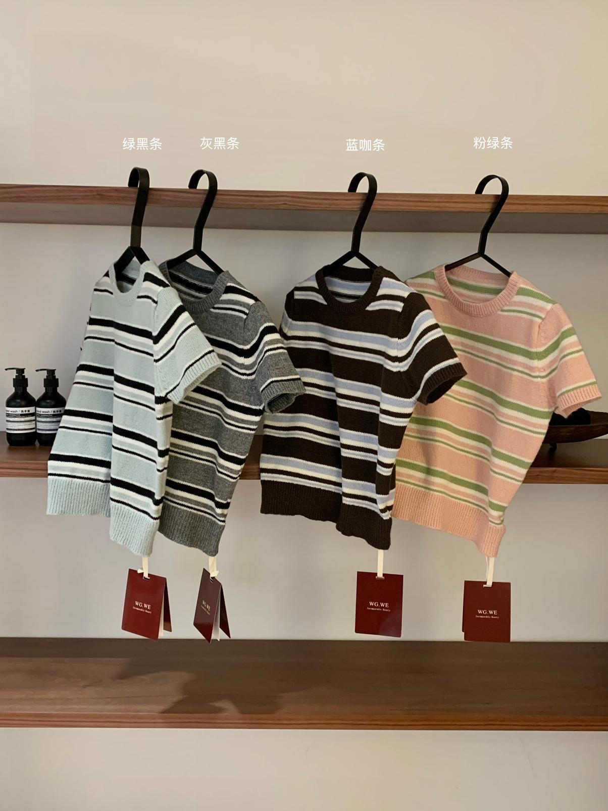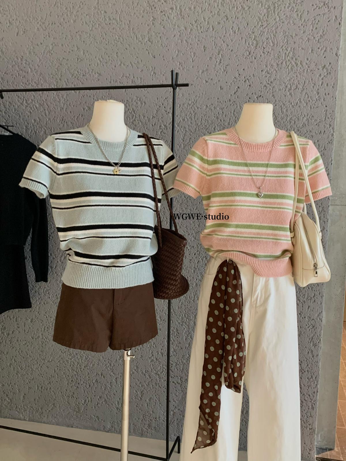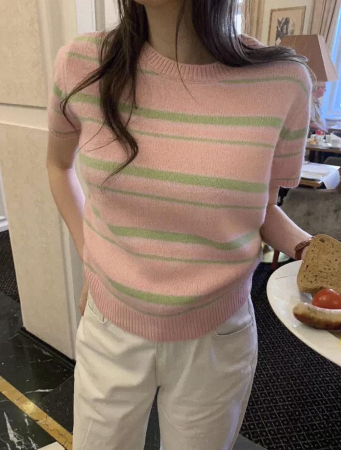 【C7233】百搭撞色條紋圓領寬鬆短袖針織保暖毛衣