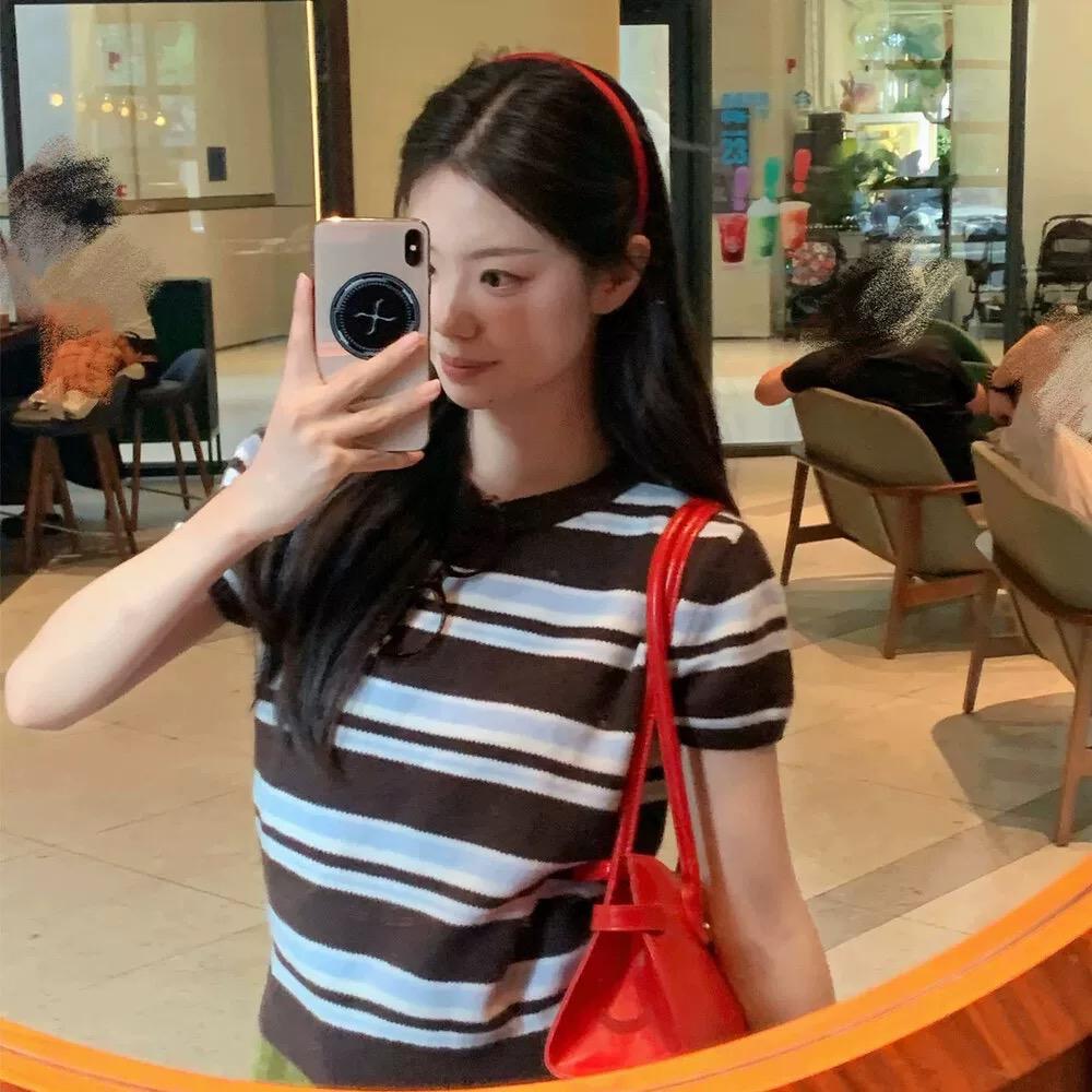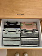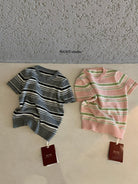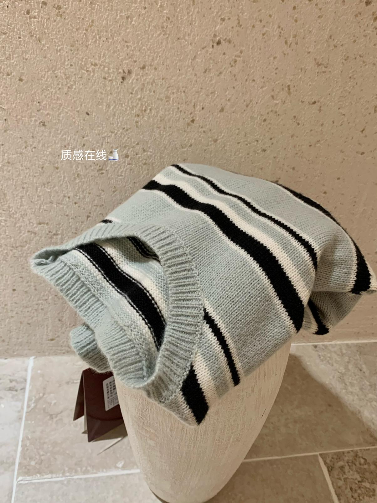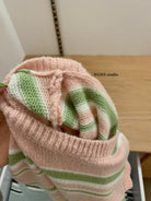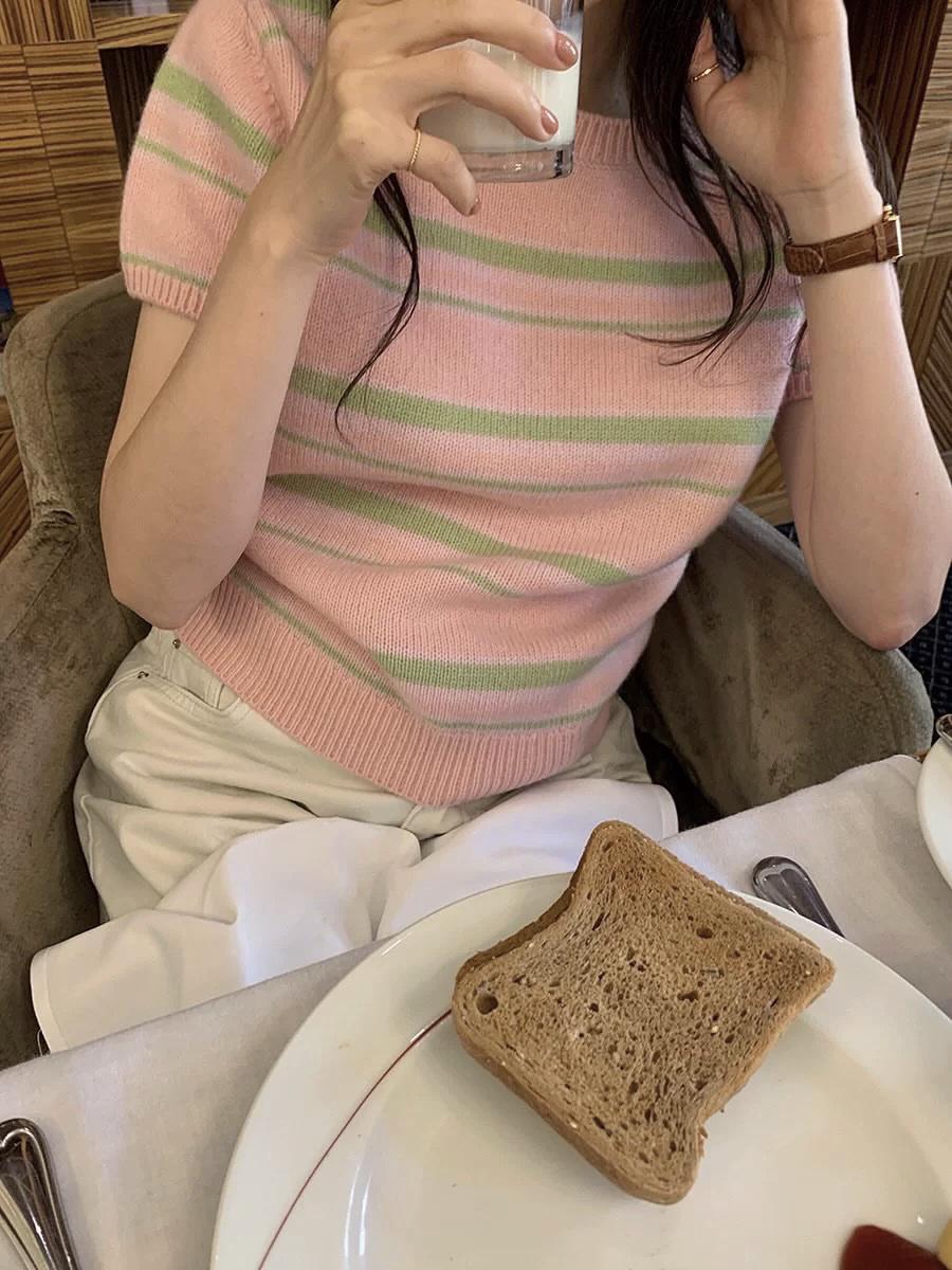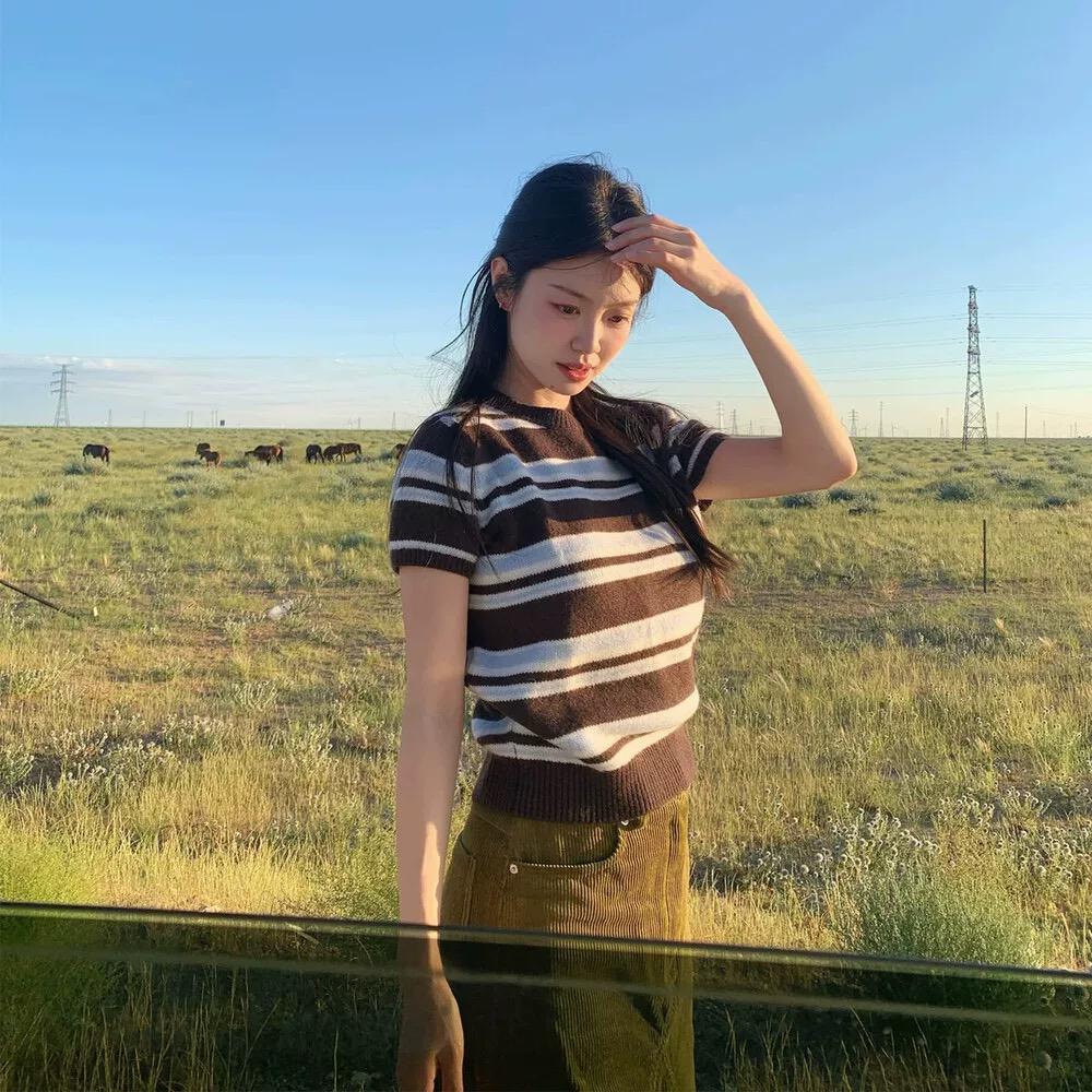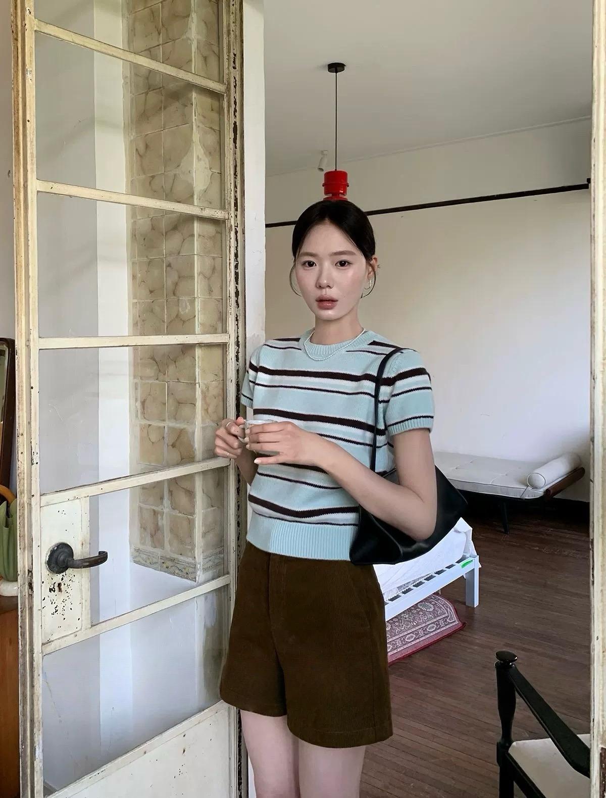 【C7233】百搭撞色條紋圓領寬鬆短袖針織保暖毛衣