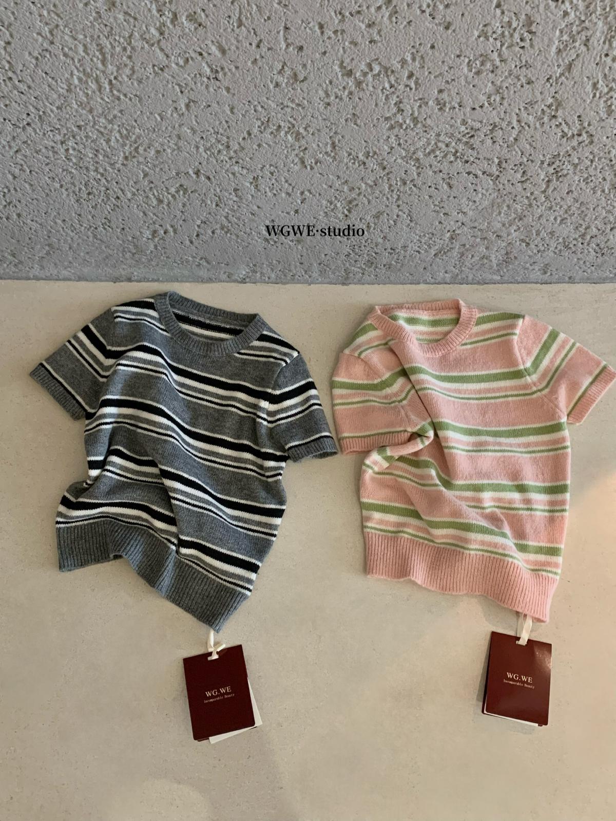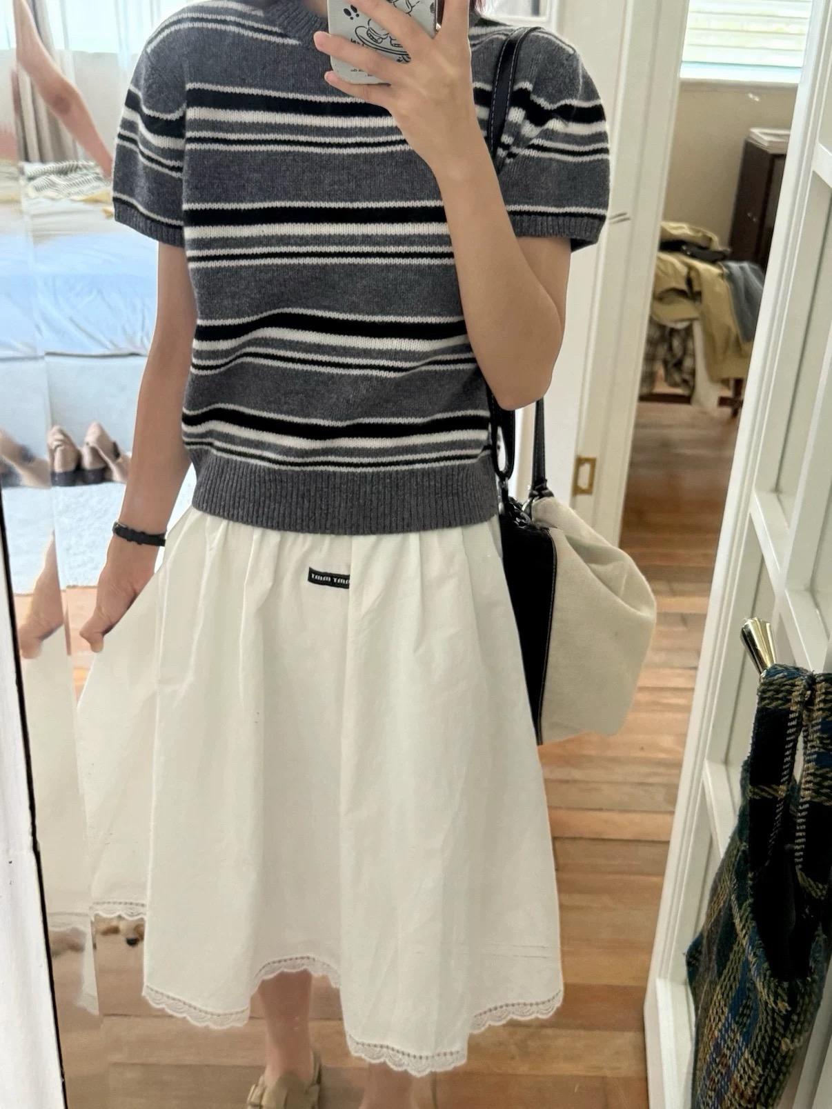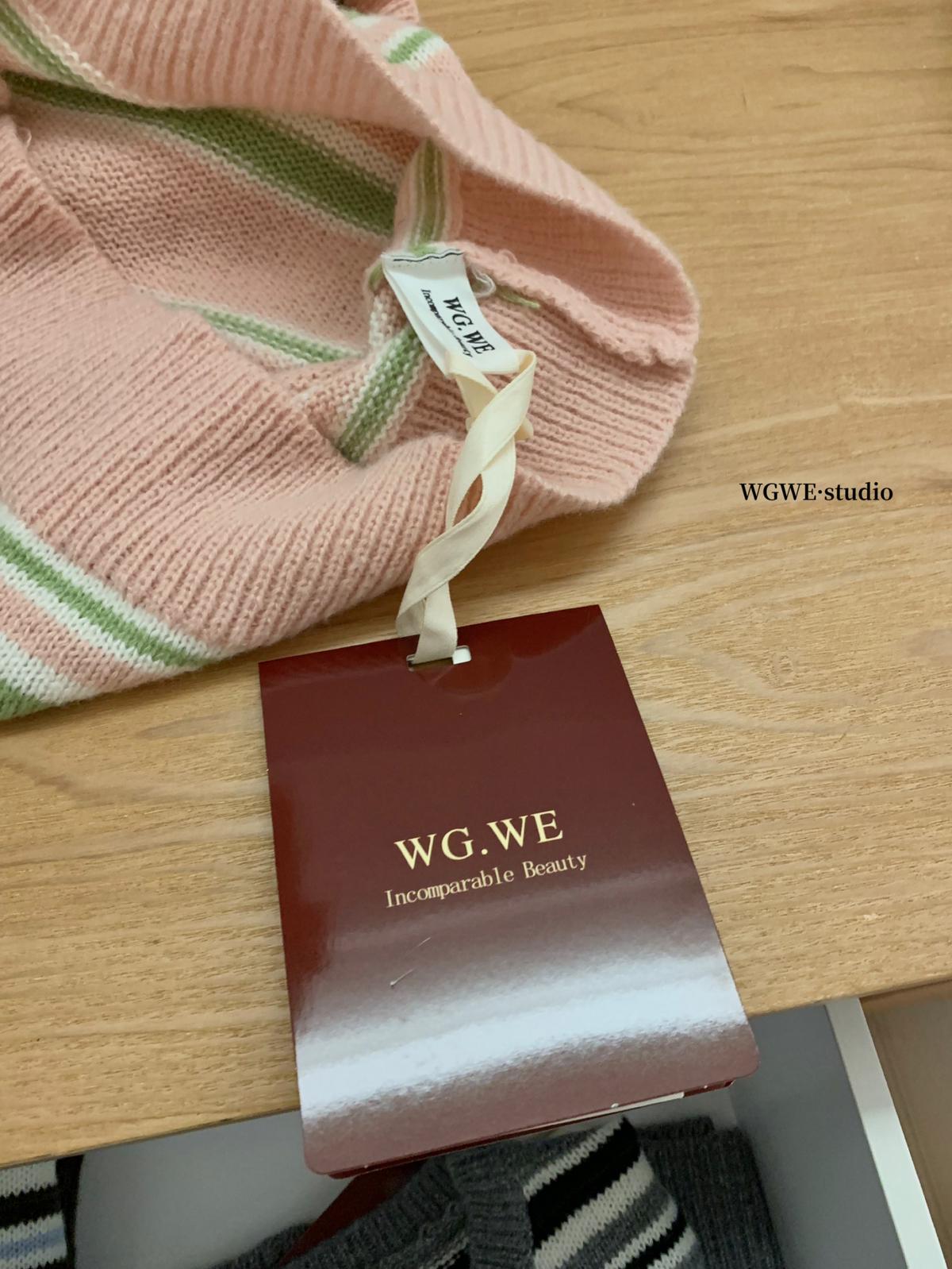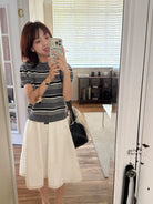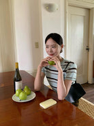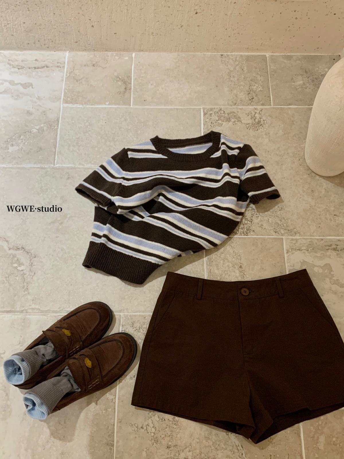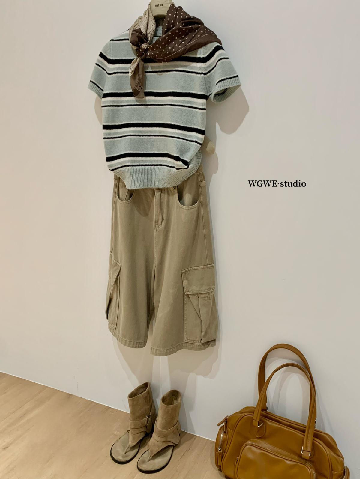 【C7233】百搭撞色條紋圓領寬鬆短袖針織保暖毛衣