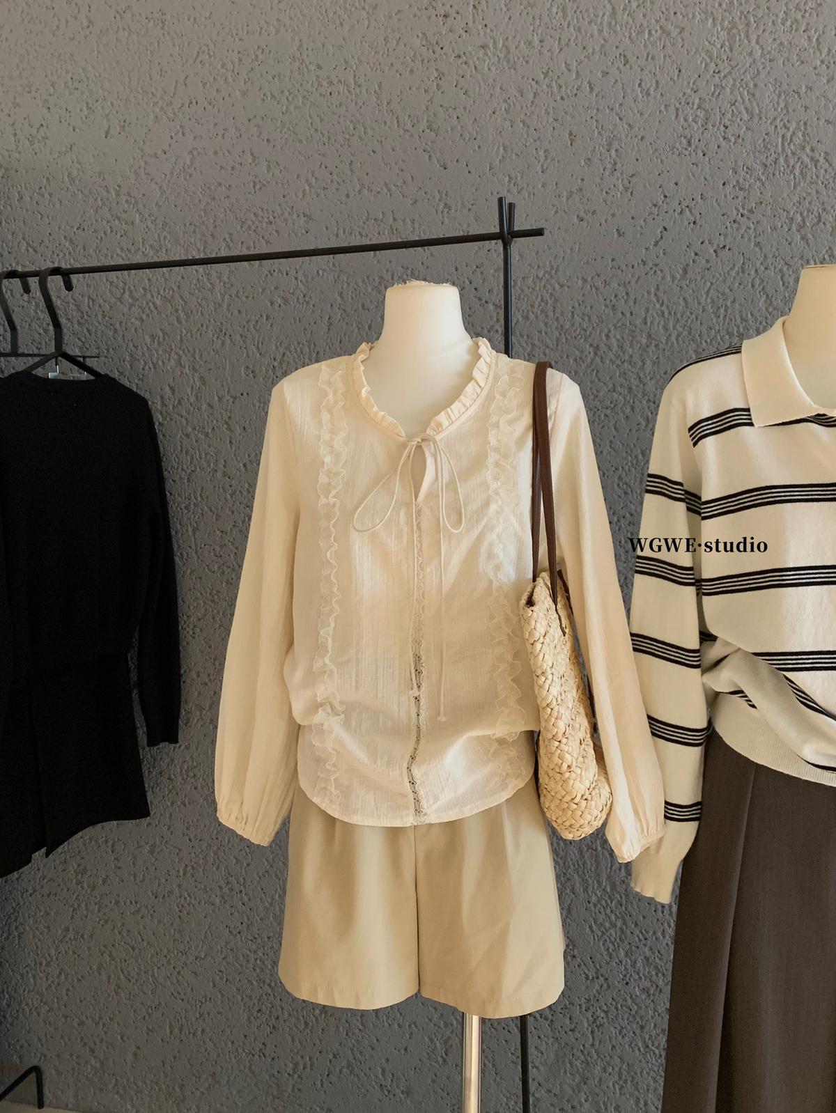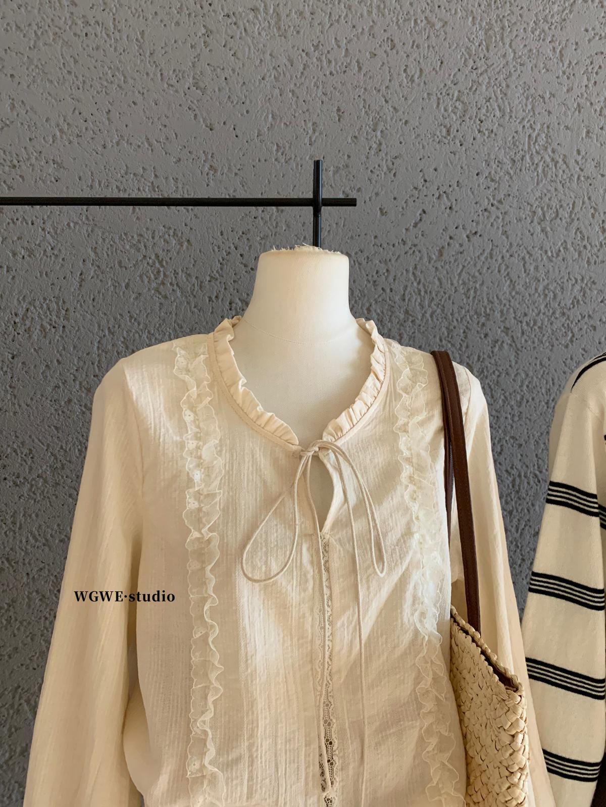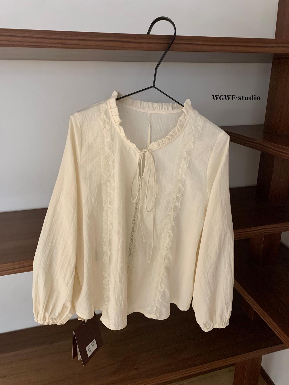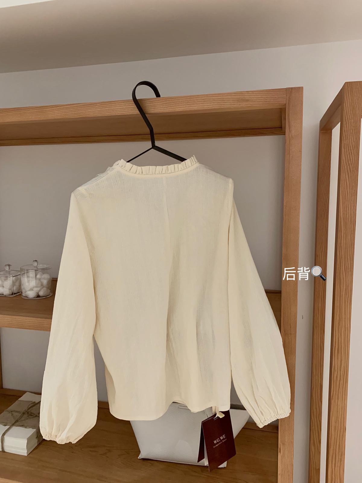 【C7235】法式繫帶木耳邊邊設計感溫柔寬鬆長袖新款簡約高級感小衫