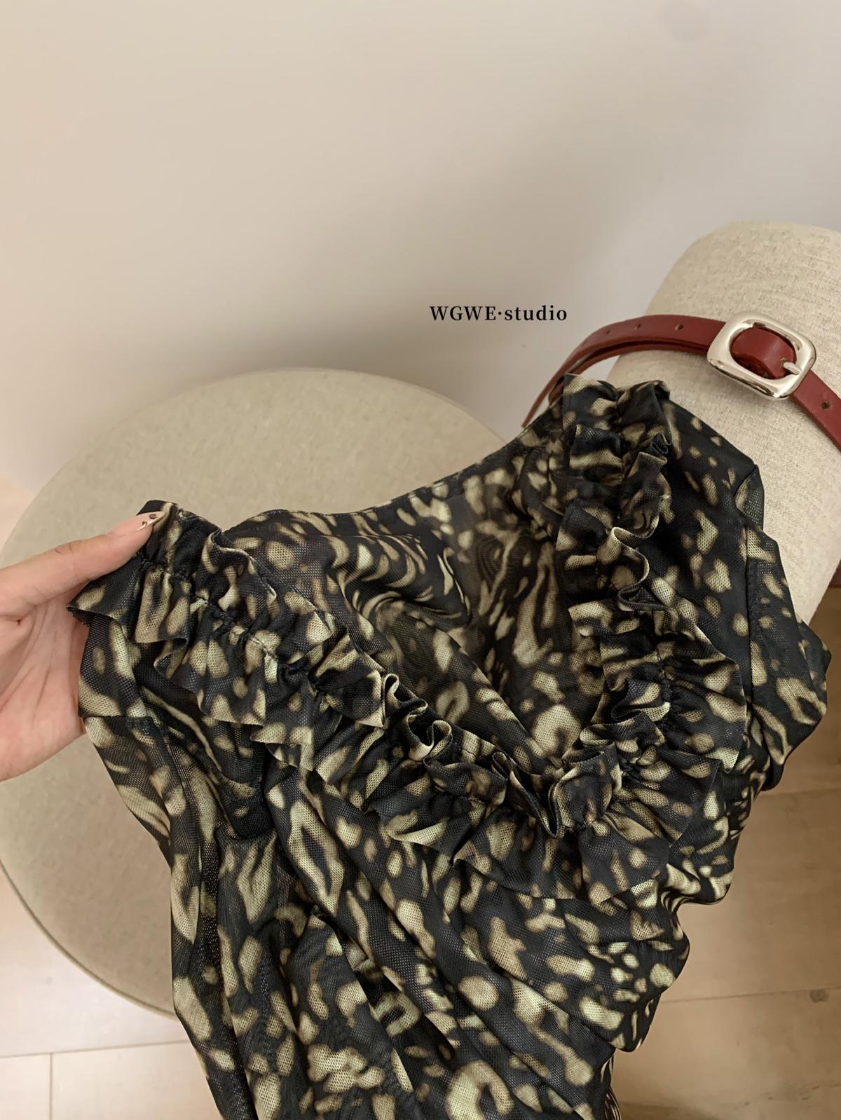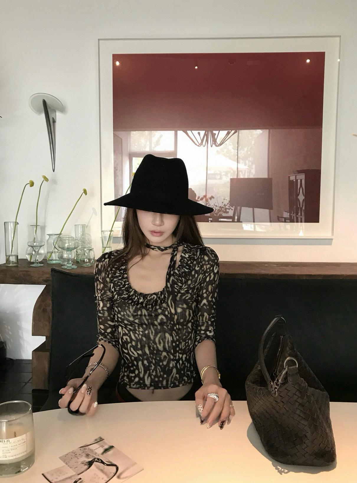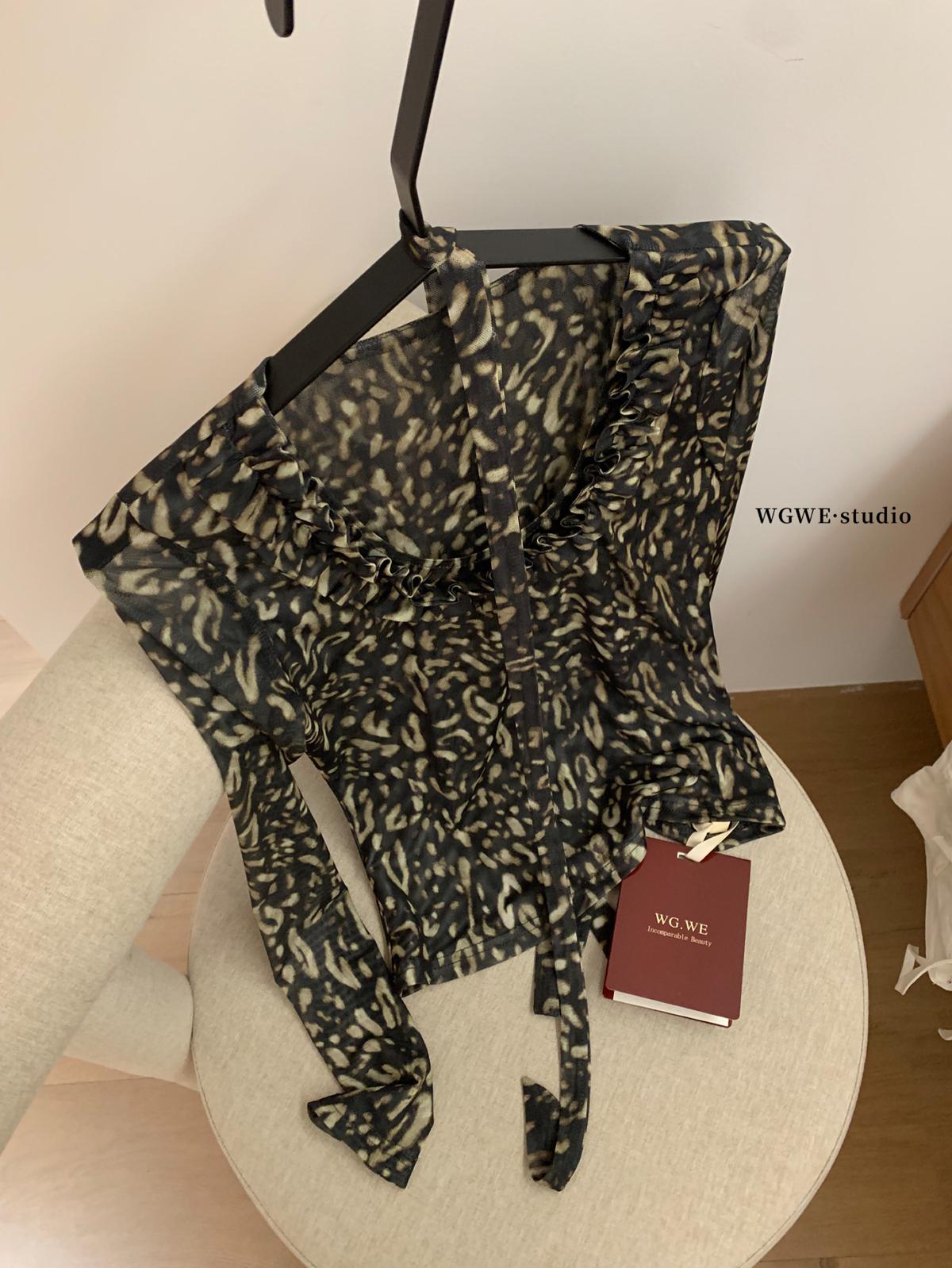 【C7243】豹紋派對-自帶chocker的時髦網紗打底辣妹修身顯瘦上衣長袖T恤(配飄帶)