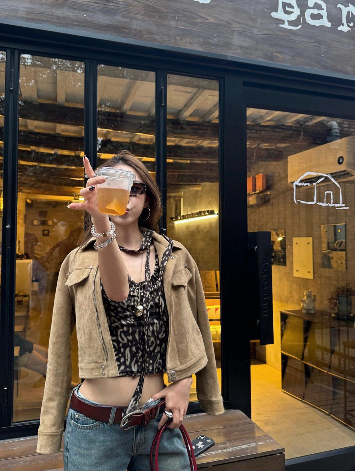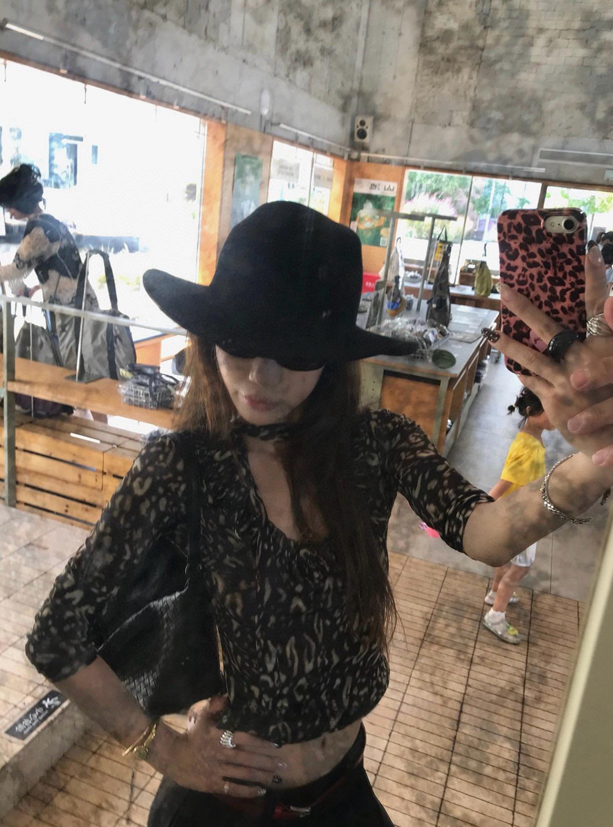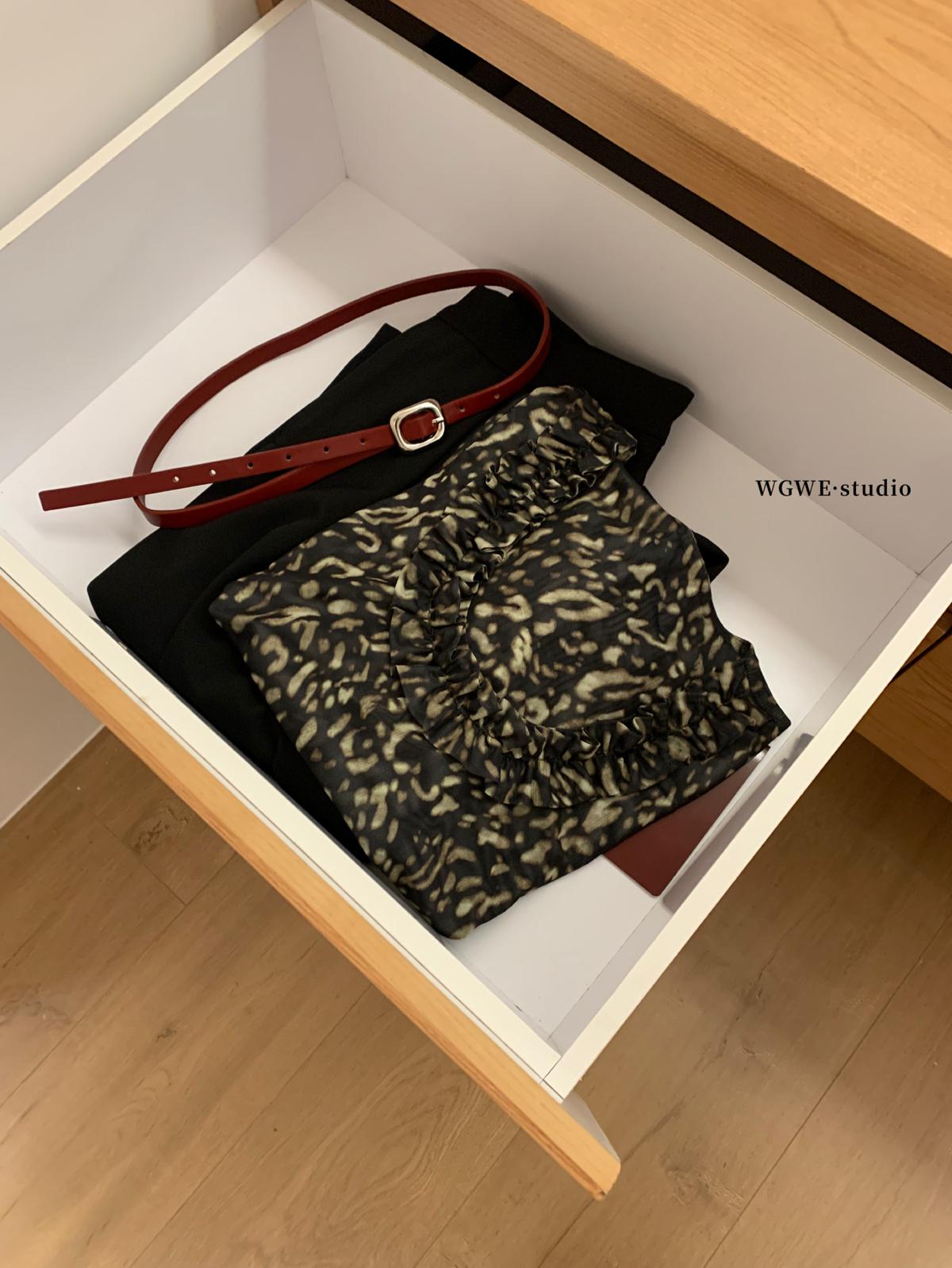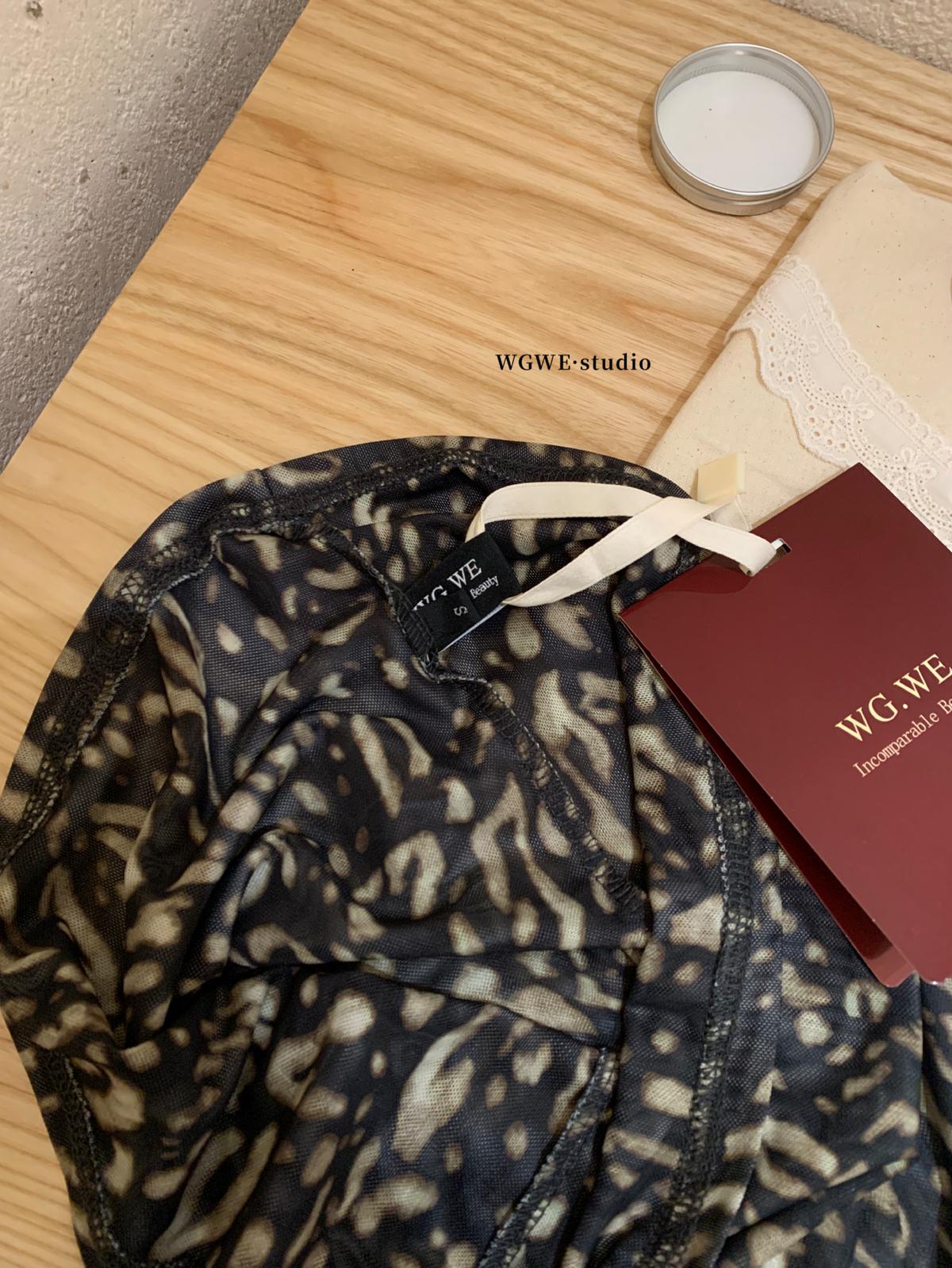 【C7243】豹紋派對-自帶chocker的時髦網紗打底辣妹修身顯瘦上衣長袖T恤(配飄帶)