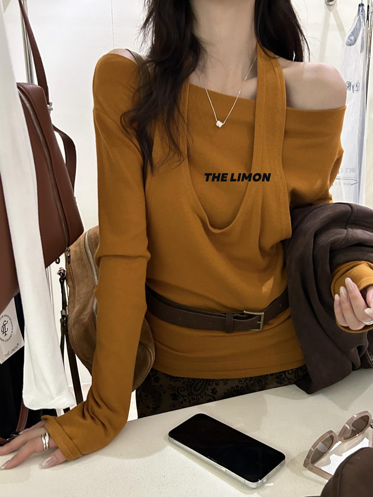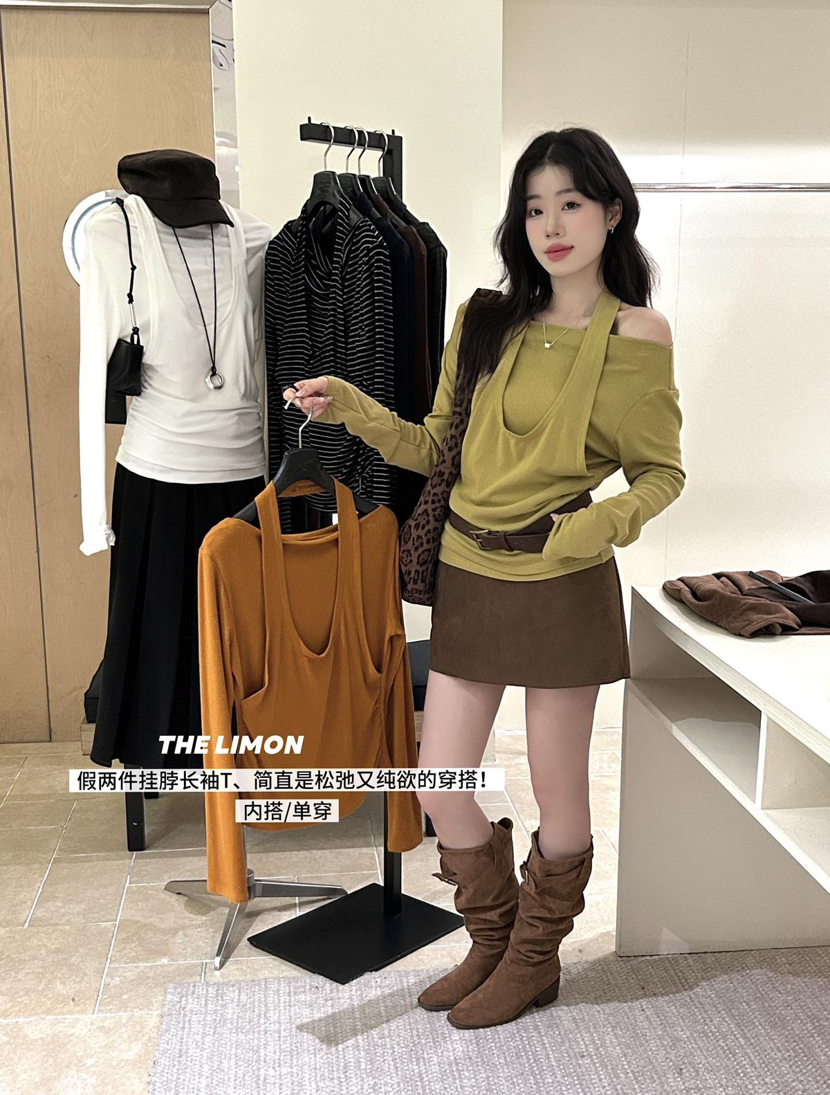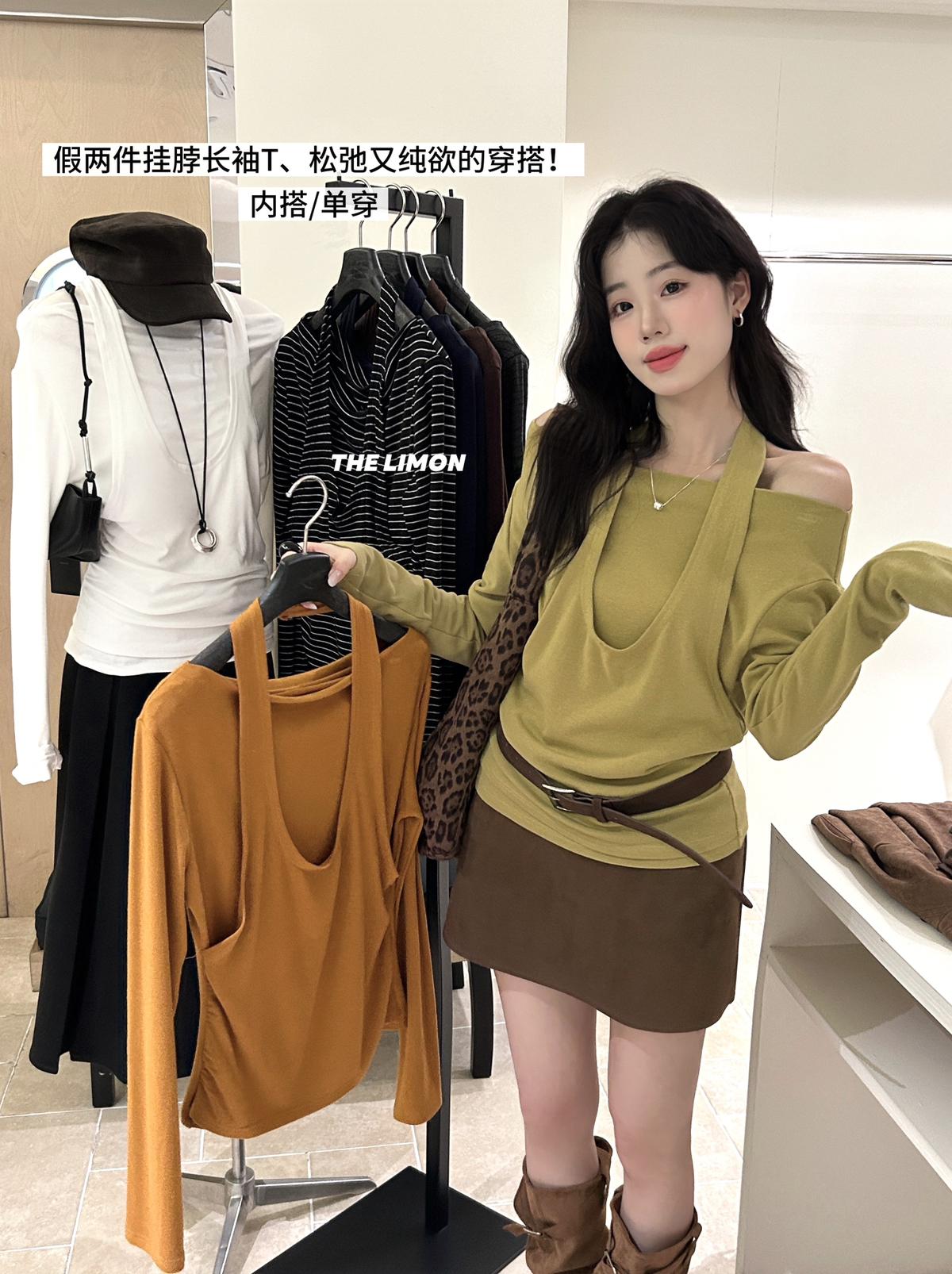 3. 【C7252】鬆弛又純欲穿搭!掛脖式假兩件長袖T恤