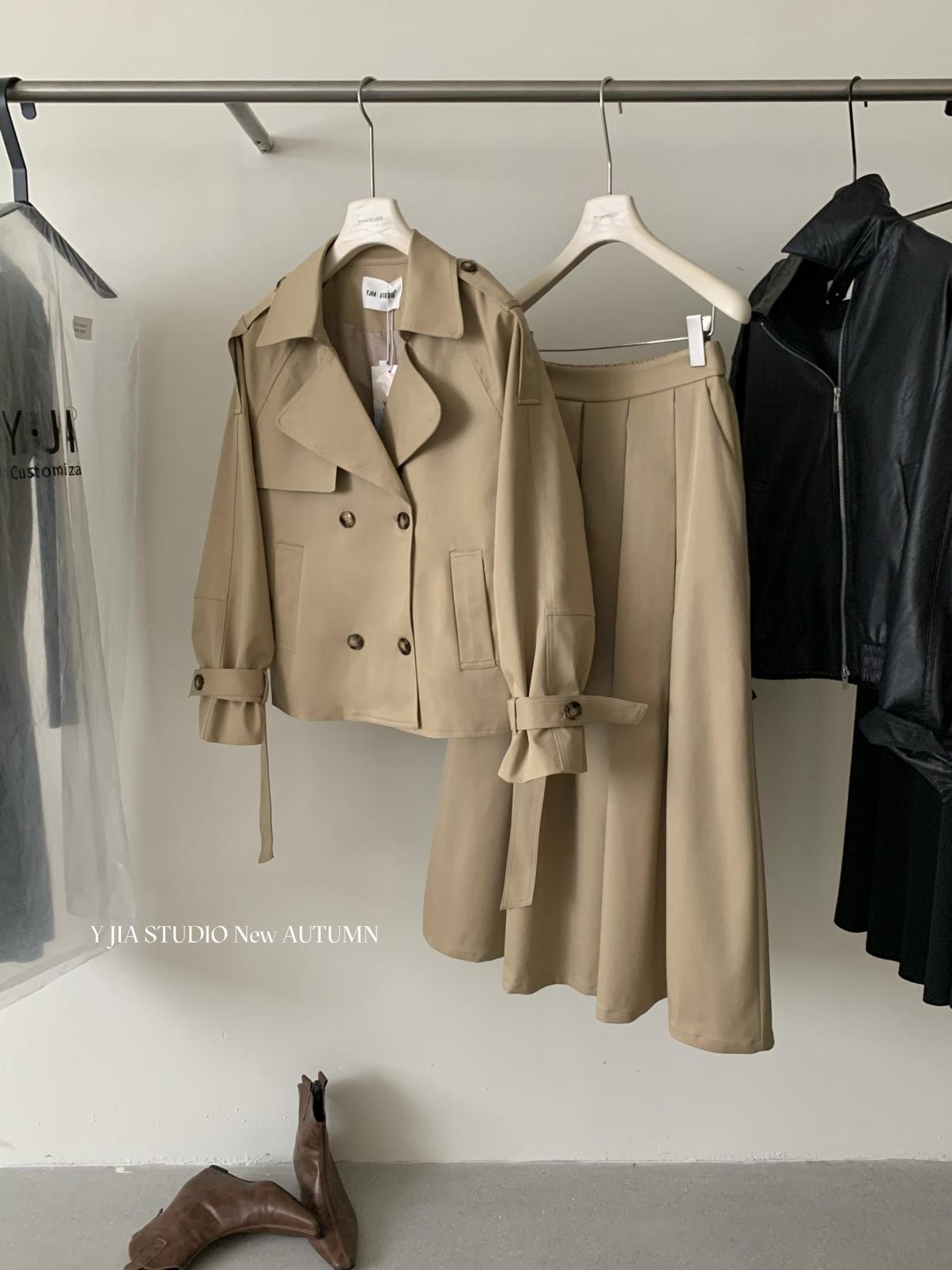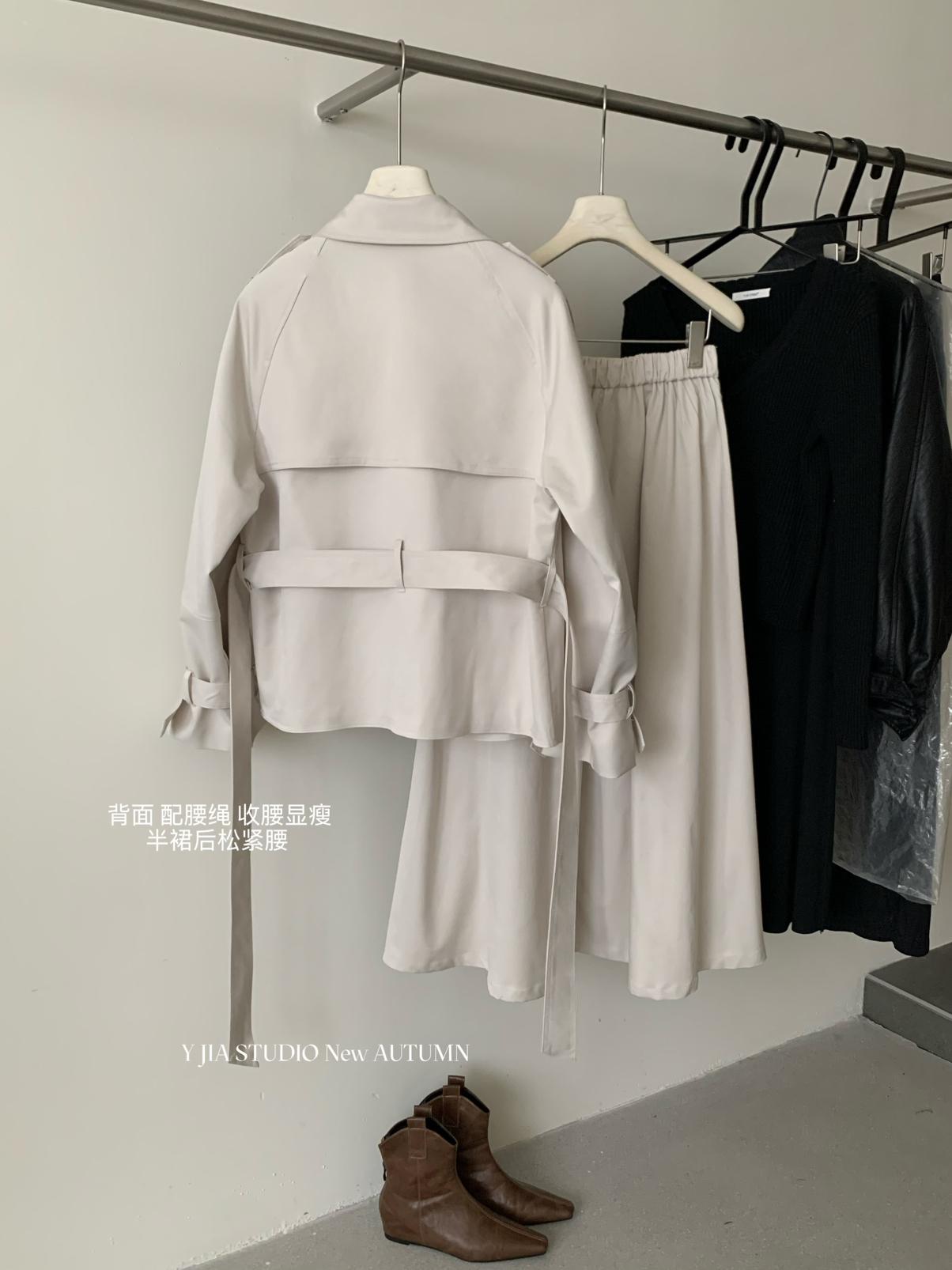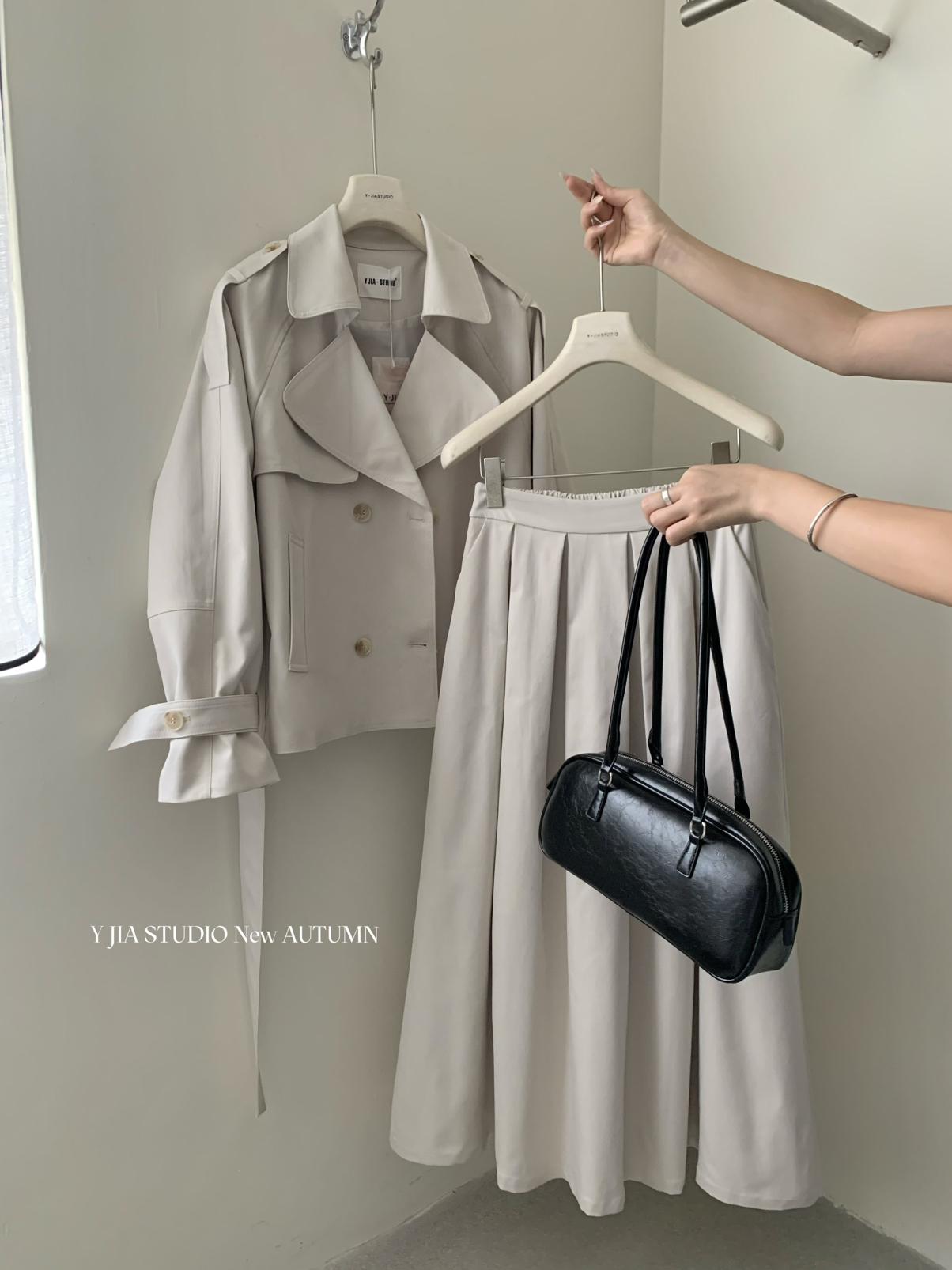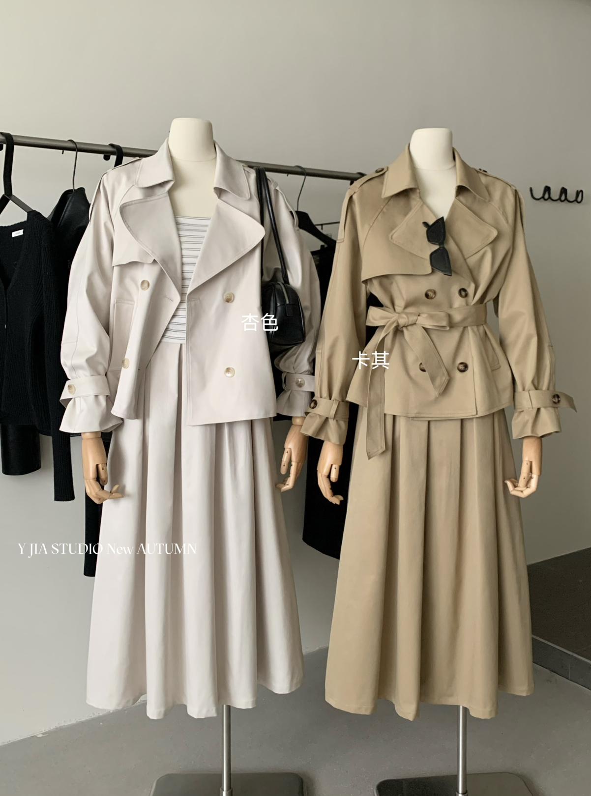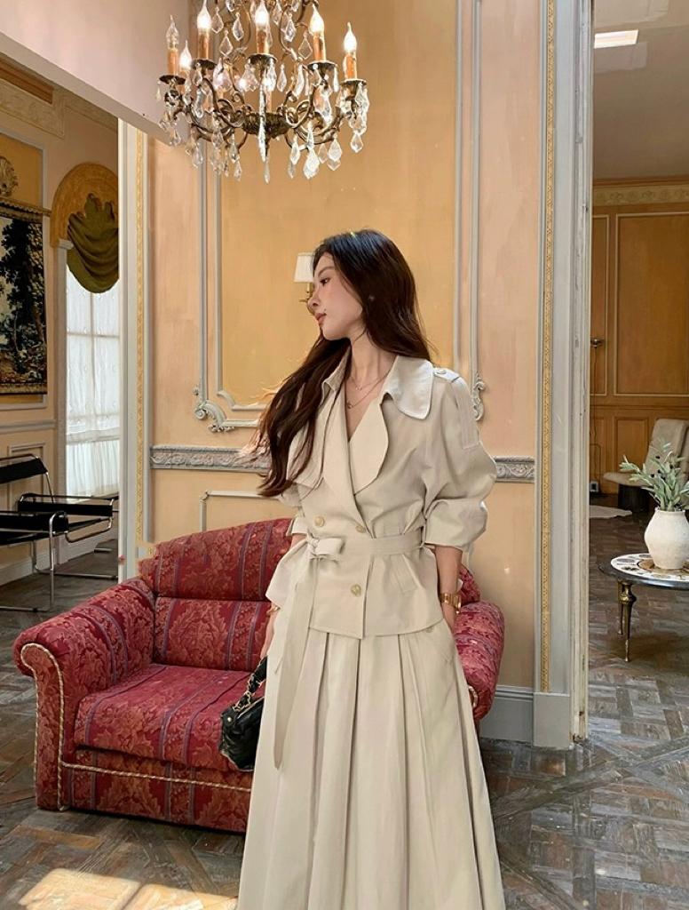 【C7256】英倫畫刊風衣+半身裙一套上身超有時髦腔調套裝(配腰繩)