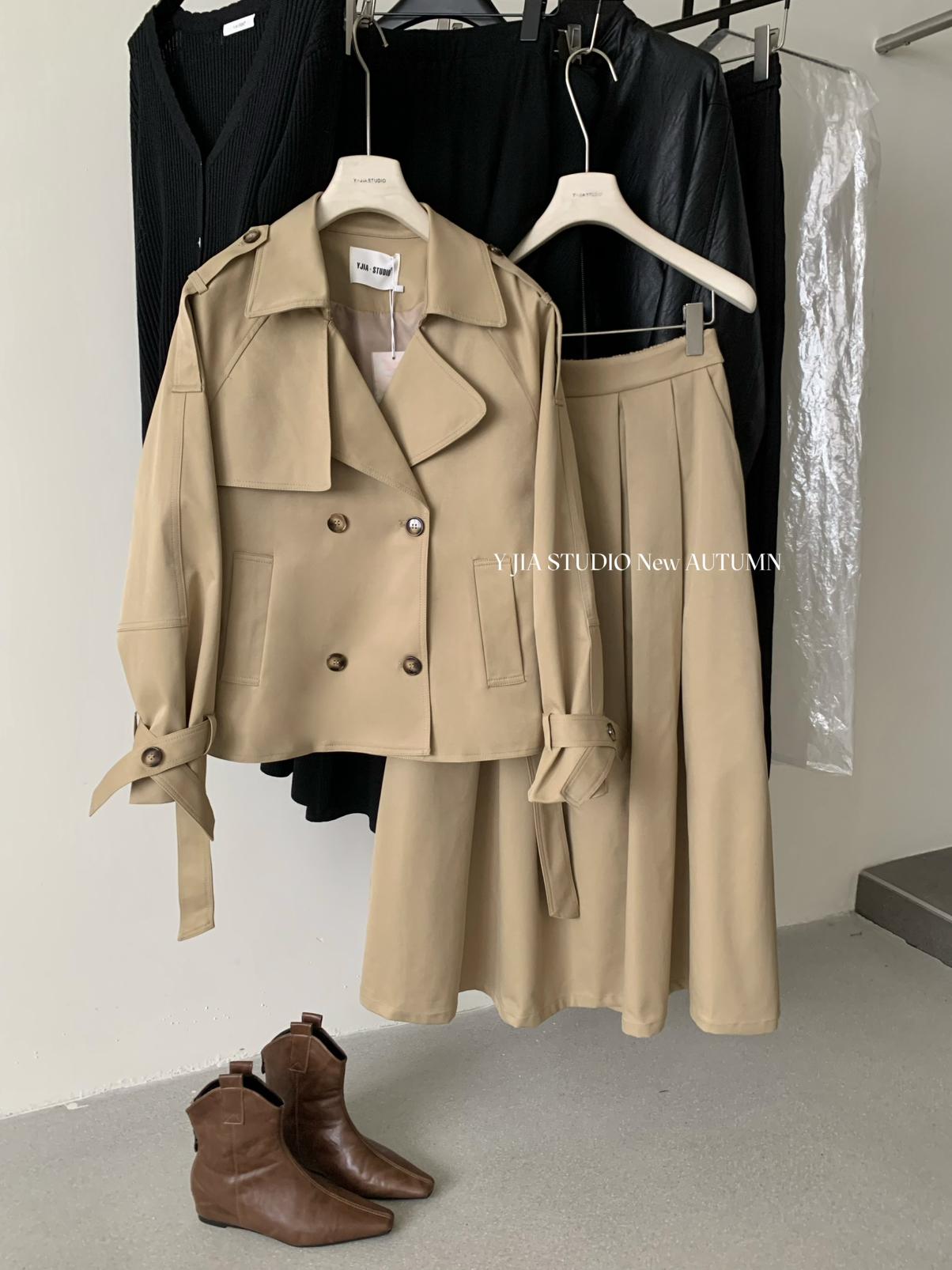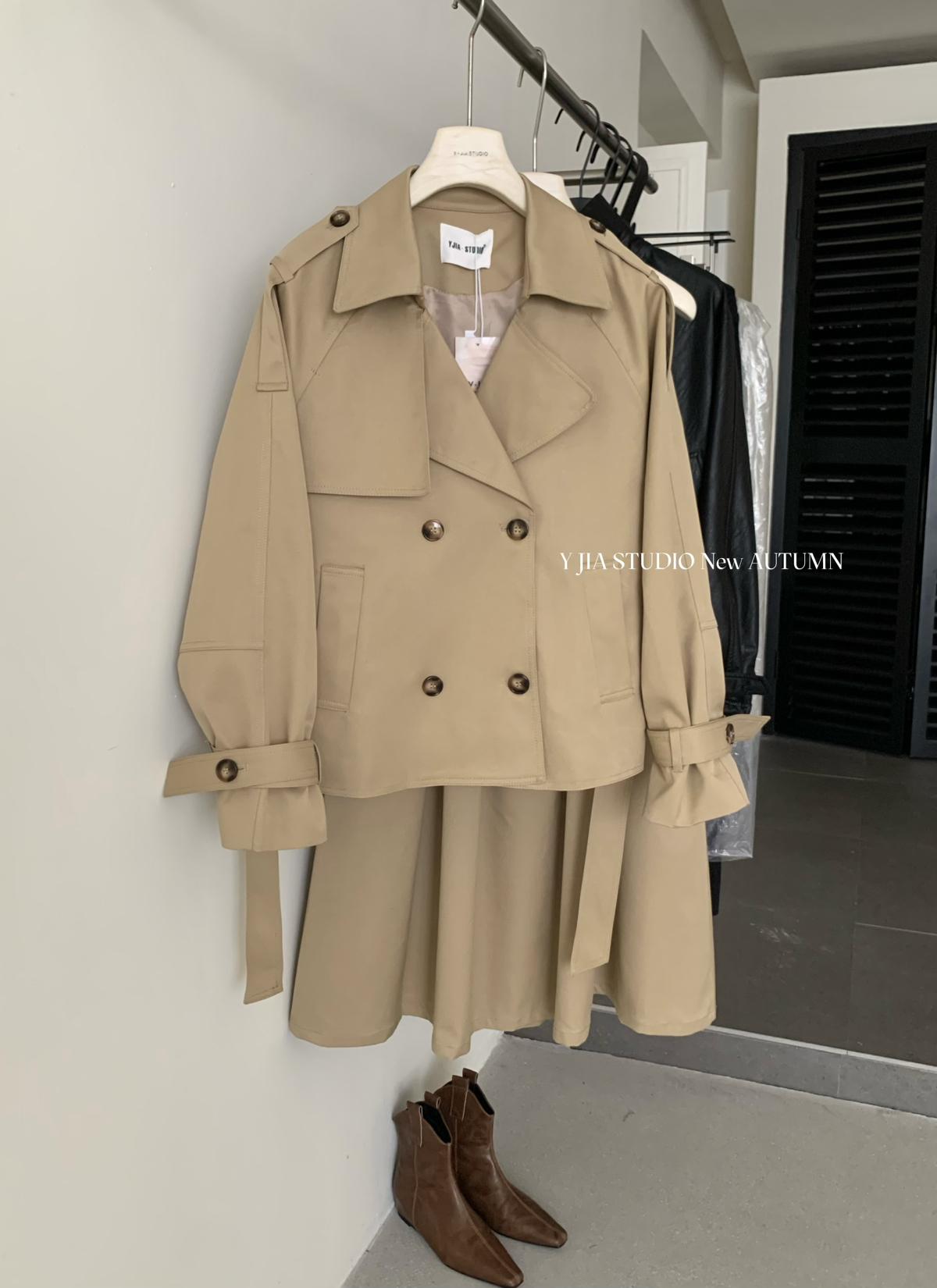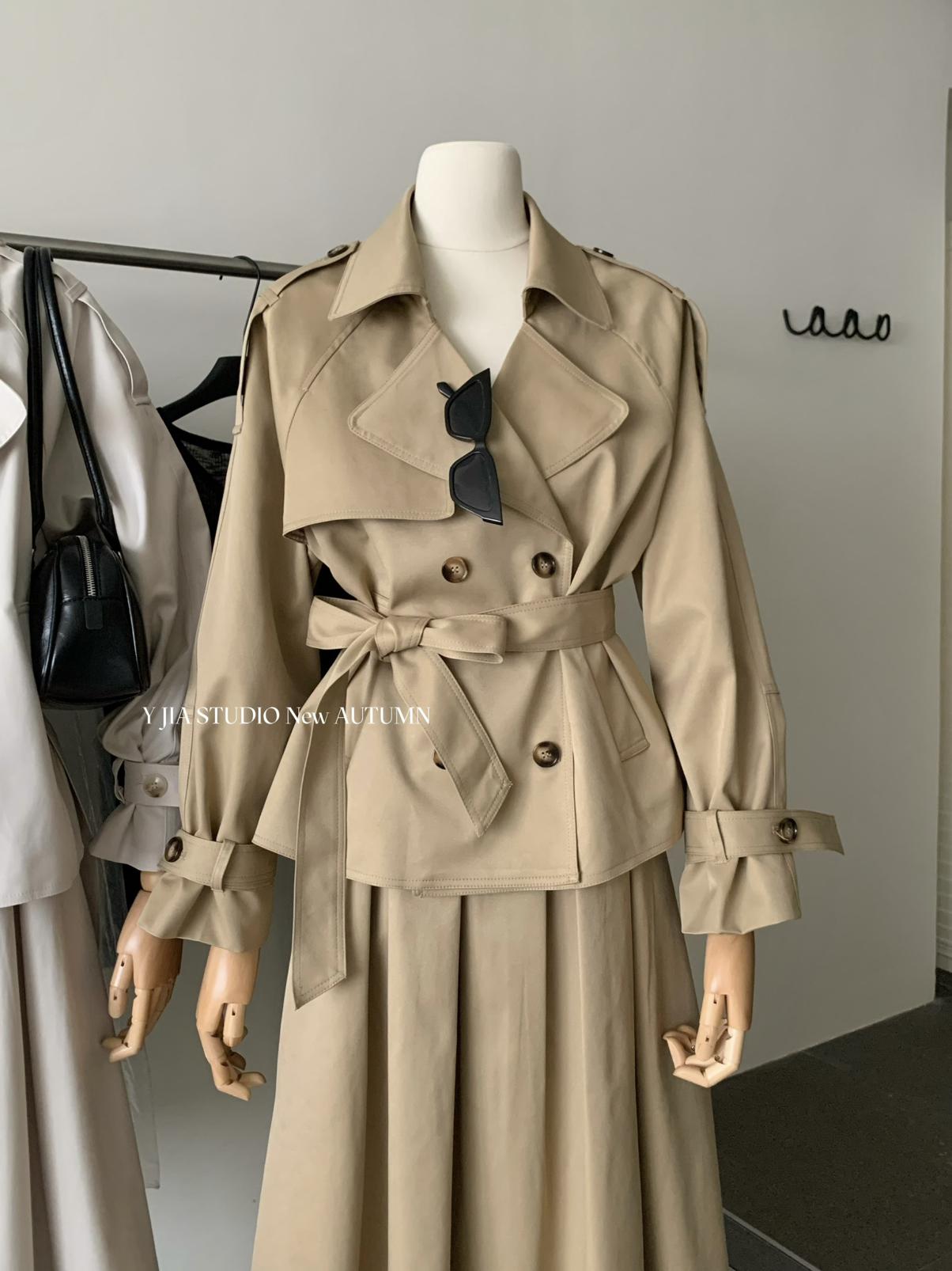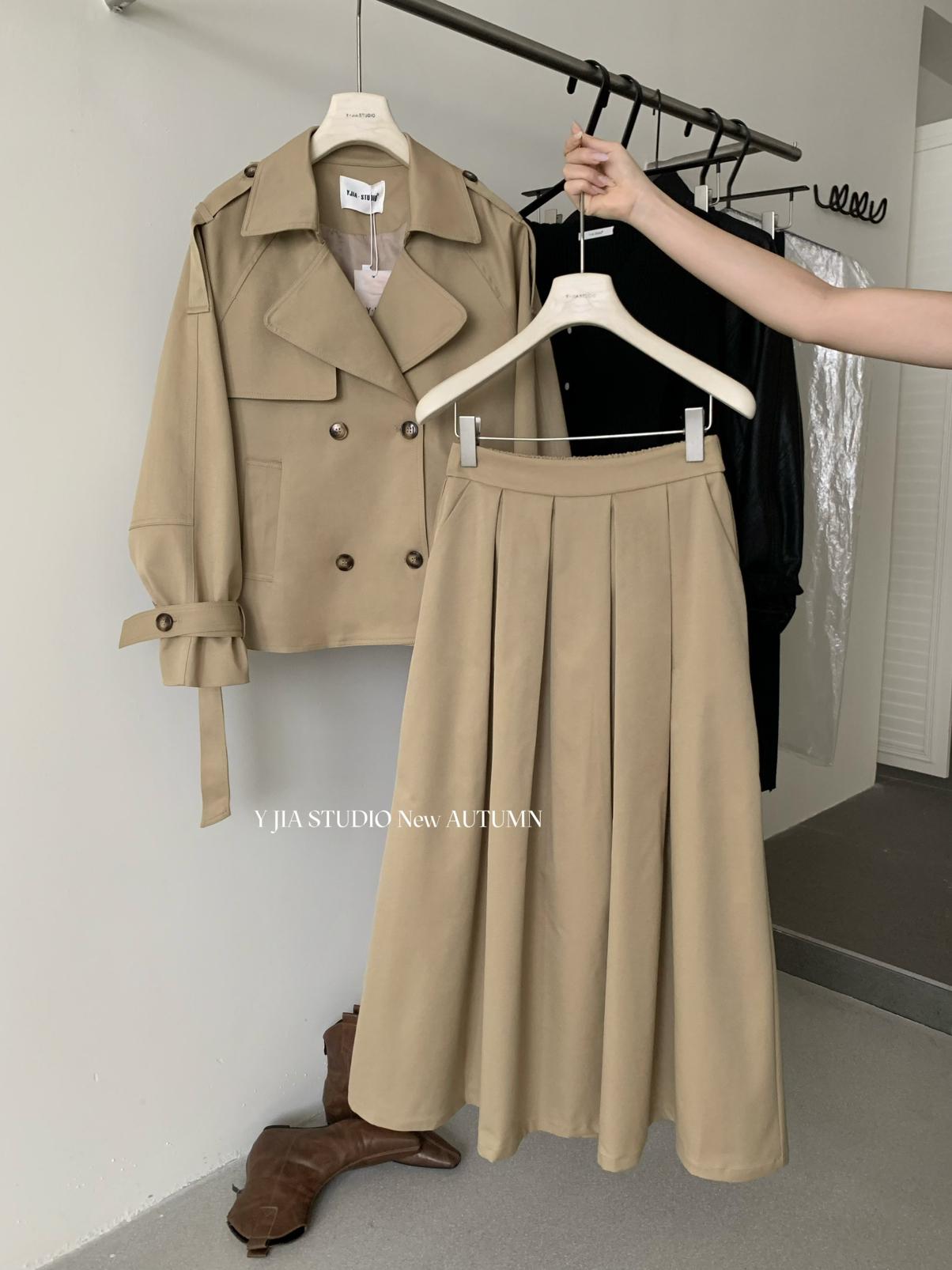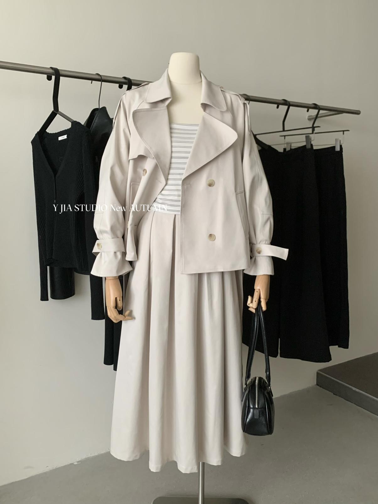 【C7256】英倫畫刊風衣+半身裙一套上身超有時髦腔調套裝(配腰繩)