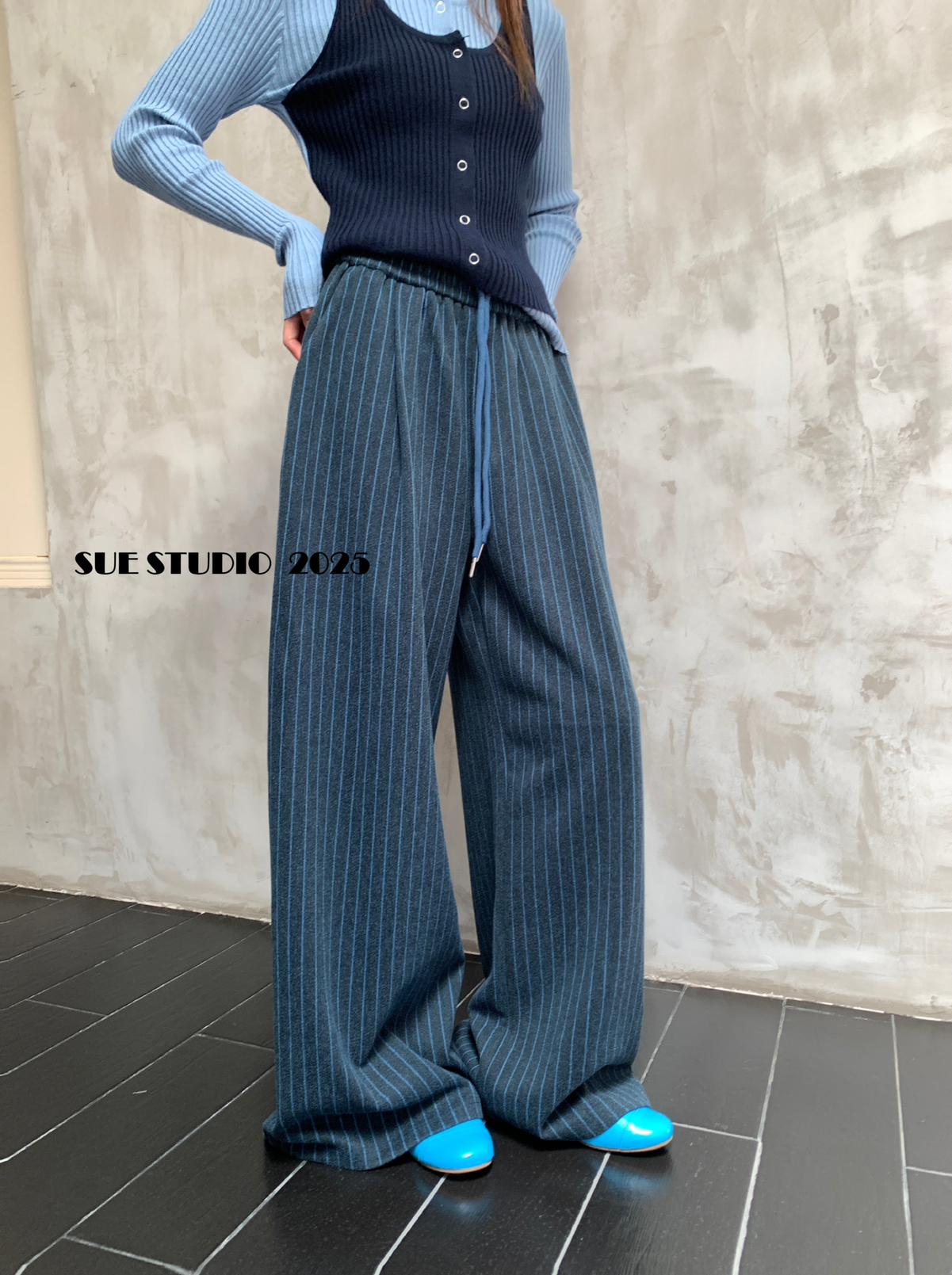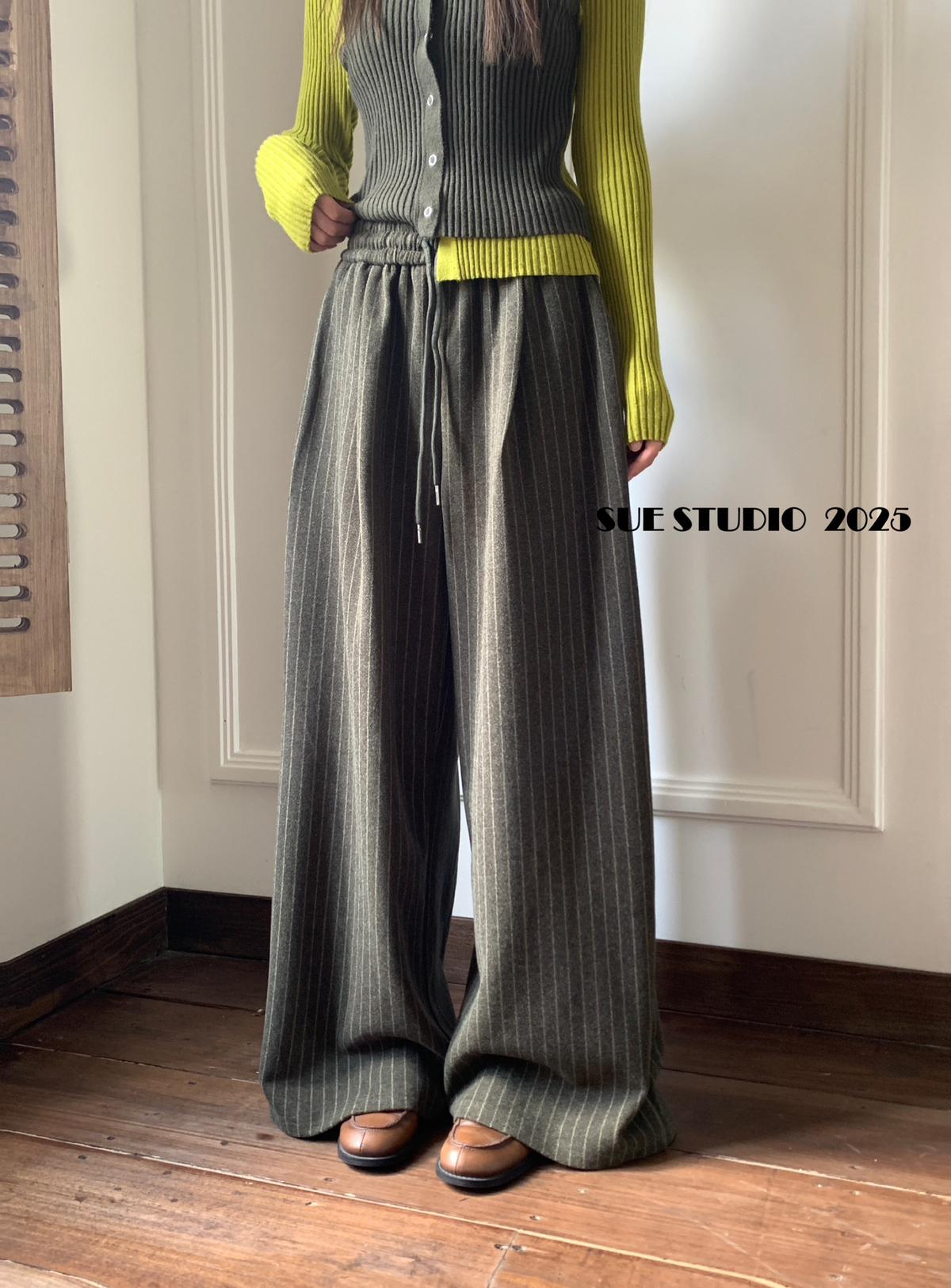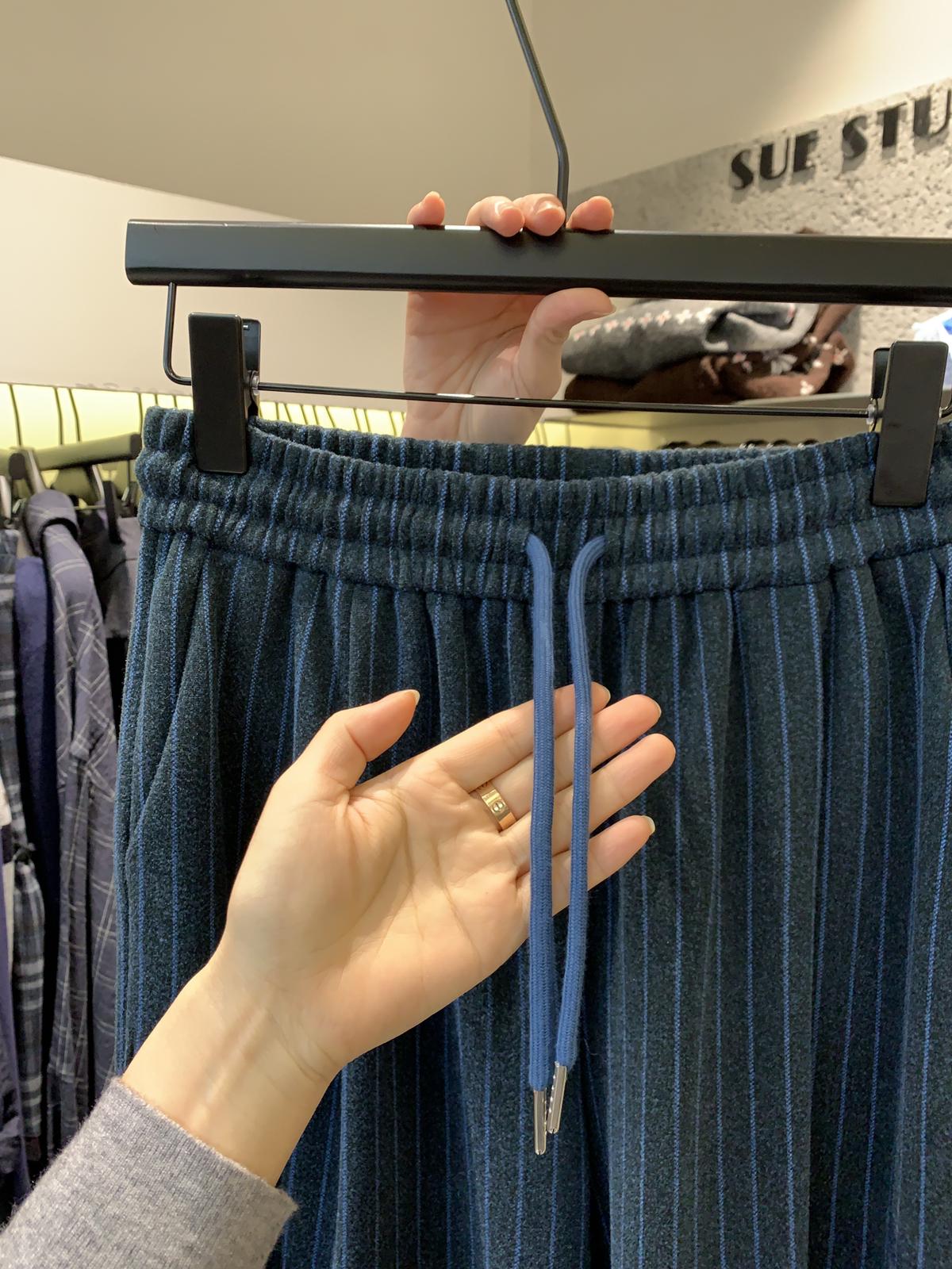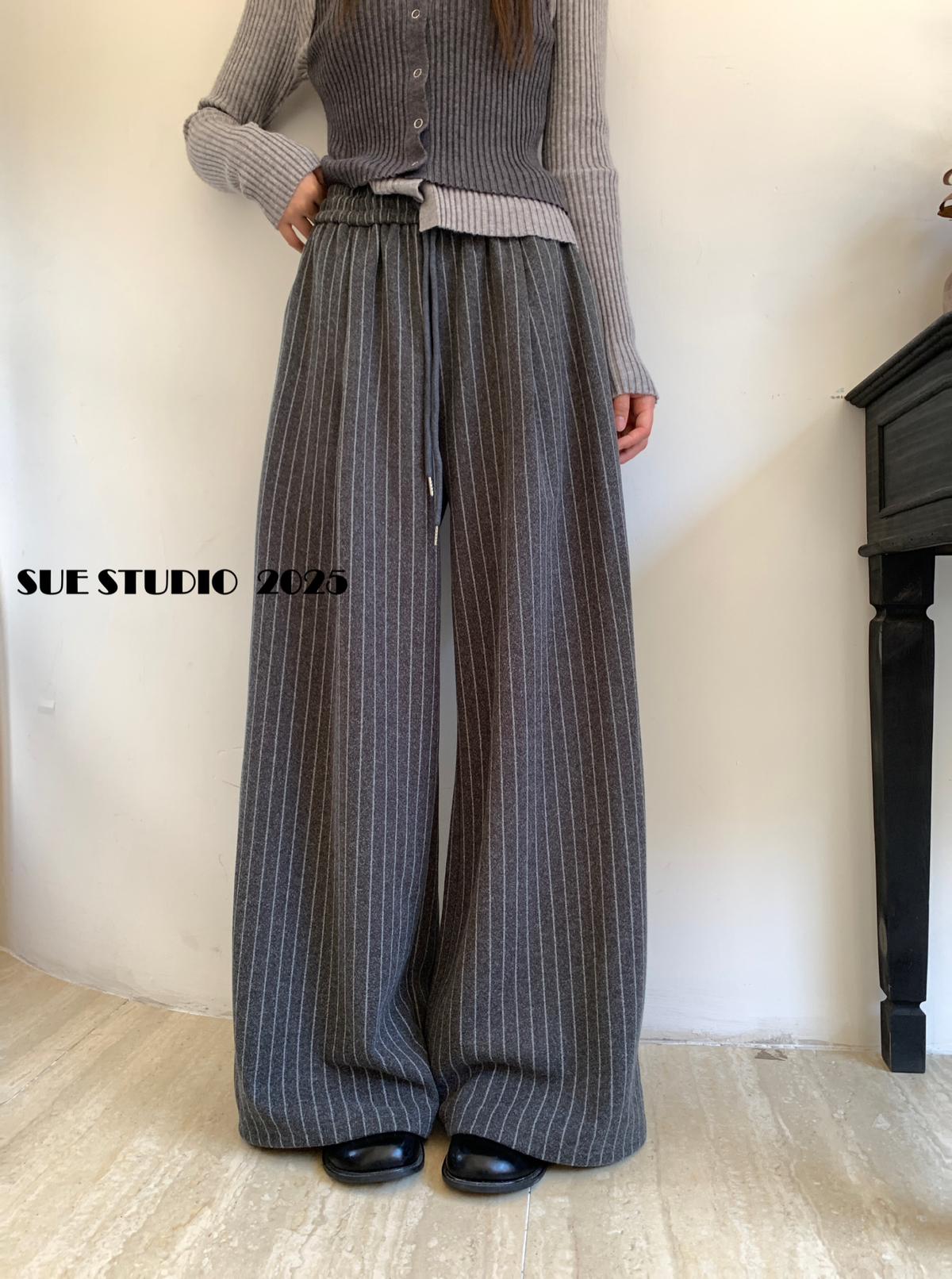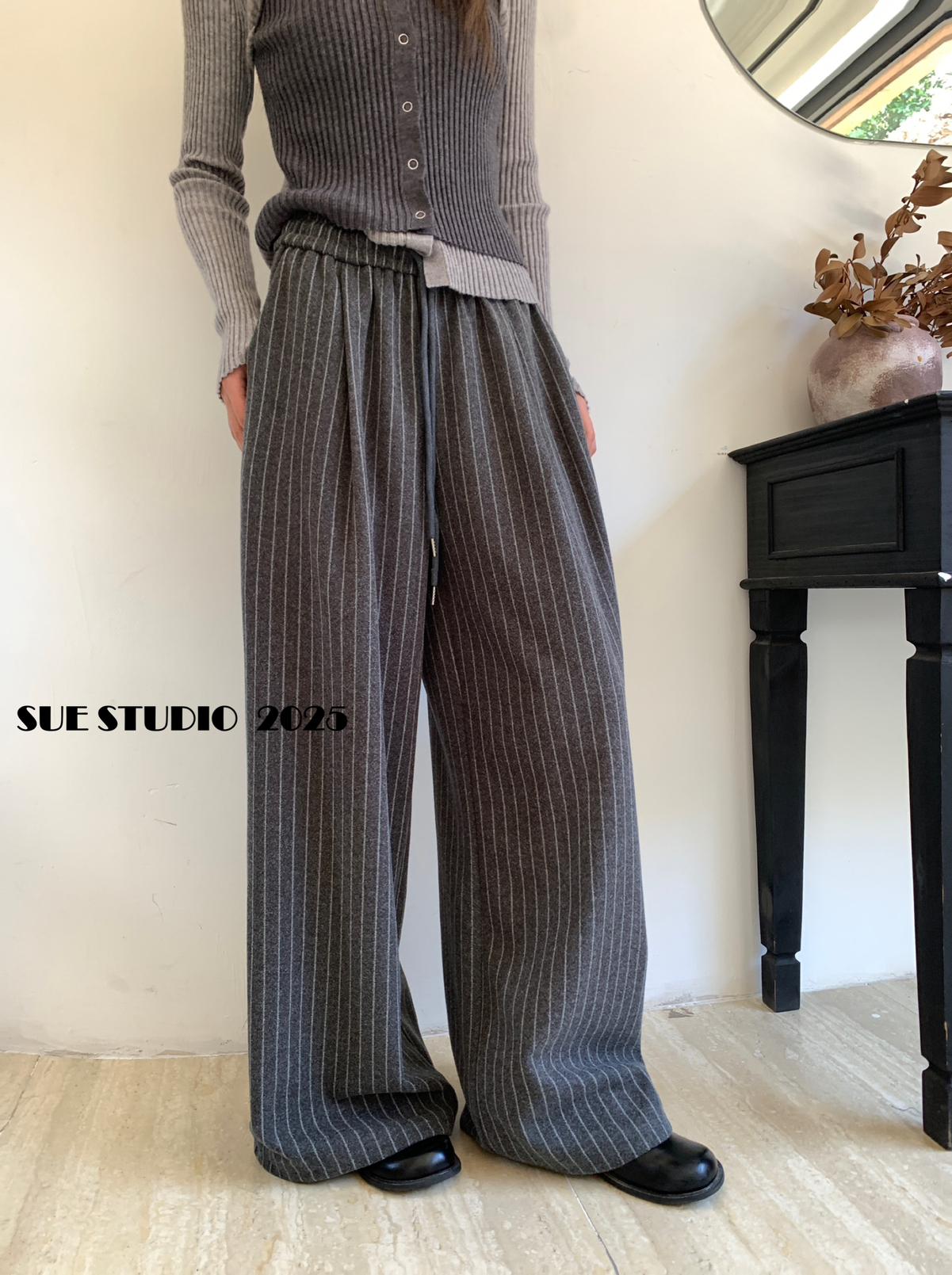 【C7277】韓系簡約加厚款豎紋鬆緊腰顯瘦顯高休閒褲